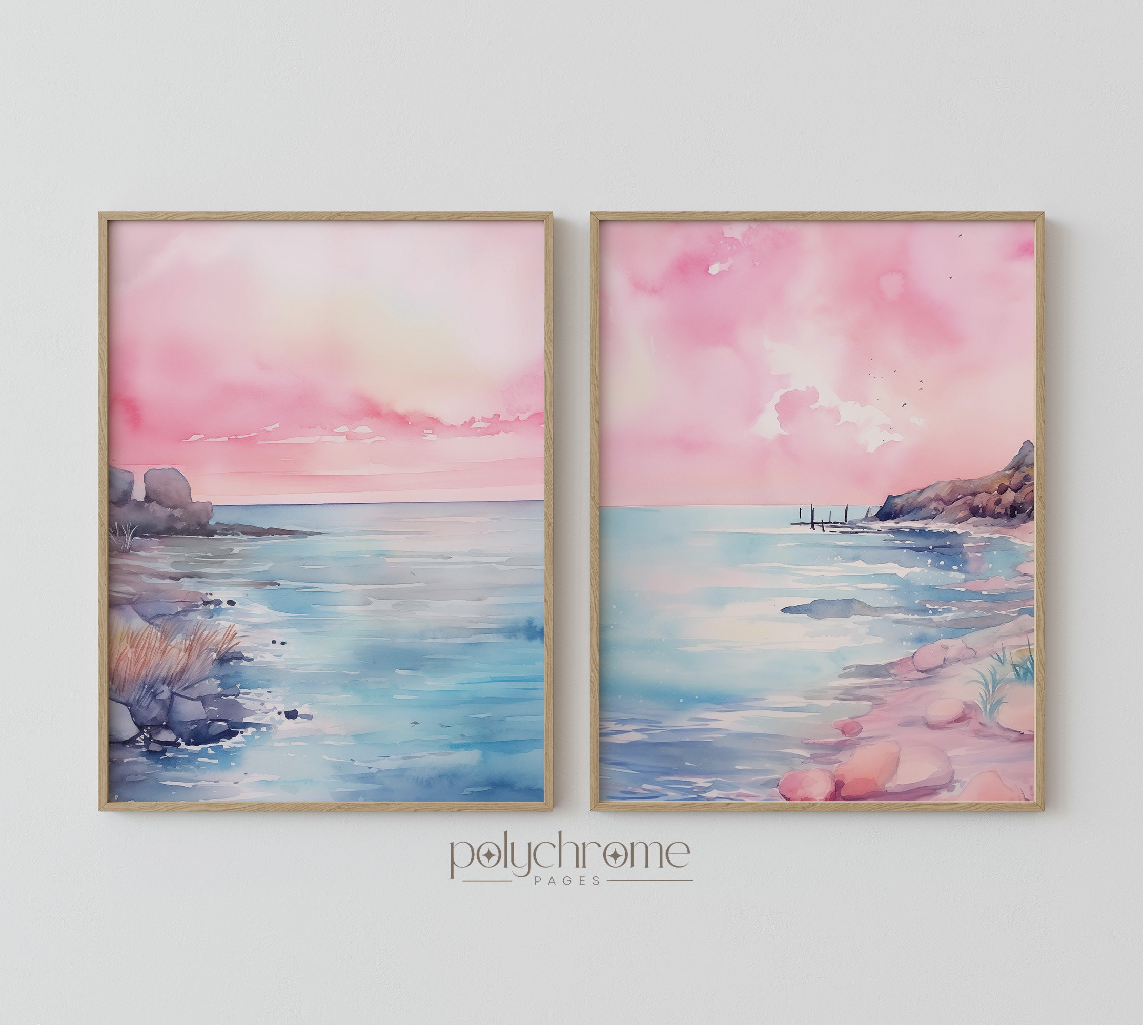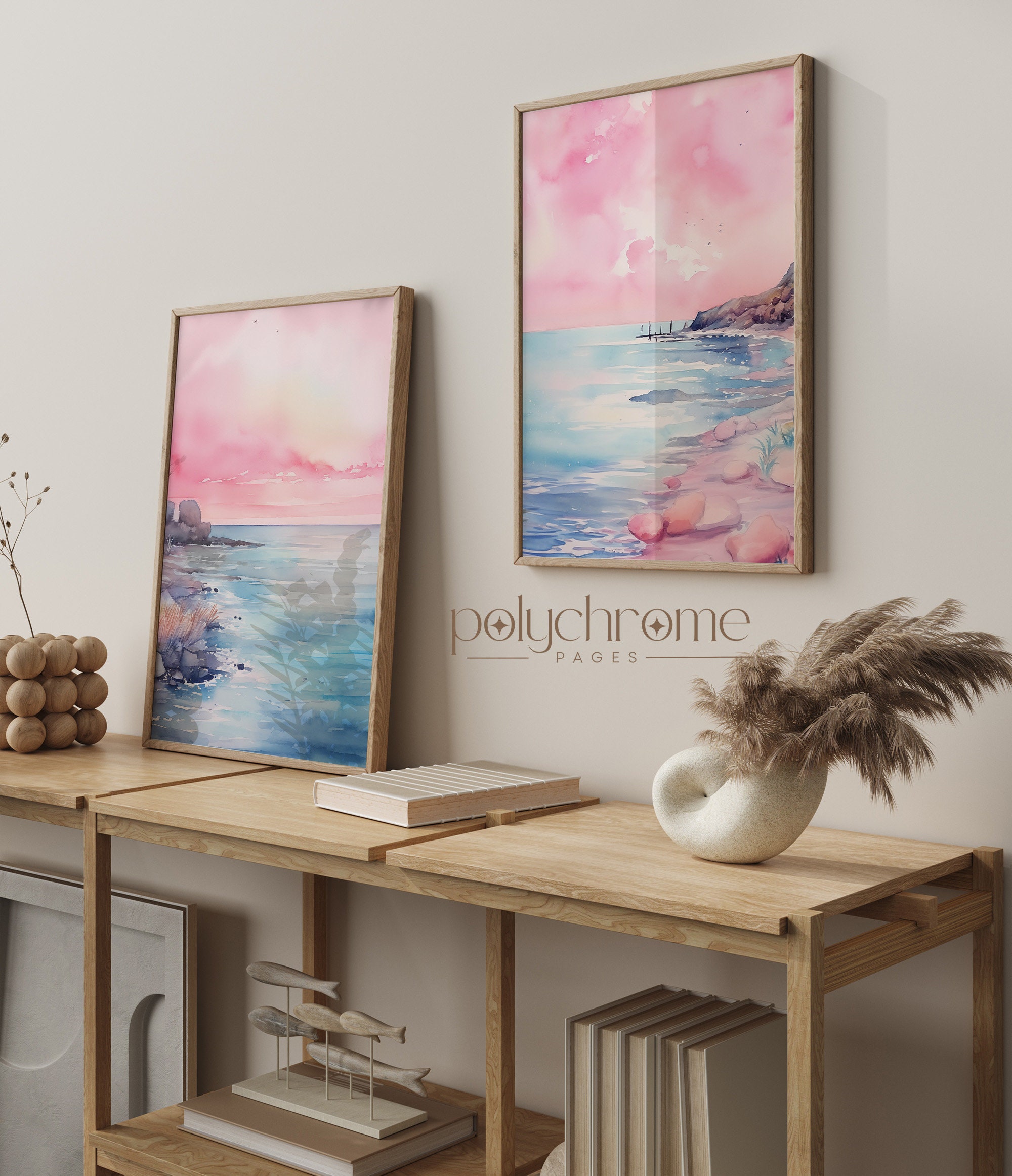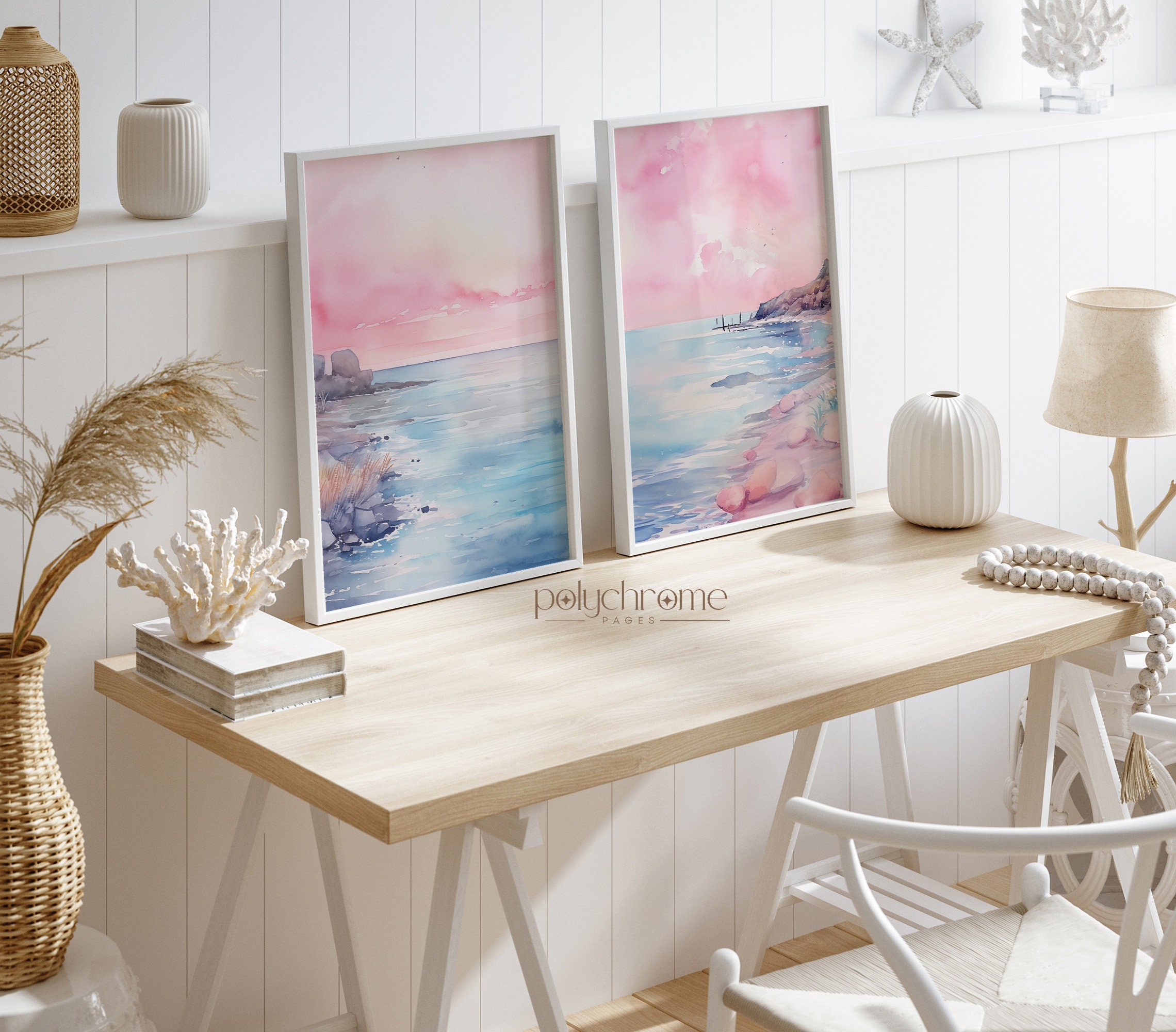 These dreamy beach landscapes capture rolling waves and sandy shores in soft pink and blue watercolors, bringing to mind peaceful mornings by the sea. The gentle pastel palette makes them a natural fit for master bedrooms, coastal bathrooms, or any space craving a serene seaside atmosphere. Ideal for lovers of Hamptons-style interiors or anyone wanting to bring that calming ocean feeling indoors.