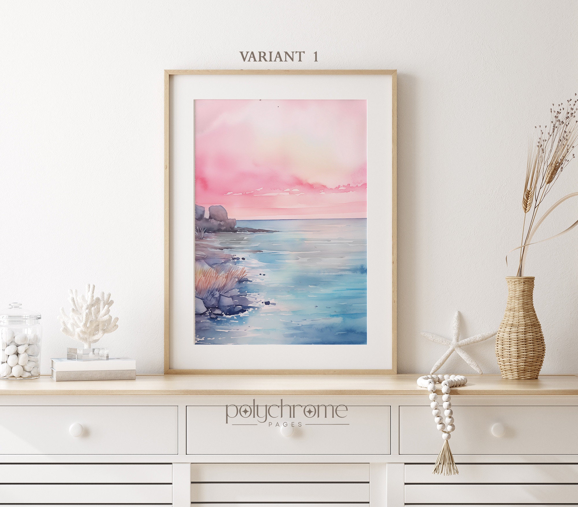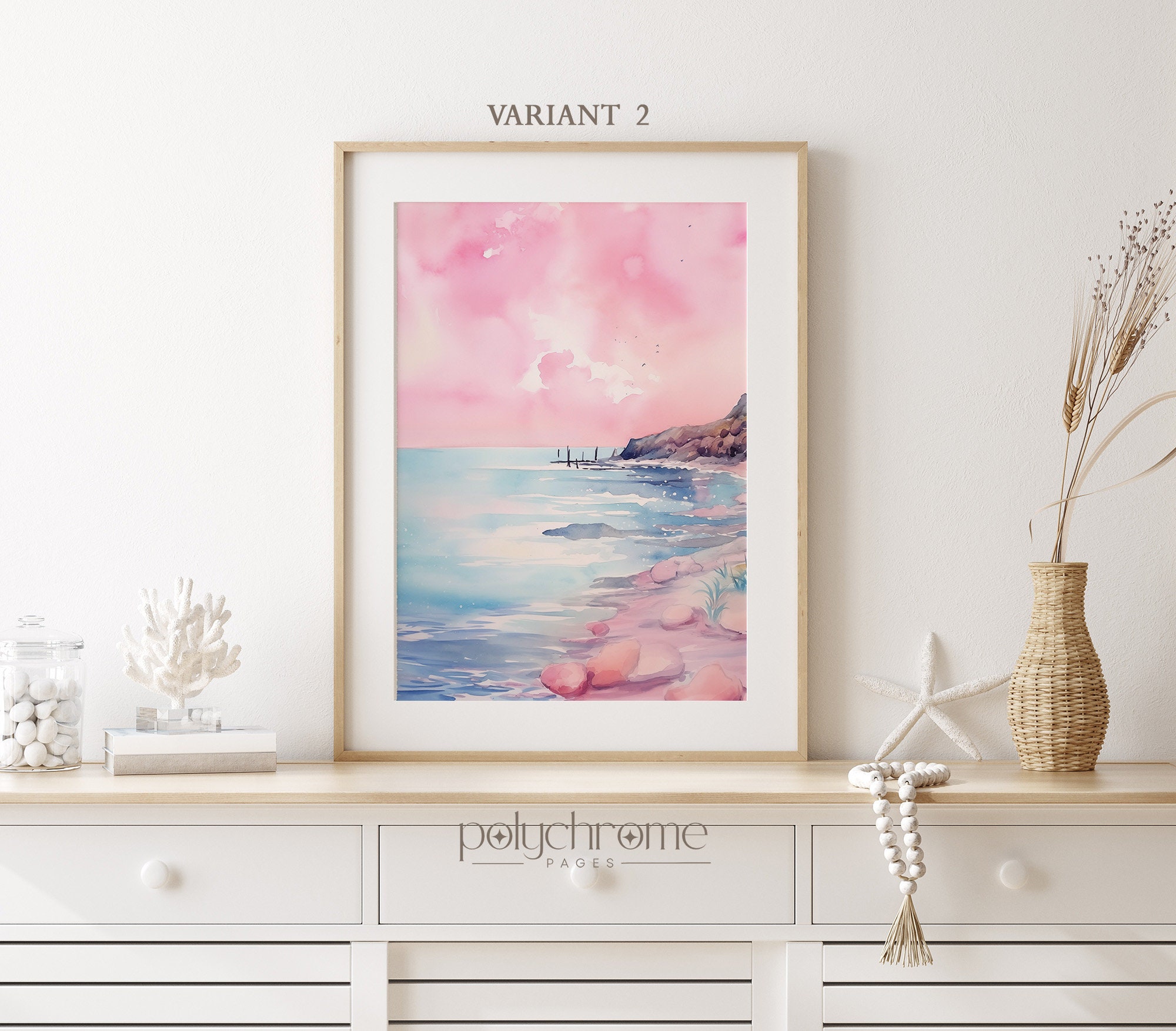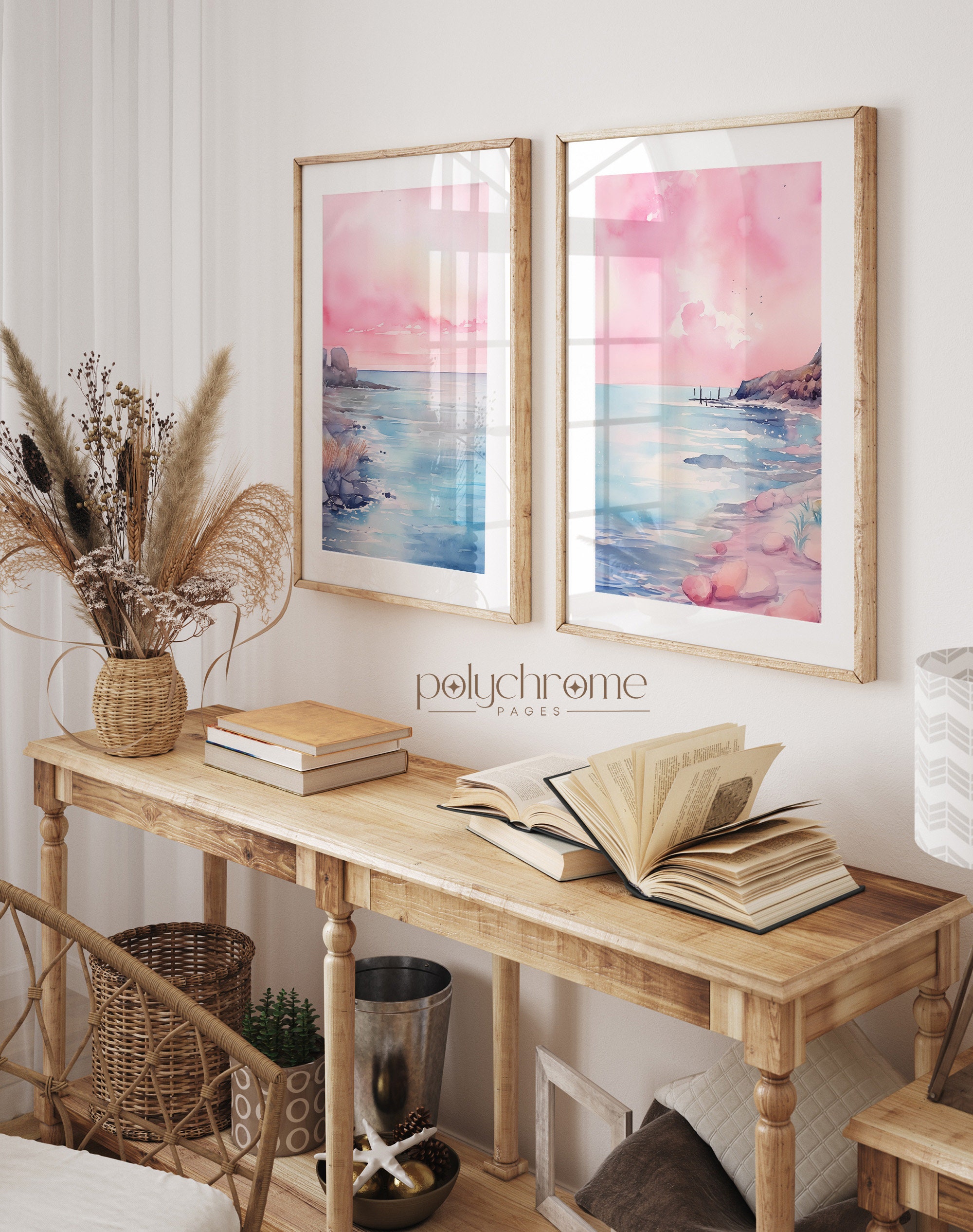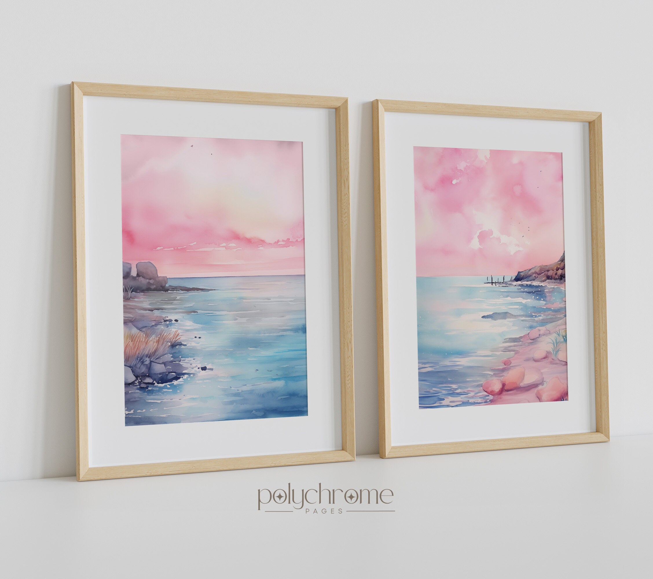 These dreamy beach landscapes capture rolling waves and sandy shores in soft pink and blue watercolors, bringing to mind peaceful mornings by the sea. The gentle pastel palette makes them a natural fit for master bedrooms, coastal bathrooms, or any space craving a serene seaside atmosphere. Ideal for lovers of Hamptons-style interiors or anyone wanting to bring that calming ocean feeling indoors.