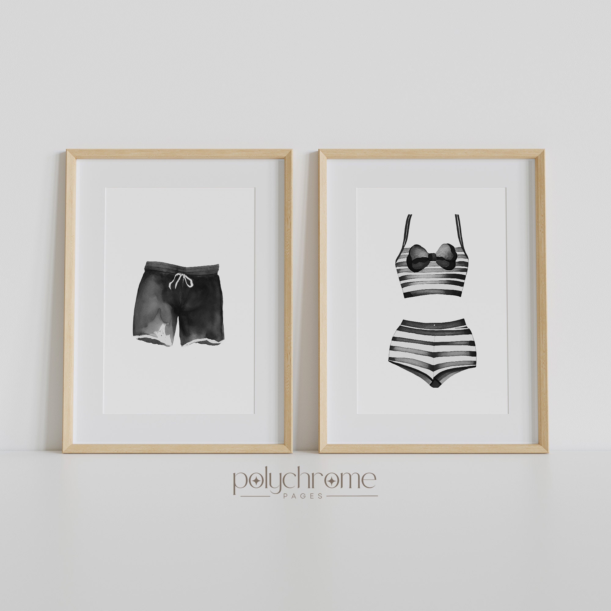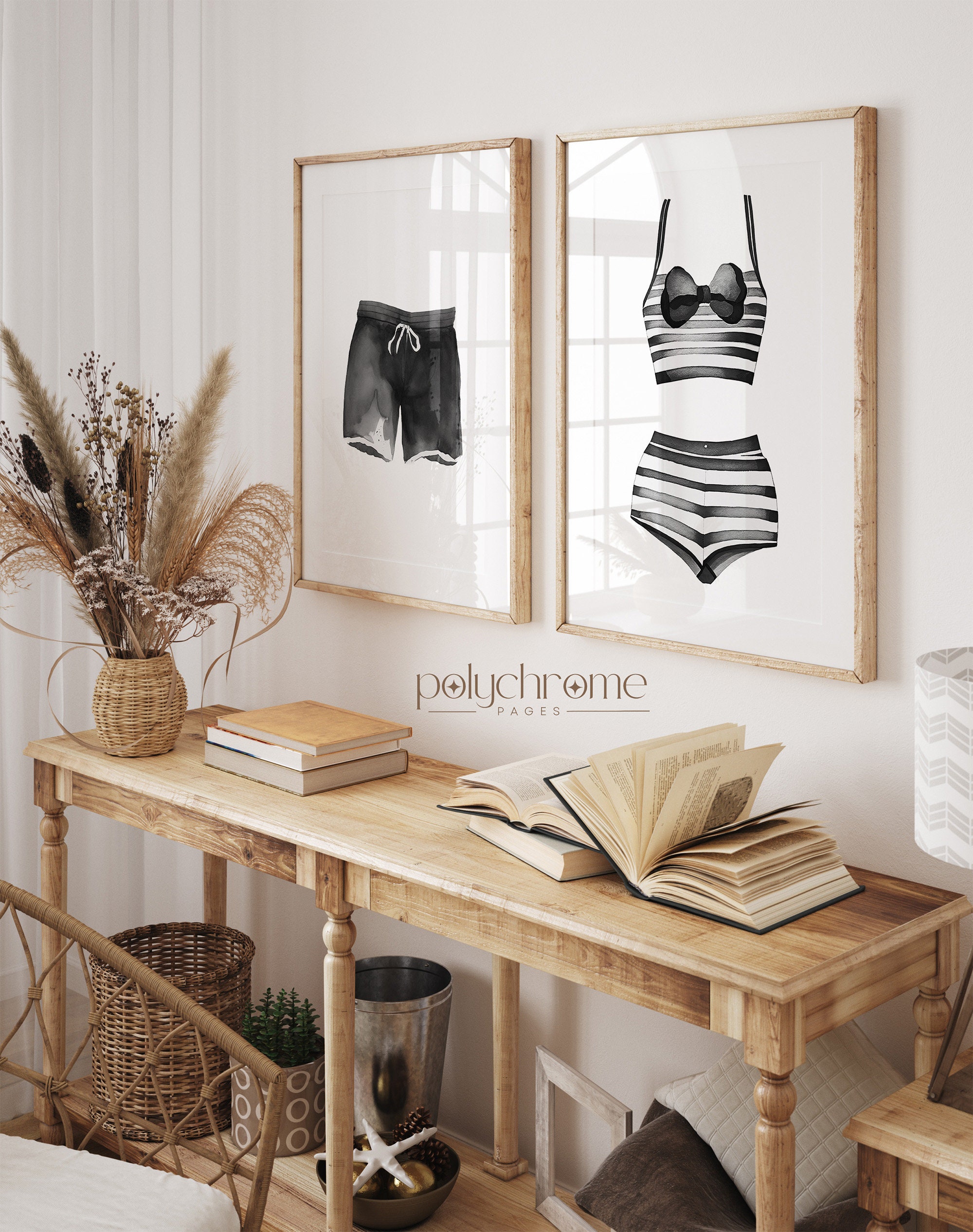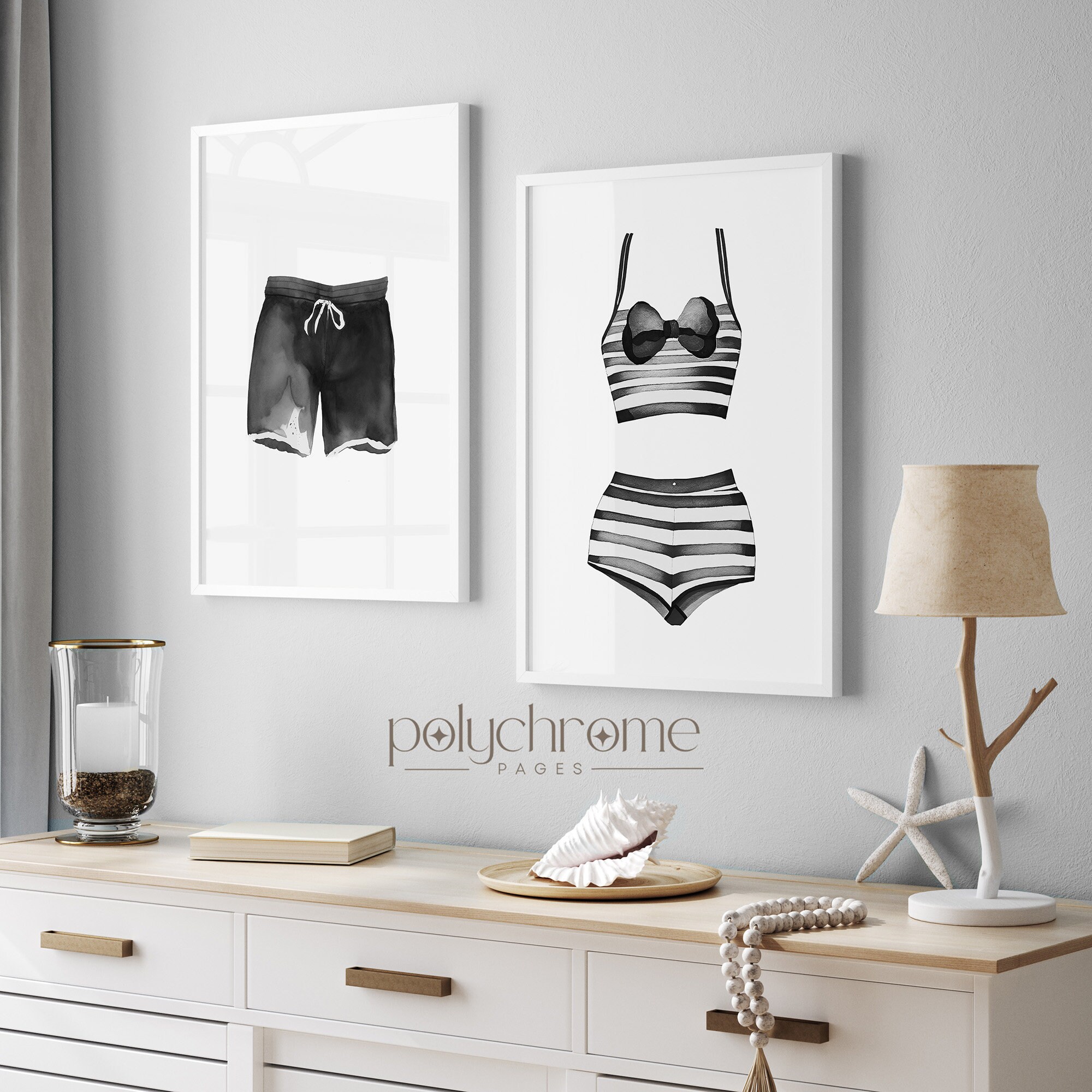 This charming set of hand-painted swimsuits in classic black and white brings to mind lazy summer days by the water. The simple, graphic style works beautifully in a lake house laundry room, pool bathroom, or beach cottage. A fun choice for anyone who loves understated coastal decor with a vintage feel.