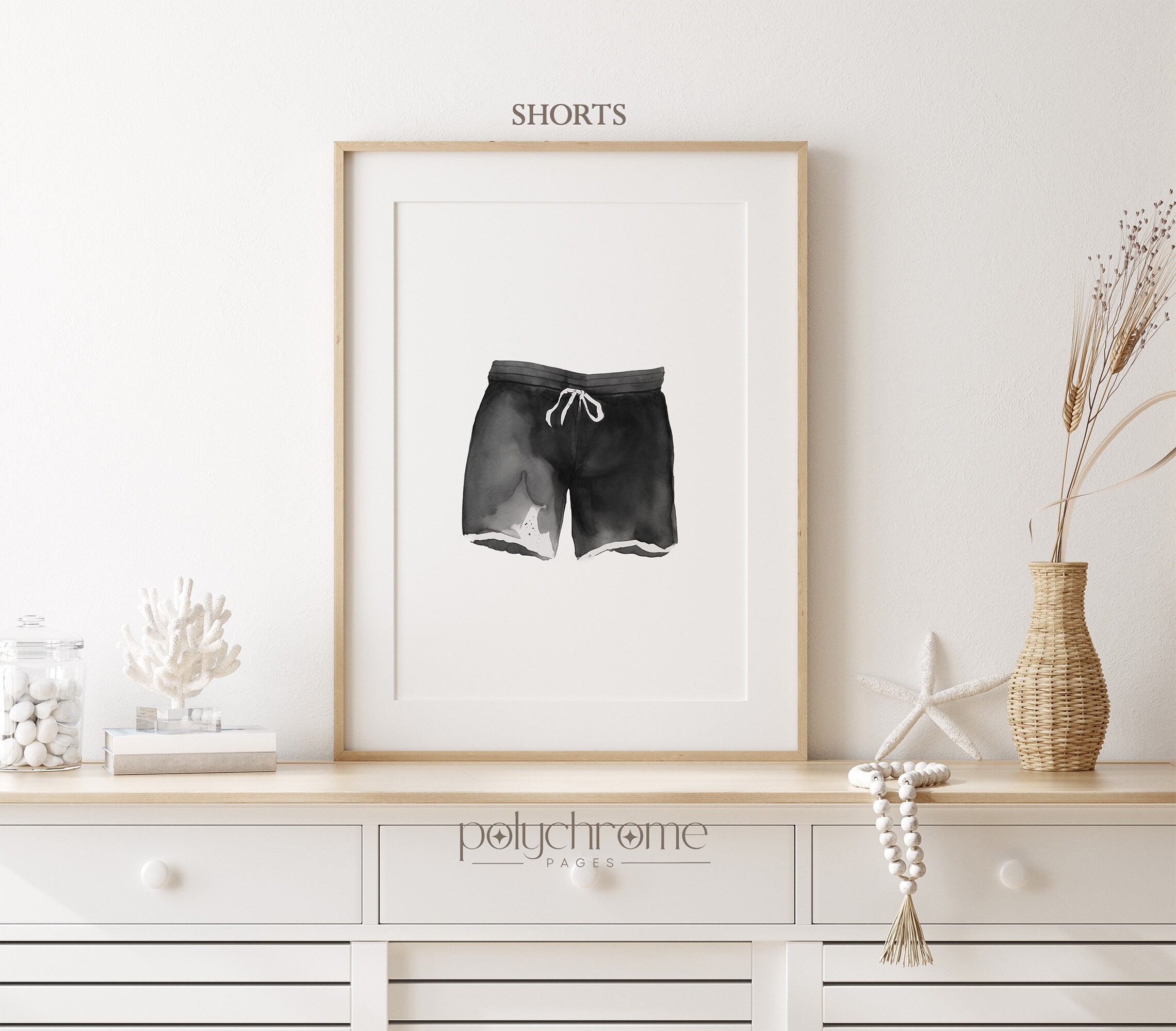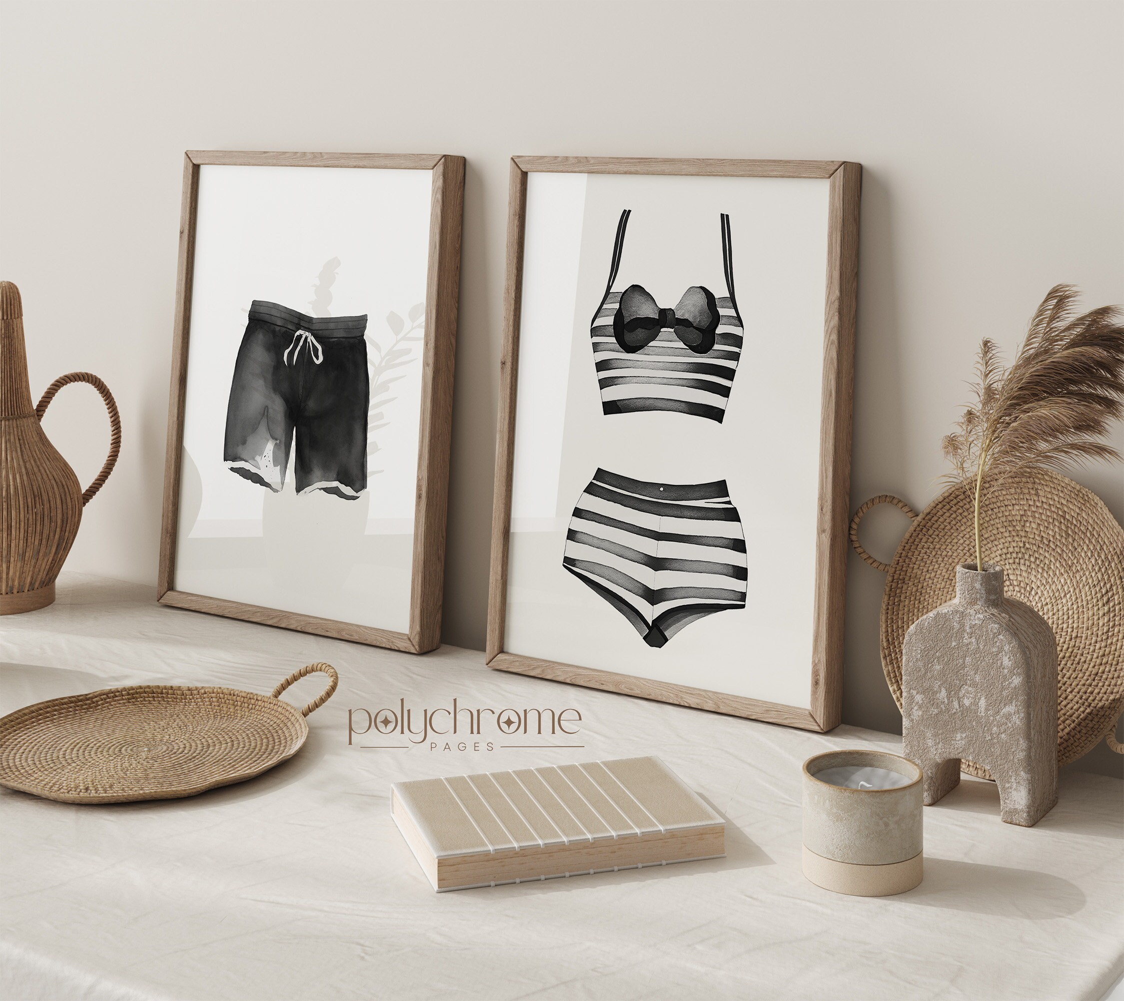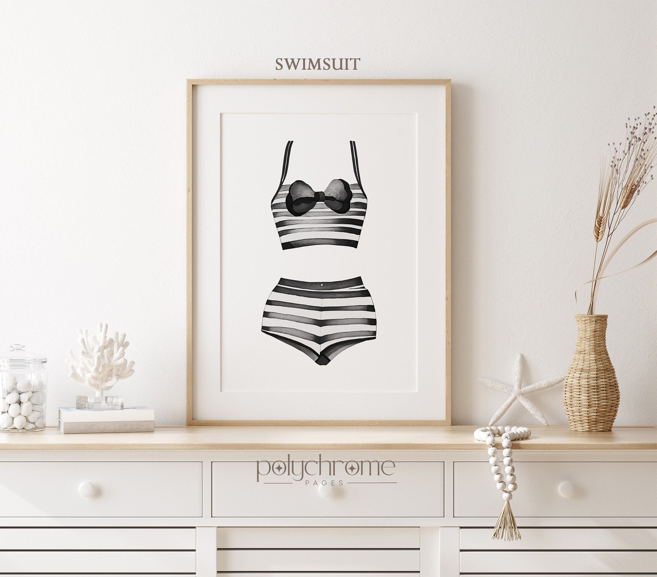 This charming set of hand-painted swimsuits in classic black and white brings to mind lazy summer days by the water. The simple, graphic style works beautifully in a lake house laundry room, pool bathroom, or beach cottage. A fun choice for anyone who loves understated coastal decor with a vintage feel.