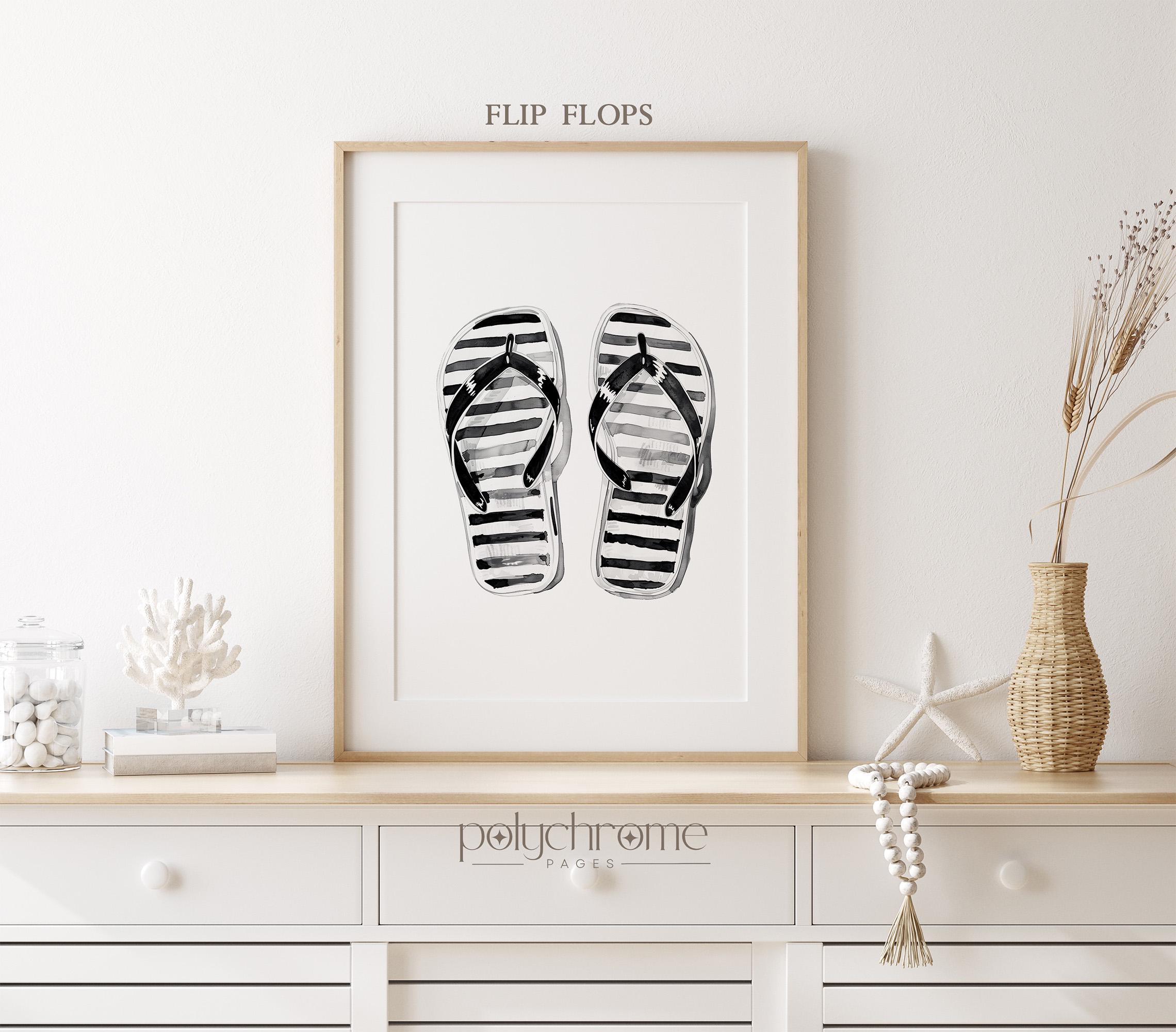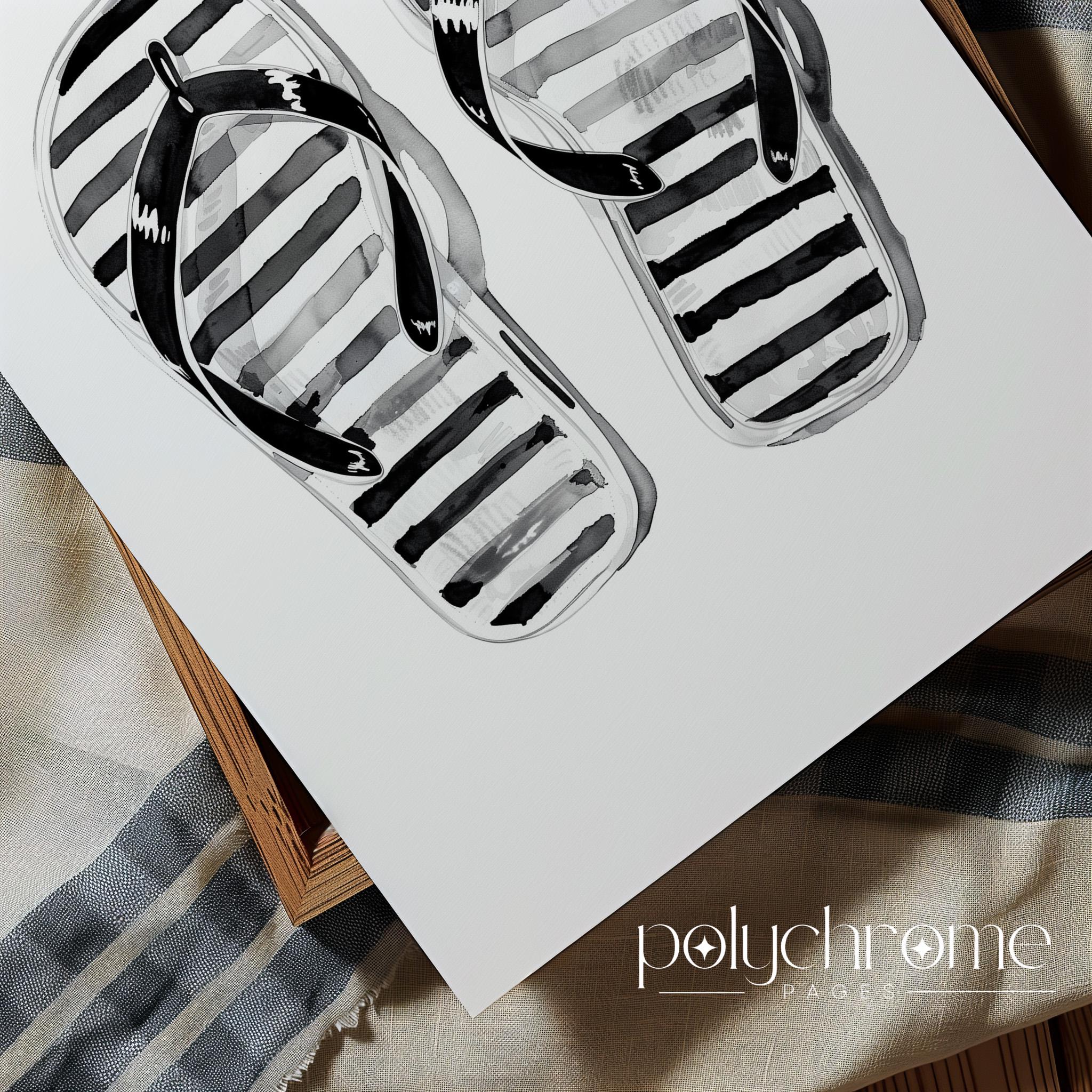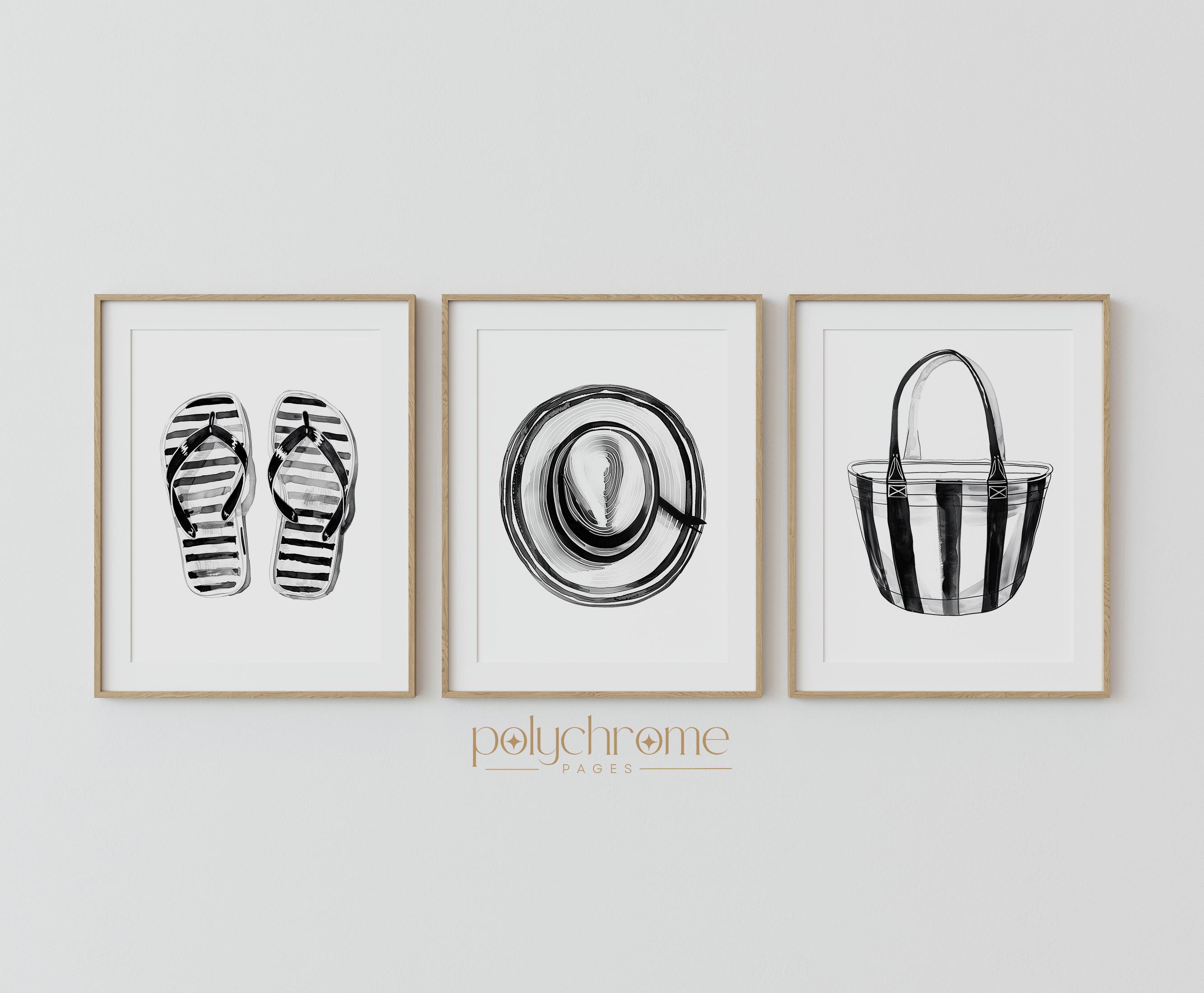This cheerful summer set includes classic beach essentials—striped flip flops, a floppy straw hat, and a roomy beach bag—all painted in crisp black and white watercolor. The bold stripes give these pieces a graphic, modern edge while keeping that laid-back vacation feel. Perfect for a pool bathroom, beach house entryway, or lake cabin mudroom. A great fit for anyone who loves clean, monochromatic coastal style.