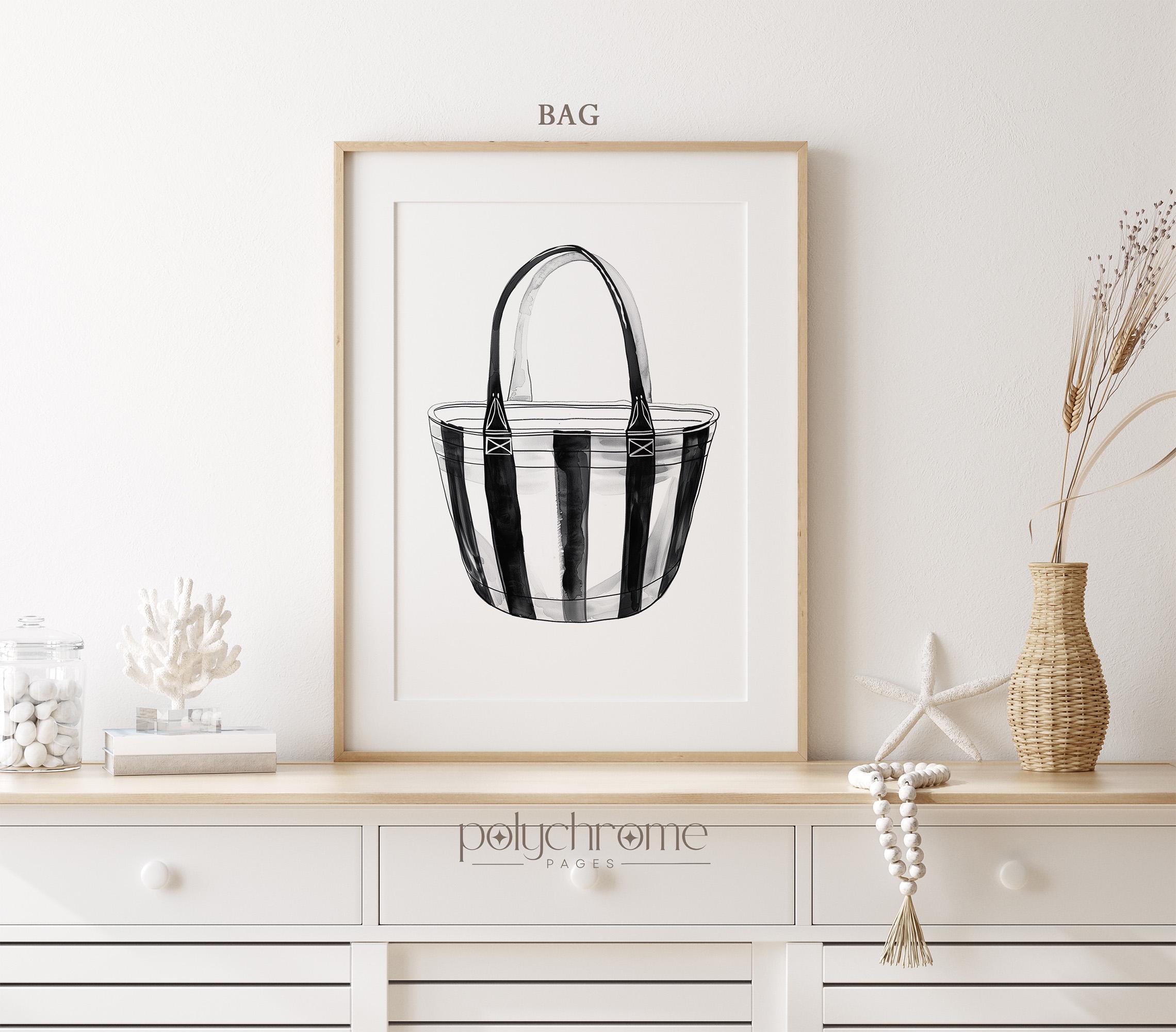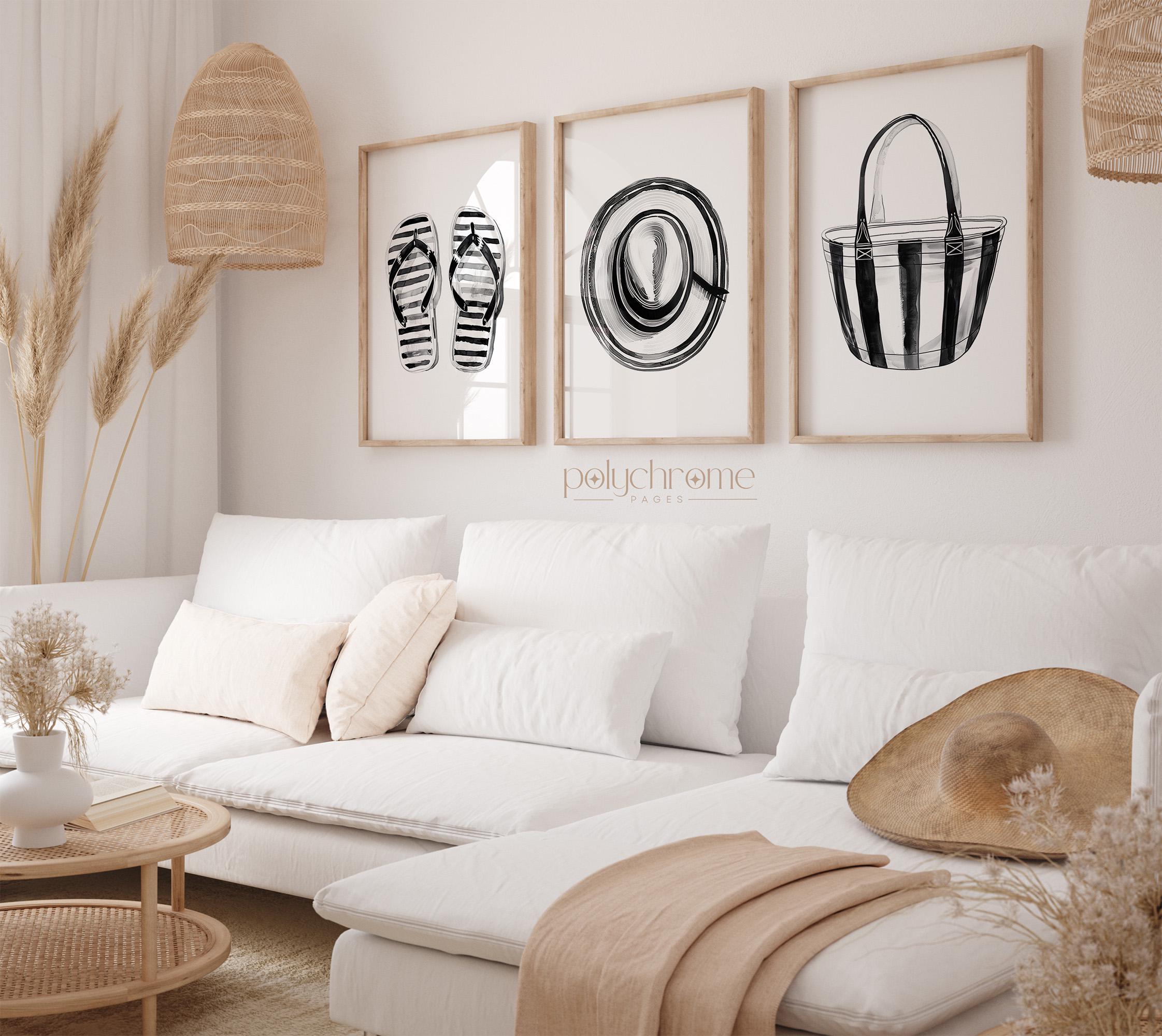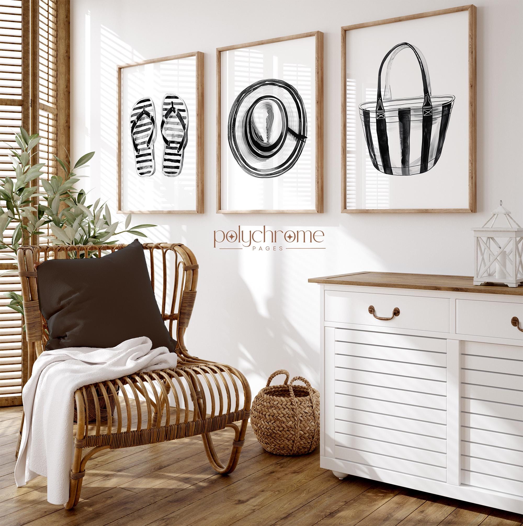 This cheerful summer set includes classic beach essentials—striped flip flops, a floppy straw hat, and a roomy beach bag—all painted in crisp black and white watercolor. The bold stripes give these pieces a graphic, modern edge while keeping that laid-back vacation feel. Perfect for a pool bathroom, beach house entryway, or lake cabin mudroom. A great fit for anyone who loves clean, monochromatic coastal style.