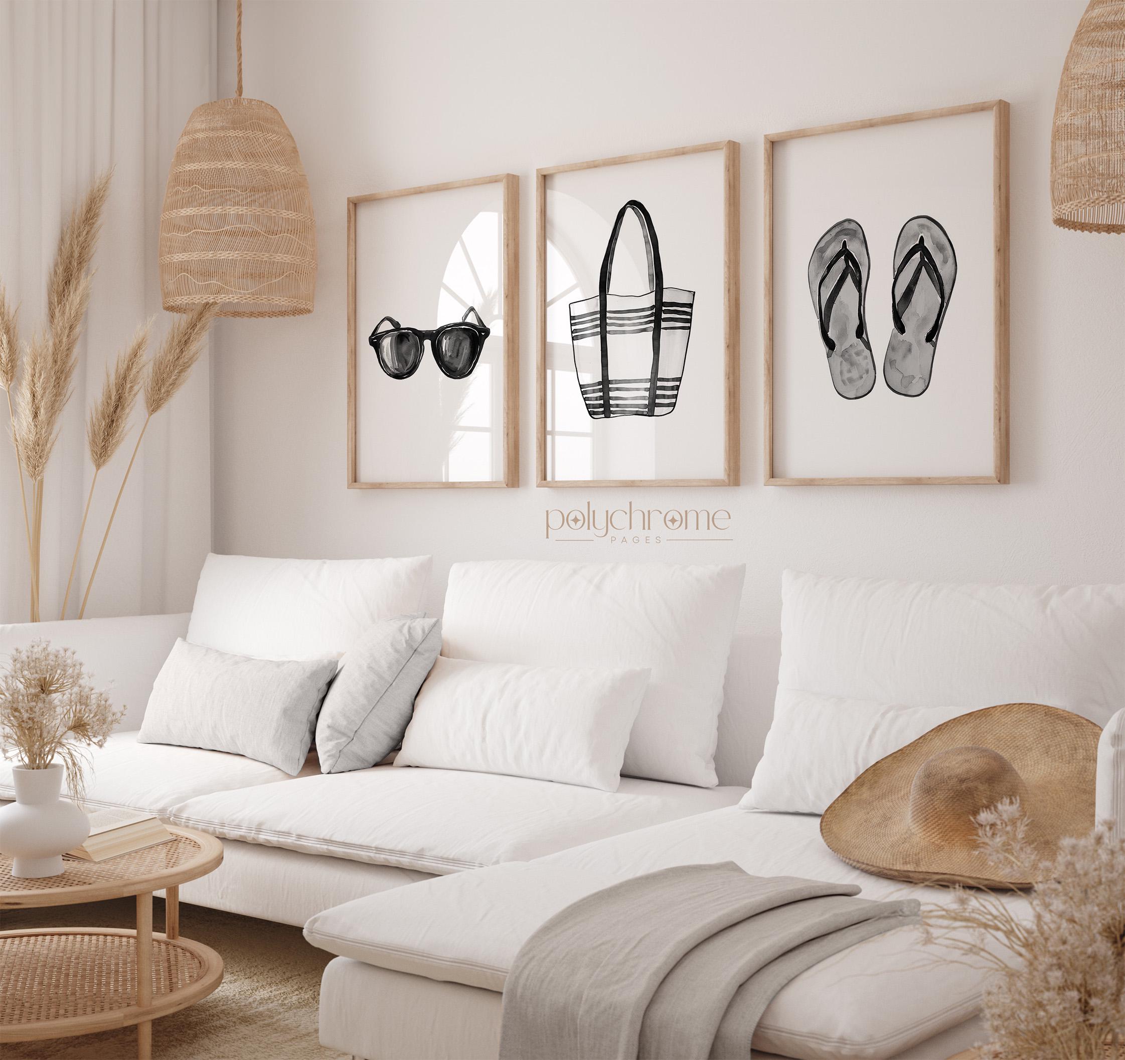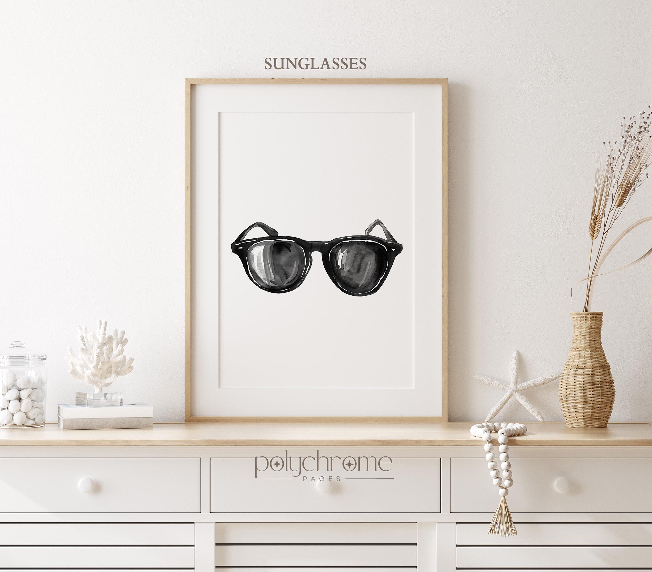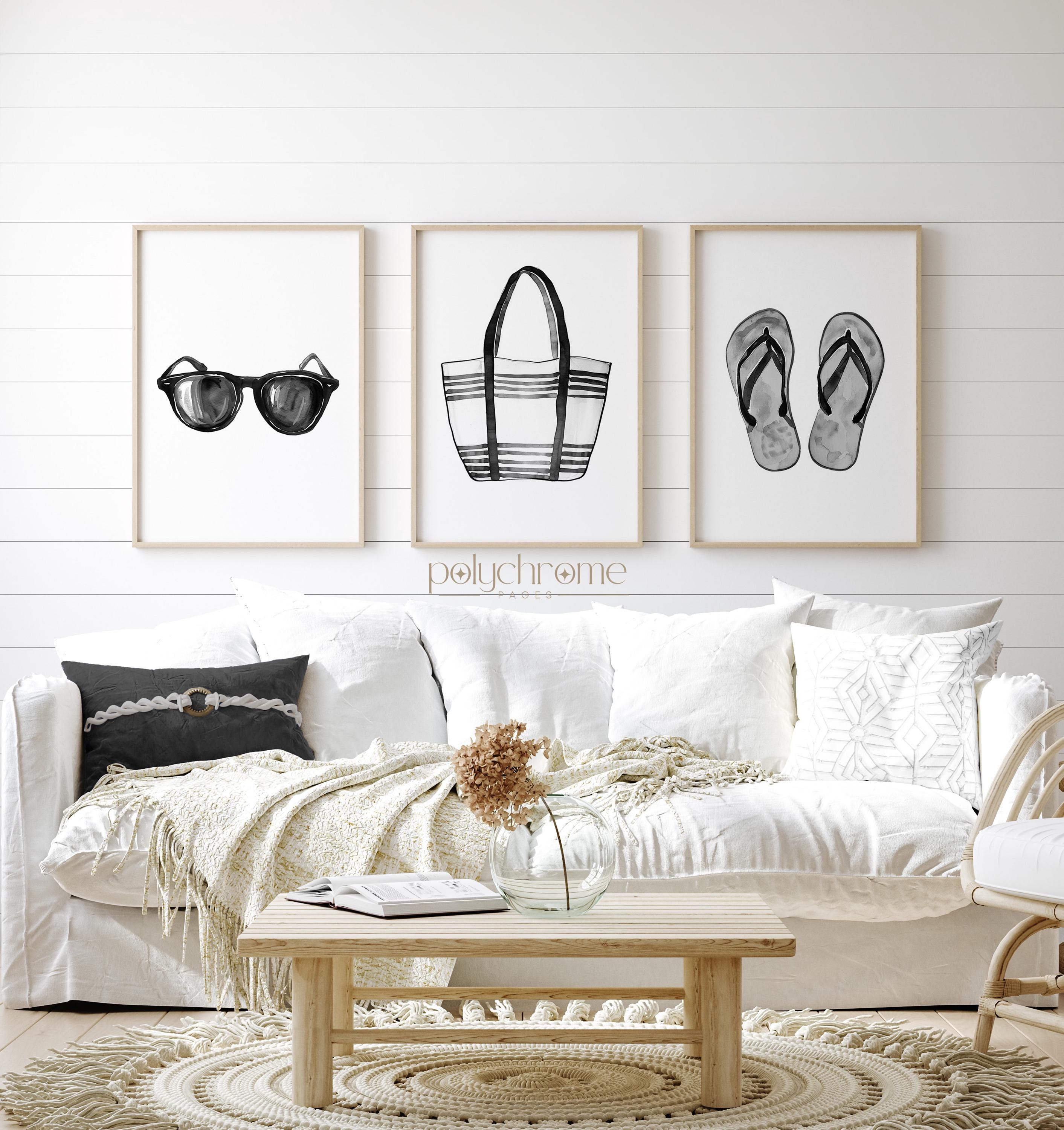 This watercolor set consists of classic summer essentials—sleek black sunglasses, a striped beach bag, and casual flip flops—rendered in a chic black and white palette. The monochrome tones give these pieces a sophisticated edge while keeping that laid-back summer feel. Perfect for a pool bathroom, beach house hallway, or anyone who loves coastal style with a modern, minimalist twist.