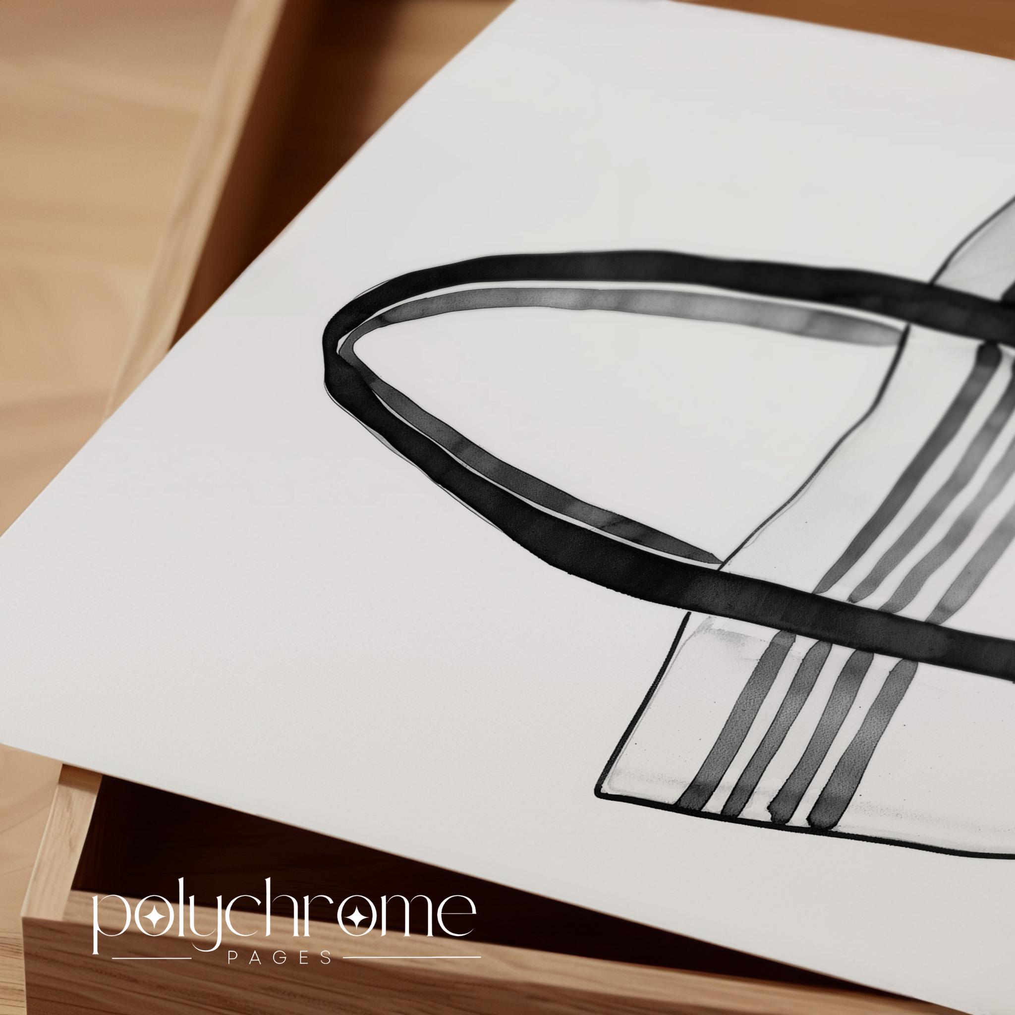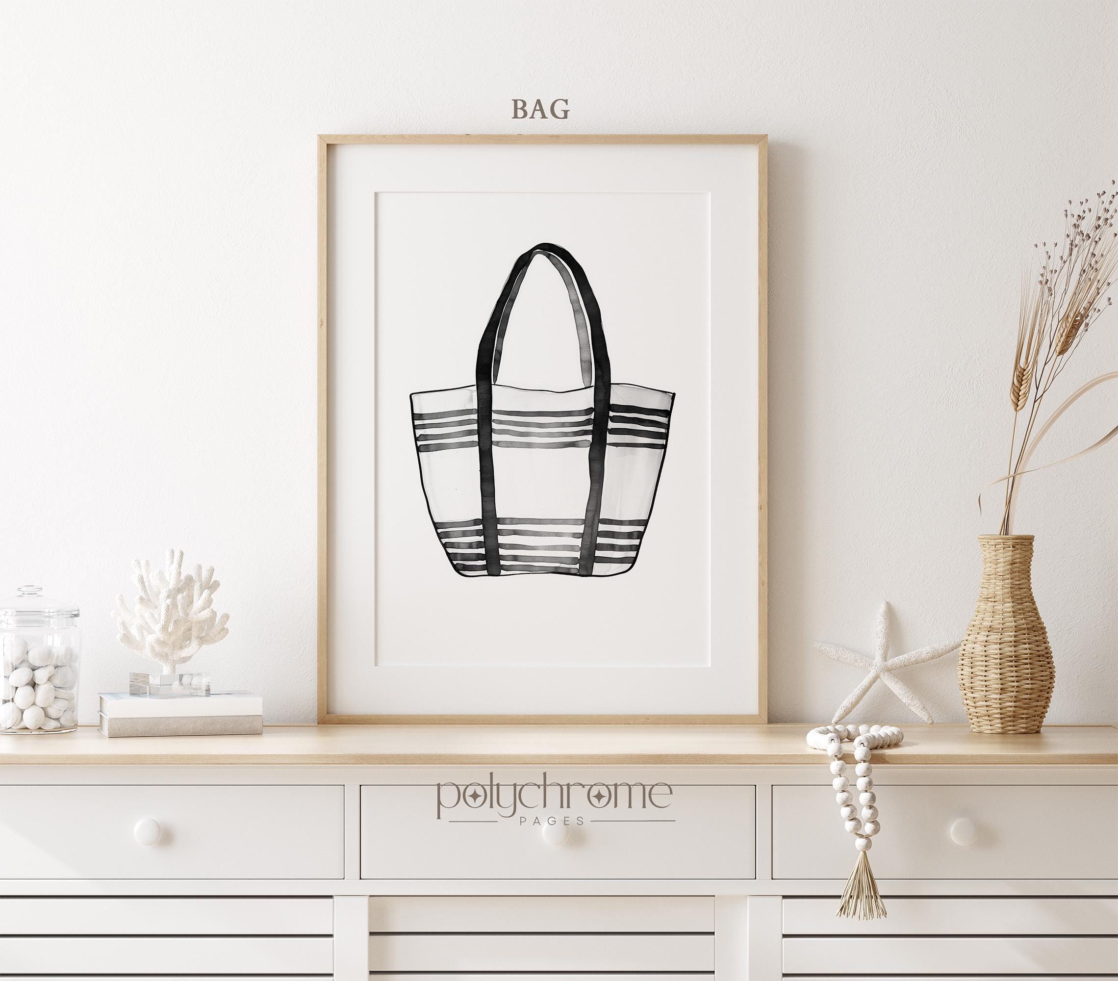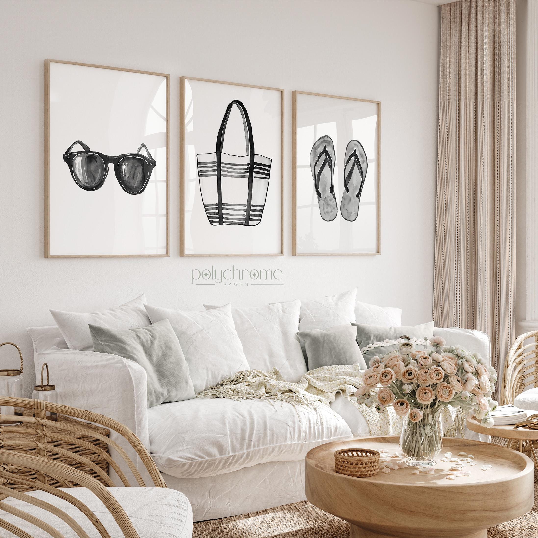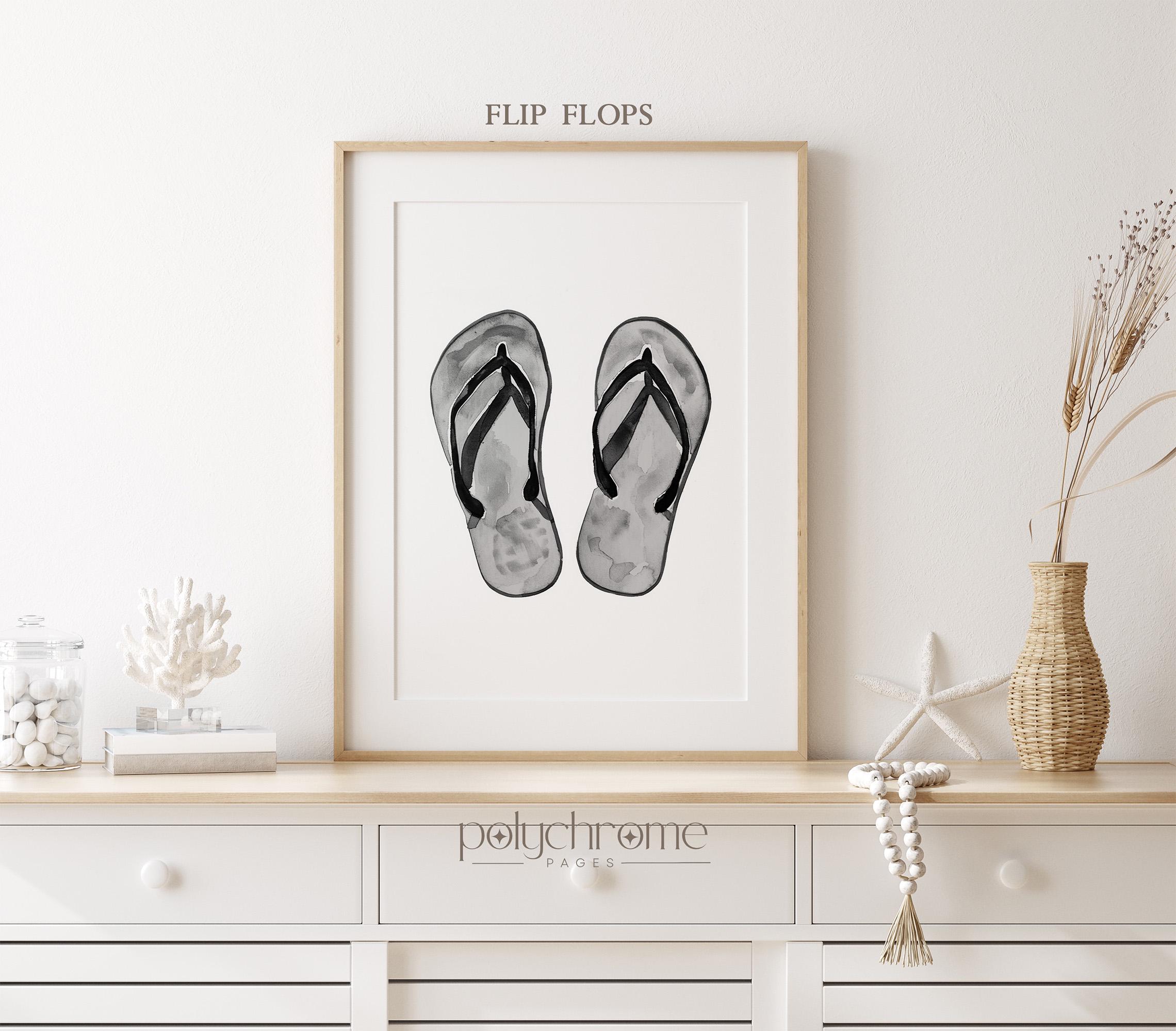 This watercolor set consists of classic summer essentials—sleek black sunglasses, a striped beach bag, and casual flip flops—rendered in a chic black and white palette. The monochrome tones give these pieces a sophisticated edge while keeping that laid-back summer feel. Perfect for a pool bathroom, beach house hallway, or anyone who loves coastal style with a modern, minimalist twist.