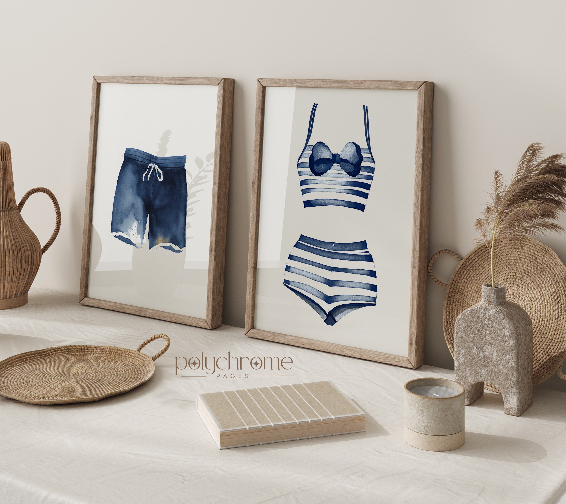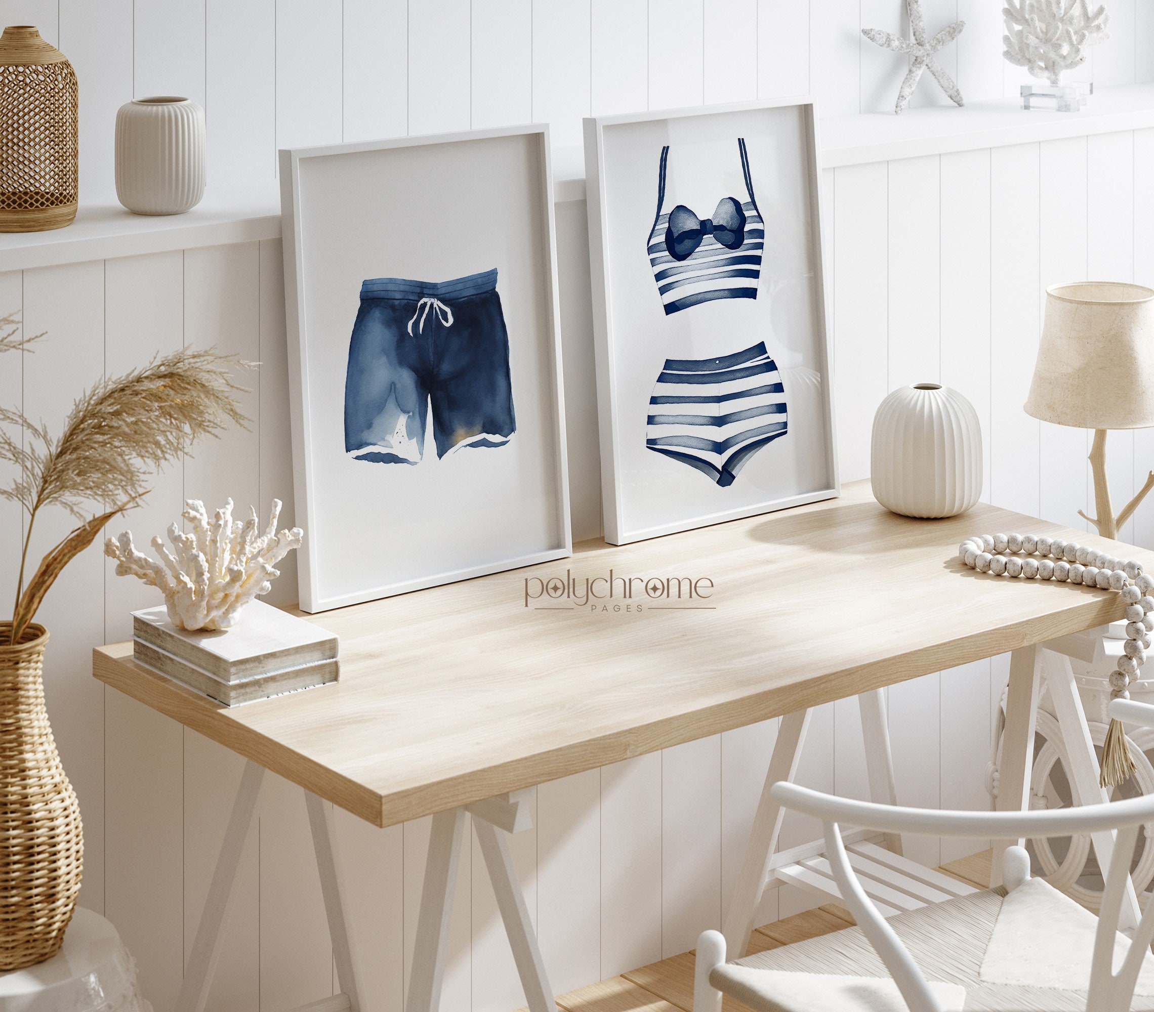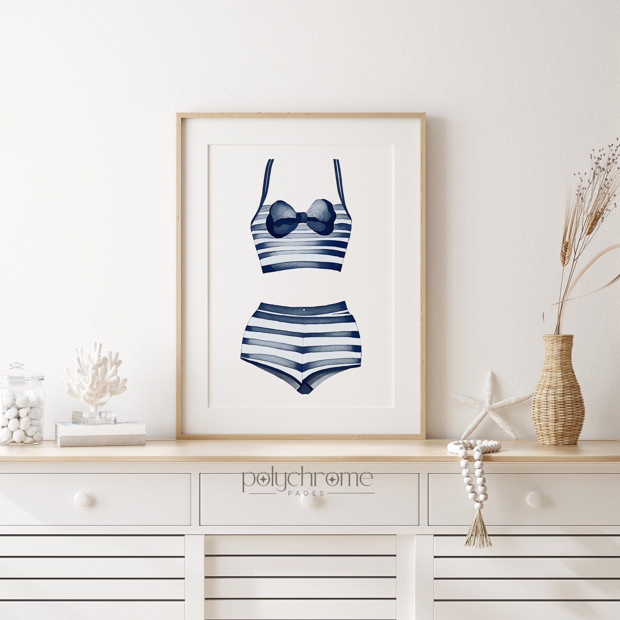This charming set of hand-painted swimsuits in classic blue and white stripes brings to mind lazy summer days by the water. The hale navy tones pair beautifully with coastal interiors, making these pieces ideal for a lake house laundry room, pool bathroom, or beach cottage. A sweet choice for anyone who loves relaxed, summery decor.