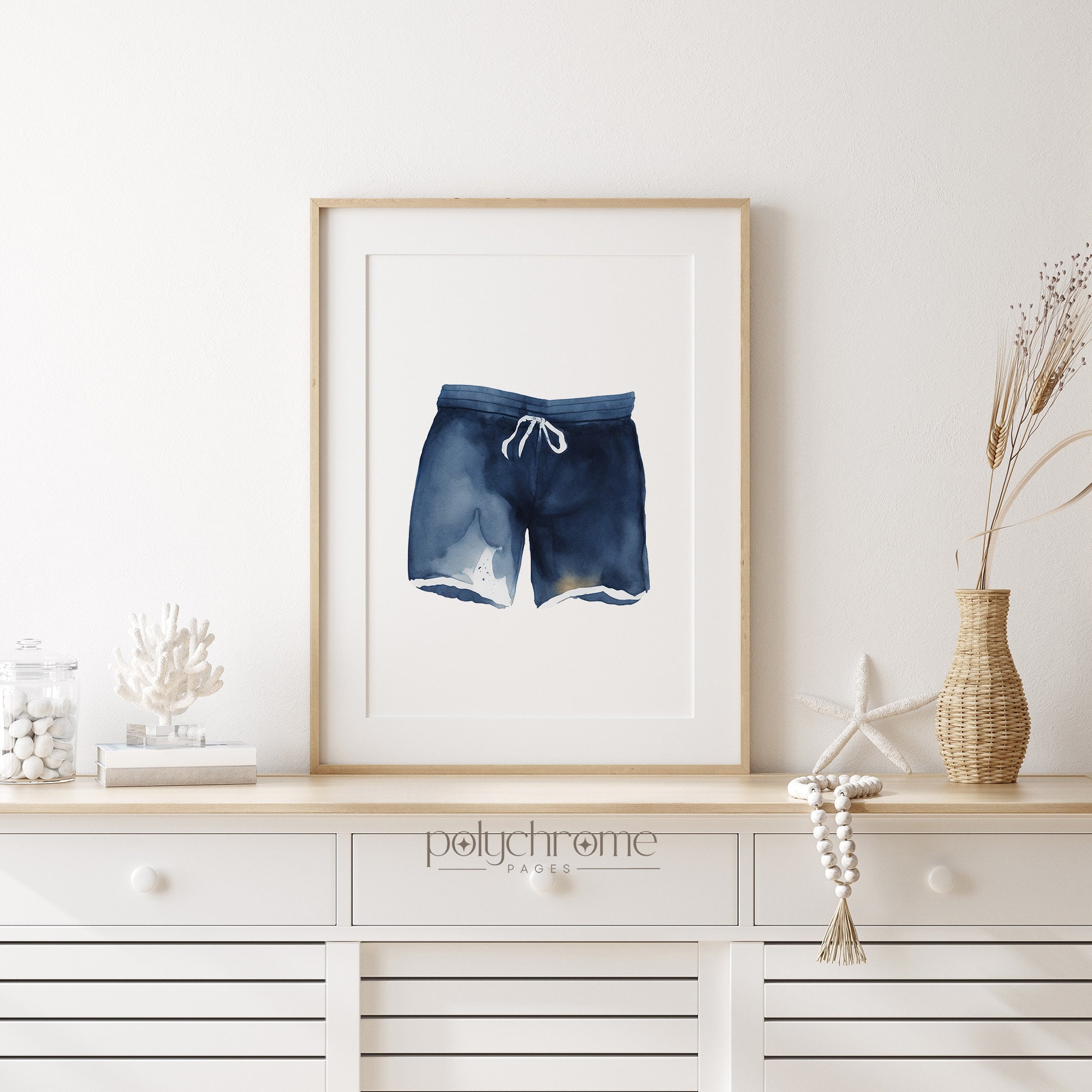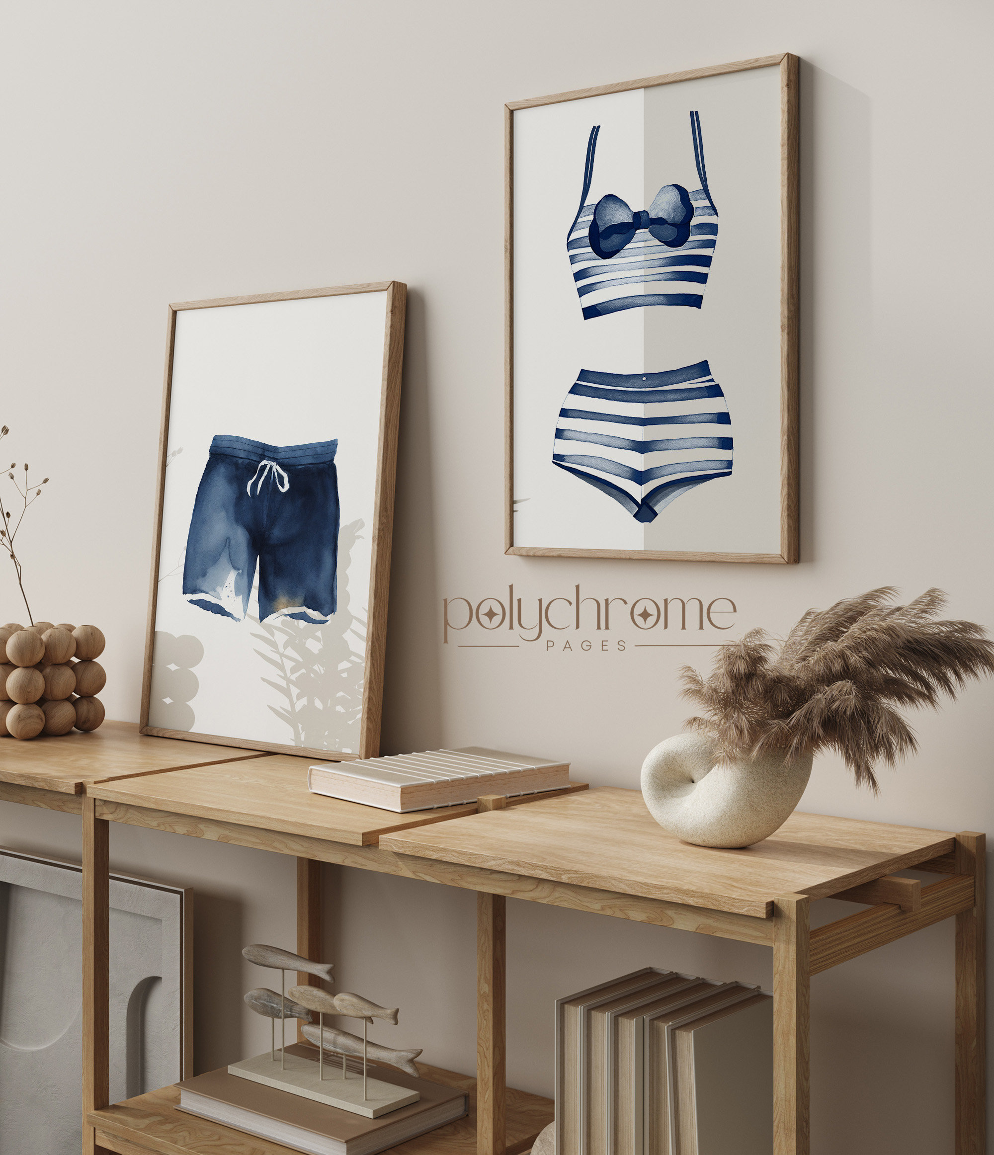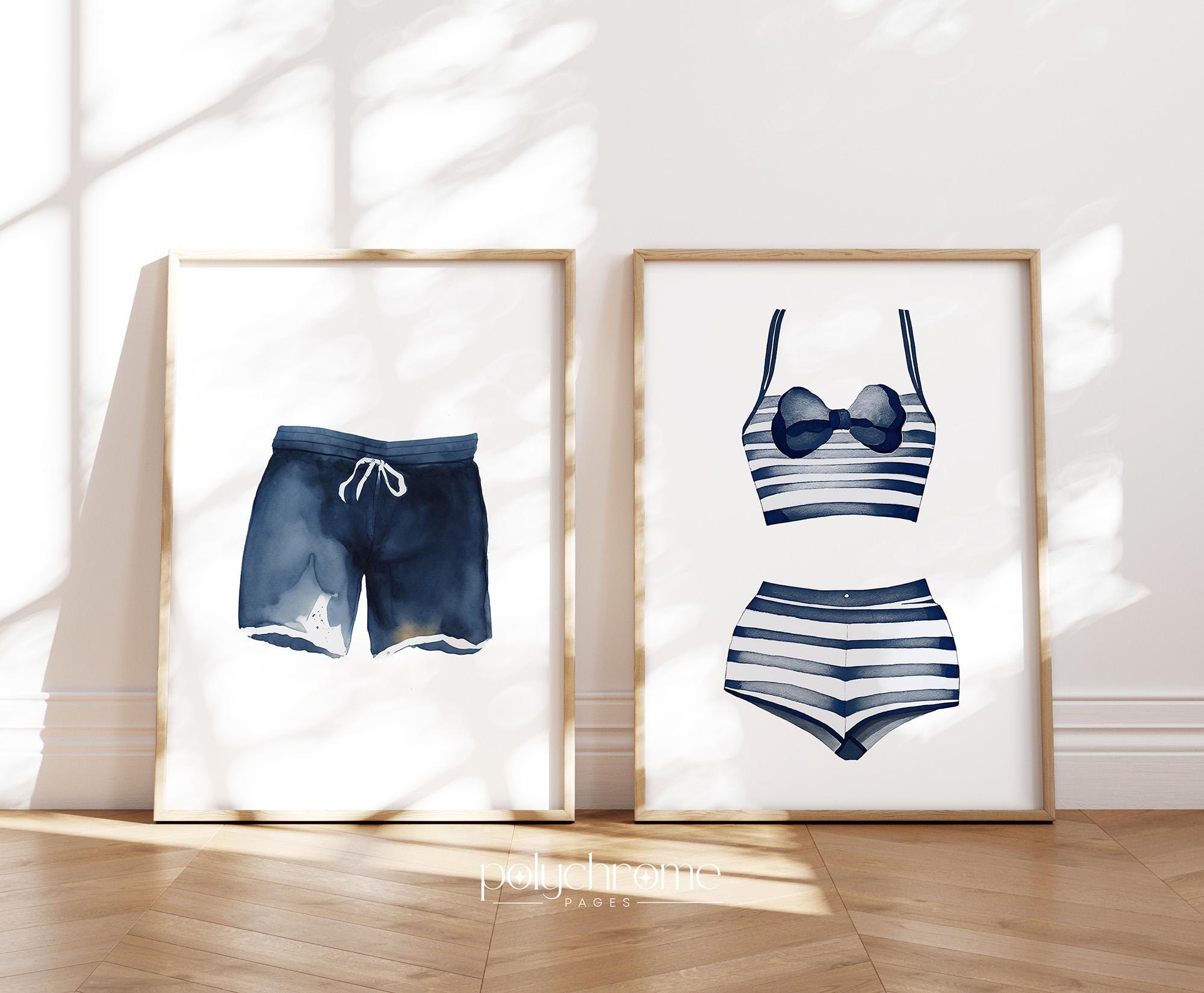 This charming set of hand-painted swimsuits in classic blue and white stripes brings to mind lazy summer days by the water. The hale navy tones pair beautifully with coastal interiors, making these pieces ideal for a lake house laundry room, pool bathroom, or beach cottage. A sweet choice for anyone who loves relaxed, summery decor.