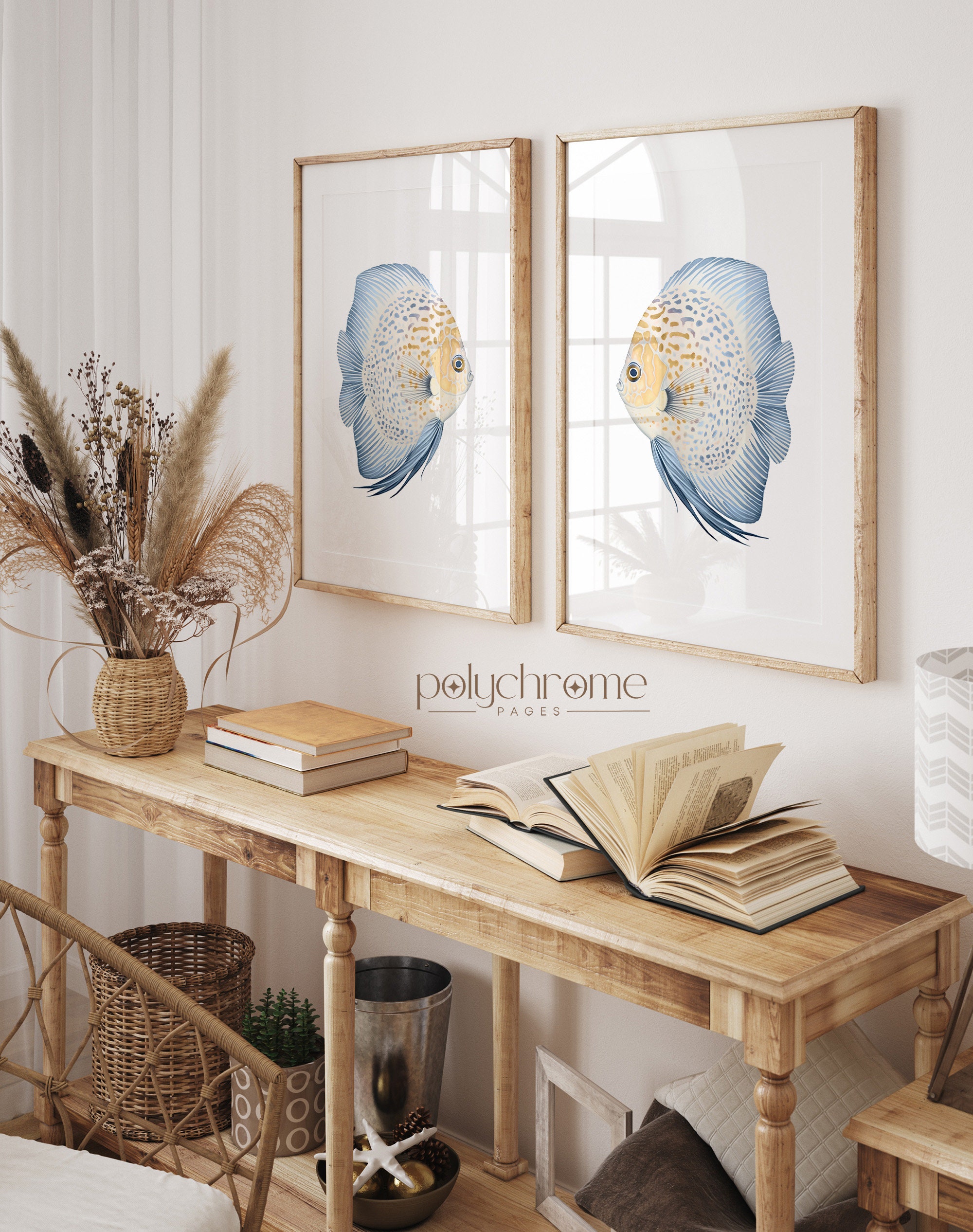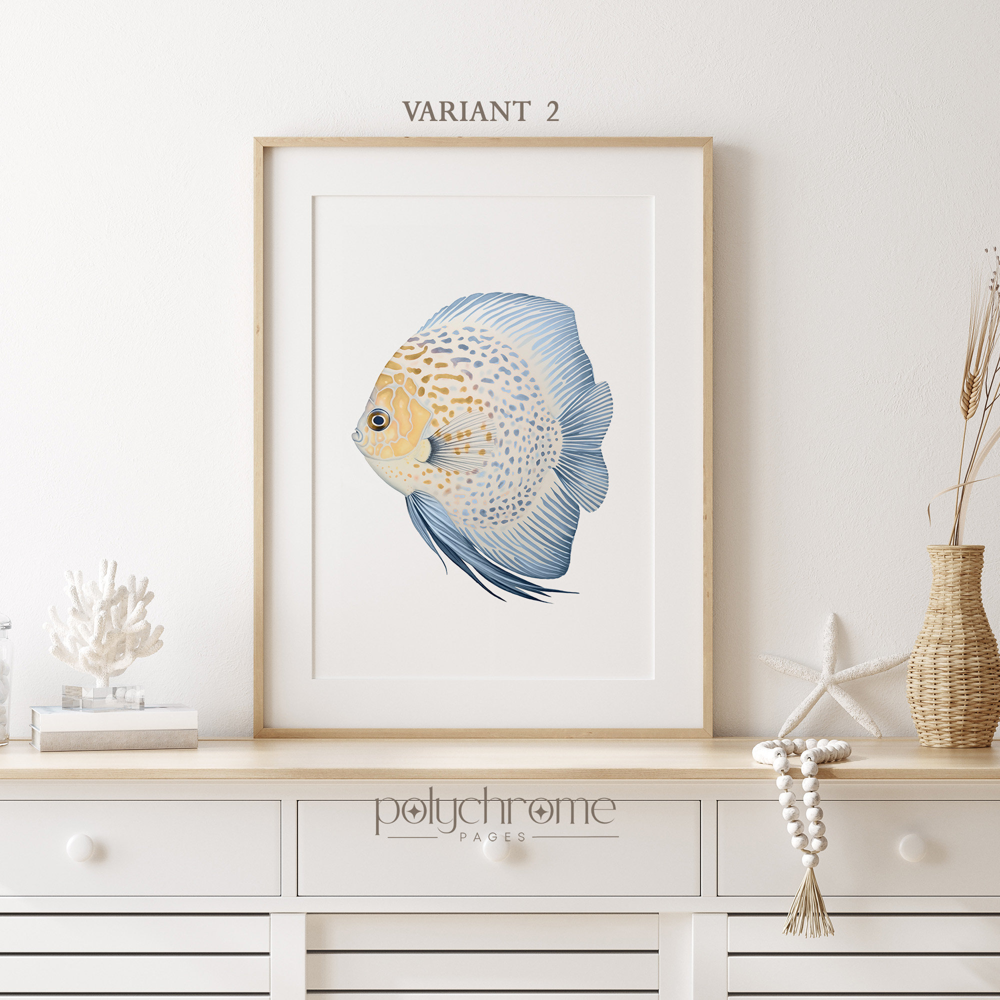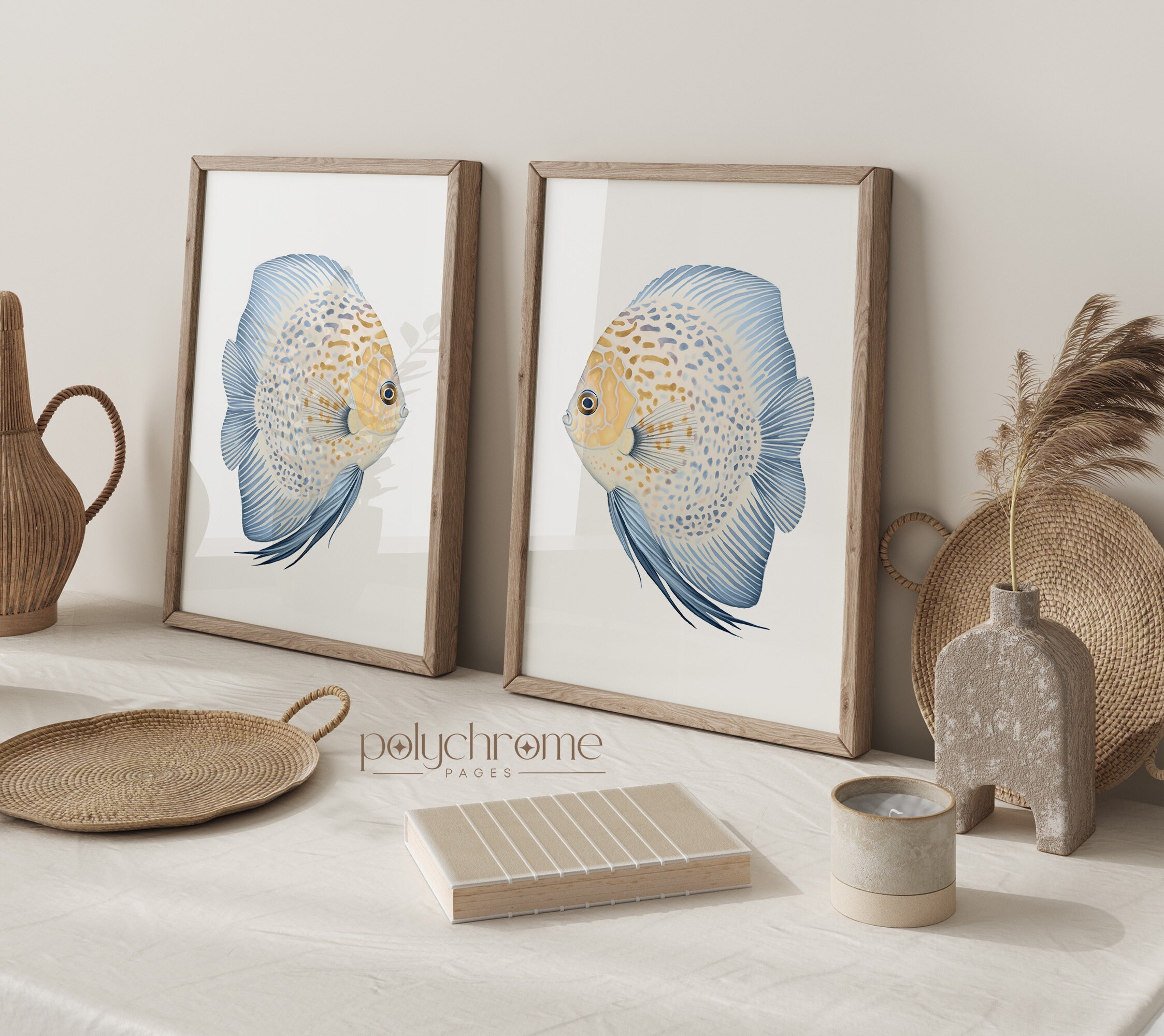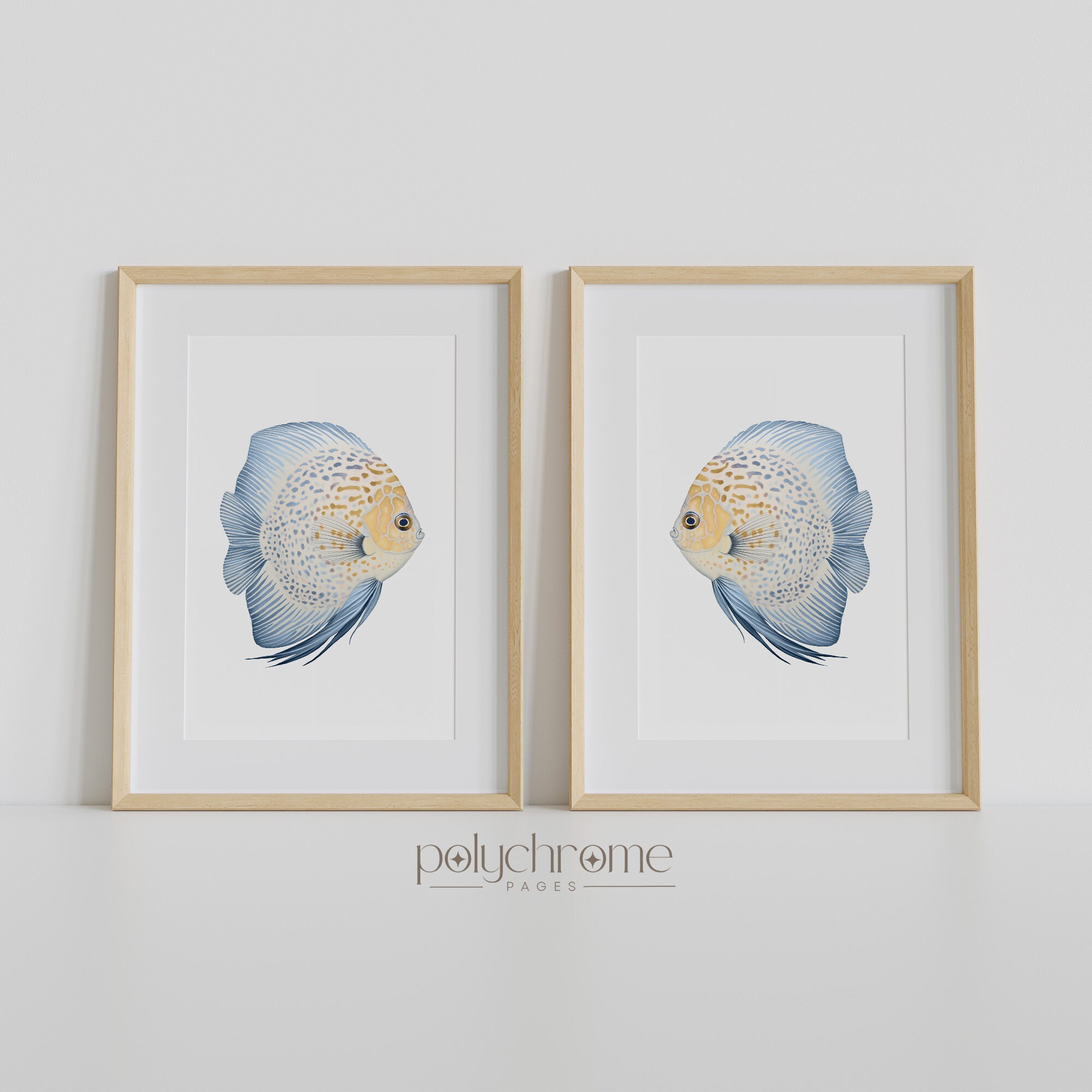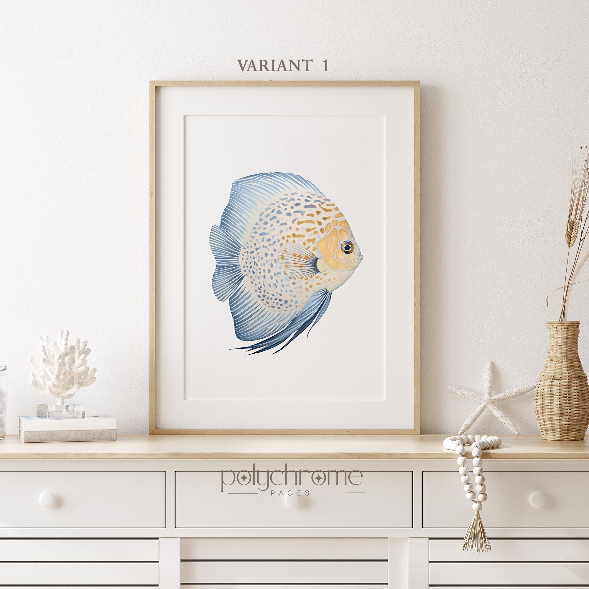 A striking blue and yellow discus fish painted in soft watercolor tones, bringing tropical flair to any coastal-inspired space. The warm yellow and deep blue palette creates a cheerful, exotic feel that works beautifully in bathrooms, pool areas, or beach house living spaces. Ideal for anyone who loves tropical fish or wants to add a splash of colour to their nautical or Hamptons-style decor.