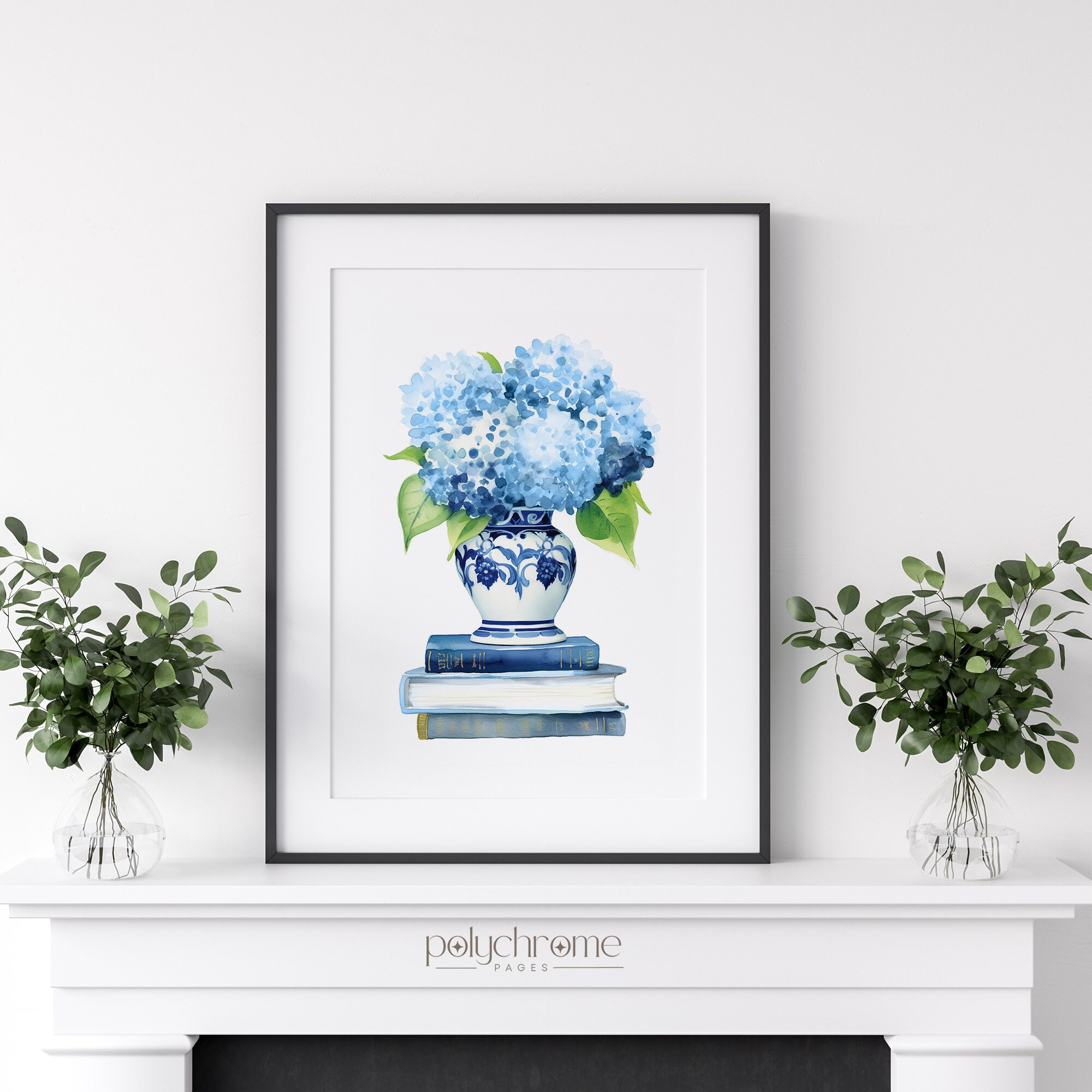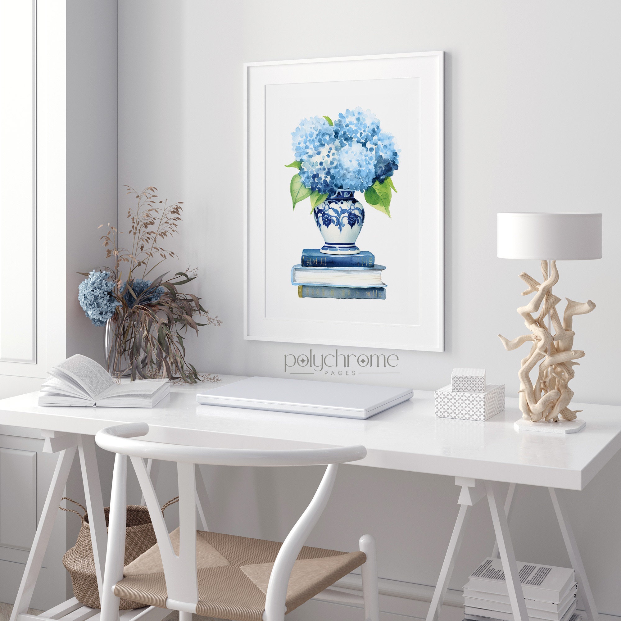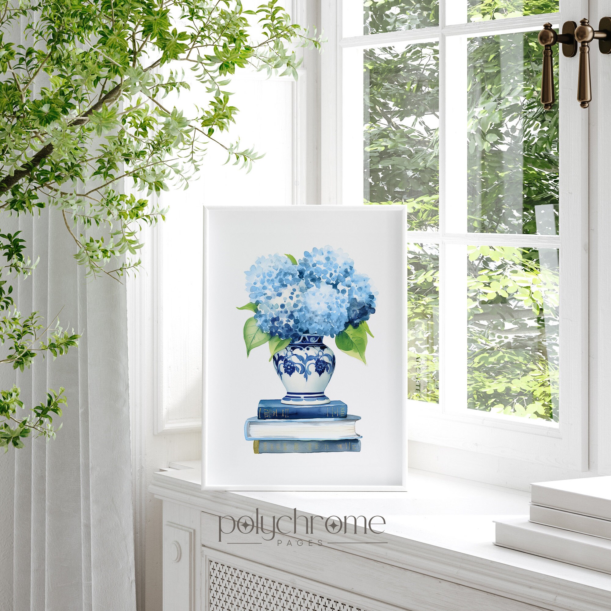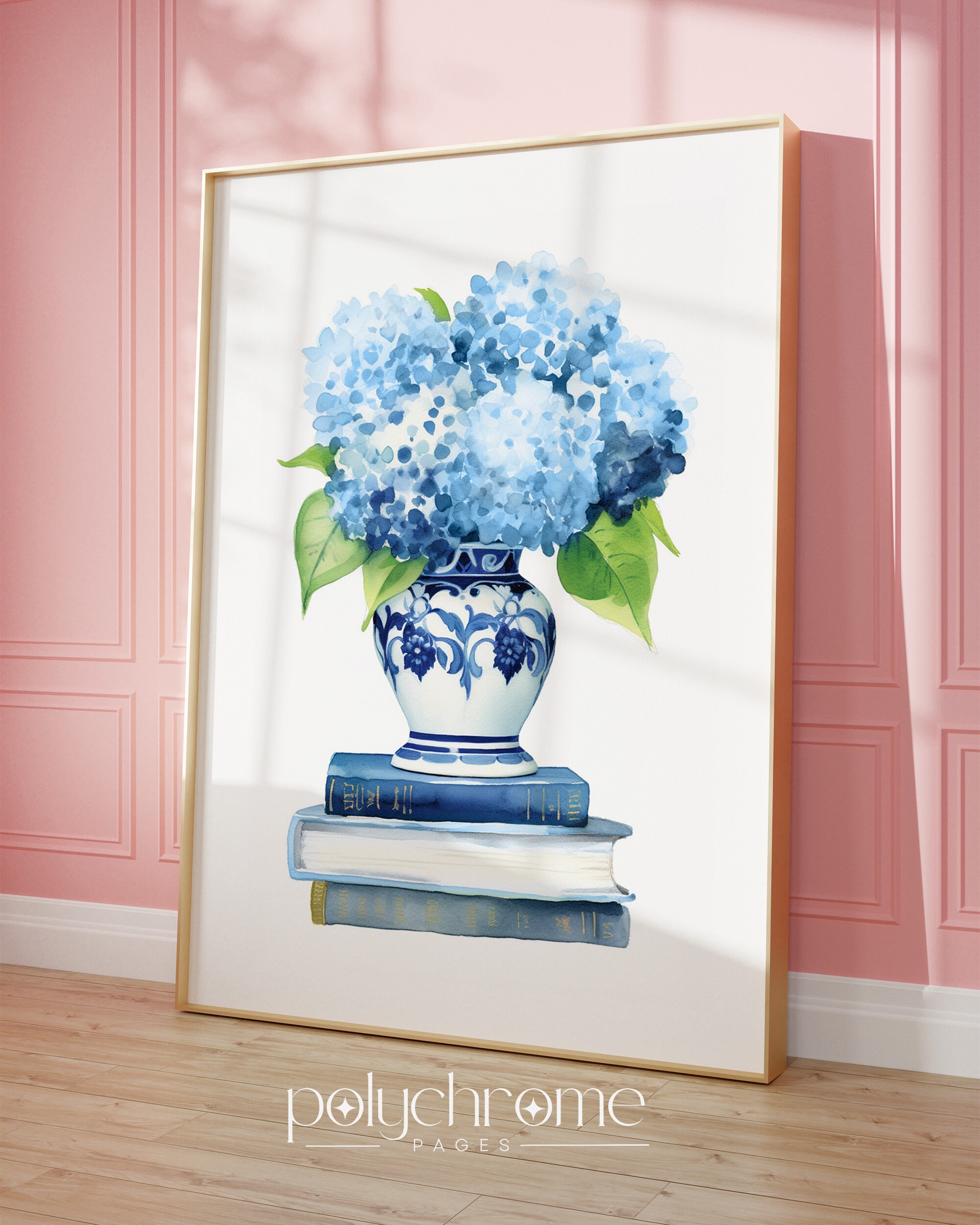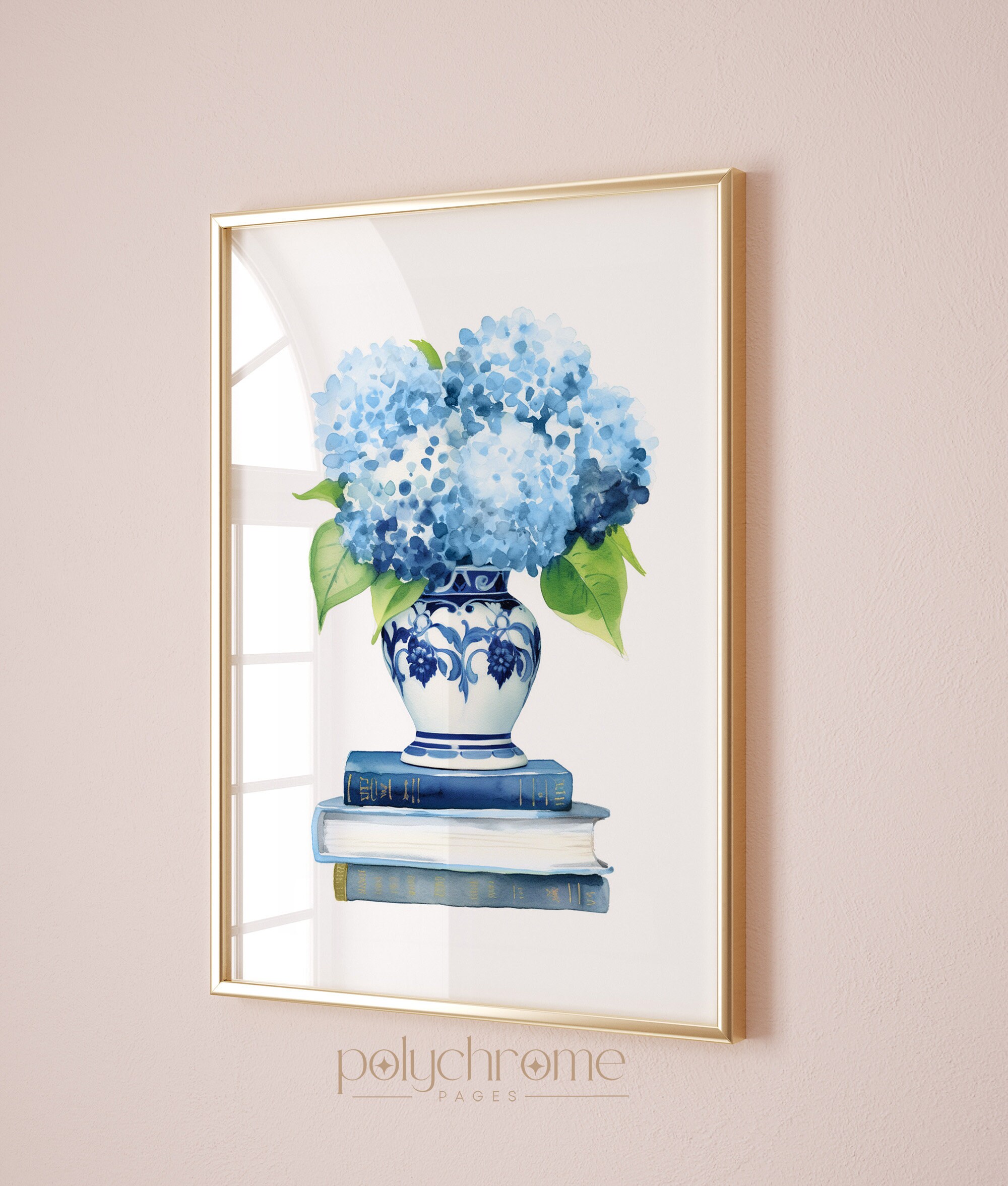 A classic blue and white chinoiserie vase overflowing with soft hydrangeas sits atop a stack of books in this elegant still life. The timeless pairing of hale navy and crisp white brings a refined, collected feel that works beautifully in a bedroom, home office, or reading nook. A lovely choice for book lovers or anyone who appreciates that effortless Hamptons-meets-French country aesthetic.