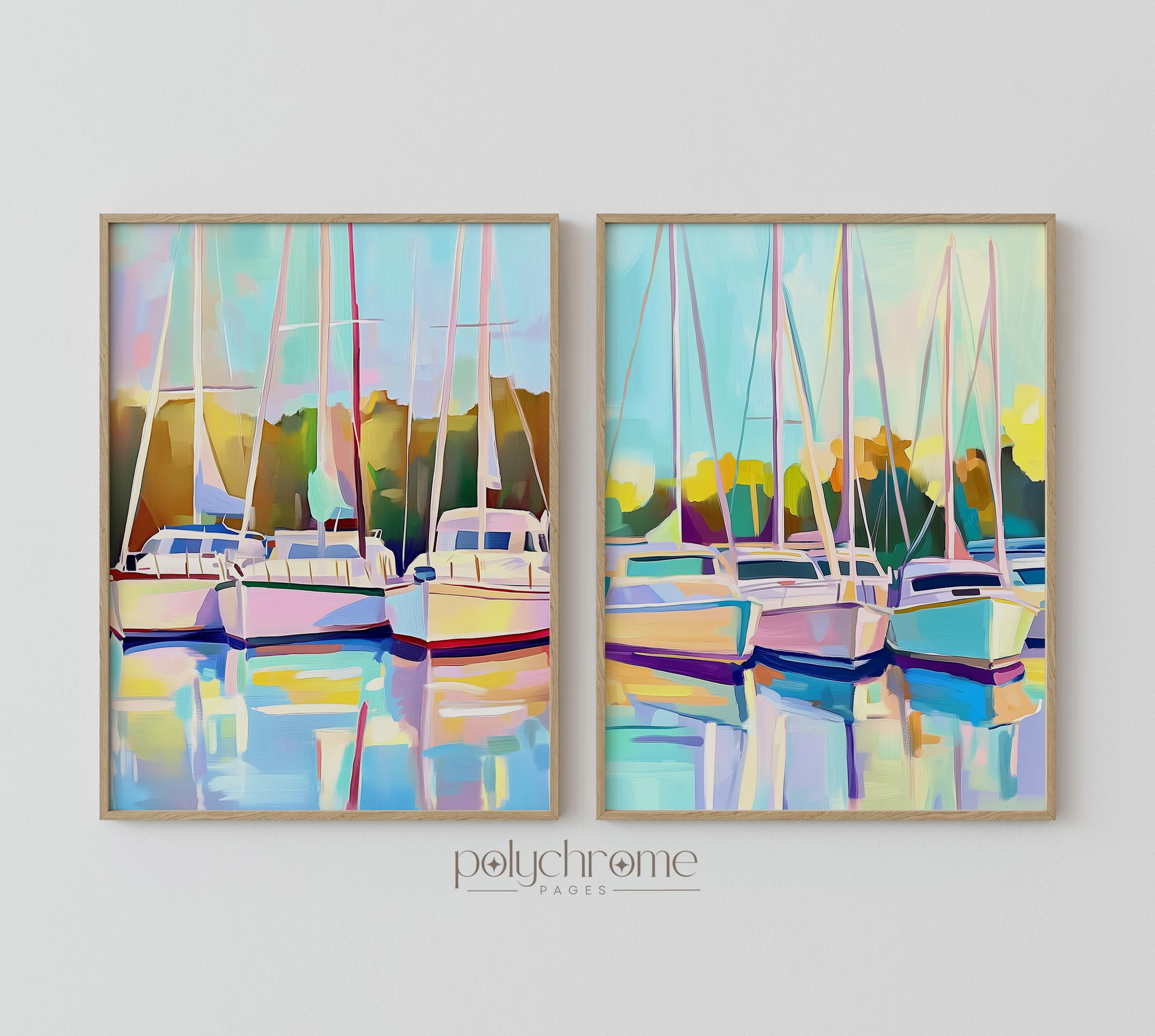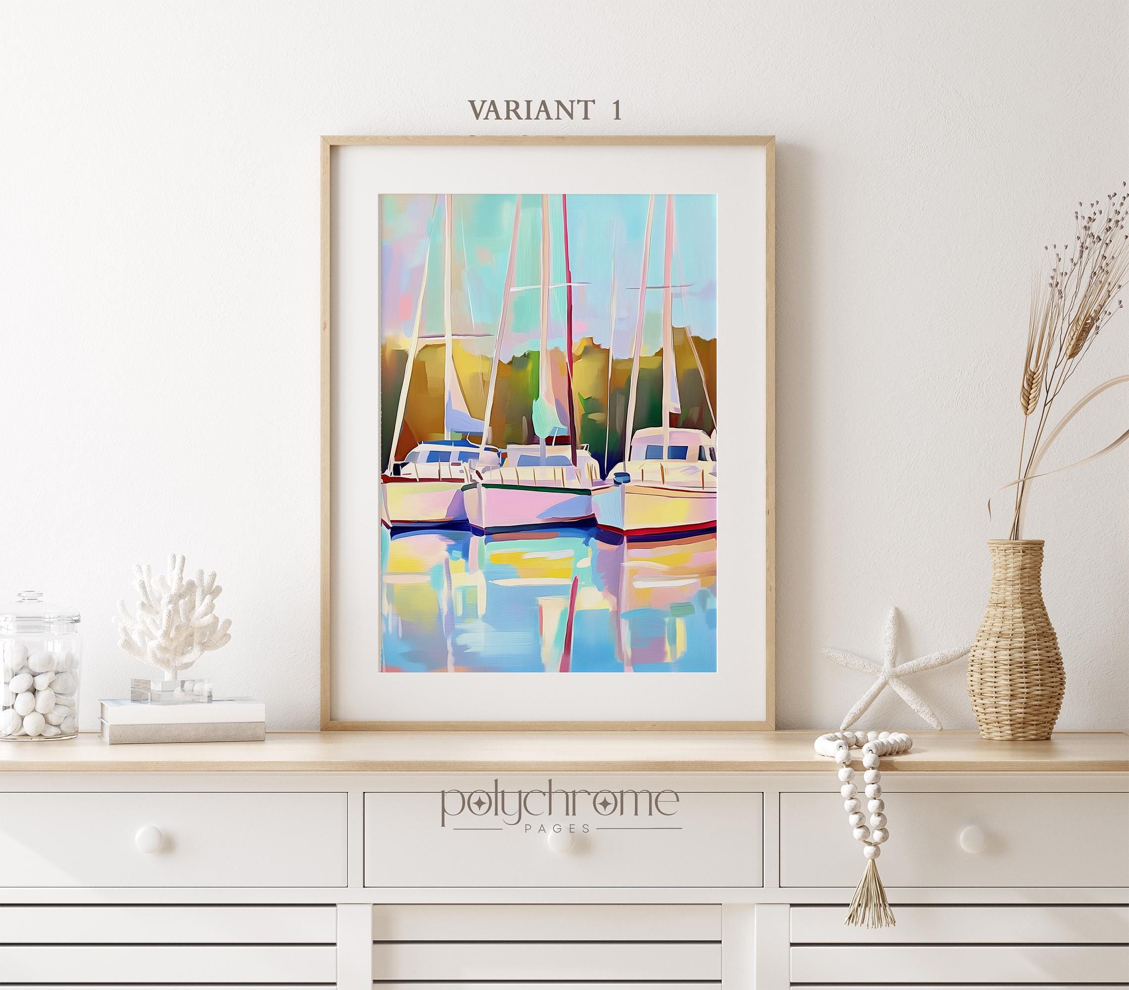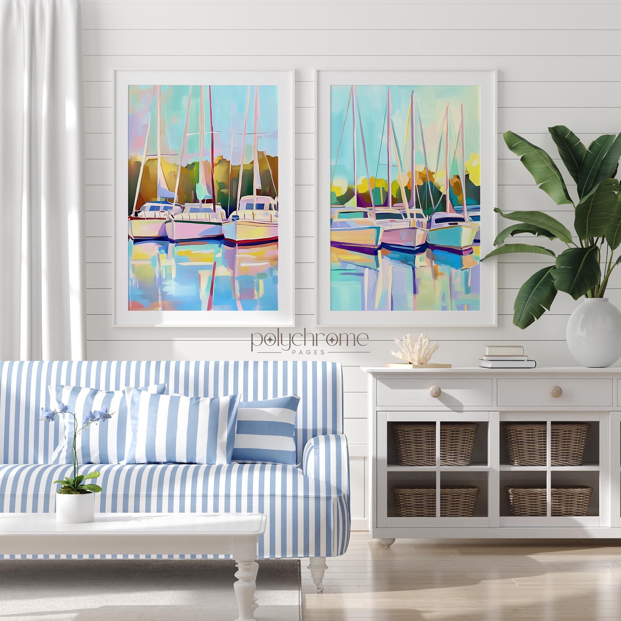 This serene harbor scene captures sailboats resting in a calm marina, painted in soft pastel blues and greens that feel fresh and tranquil. The gentle nautical landscape works beautifully in living rooms, bedrooms, or bathrooms seeking a coastal touch. Ideal for anyone who loves lake house aesthetics or dreams of lazy days by the water.