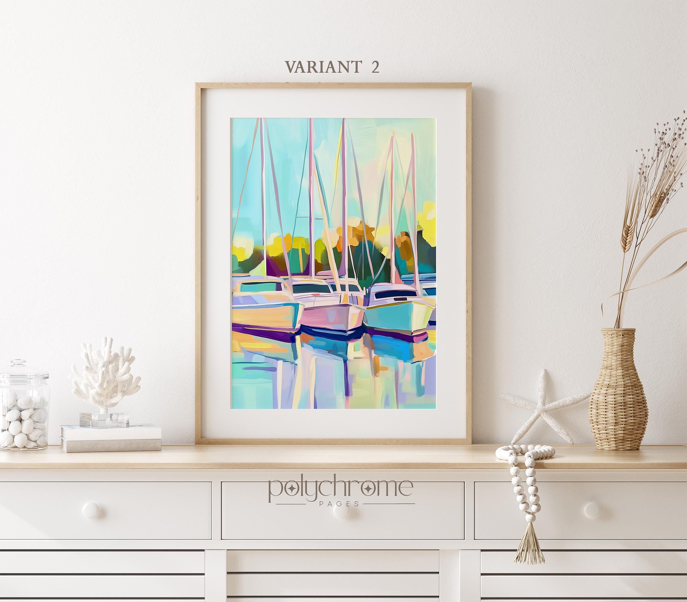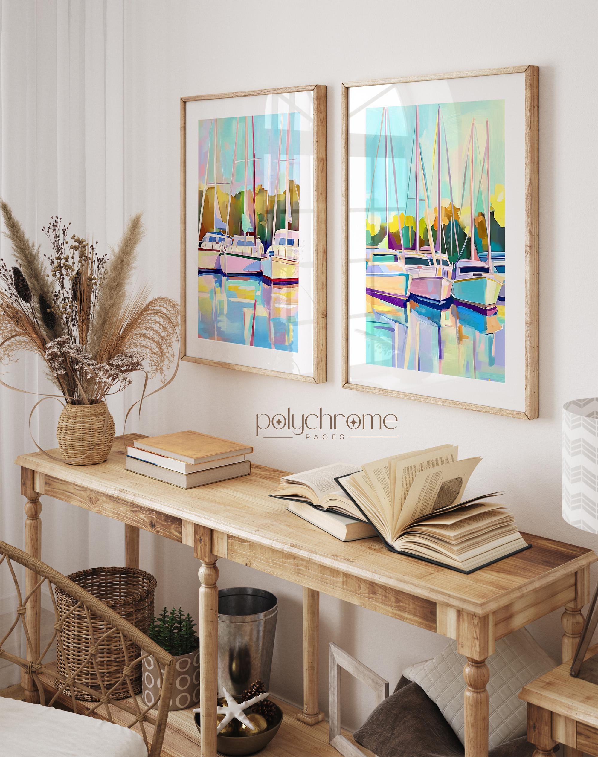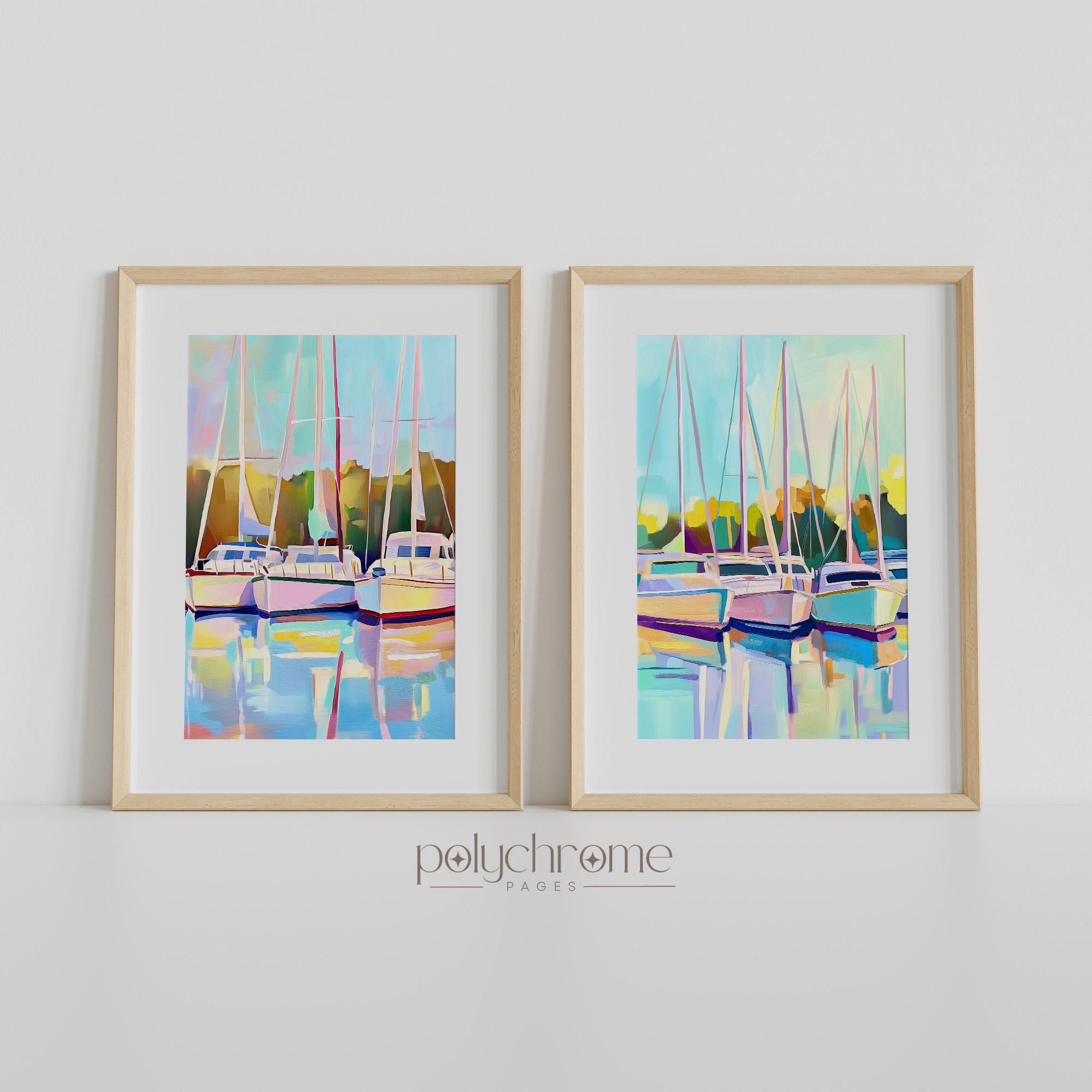 This serene harbor scene captures sailboats resting in a calm marina, painted in soft pastel blues and greens that feel fresh and tranquil. The gentle nautical landscape works beautifully in living rooms, bedrooms, or bathrooms seeking a coastal touch. Ideal for anyone who loves lake house aesthetics or dreams of lazy days by the water.