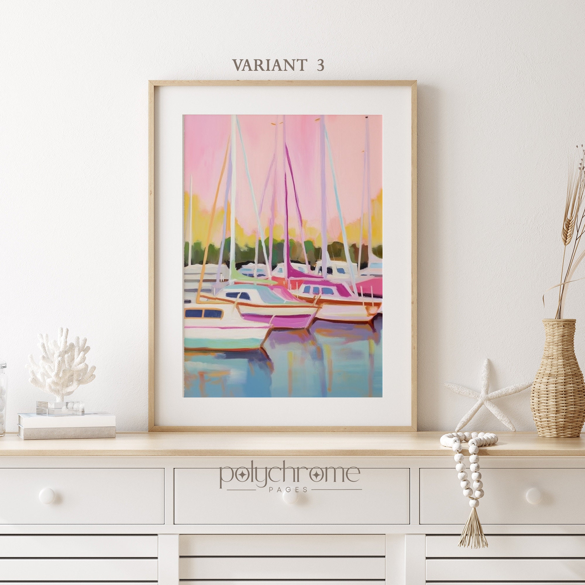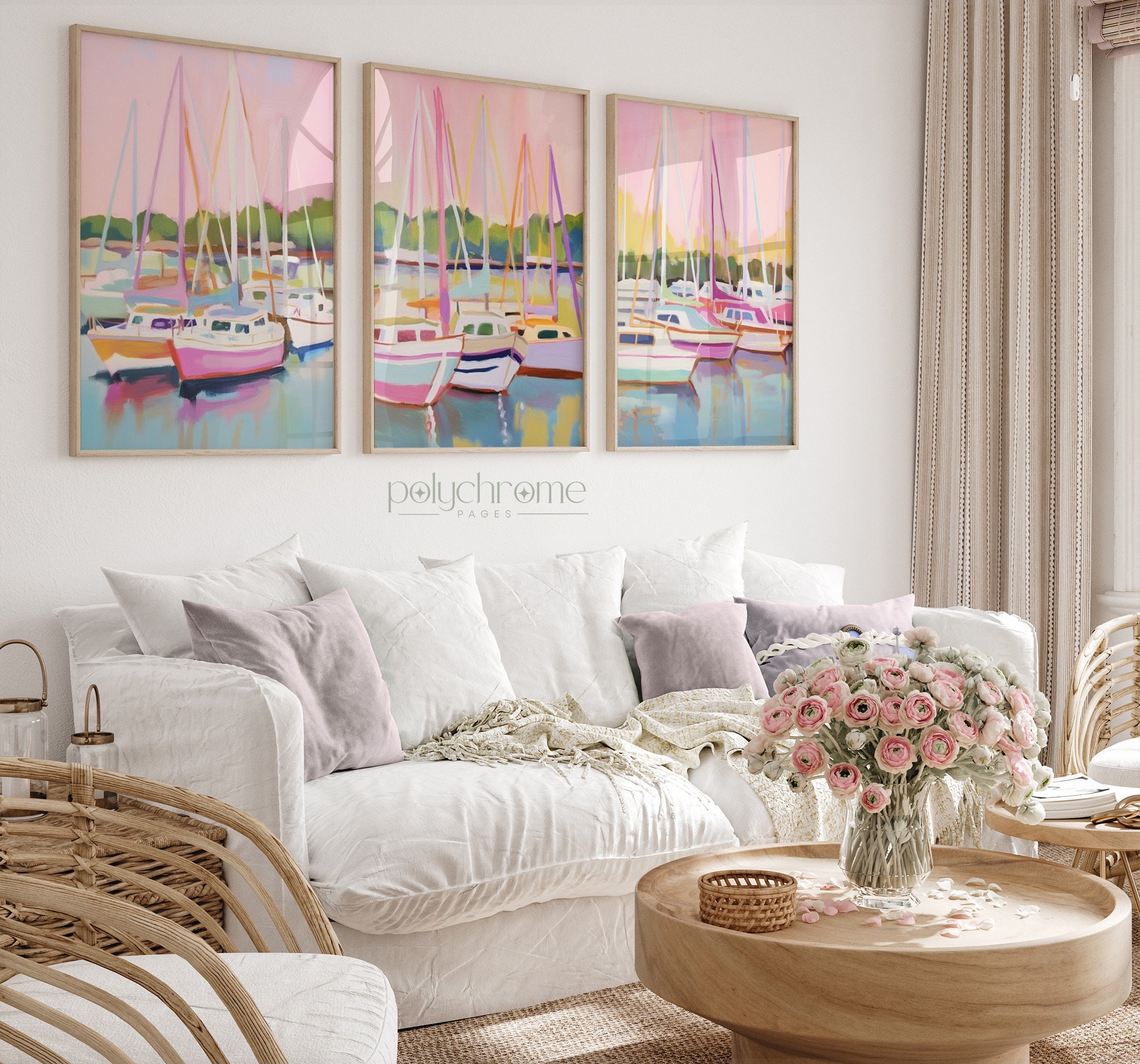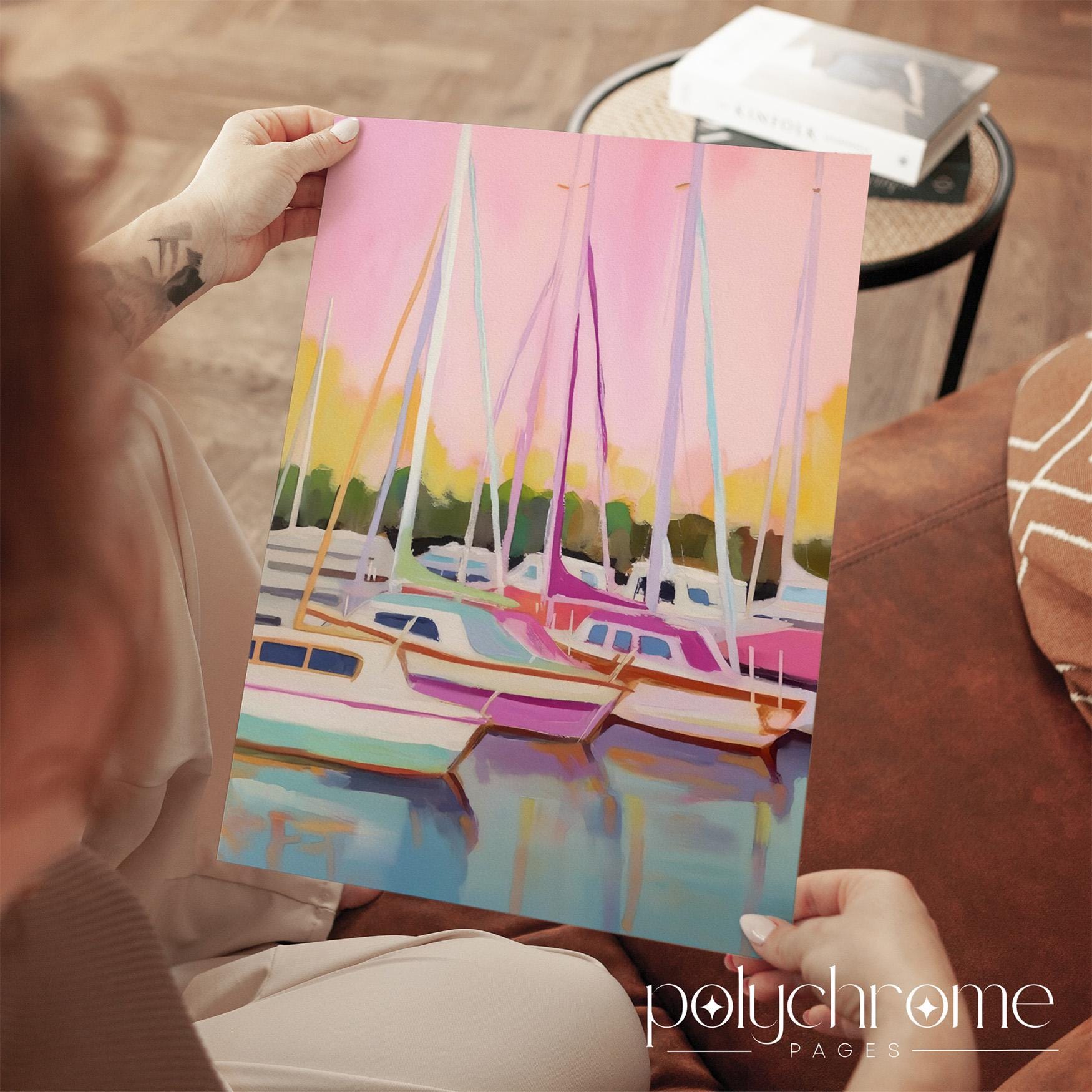 This serene harbor scene captures sailboats moored in a peaceful marina, painted in soft pastel pinks and blues that feel calm and dreamy. The gentle nautical landscape works beautifully in a lake house living room, coastal bedroom, or beach house hallway. A lovely choice for anyone who appreciates sailing, waterfront views, or relaxed seaside aesthetics.