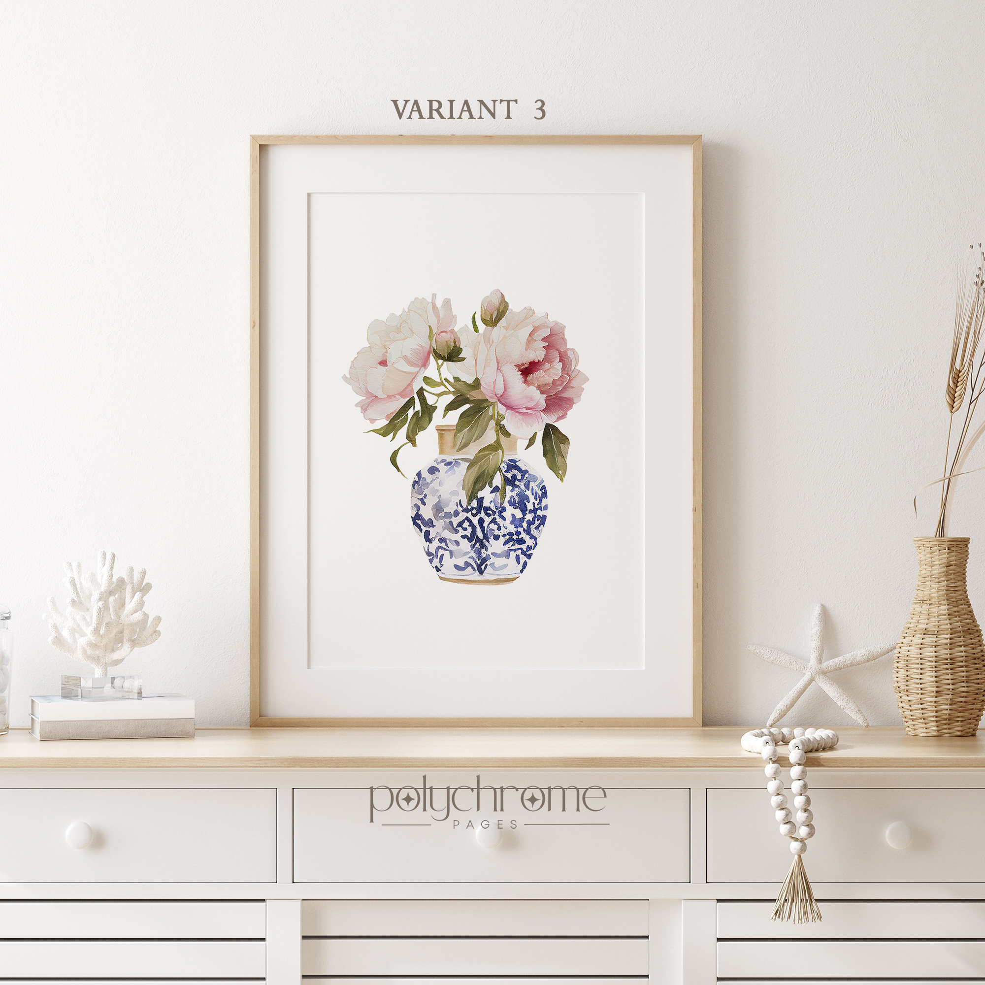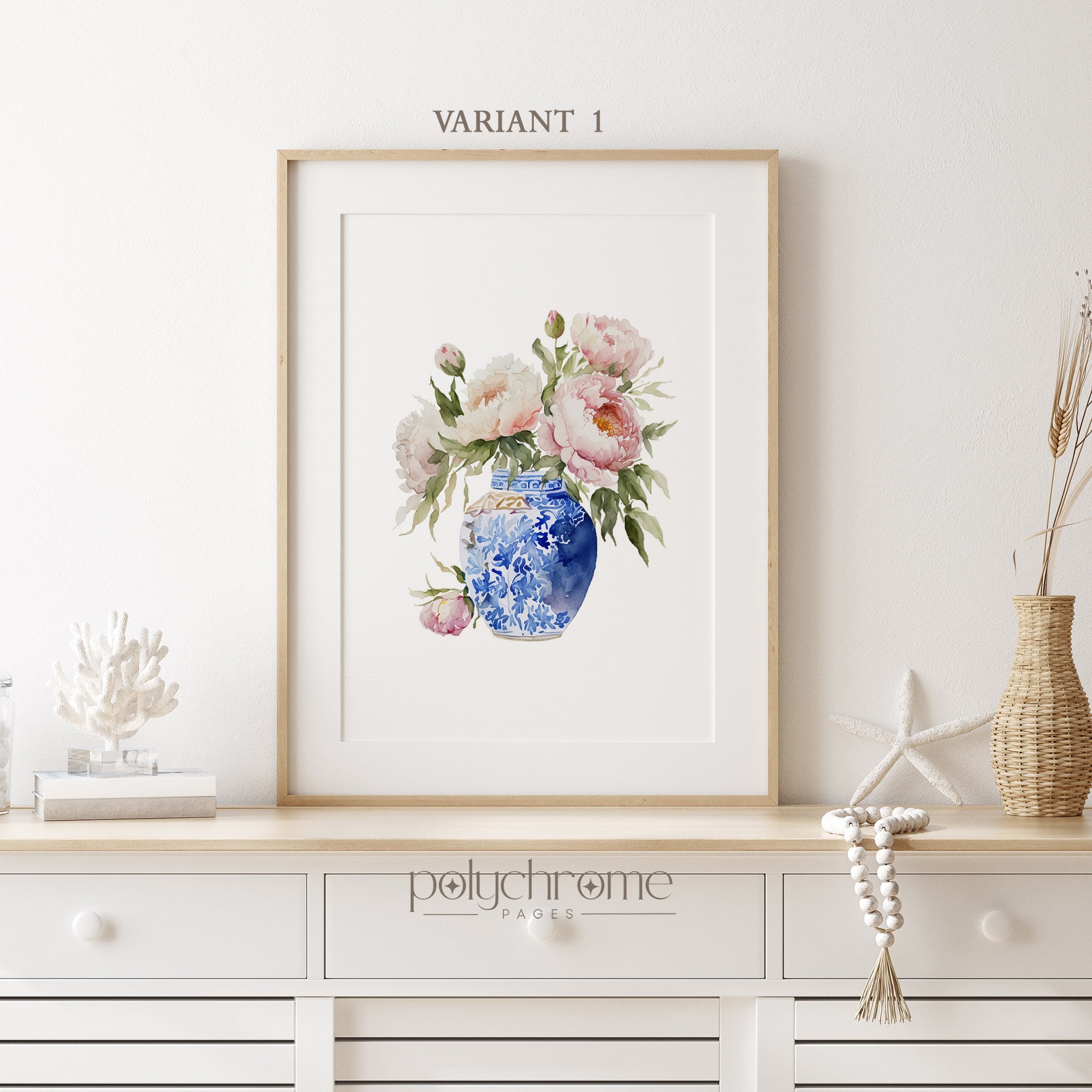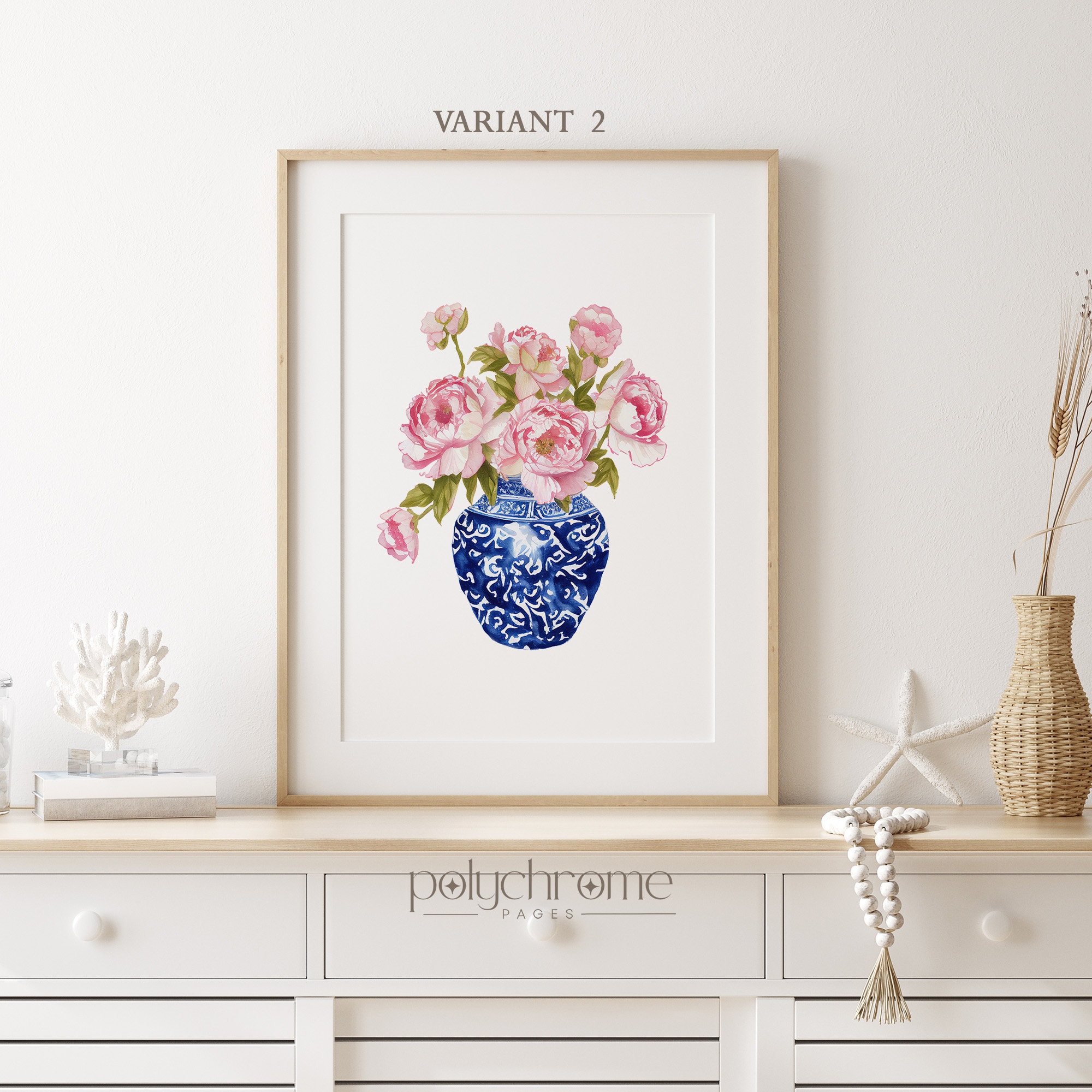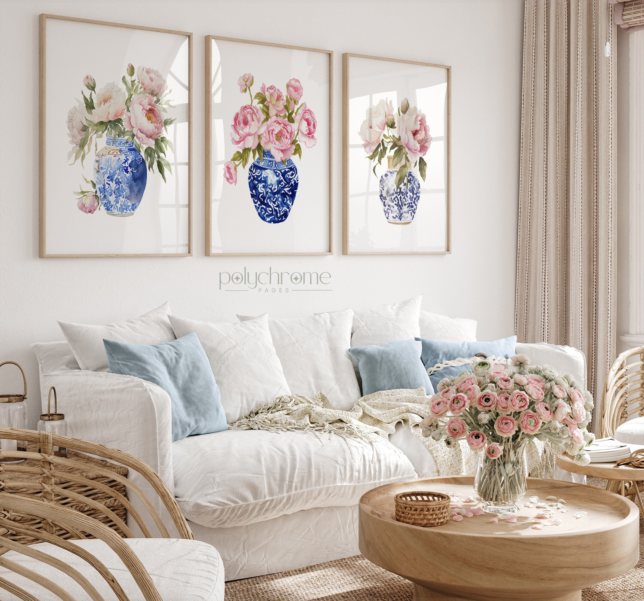 A lush bouquet of pink peonies spills from an elegant chinoiserie vase in this soft, romantic floral piece. The delicate blooms and classic blue-and-white porcelain create a timeless look that works beautifully in master bedrooms, powder rooms, or cozy cottage-inspired spaces. Ideal for anyone who loves feminine florals with a touch of traditional elegance.