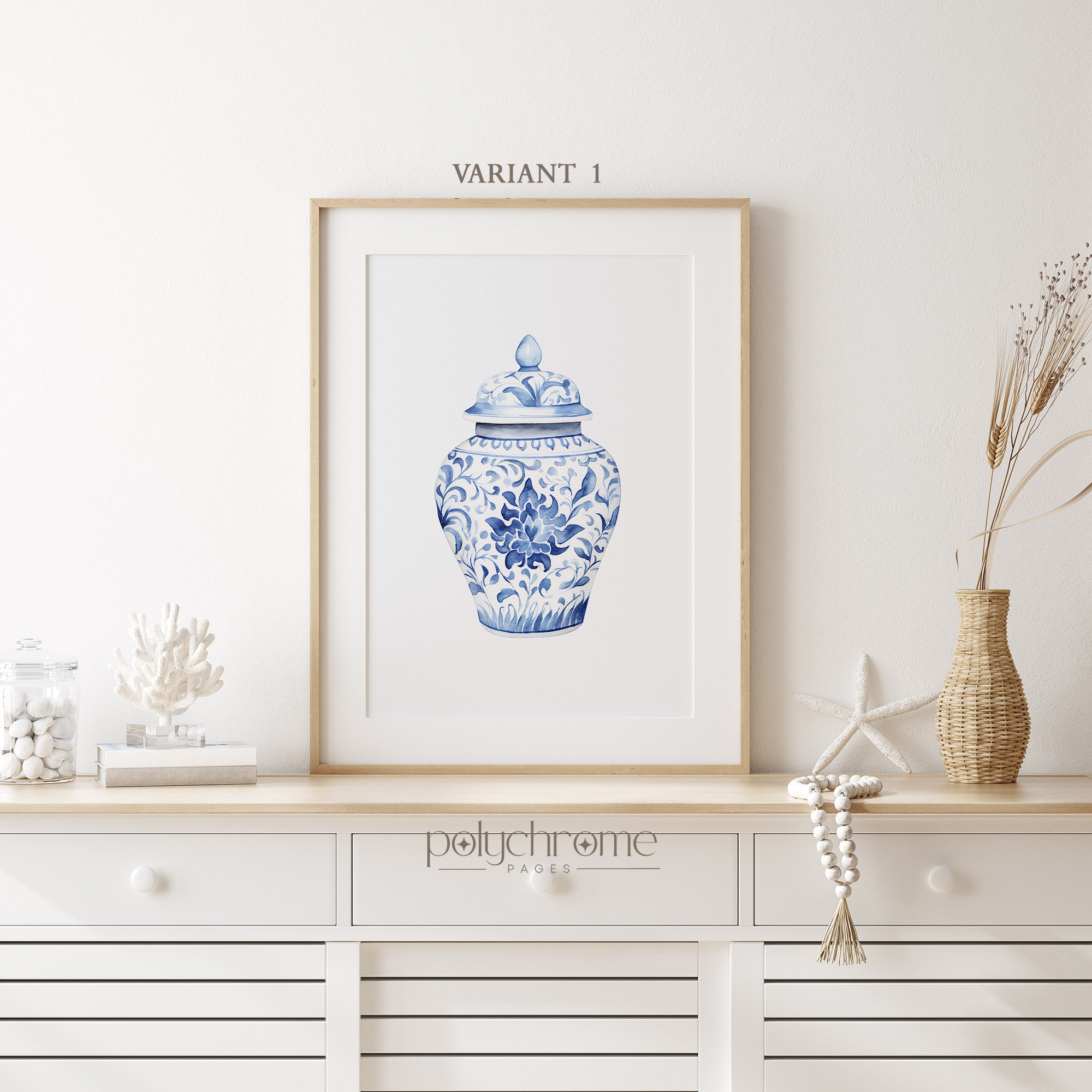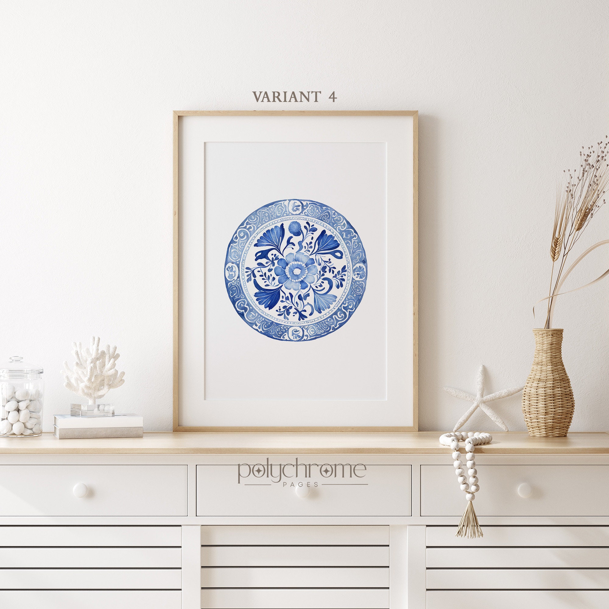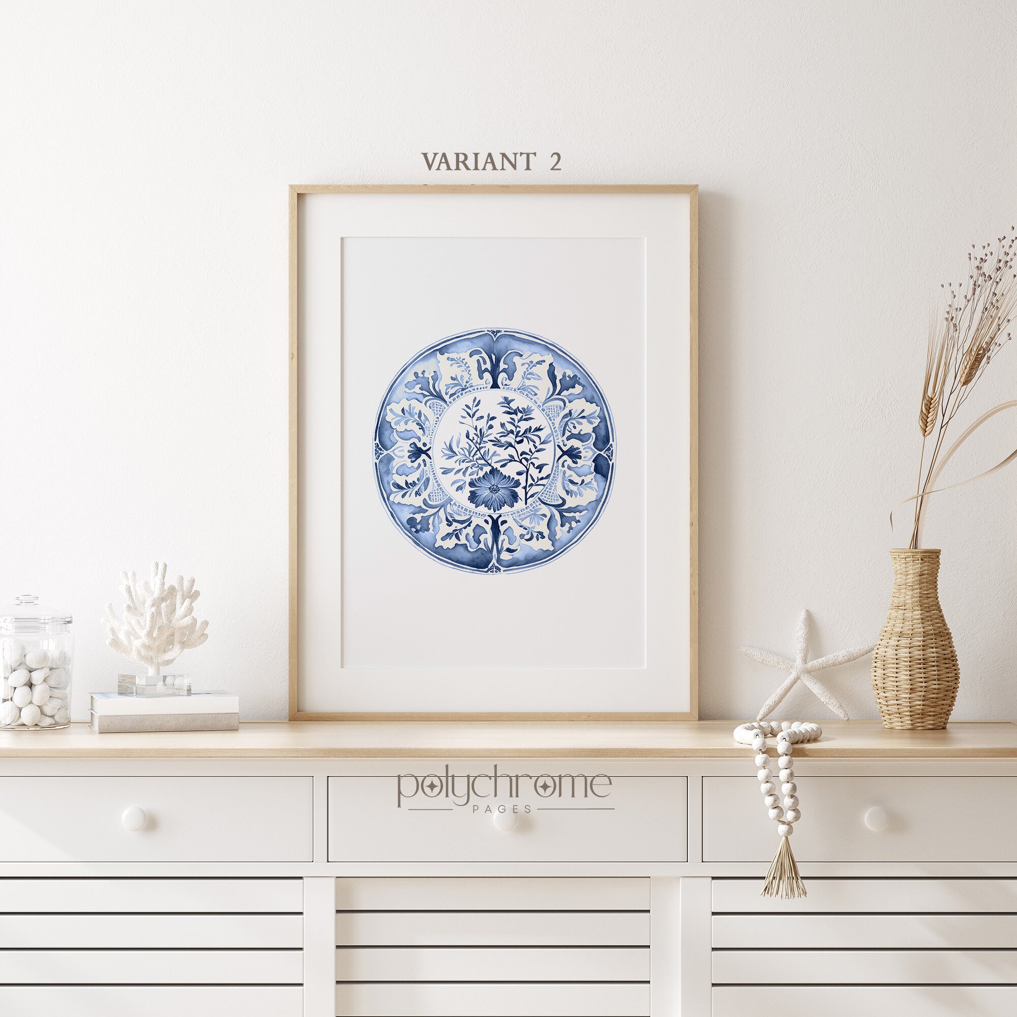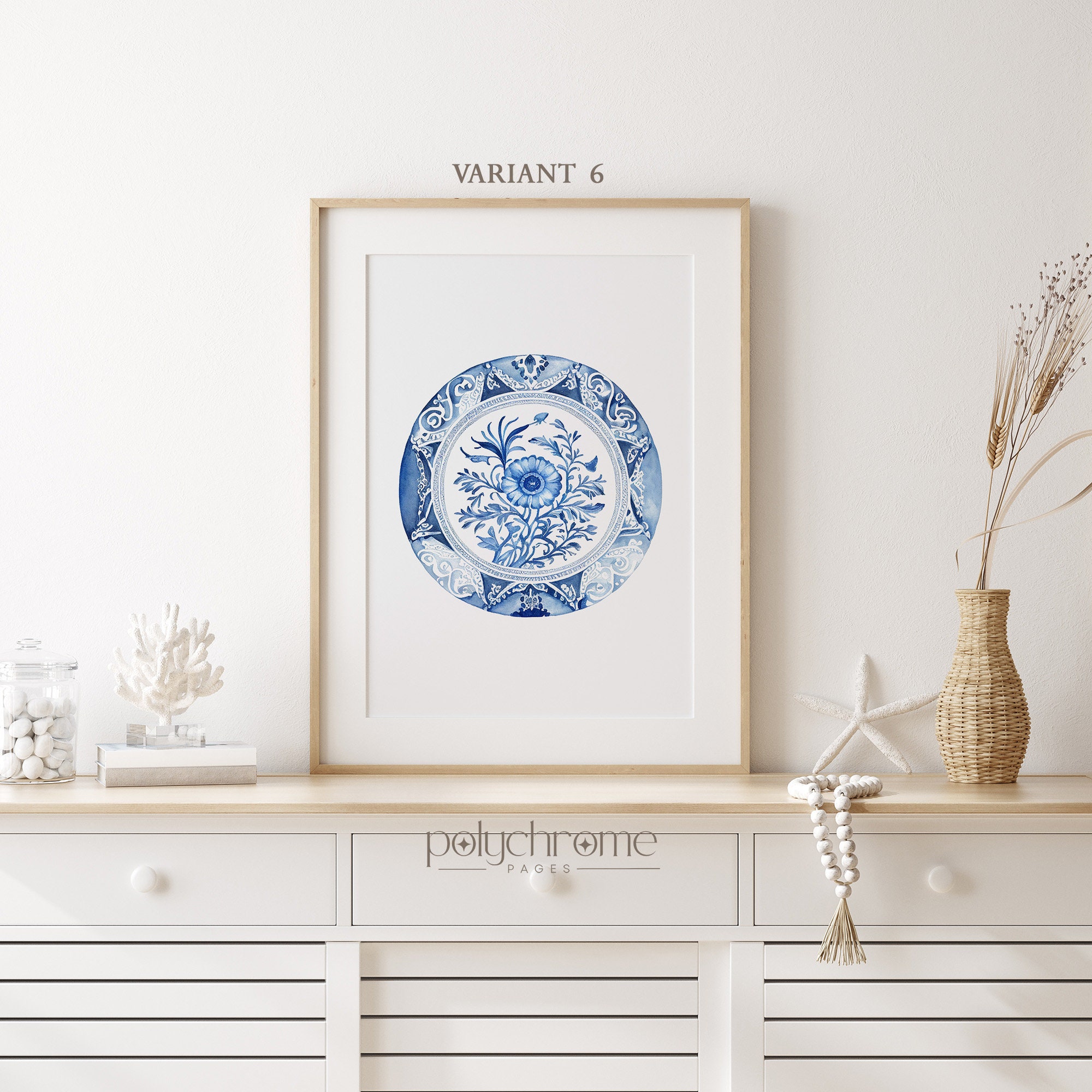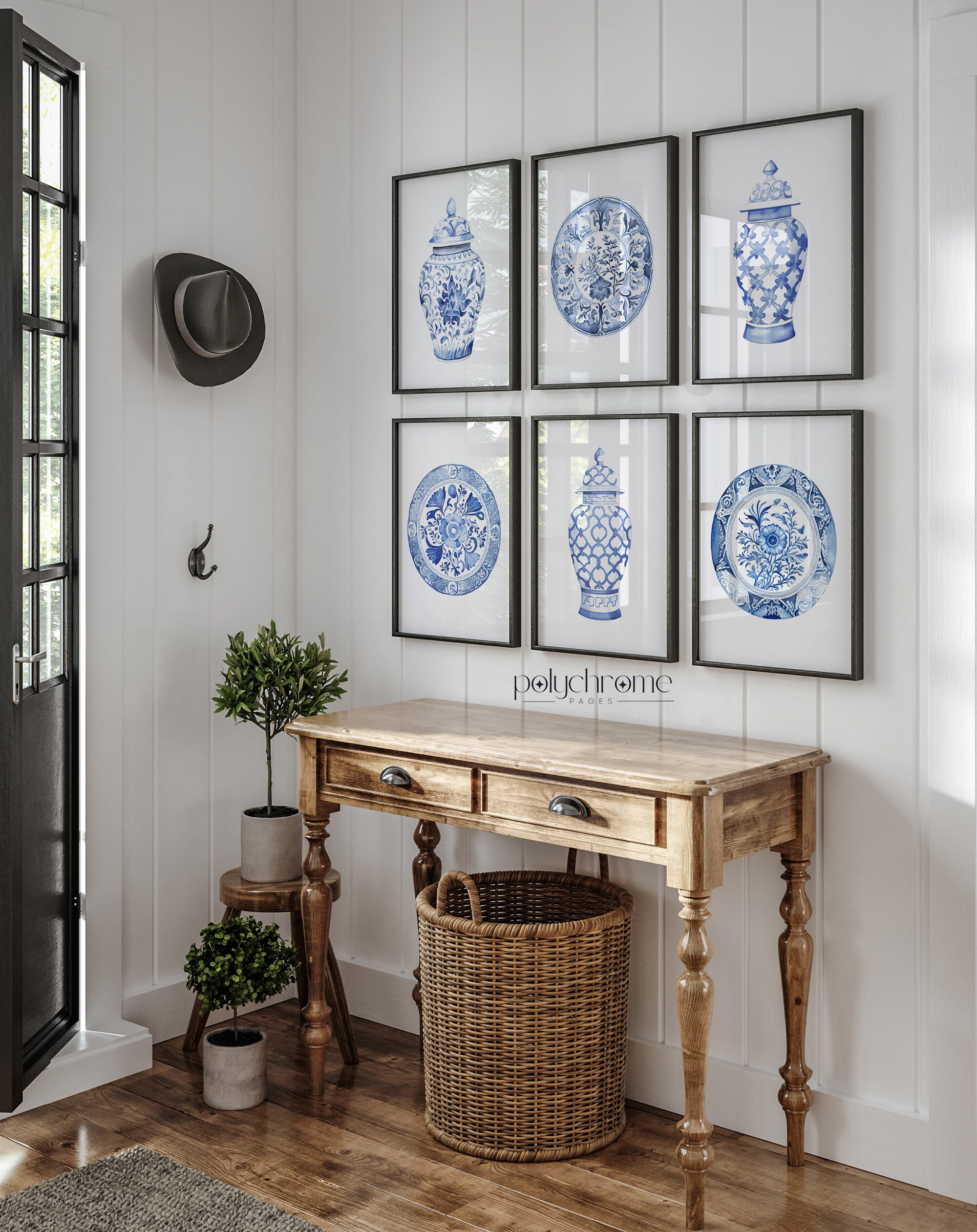 This elegant collection showcases classic blue and white chinoiserie pieces—ornate ginger jars and decorative plates with intricate floral and botanical patterns. The traditional designs bring a refined, timeless quality that works beautifully in formal dining rooms, entryways, or master bedrooms. Ideal for lovers of grandmillennial style, Hamptons interiors, or anyone wanting to add a touch of classic sophistication to their walls.
