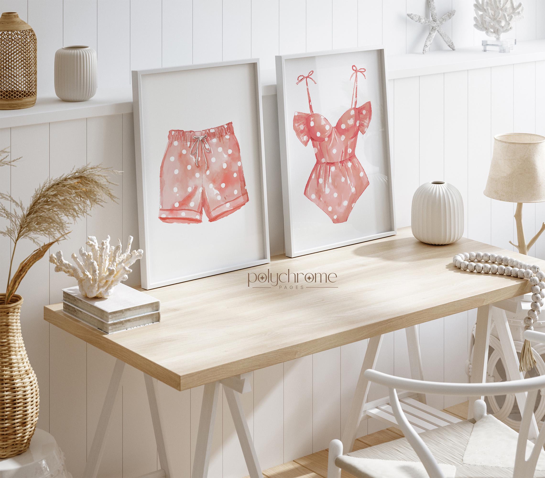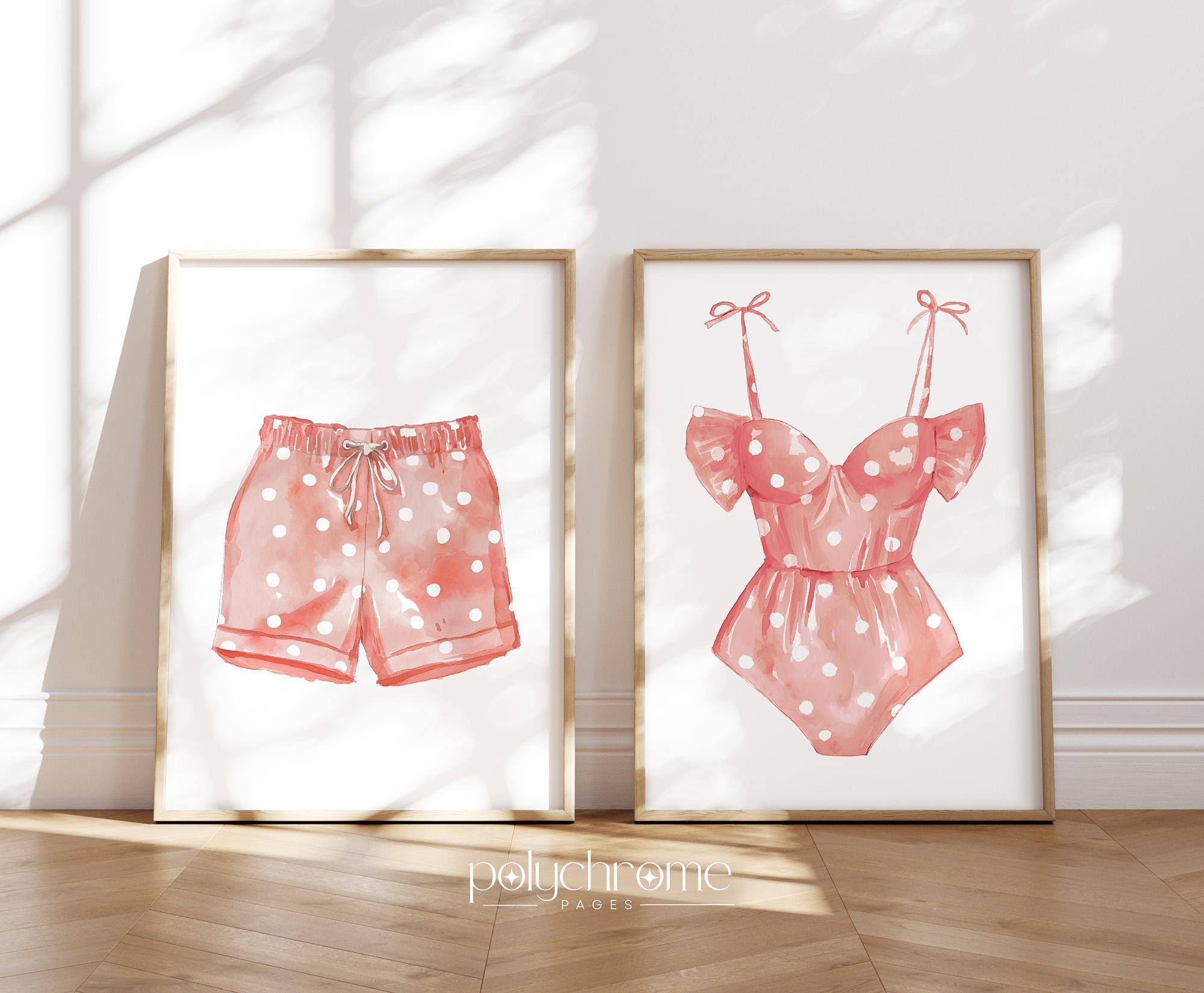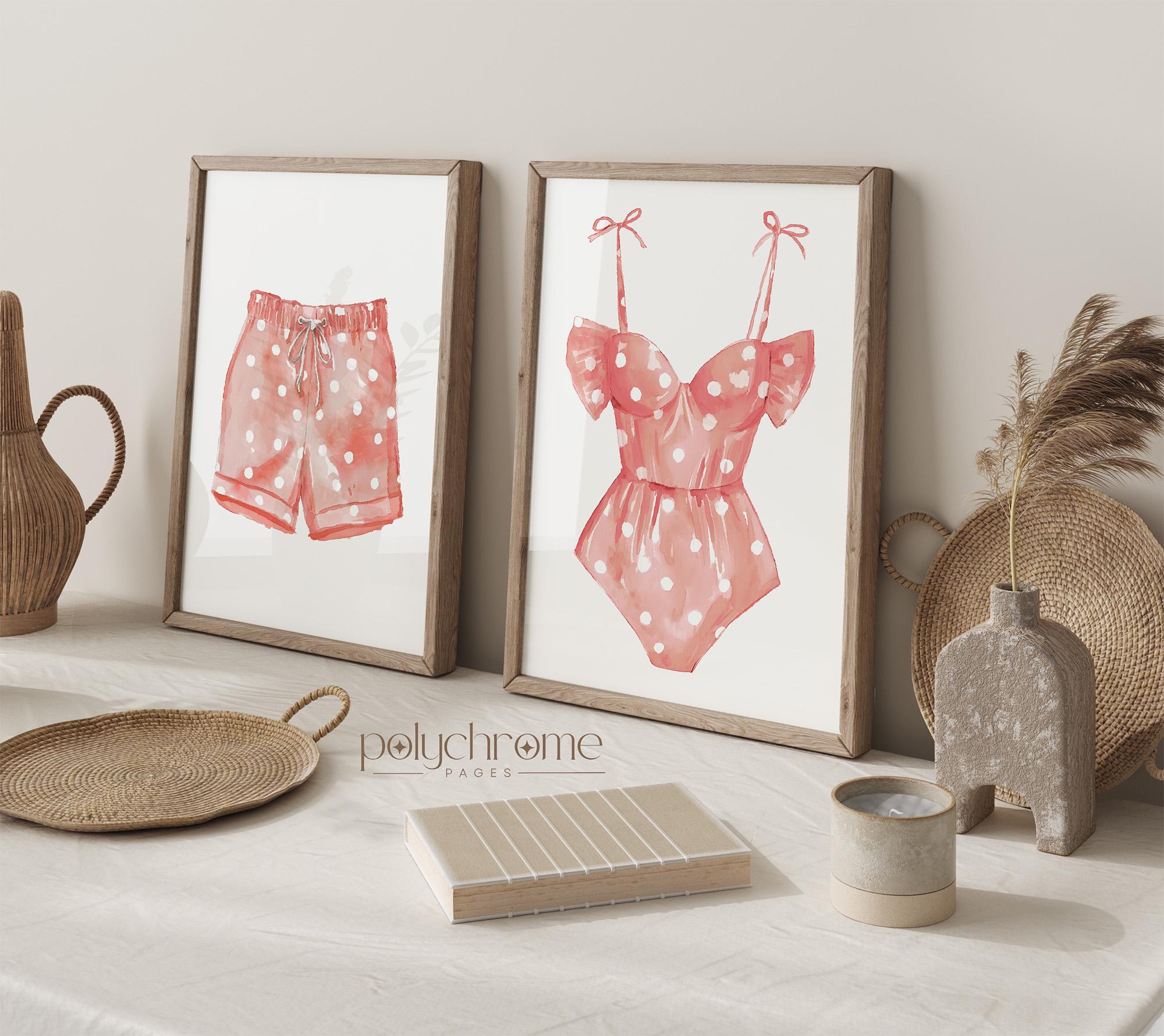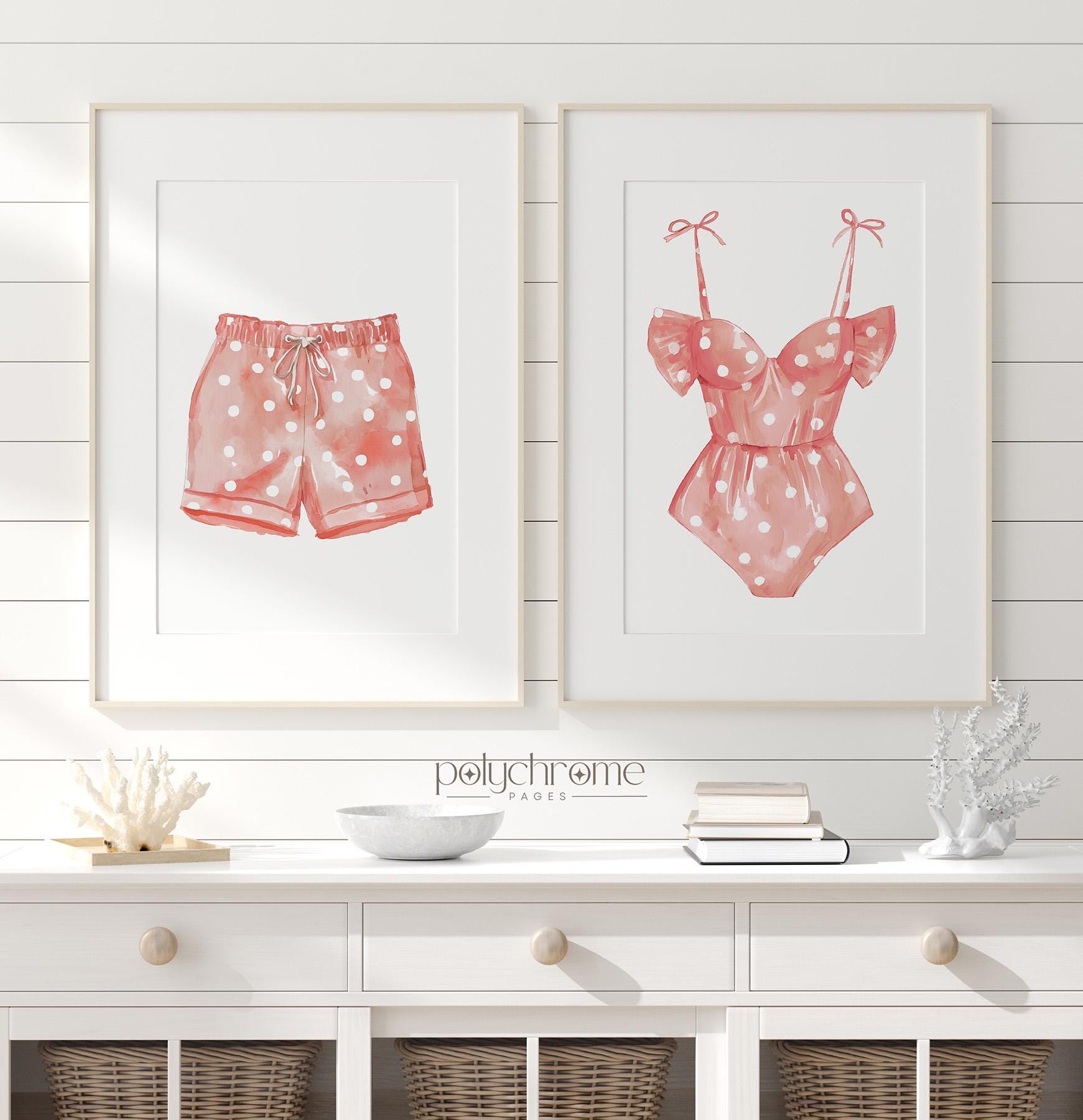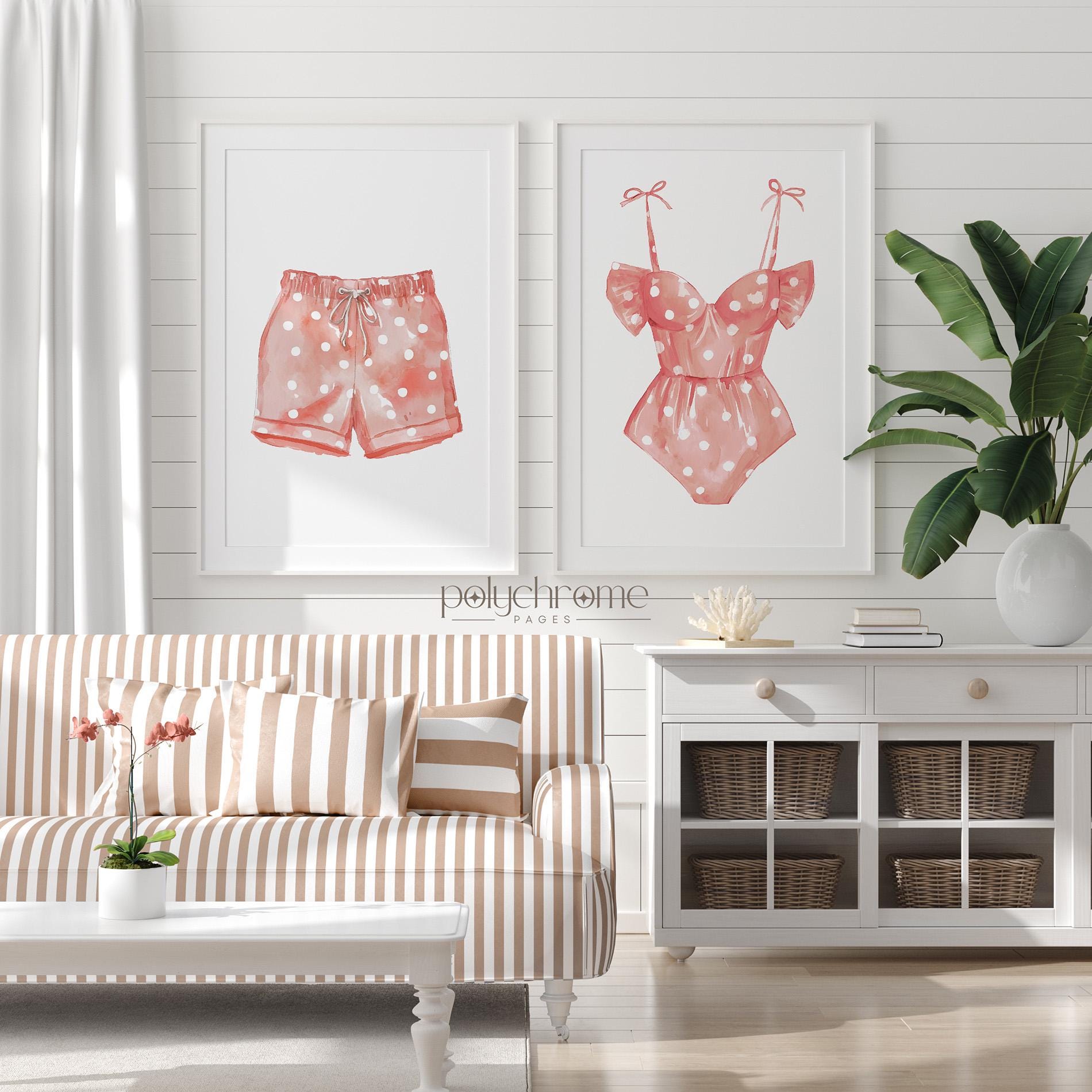 Bring summer to your walls with this collection of two vacation-themed artworks featuring adorable swimsuits with polka dot pattern — perfect for your beach house, changing room, or vacation home. With their mix of pastel reds and coral pink tones, these playful yet stylish designs add a fresh touch to any space.