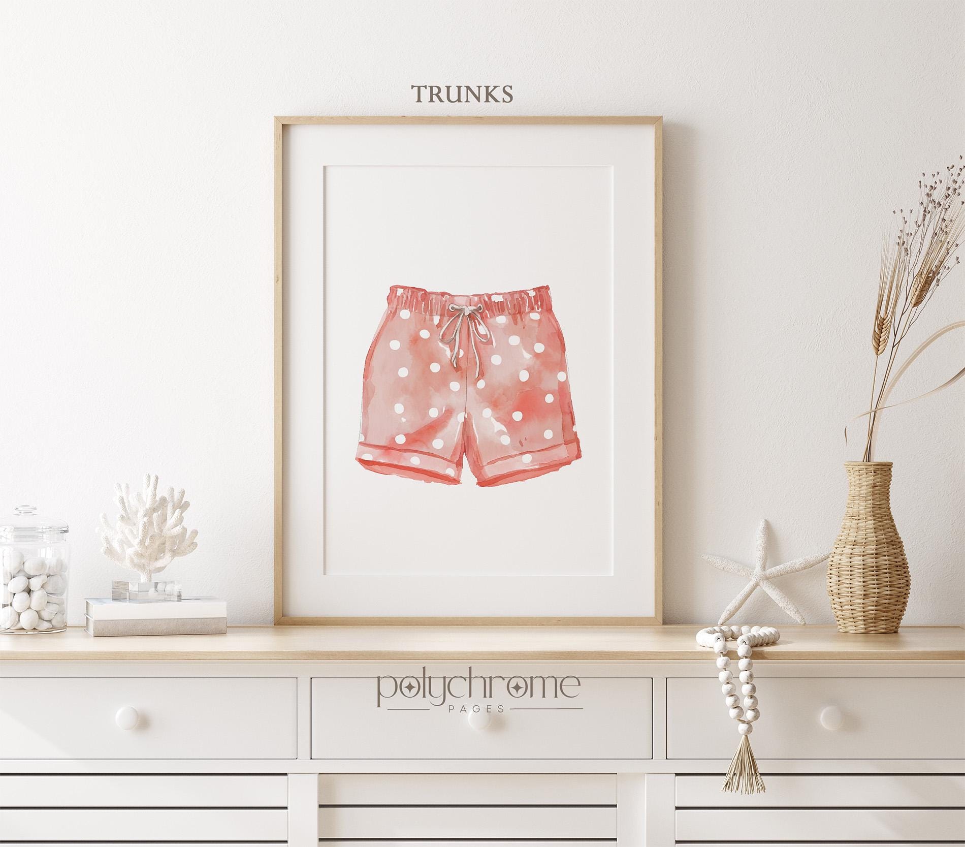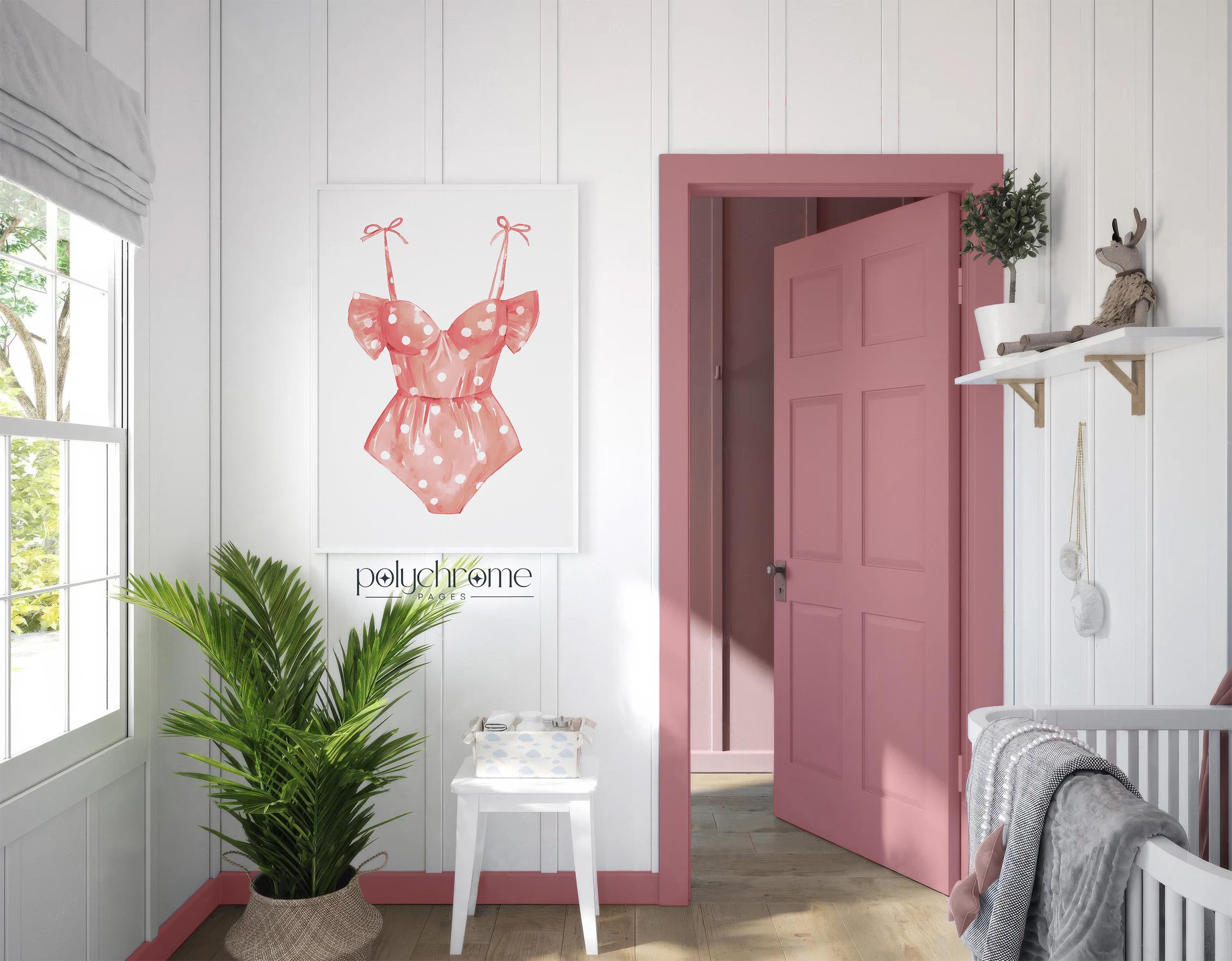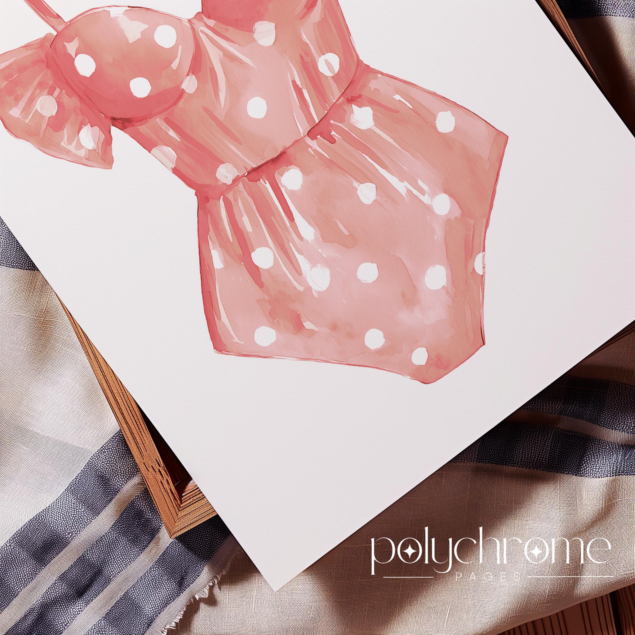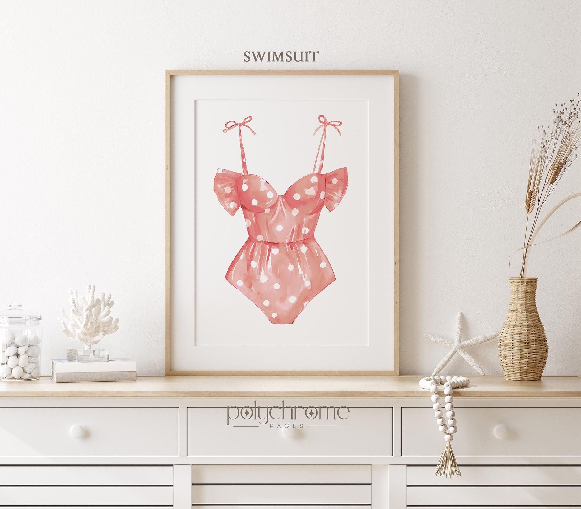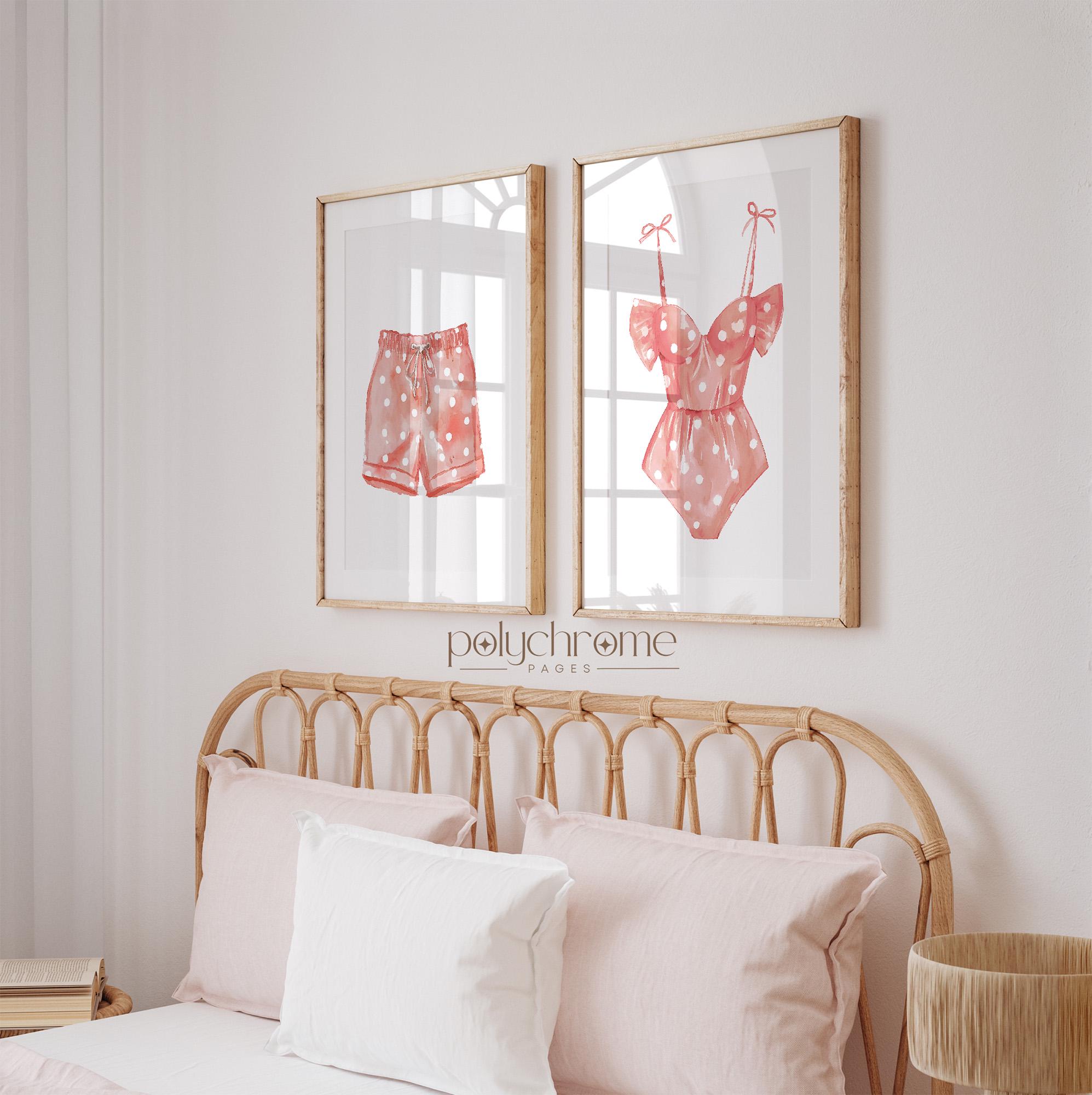 Bring summer to your walls with this collection of two vacation-themed artworks featuring adorable swimsuits with polka dot pattern — perfect for your beach house, changing room, or vacation home. With their mix of pastel reds and coral pink tones, these playful yet stylish designs add a fresh touch to any space.