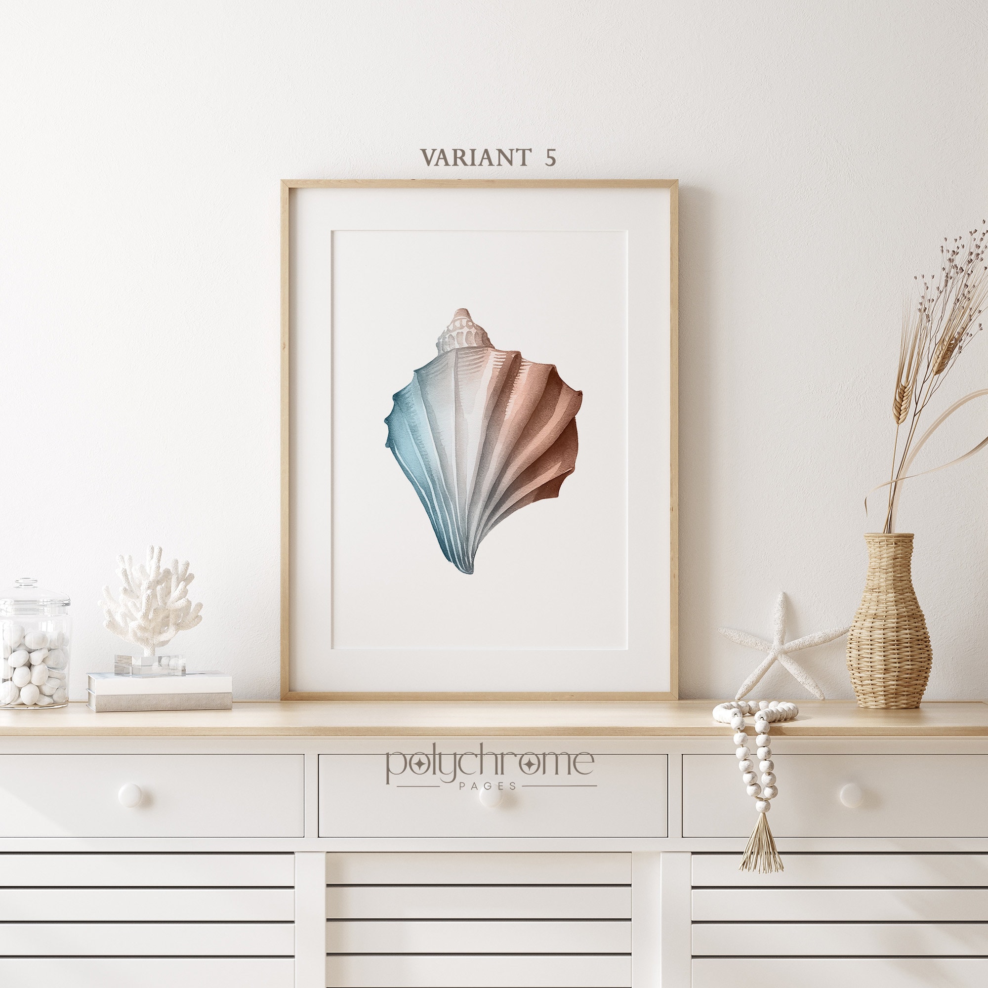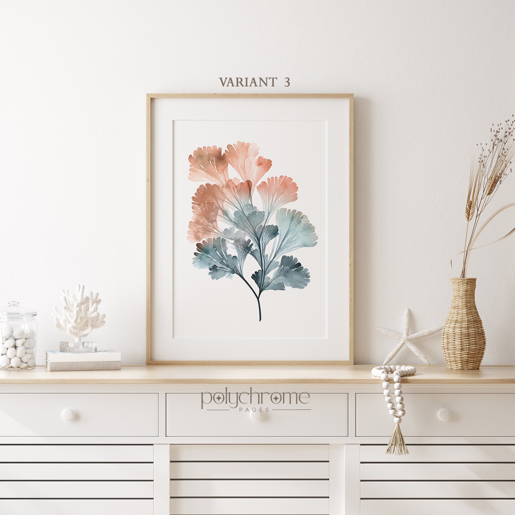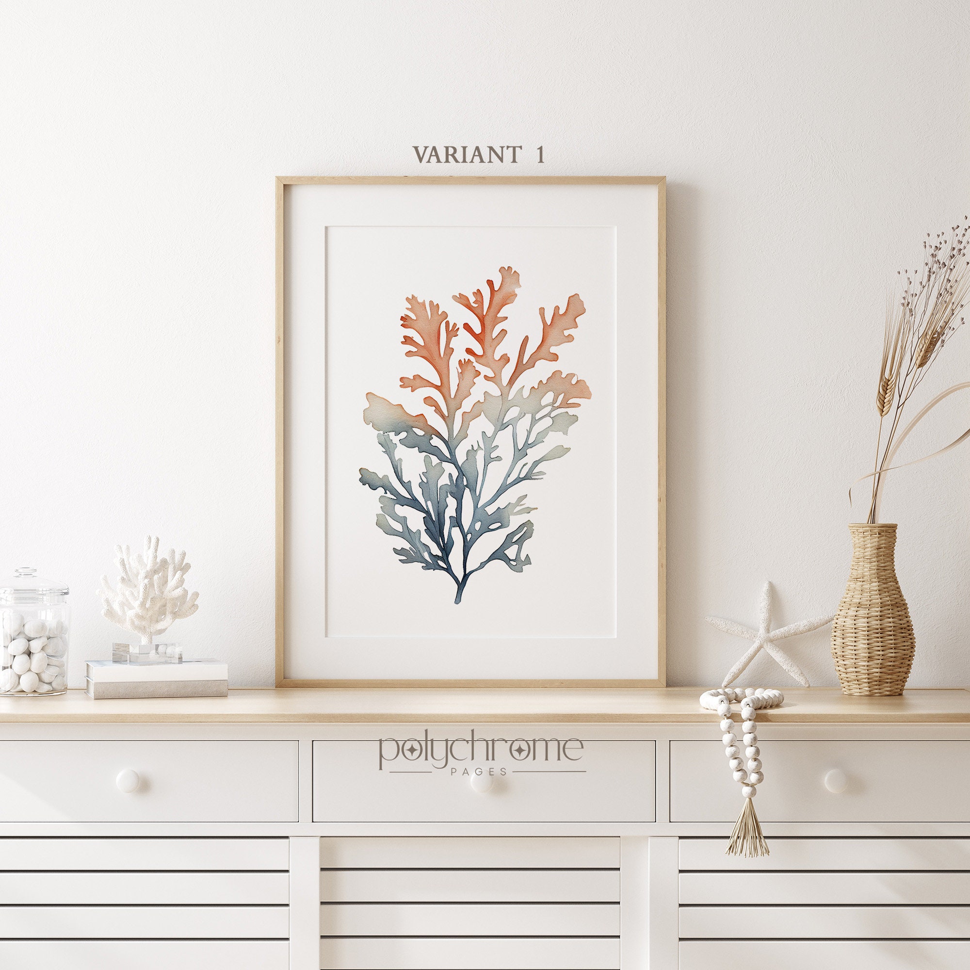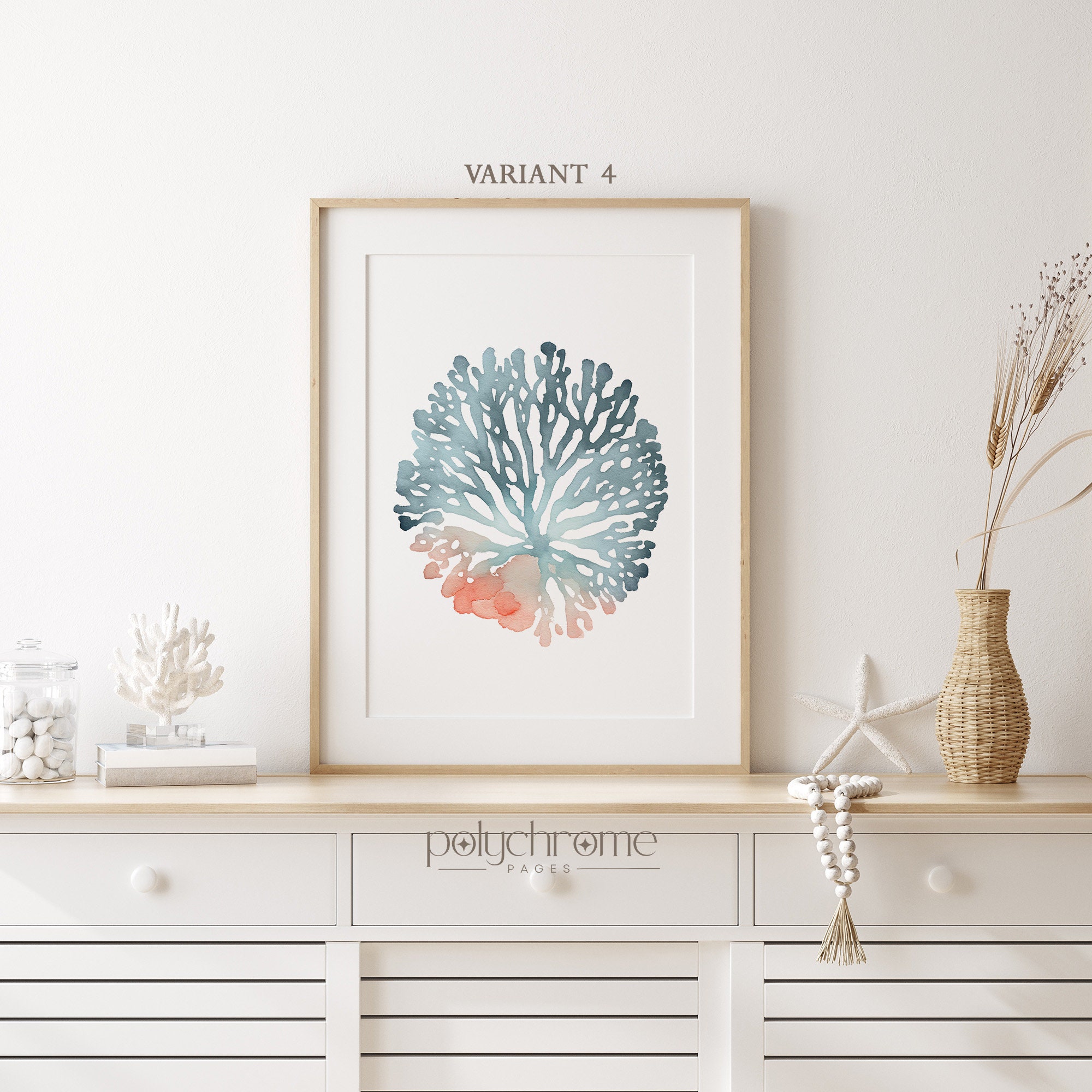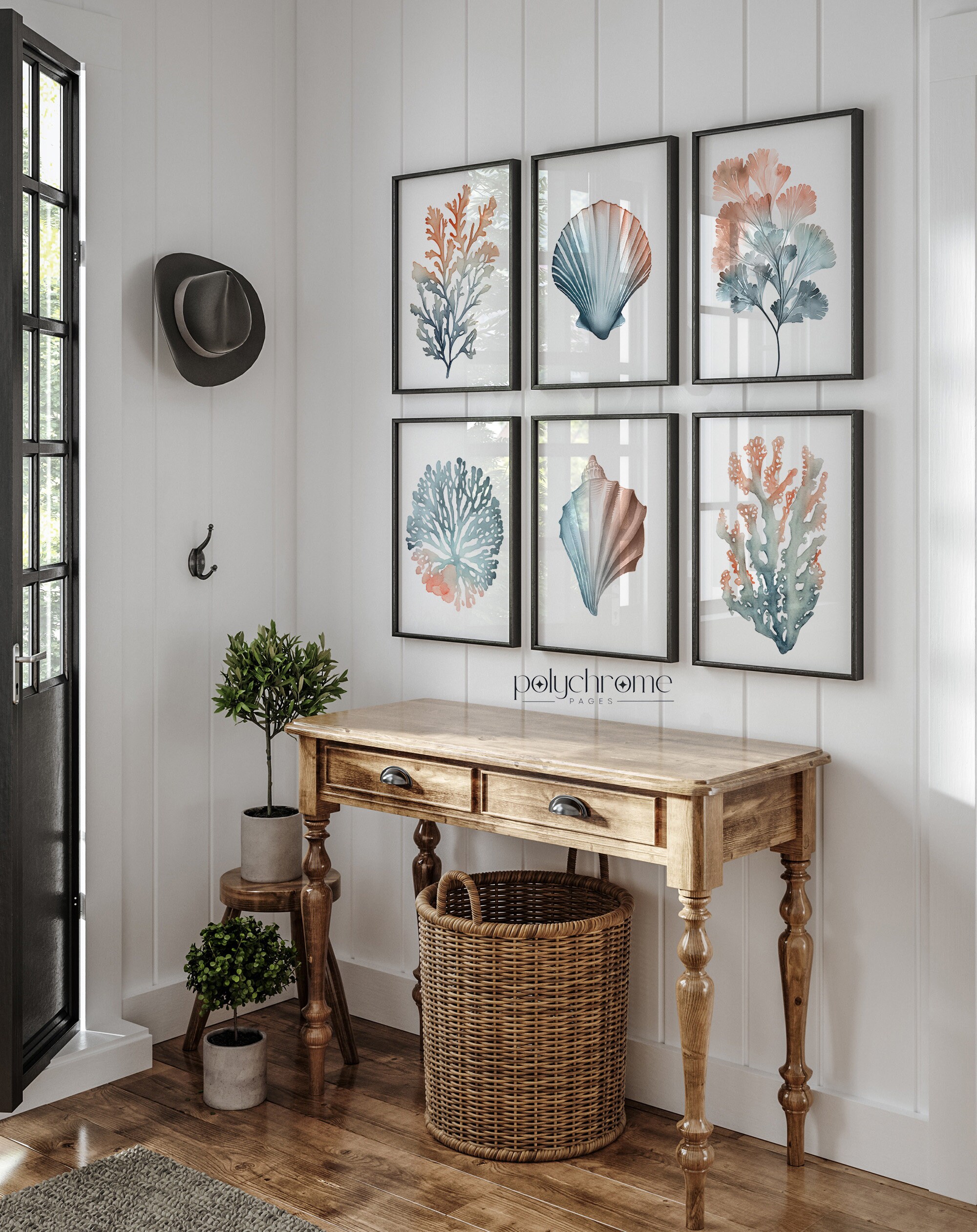 This set of six ocean-inspired artworks showcases delicate corals and flowing seaweed in soft gradient tones, creating a serene underwater feel. The muted coastal palette works beautifully in a master bedroom, bathroom, or anywhere you want a calming nautical touch. A lovely choice for beach house lovers or anyone drawn to the quiet beauty of the reef.