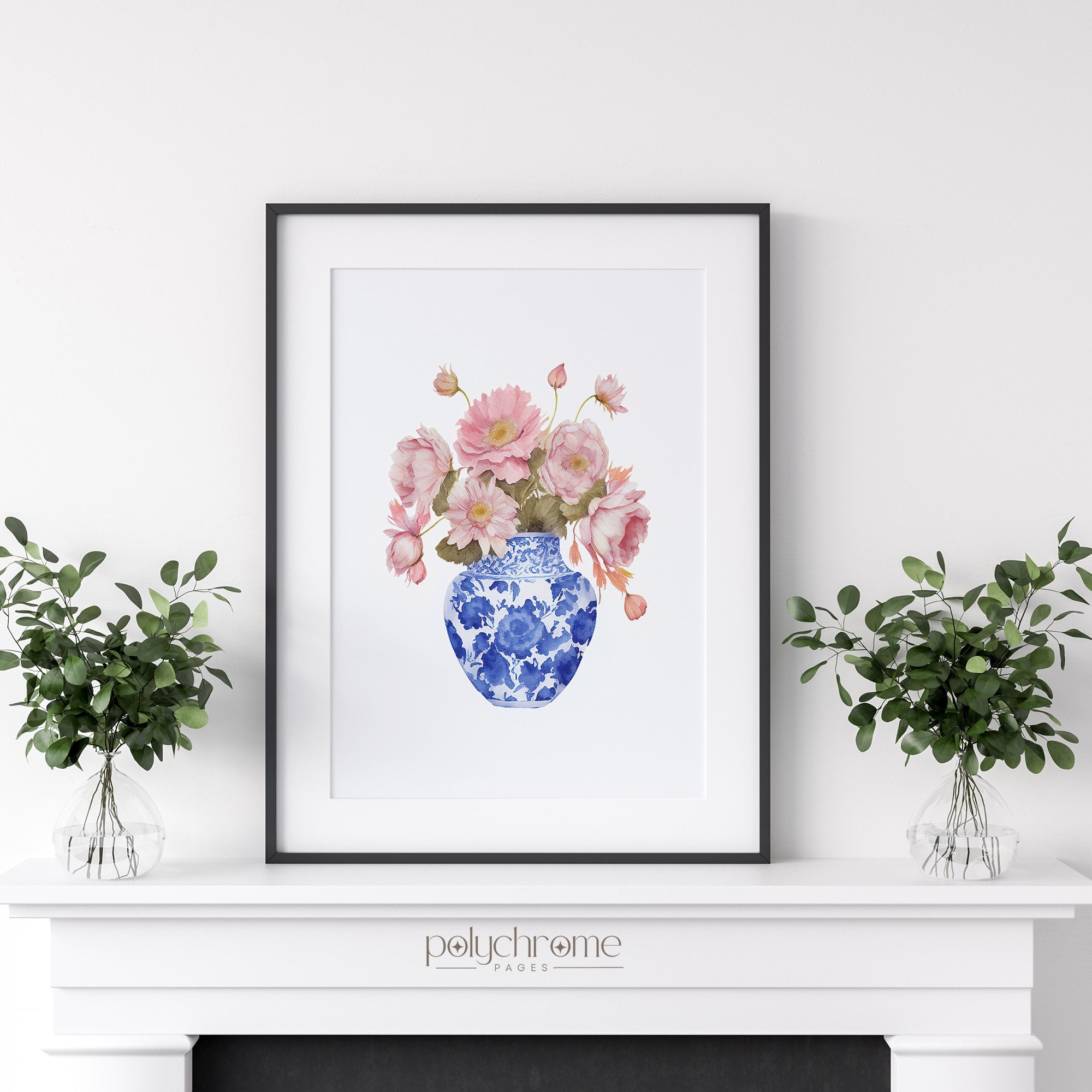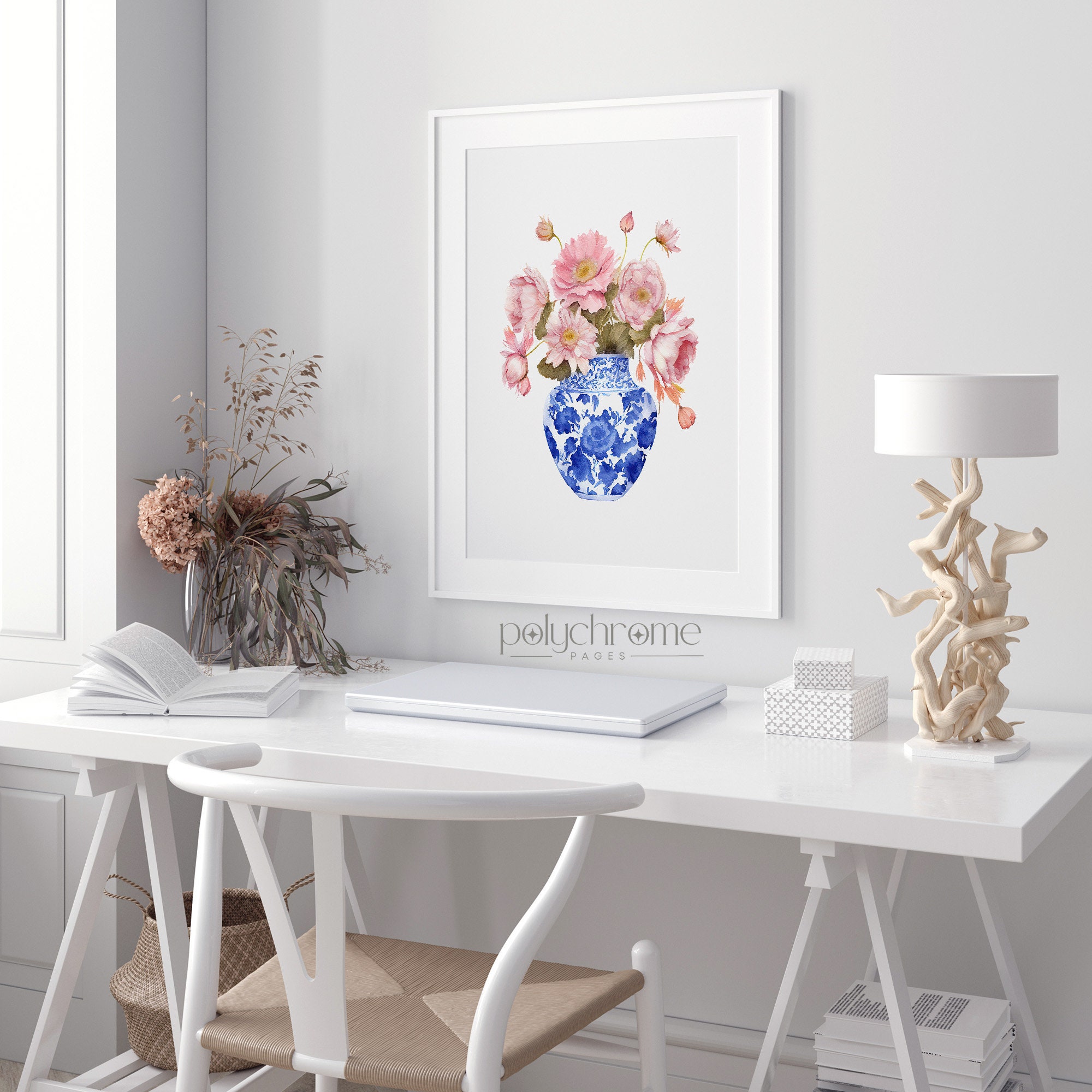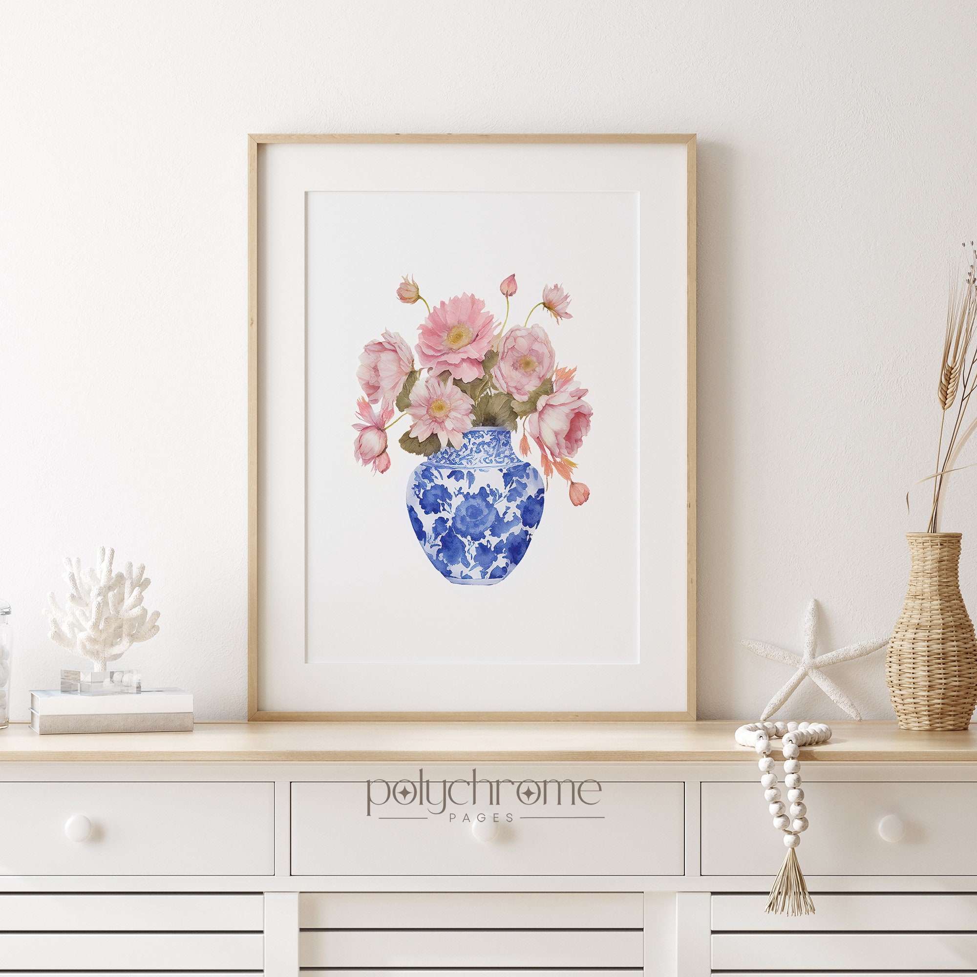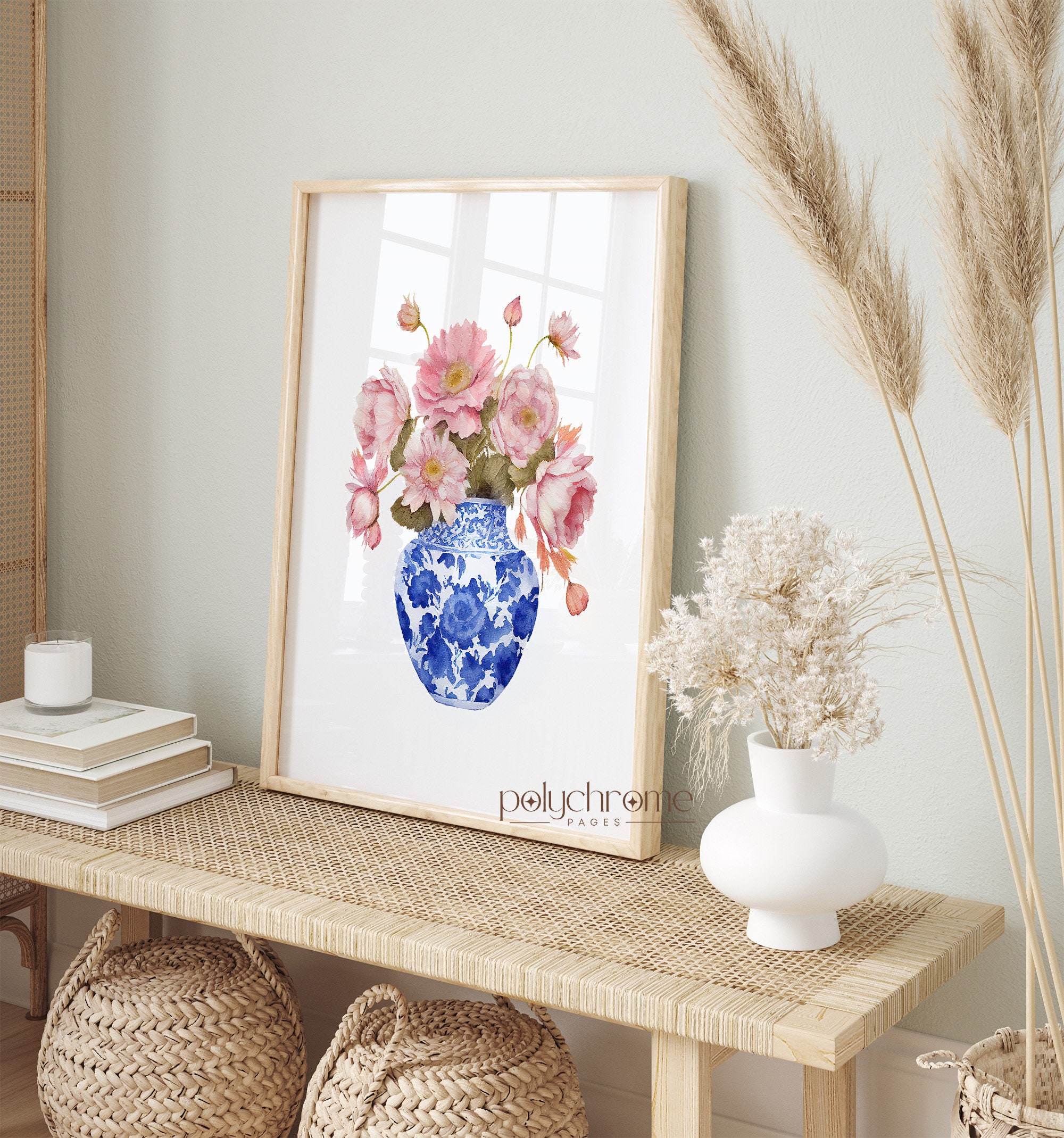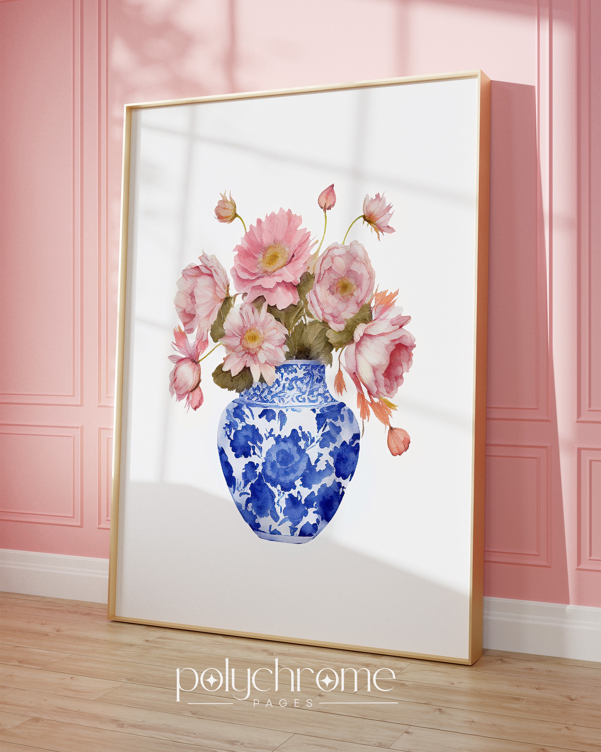 A cheerful pink daisy bouquet arranged in a classic blue and white chinoiserie vase, blending cottagecore warmth with grandmillennial elegance. The soft pink florals against the traditional ginger jar pattern create a timeless yet fresh feel. Lovely for a master bedroom, powder room, or any space that appreciates that collected, traditional aesthetic with a feminine touch.