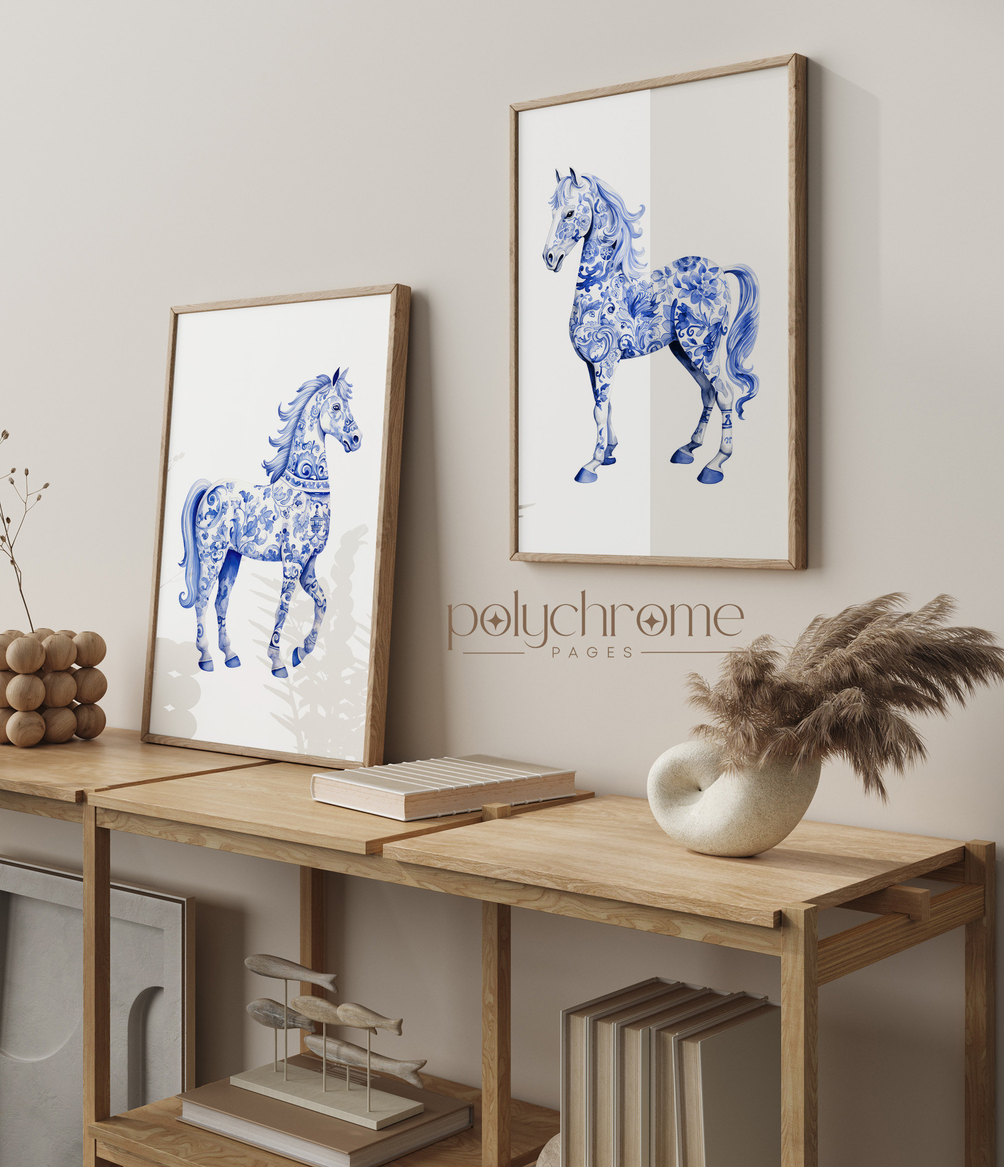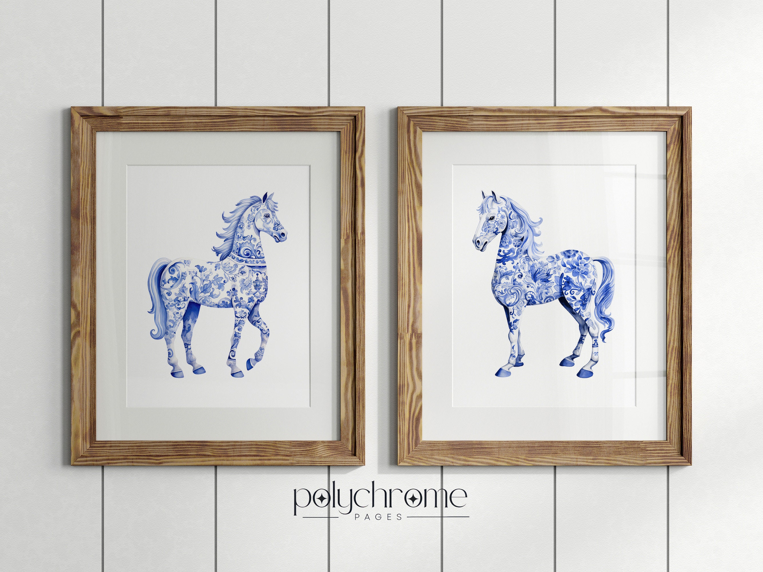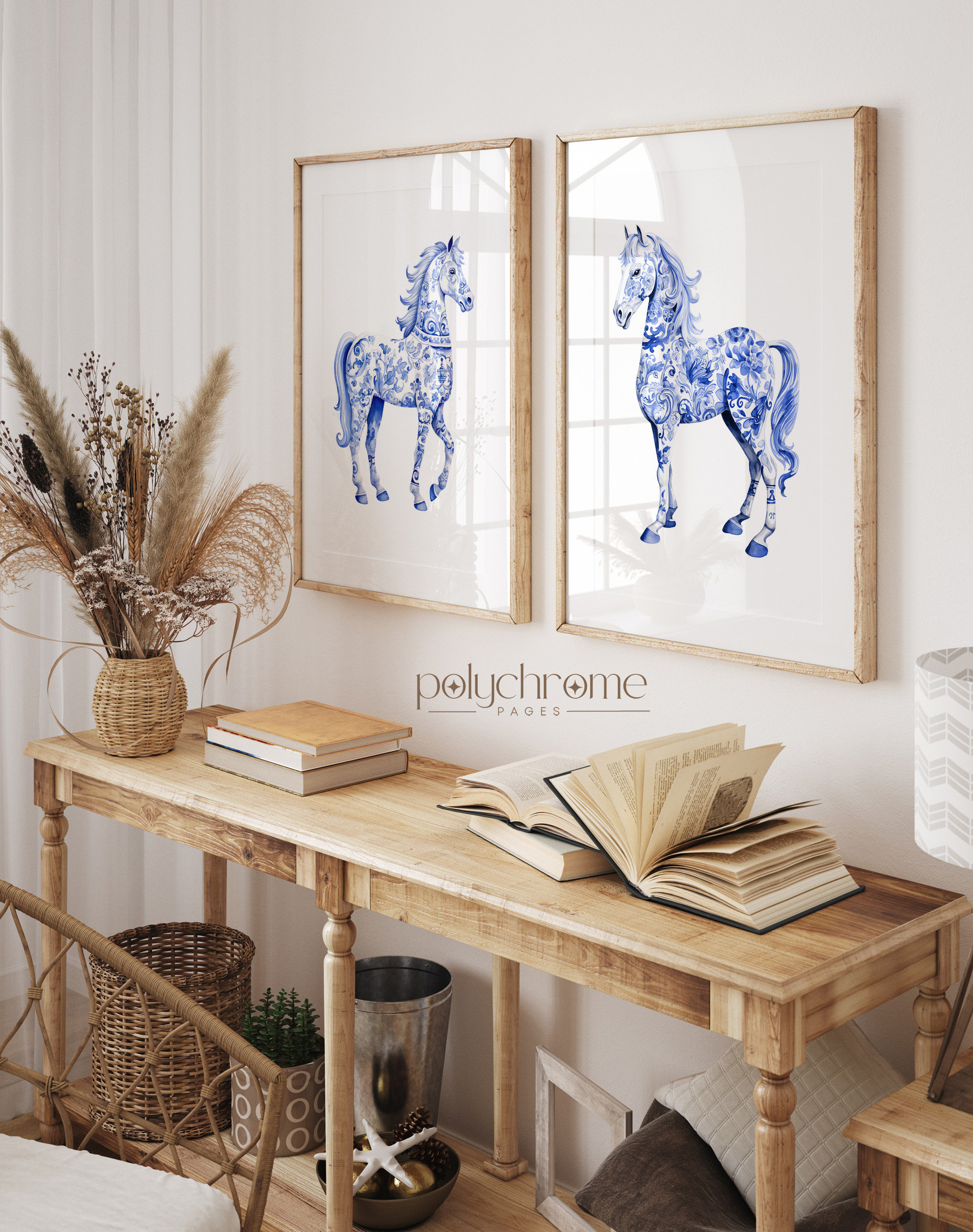 This elegant pair captures decorative horse figurines in classic blue and white chinoiserie style, with delicate floral and botanical patterns. The traditional design brings a refined yet approachable feel that works beautifully in entryways, living rooms, or home offices. Perfect for lovers of grandmillennial aesthetics, equestrian themes, or anyone drawn to timeless Hamptons-inspired interiors.