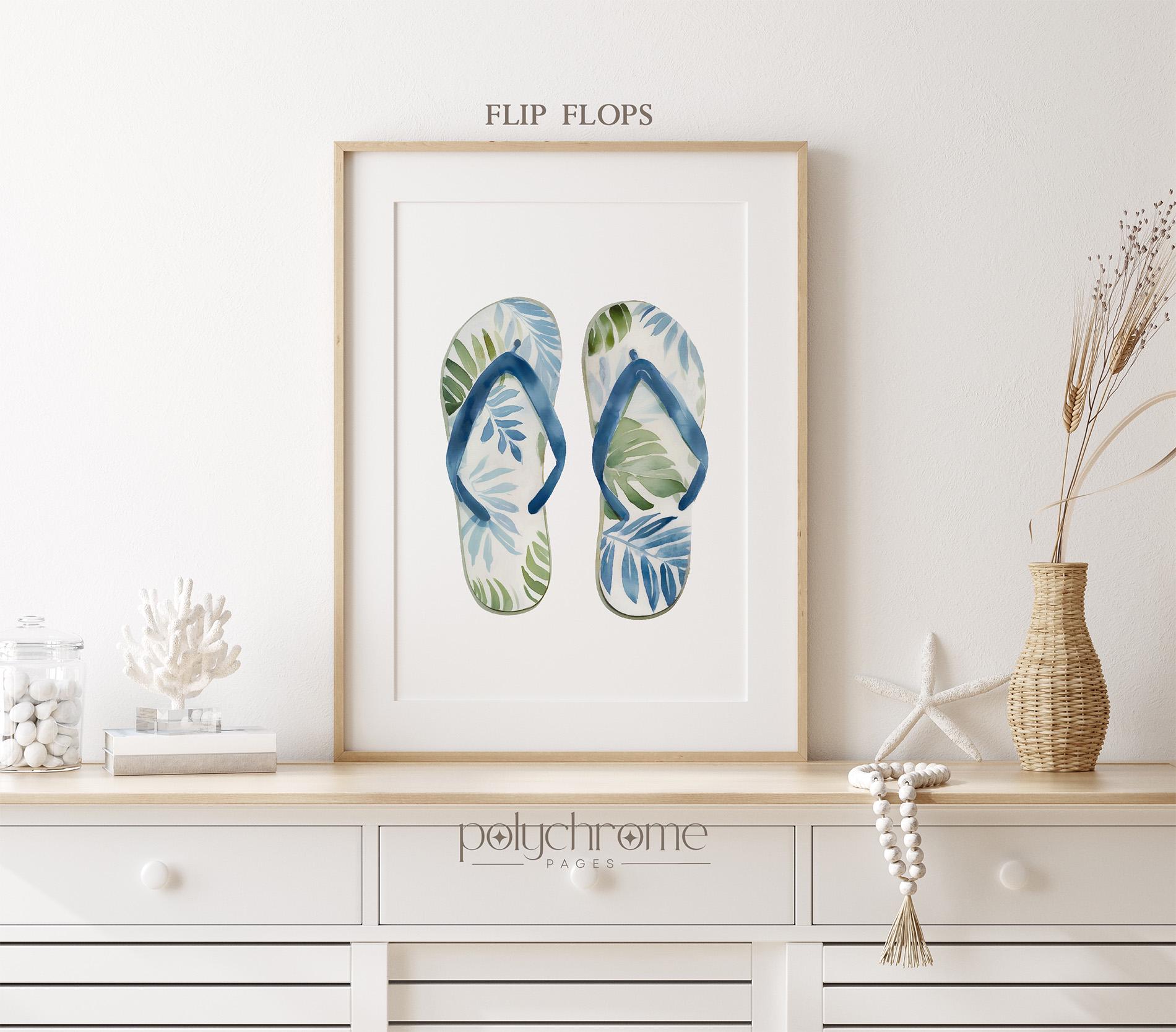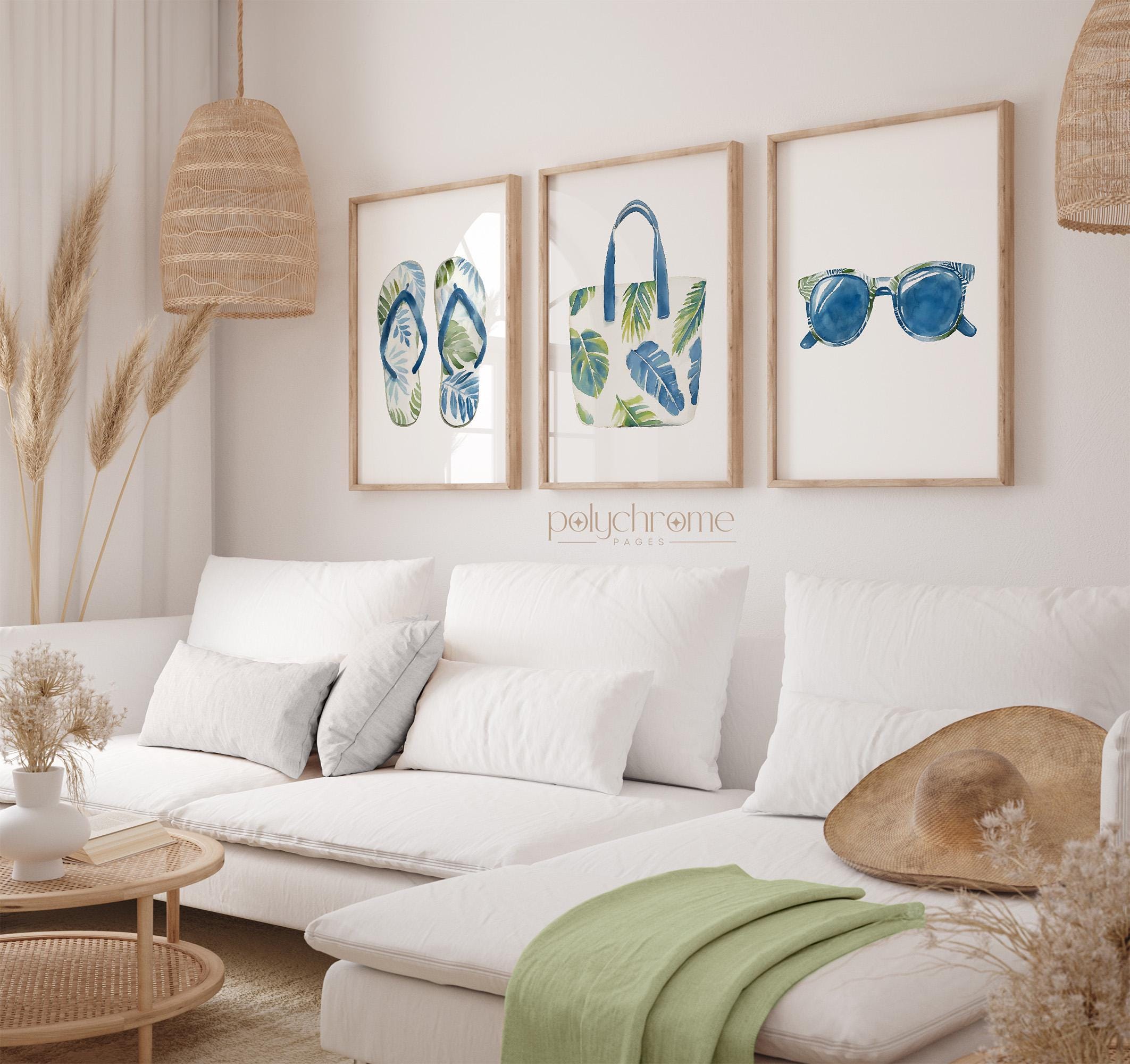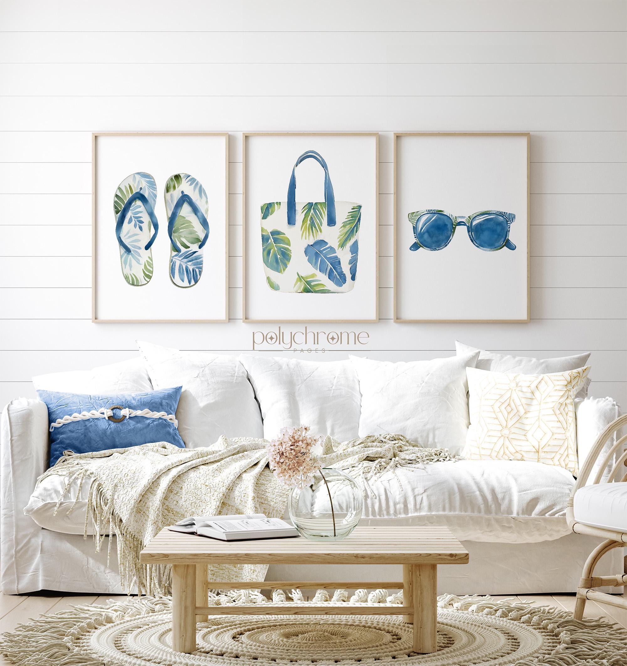 A playful set of painted summer accessories - beach bag, sunglasses and flip flops - in coastal blues and greens, ideal for adding a chill summer vibe to your space. Great for beach houses, lake cabins, or vacation-inspired homes. This piece is a fun way to introduce coastal style with a modern twist to your interior.