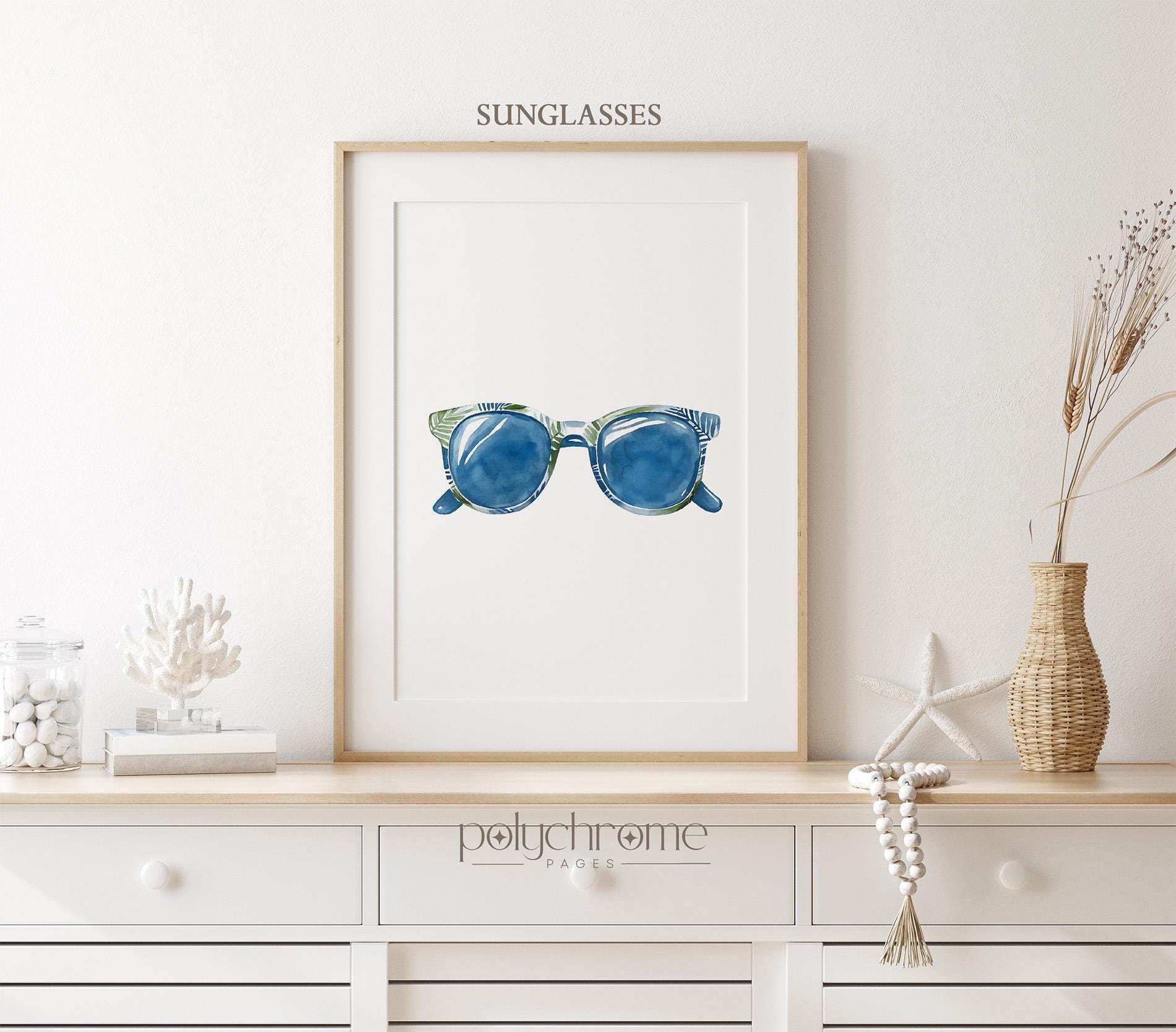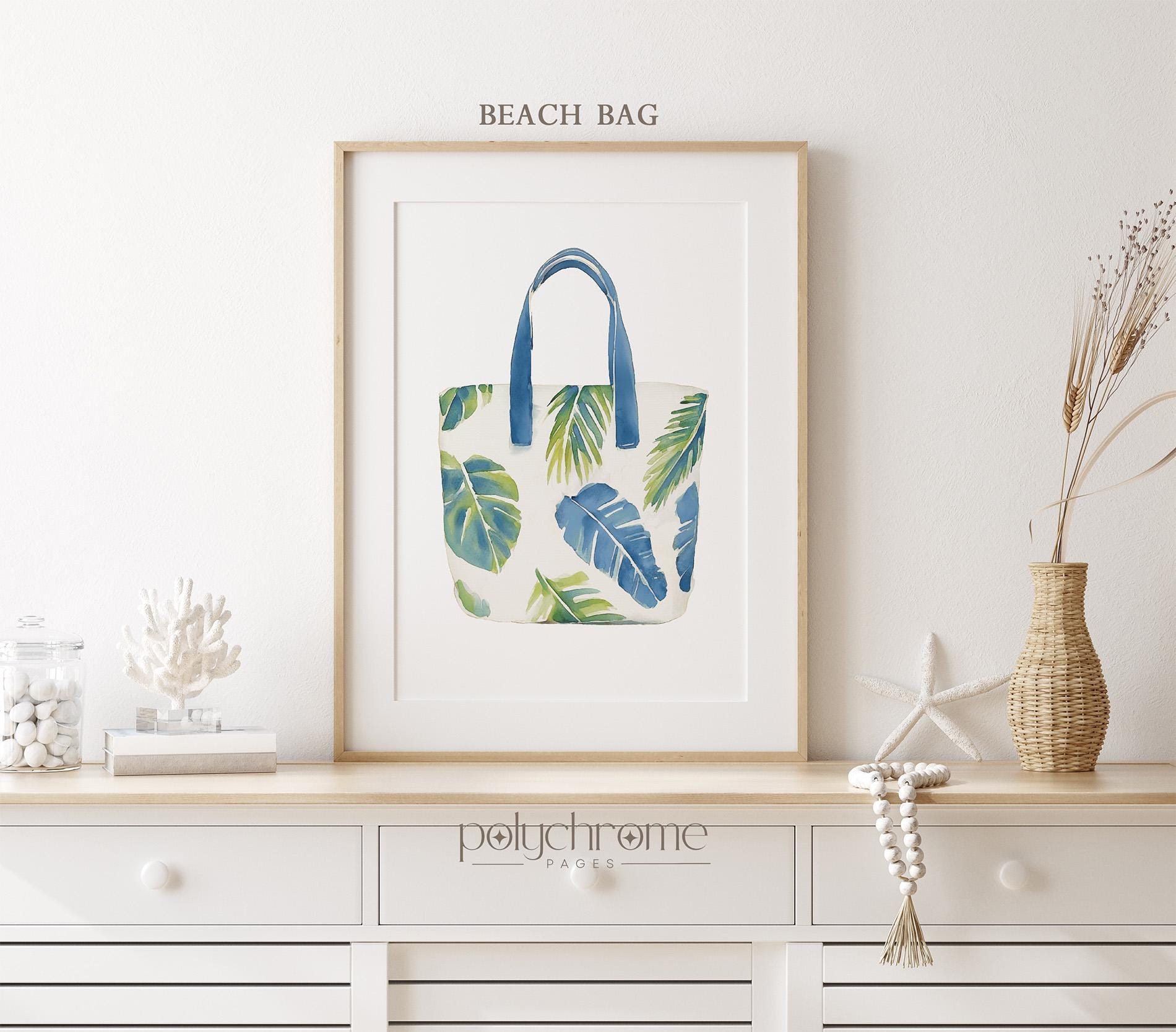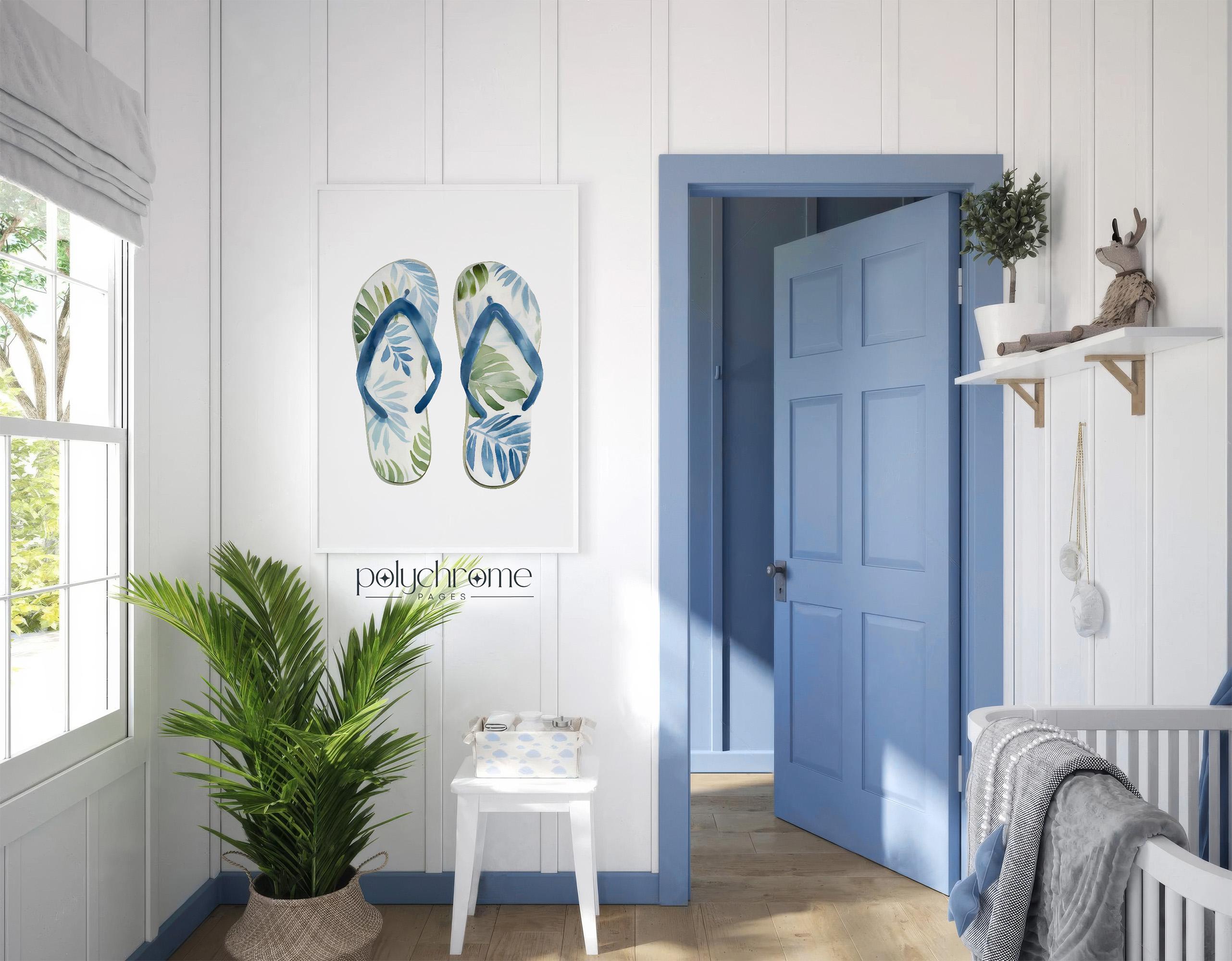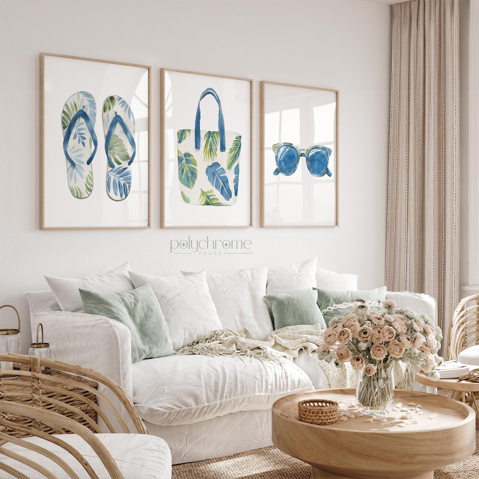 A playful set of painted summer accessories - beach bag, sunglasses and flip flops - in coastal blues and greens, ideal for adding a chill summer vibe to your space. Great for beach houses, lake cabins, or vacation-inspired homes. This piece is a fun way to introduce coastal style with a modern twist to your interior.