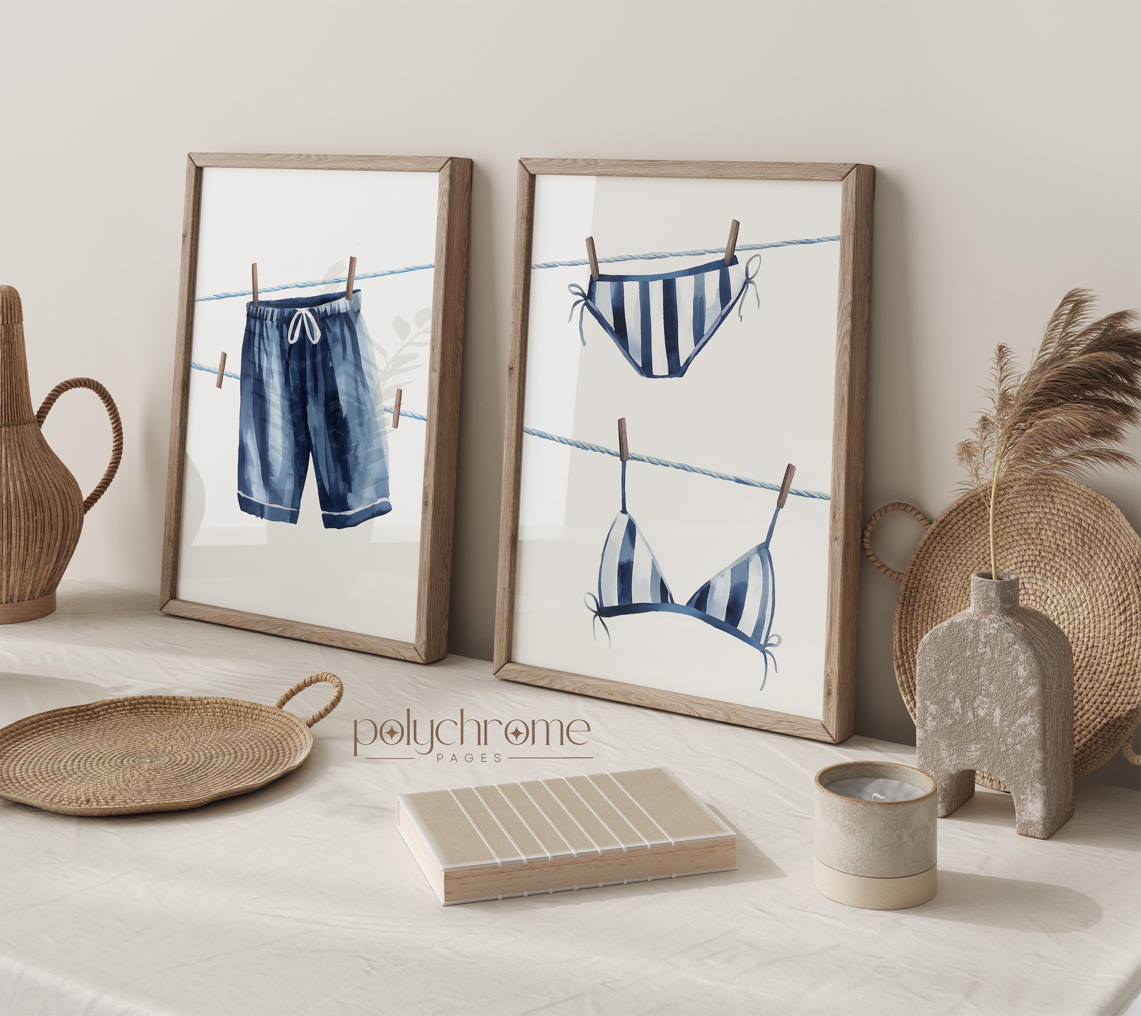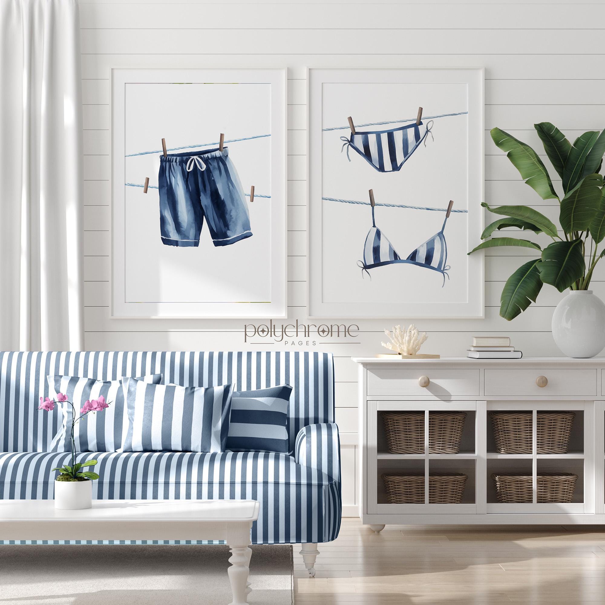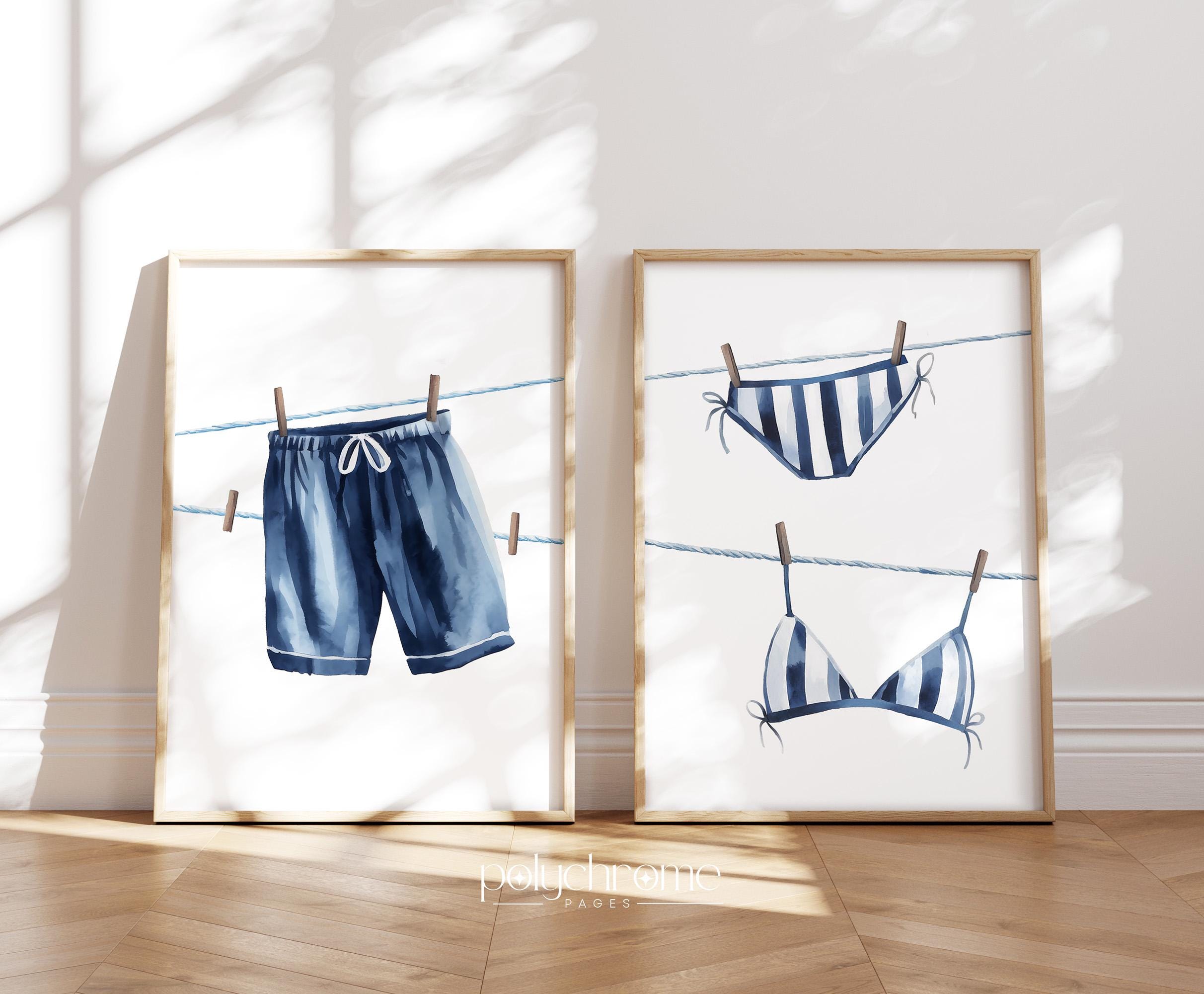 This playful set of summer paintings of a hanging bikini and swim trunks on a clothesline captures that carefree, beachy vibe perfect for lake house bathing areas, pool bathroom, or even laundry room. These navy pieces bring a fresh, fun twist to beach house decor and swimming pool art.