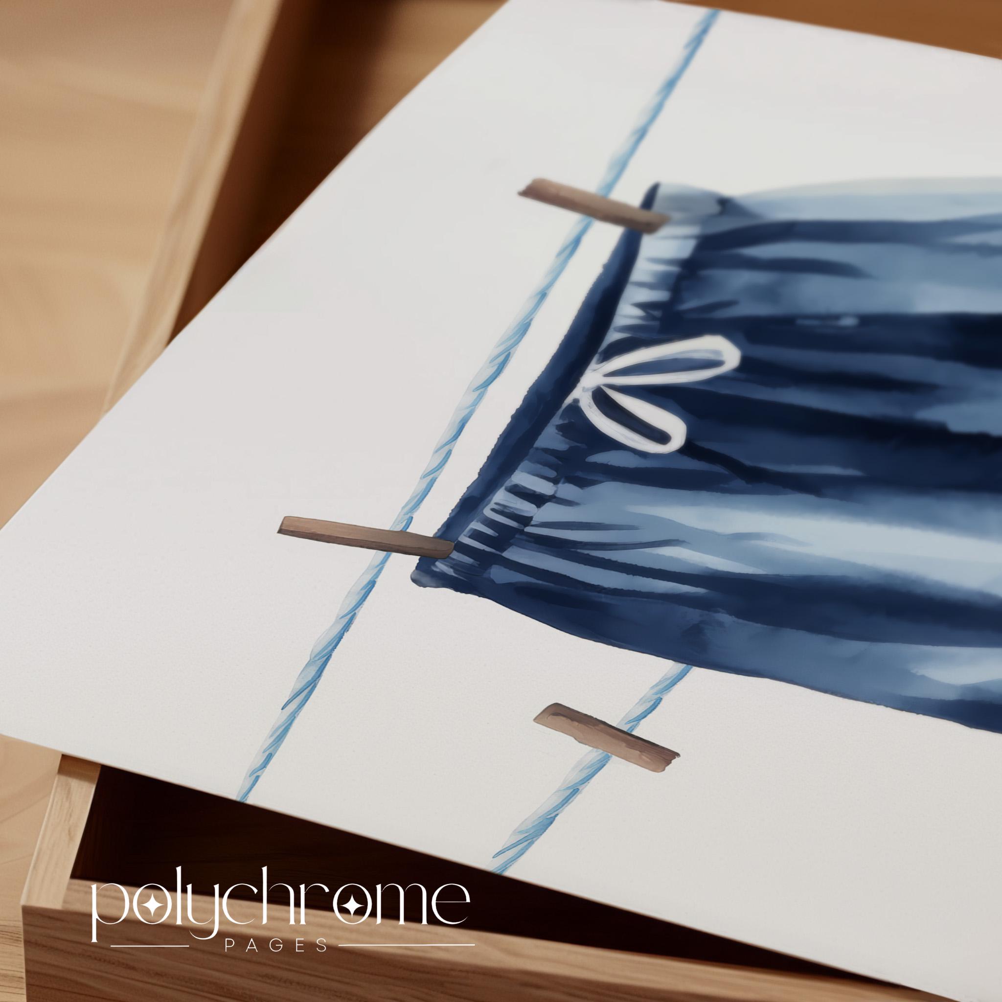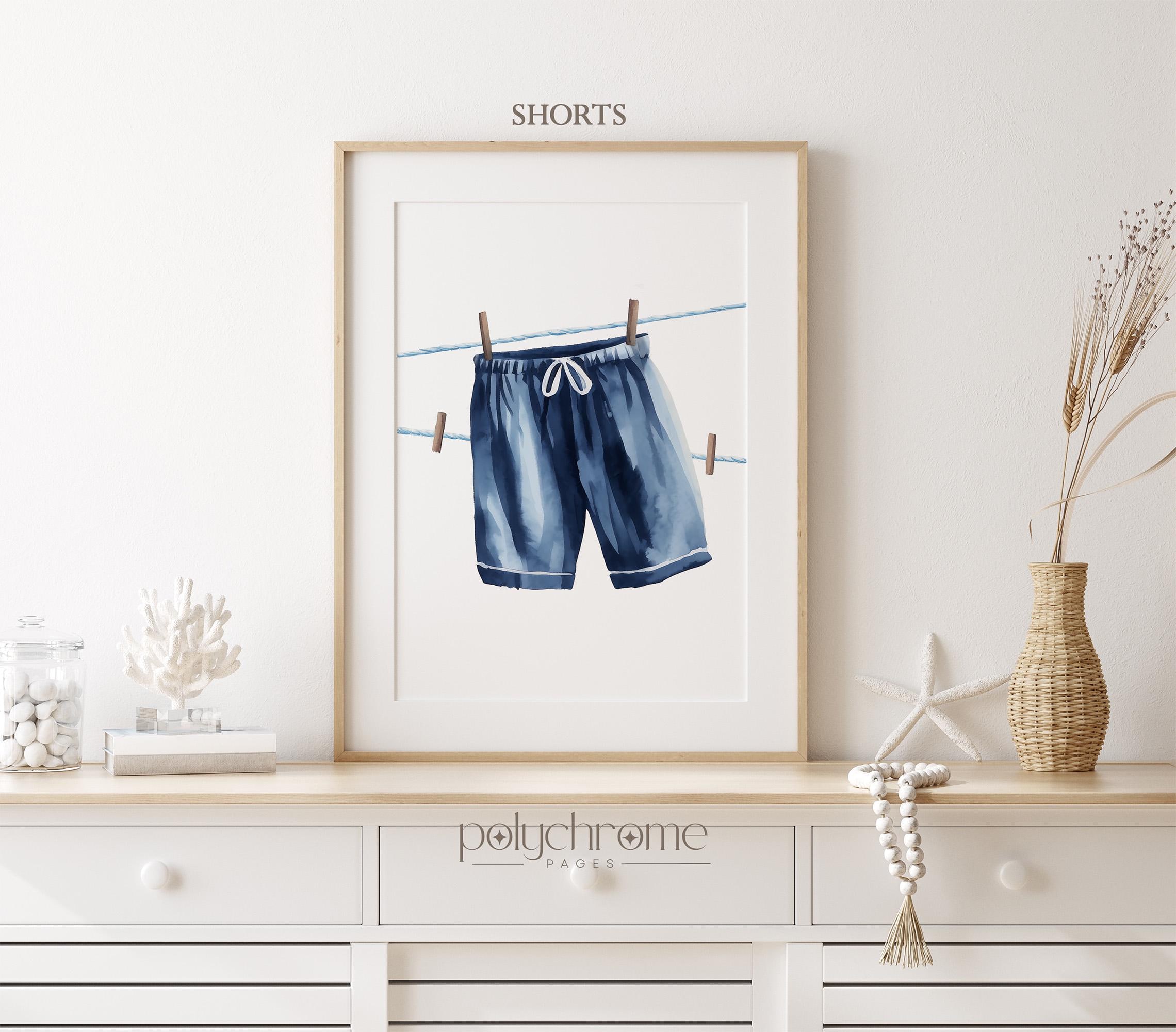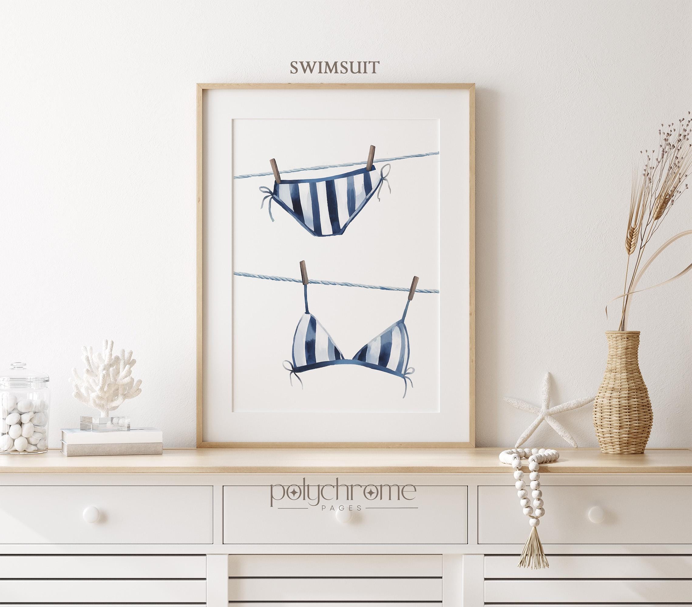 This playful set of summer paintings of a hanging bikini and swim trunks on a clothesline captures that carefree, beachy vibe perfect for lake house bathing areas, pool bathroom, or even laundry room. These navy pieces bring a fresh, fun twist to beach house decor and swimming pool art.