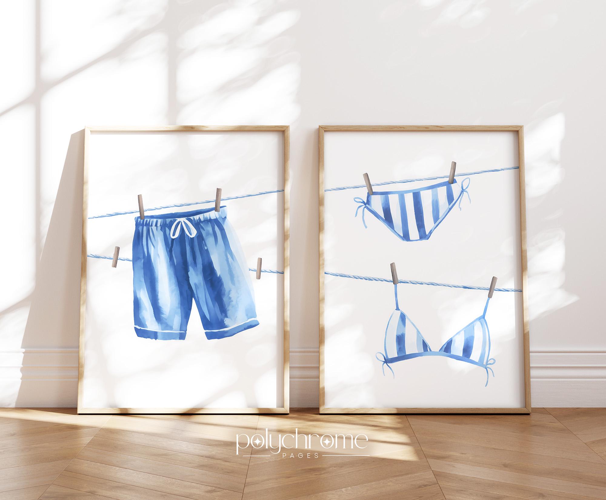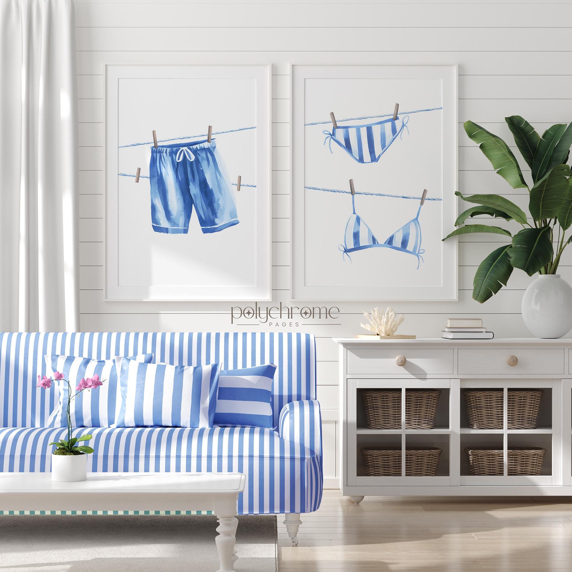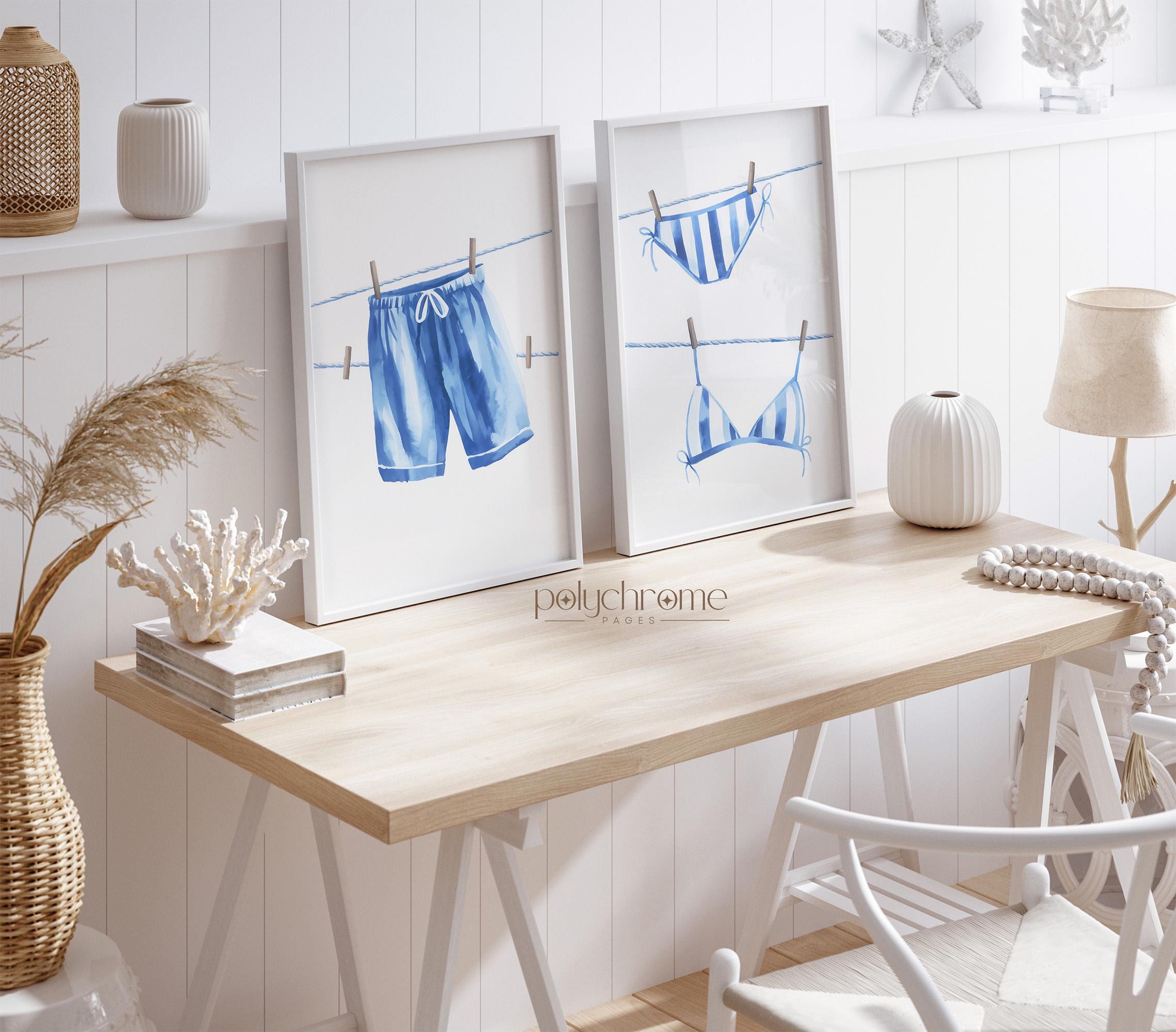 This playful set of summer paintings of a hanging bikini and swim trunks on a clothesline captures that carefree, beachy vibe perfect for lake house bathing areas, pool bathroom, or even laundry room. These blue pieces bring a fresh, fun twist to your beach house.