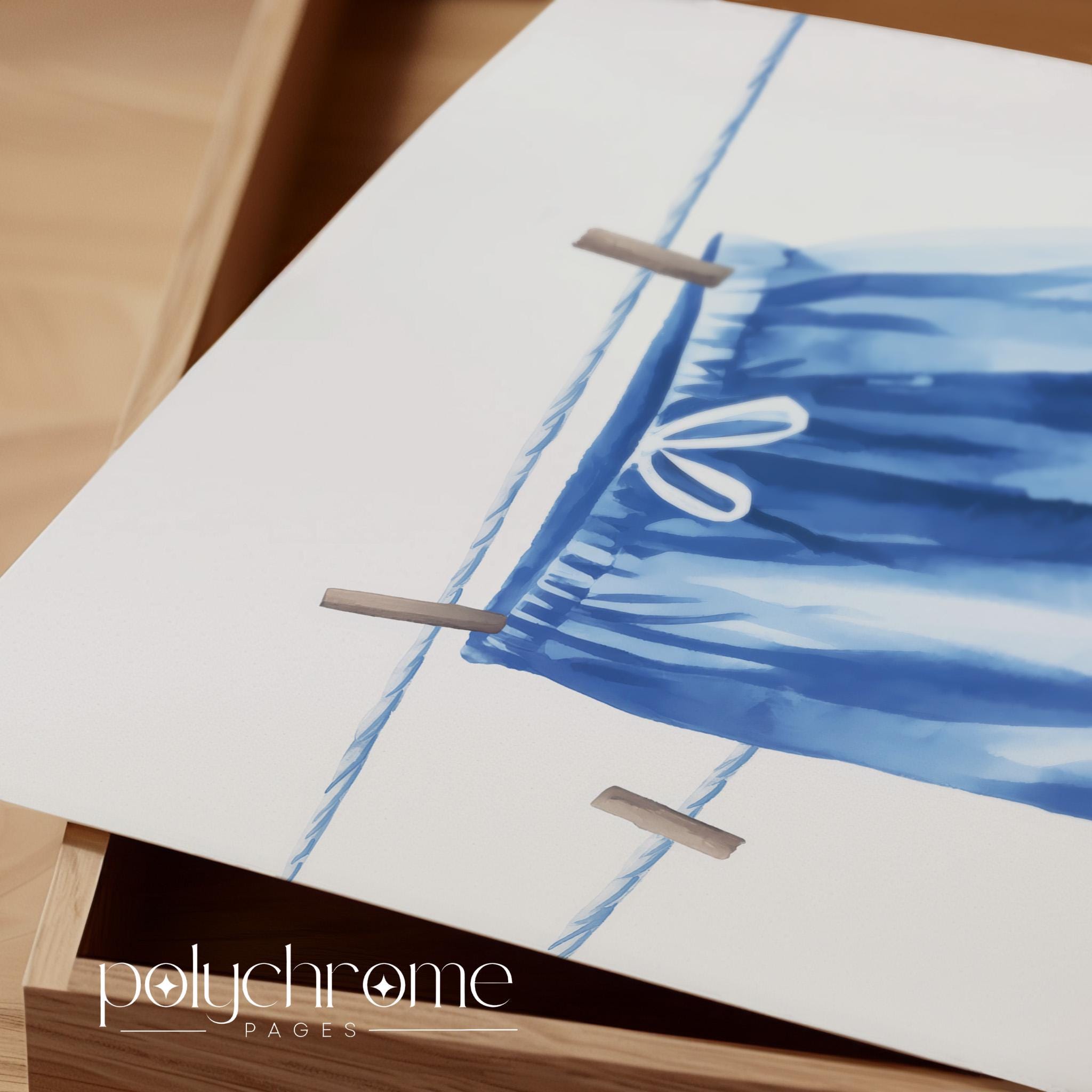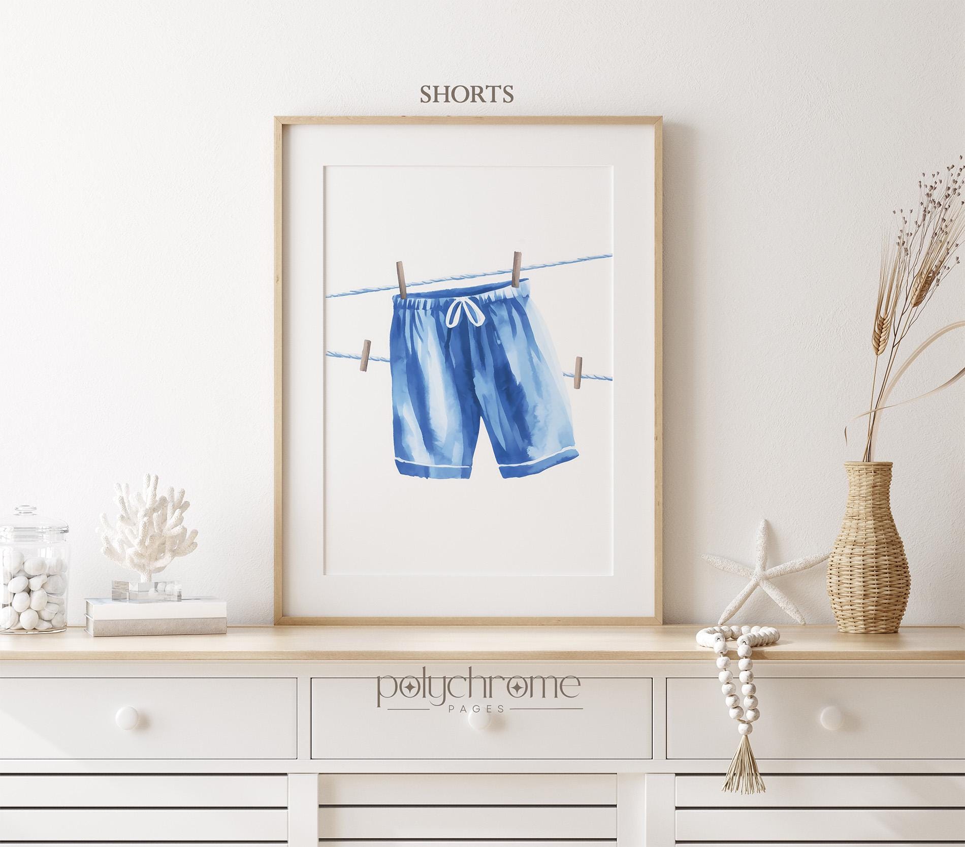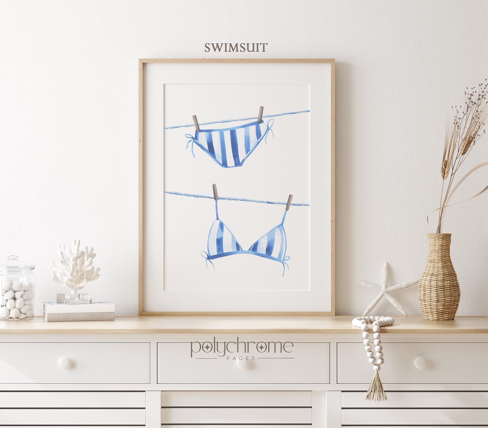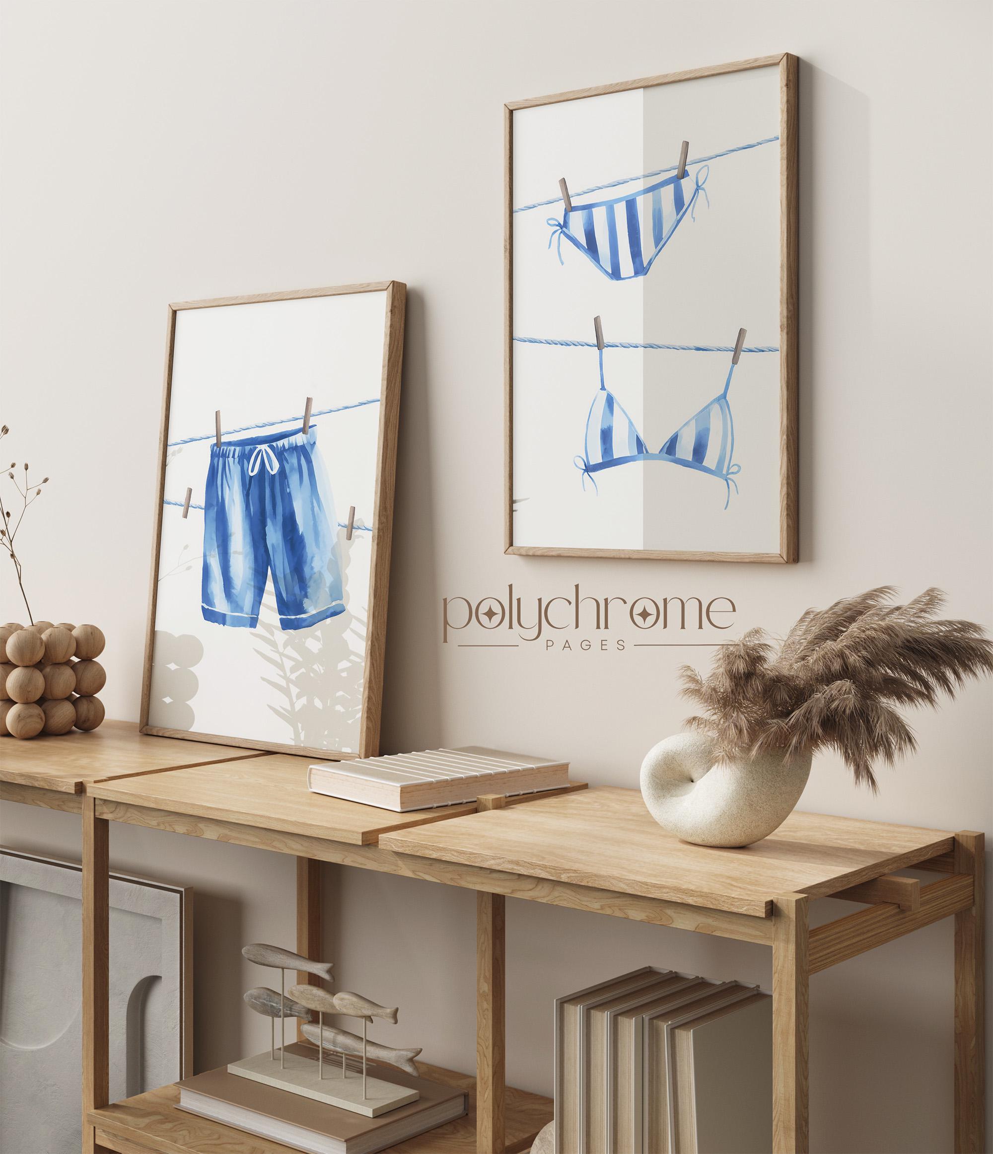 This playful set of summer paintings of a hanging bikini and swim trunks on a clothesline captures that carefree, beachy vibe perfect for lake house bathing areas, pool bathroom, or even laundry room. These blue pieces bring a fresh, fun twist to your beach house.