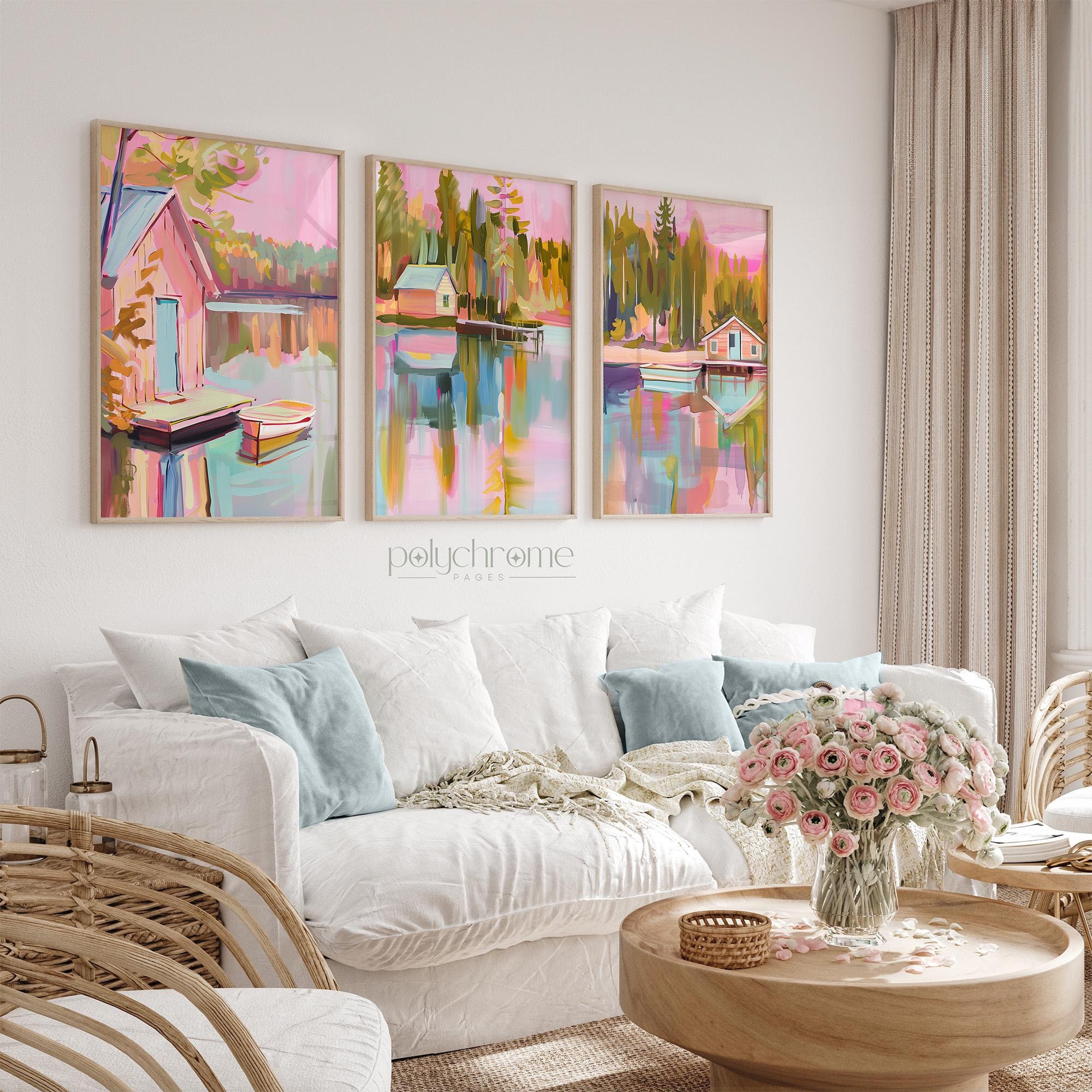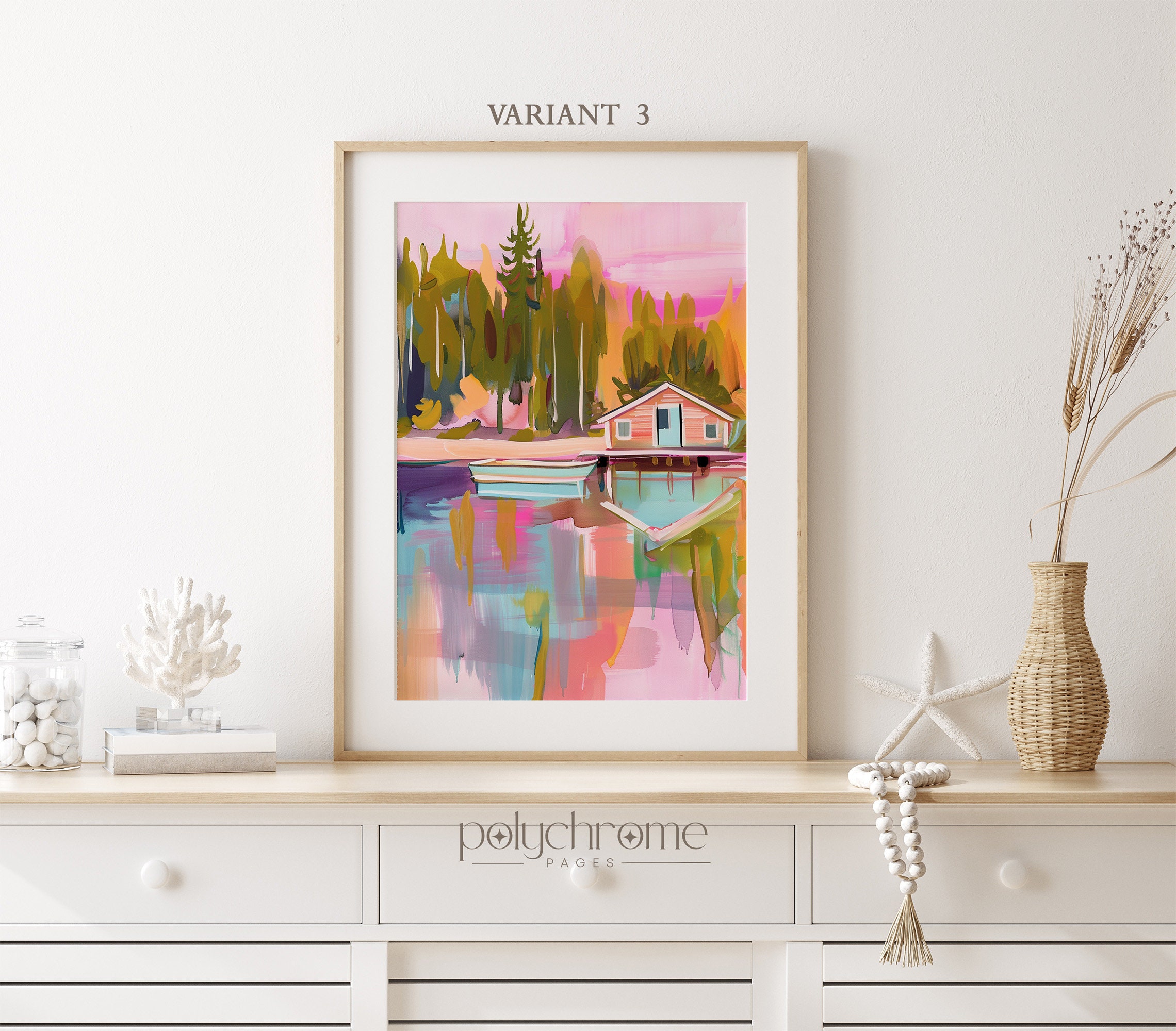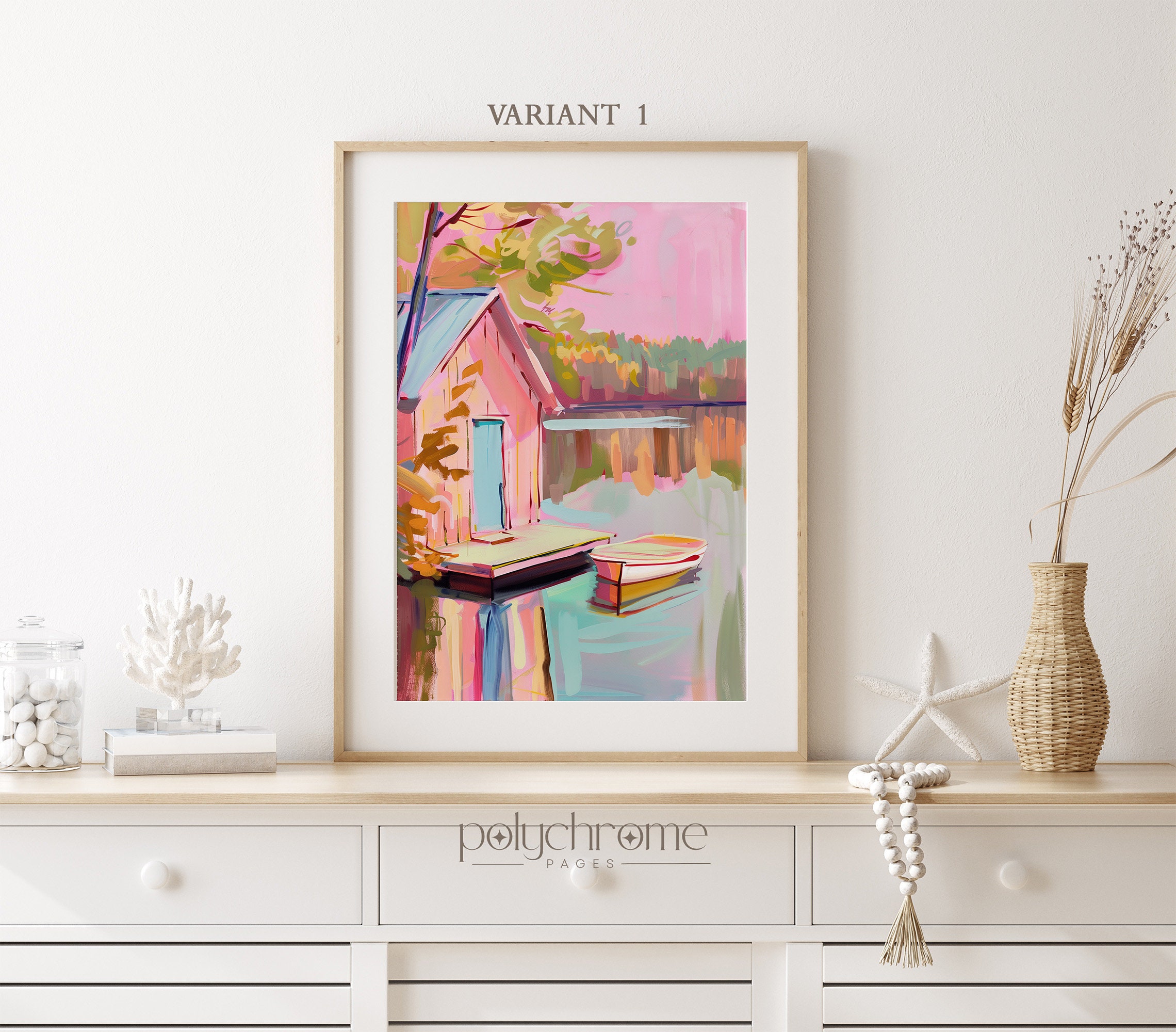 This vintage-style landscape captures a peaceful lakeside scene with a wooden pier, small boat, and charming home nestled among trees. Soft pastel pinks and blues give it a dreamy, nostalgic quality that feels both calming and romantic. Ideal for lake house living rooms, guest bedrooms, or cozy reading nooks. A lovely choice for anyone who appreciates rustic landscapes or wants to bring a serene waterside atmosphere indoors.