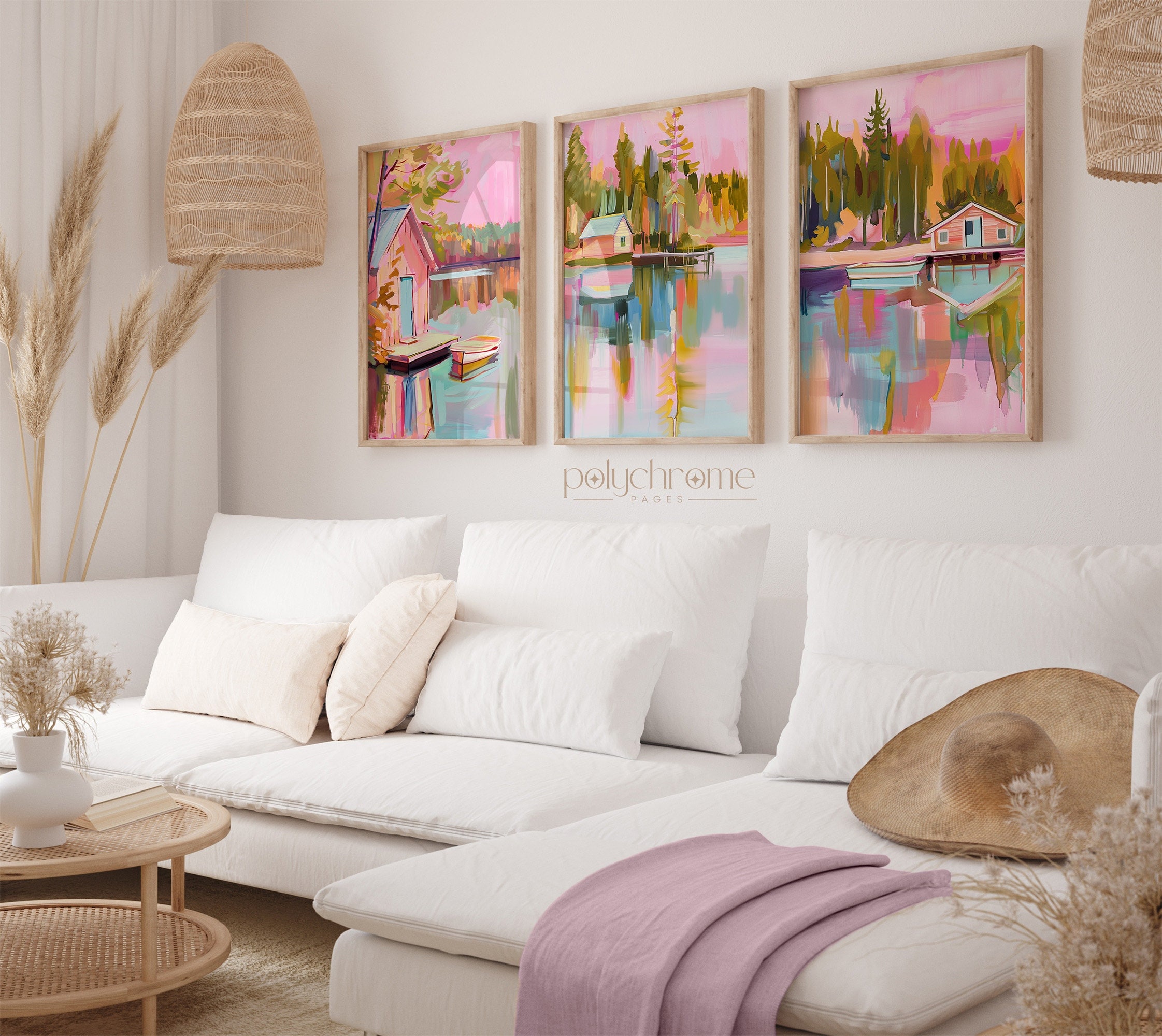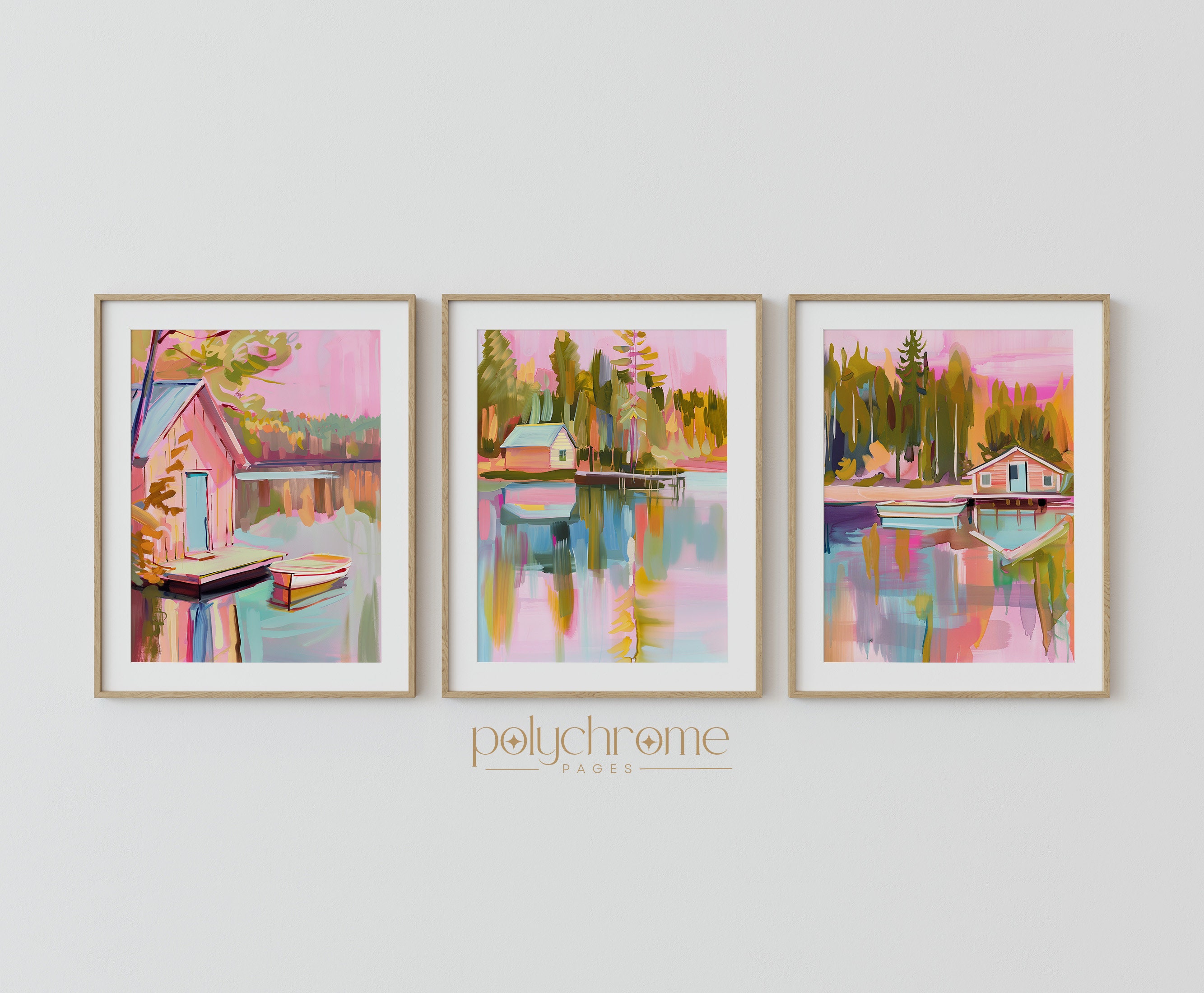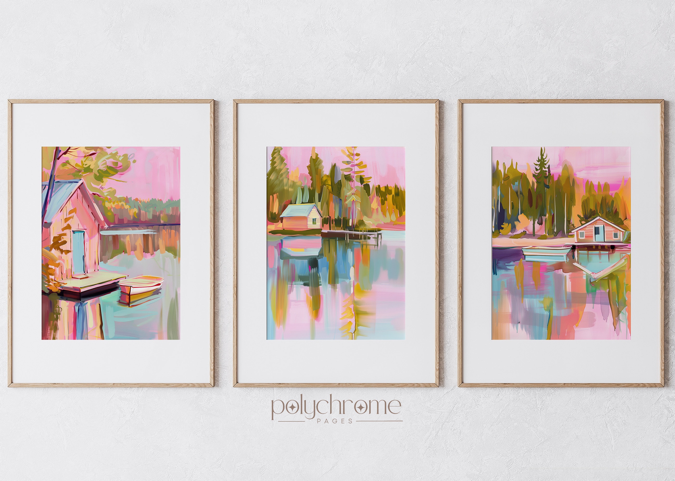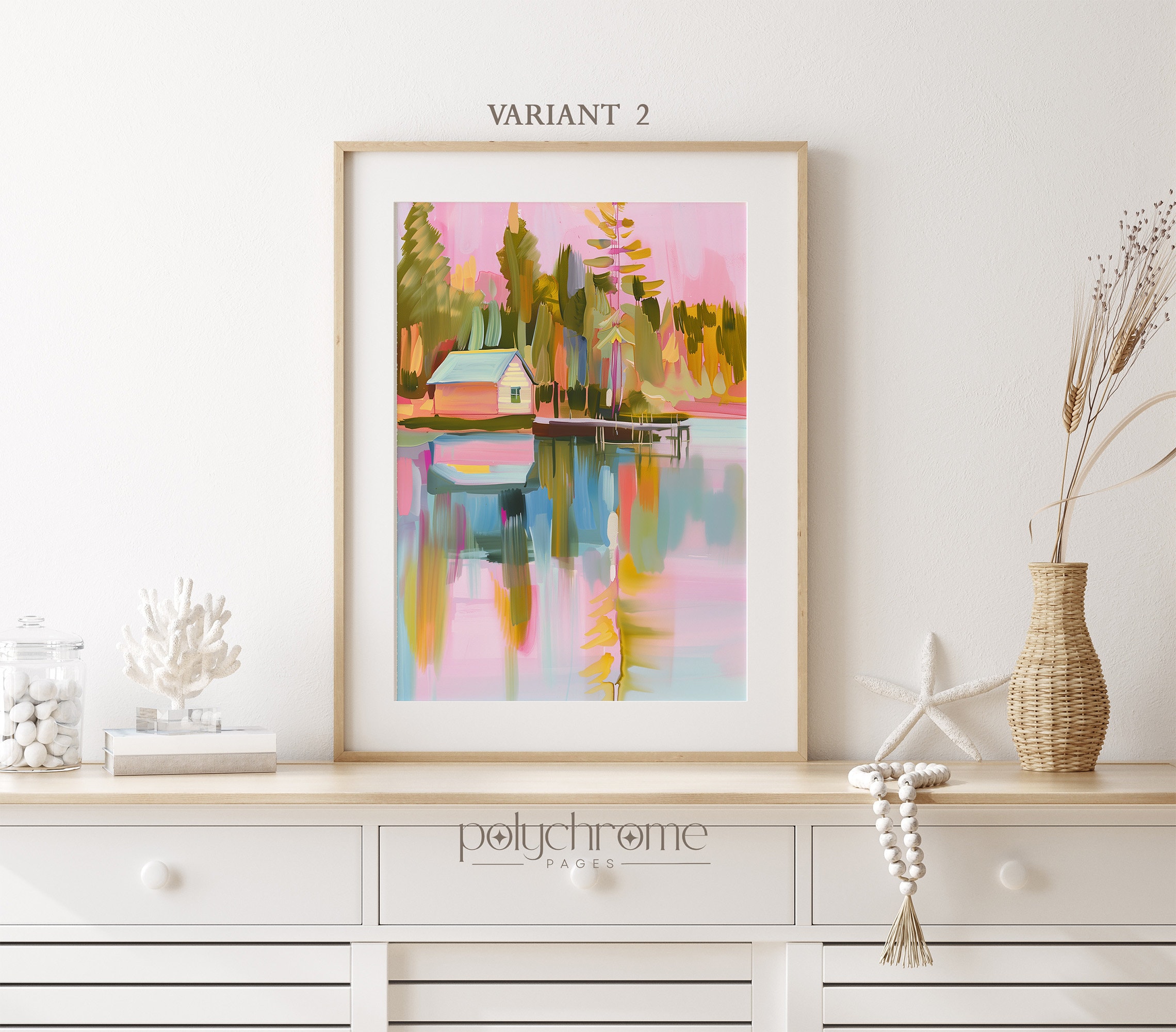 This vintage-style landscape captures a peaceful lakeside scene with a wooden pier, small boat, and charming home nestled among trees. Soft pastel pinks and blues give it a dreamy, nostalgic quality that feels both calming and romantic. Ideal for lake house living rooms, guest bedrooms, or cozy reading nooks. A lovely choice for anyone who appreciates rustic landscapes or wants to bring a serene waterside atmosphere indoors.