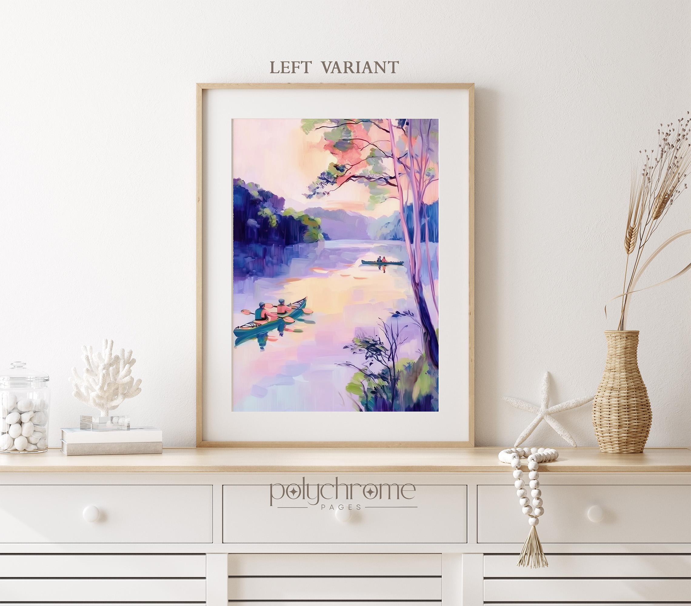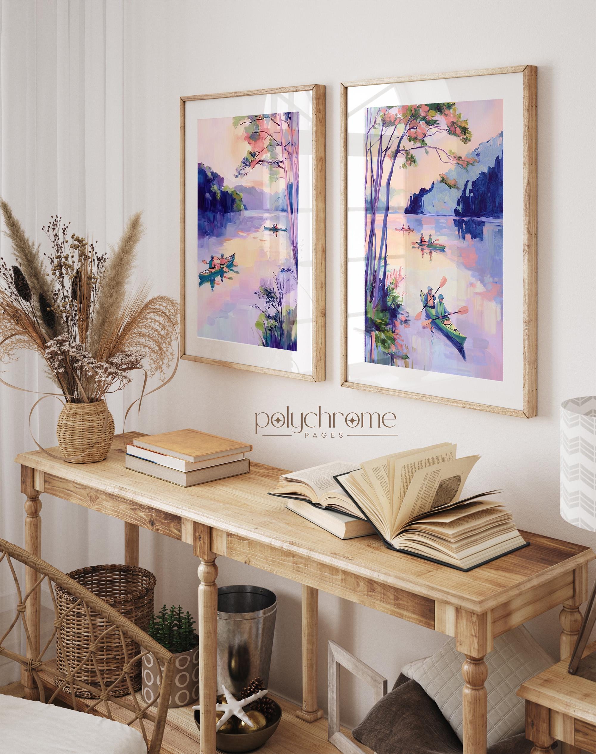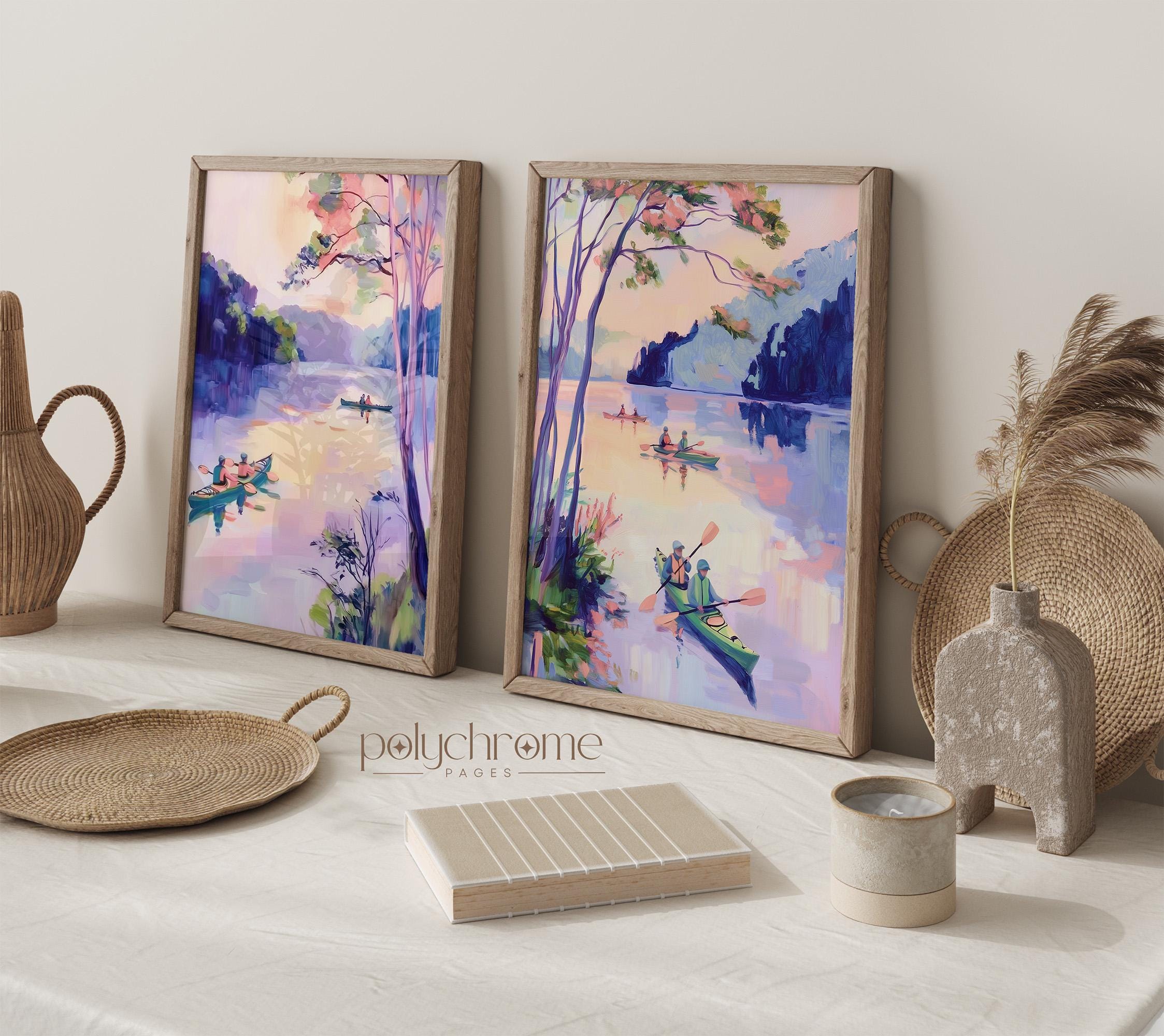 A peaceful lakeside scene featuring colorful kayaks in soft purple and pink tones, bringing to mind lazy summer days on the water. This vintage-inspired paddle art works beautifully in lake house living spaces, fishing cabin bathrooms, or poolside powder rooms. A lovely choice for outdoor enthusiasts or anyone drawn to modern cottage style with a gentle, nostalgic feel.