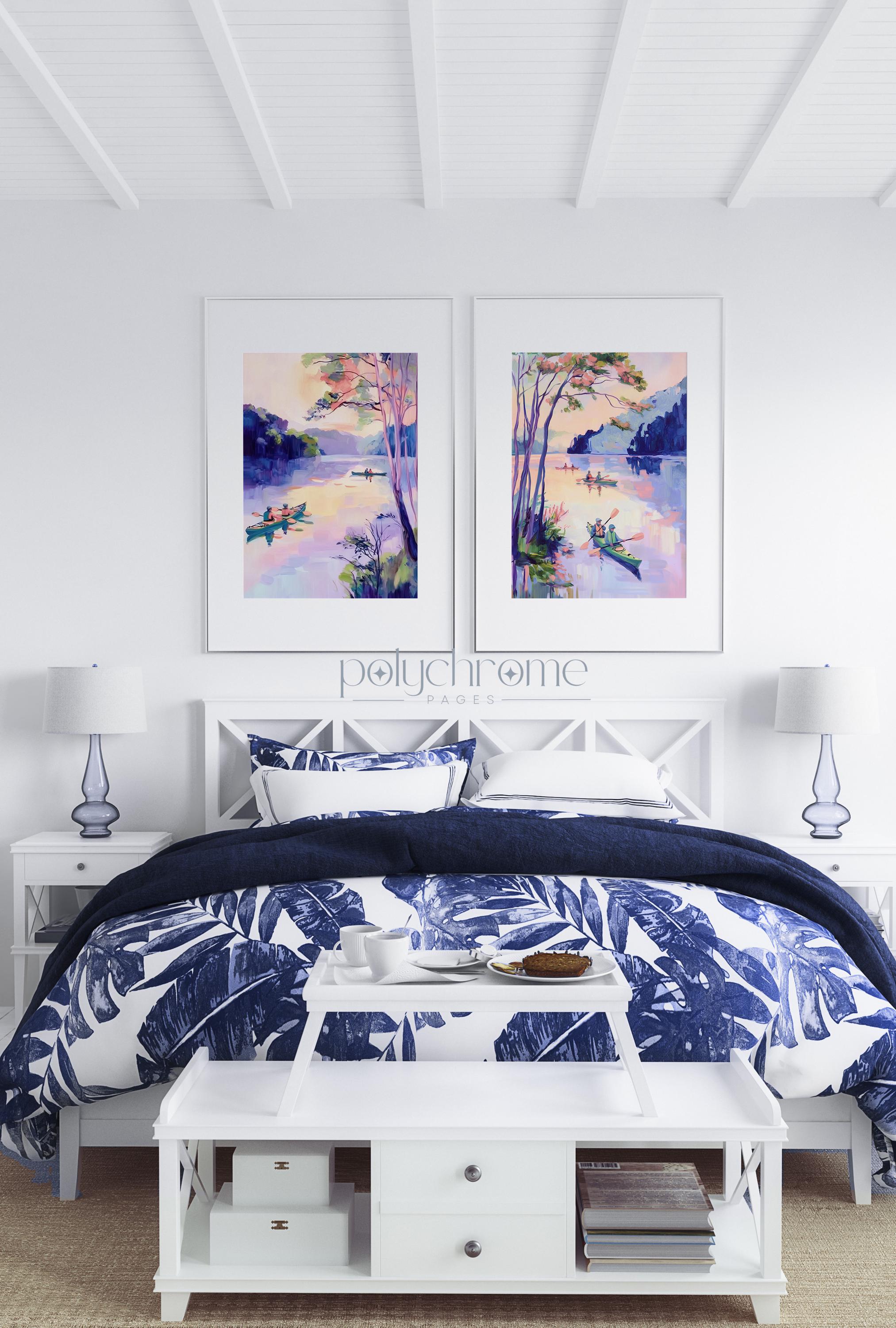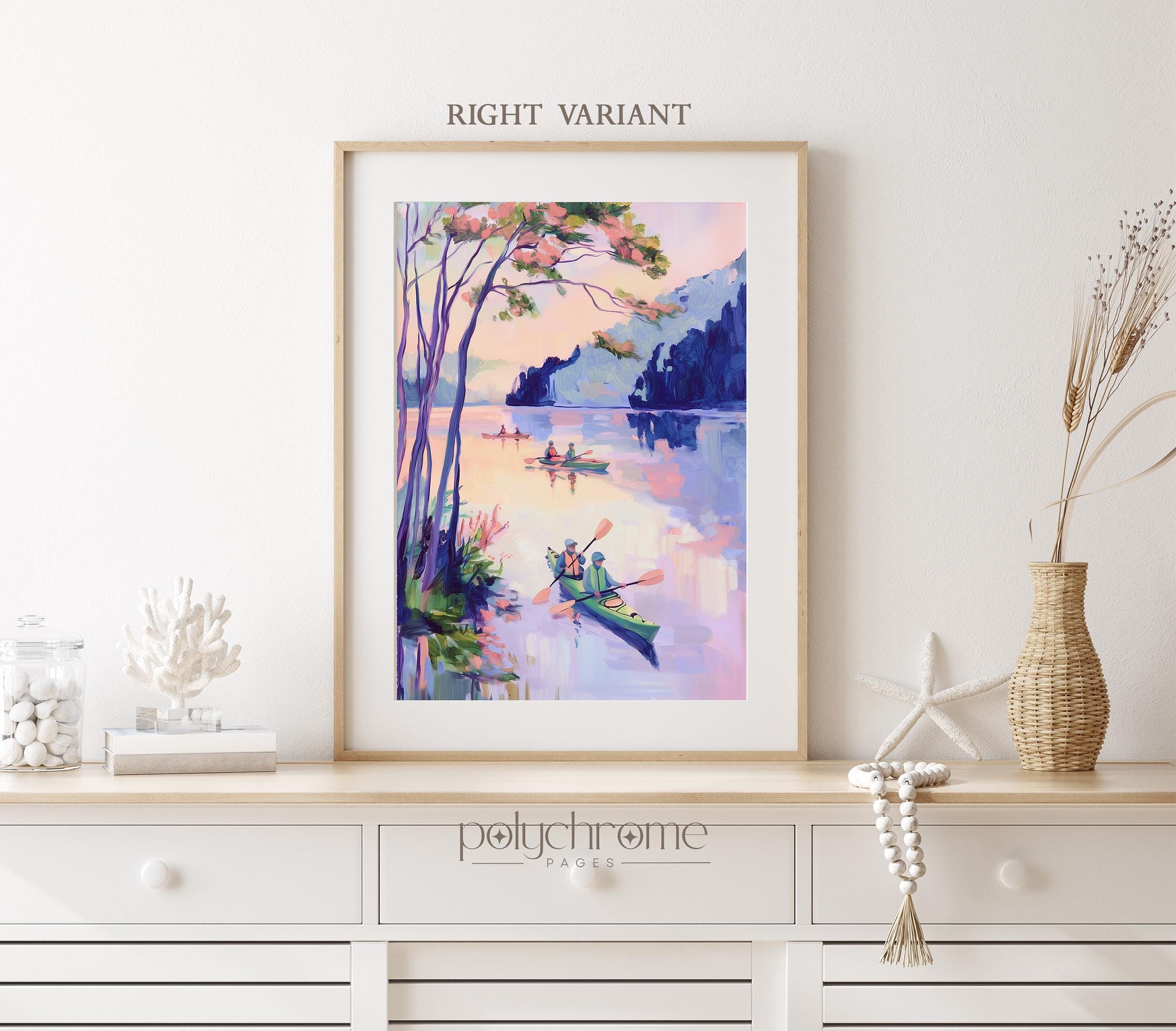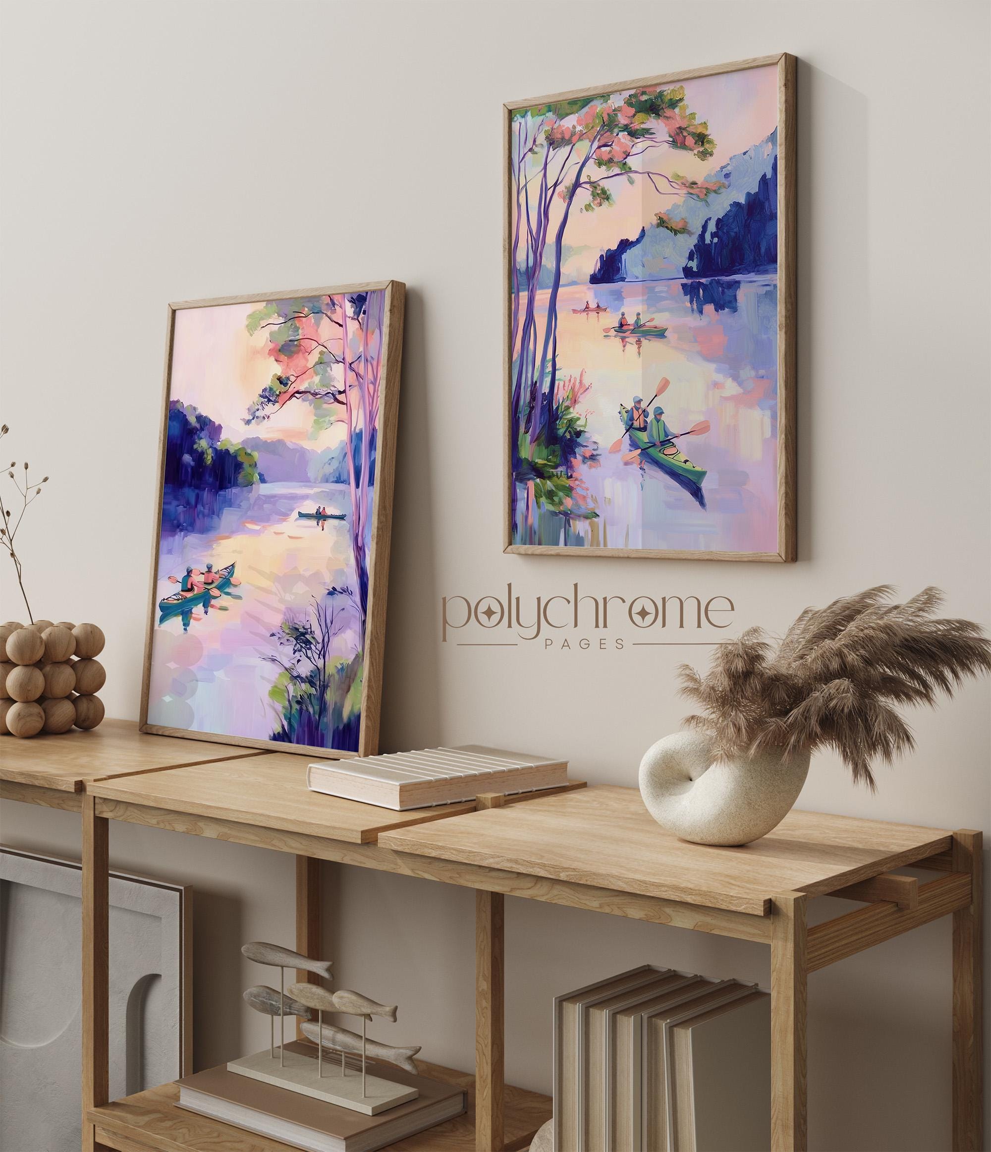 A peaceful lakeside scene featuring colorful kayaks in soft purple and pink tones, bringing to mind lazy summer days on the water. This vintage-inspired paddle art works beautifully in lake house living spaces, fishing cabin bathrooms, or poolside powder rooms. A lovely choice for outdoor enthusiasts or anyone drawn to modern cottage style with a gentle, nostalgic feel.