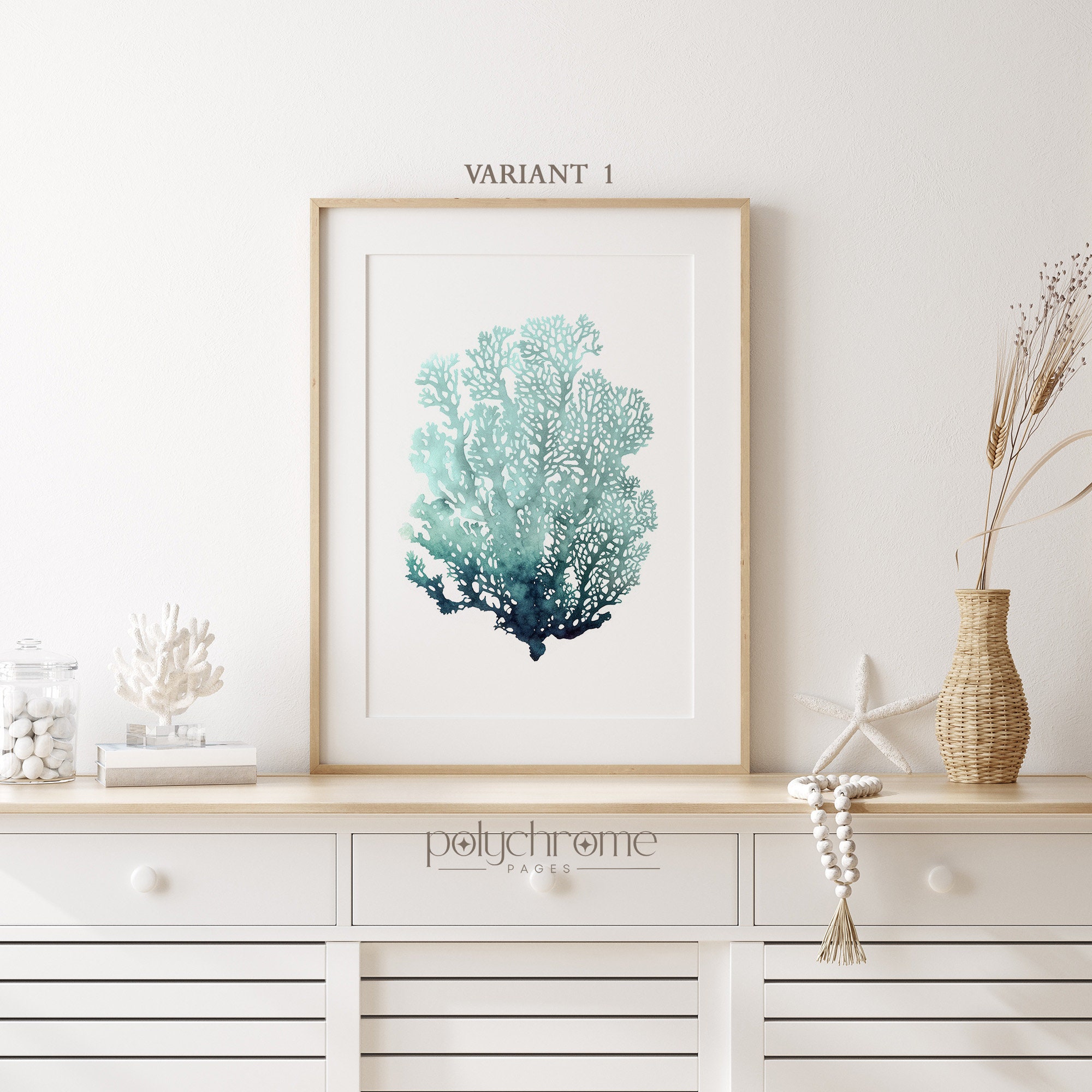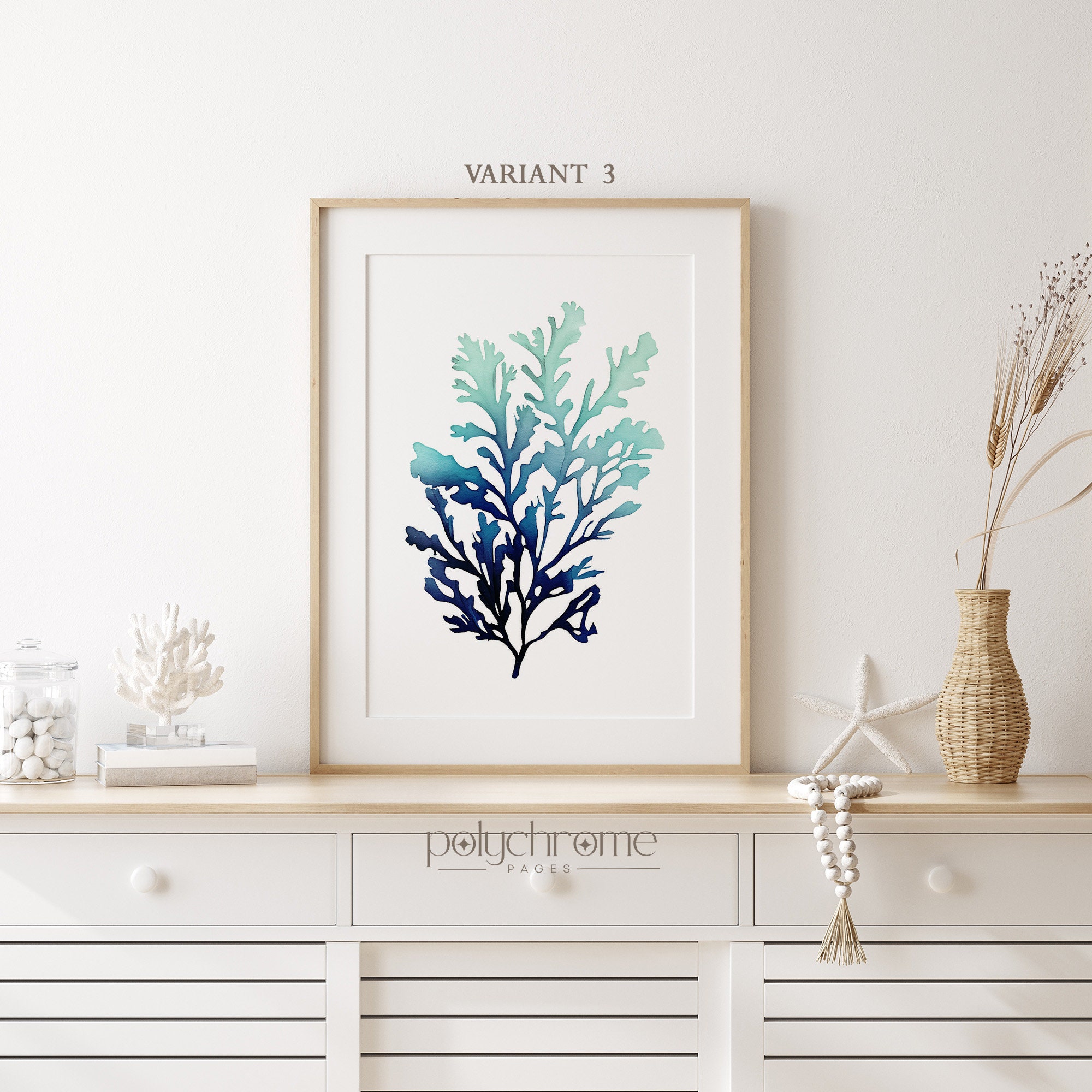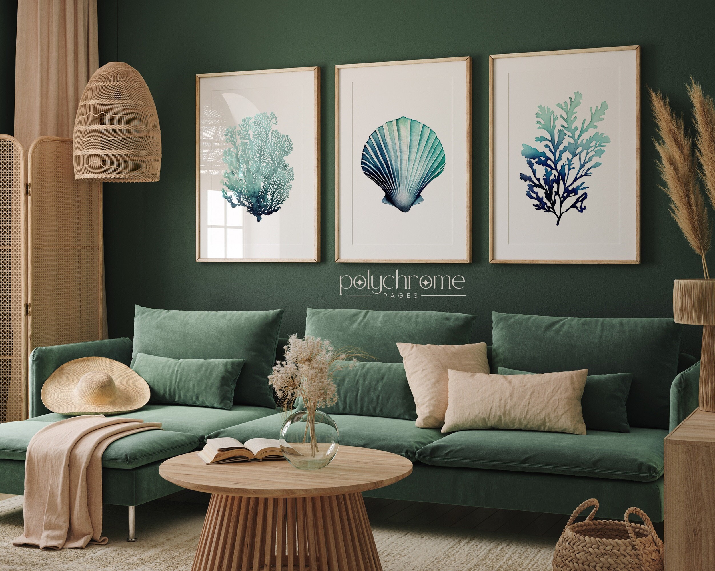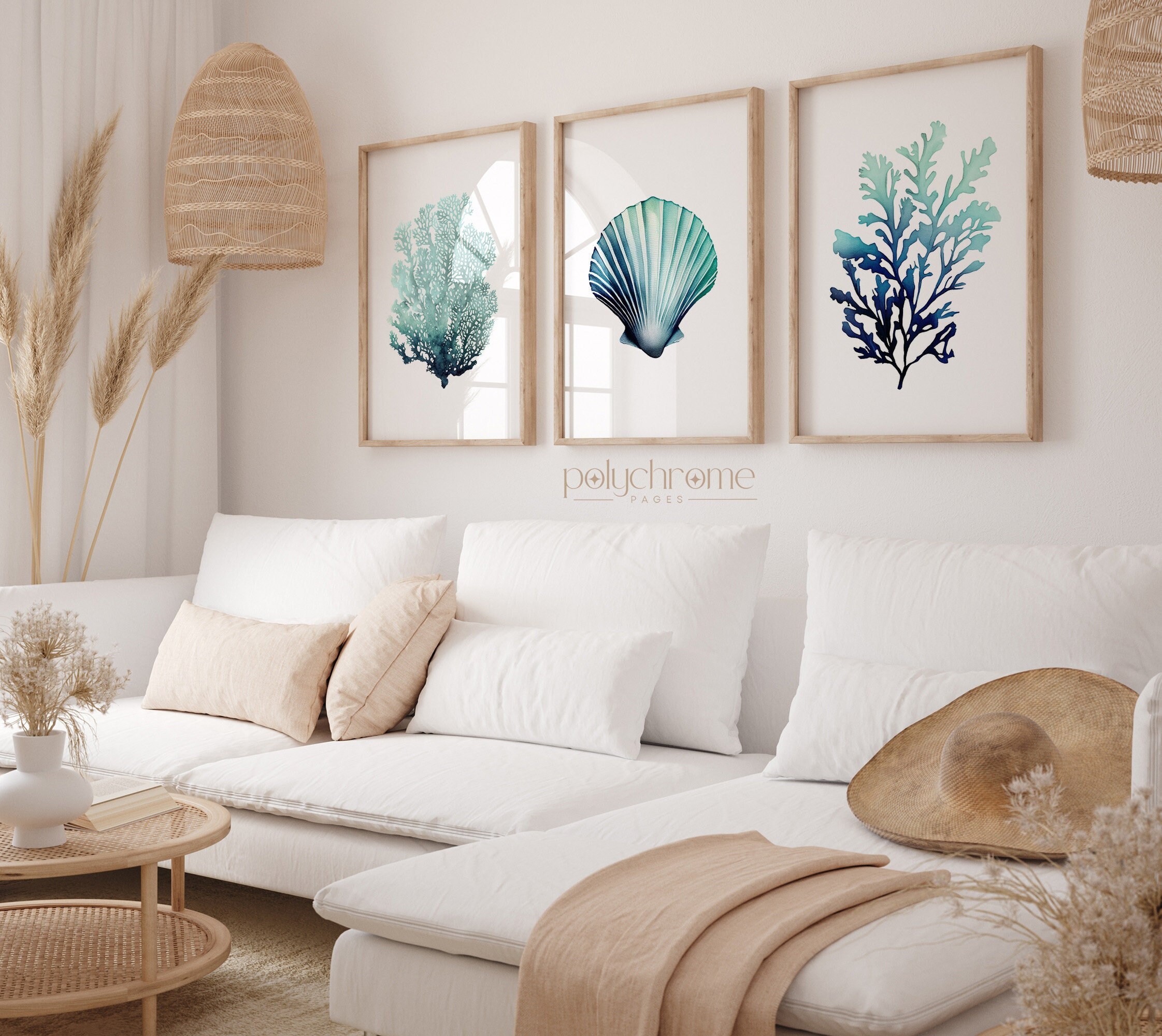This ocean-inspired triptych consists of delicate corals, flowing seaweeds, and scattered seashells in soft blue gradient tones. The gentle underwater palette creates a calming, serene feel that works beautifully in bathrooms, master bedrooms, or even a baby nursery. A lovely choice for anyone wanting to bring quiet coastal elegance into their home.
