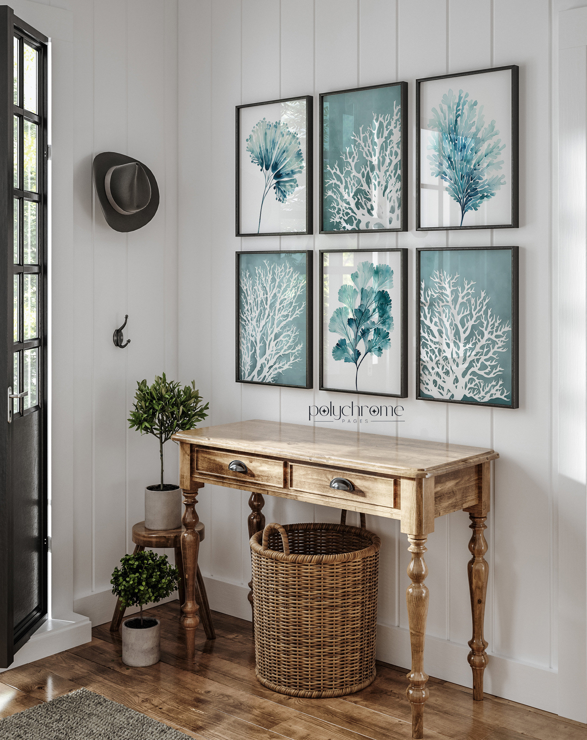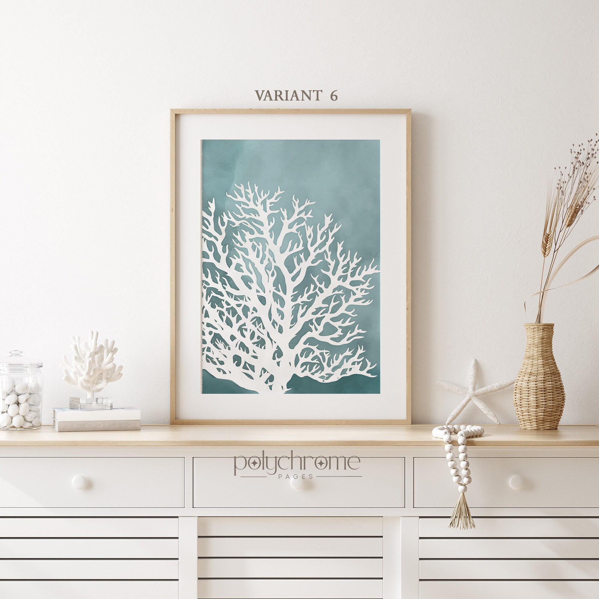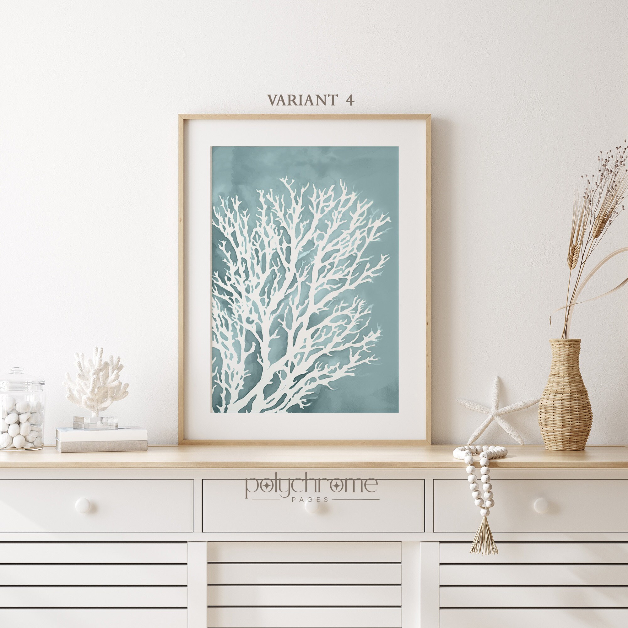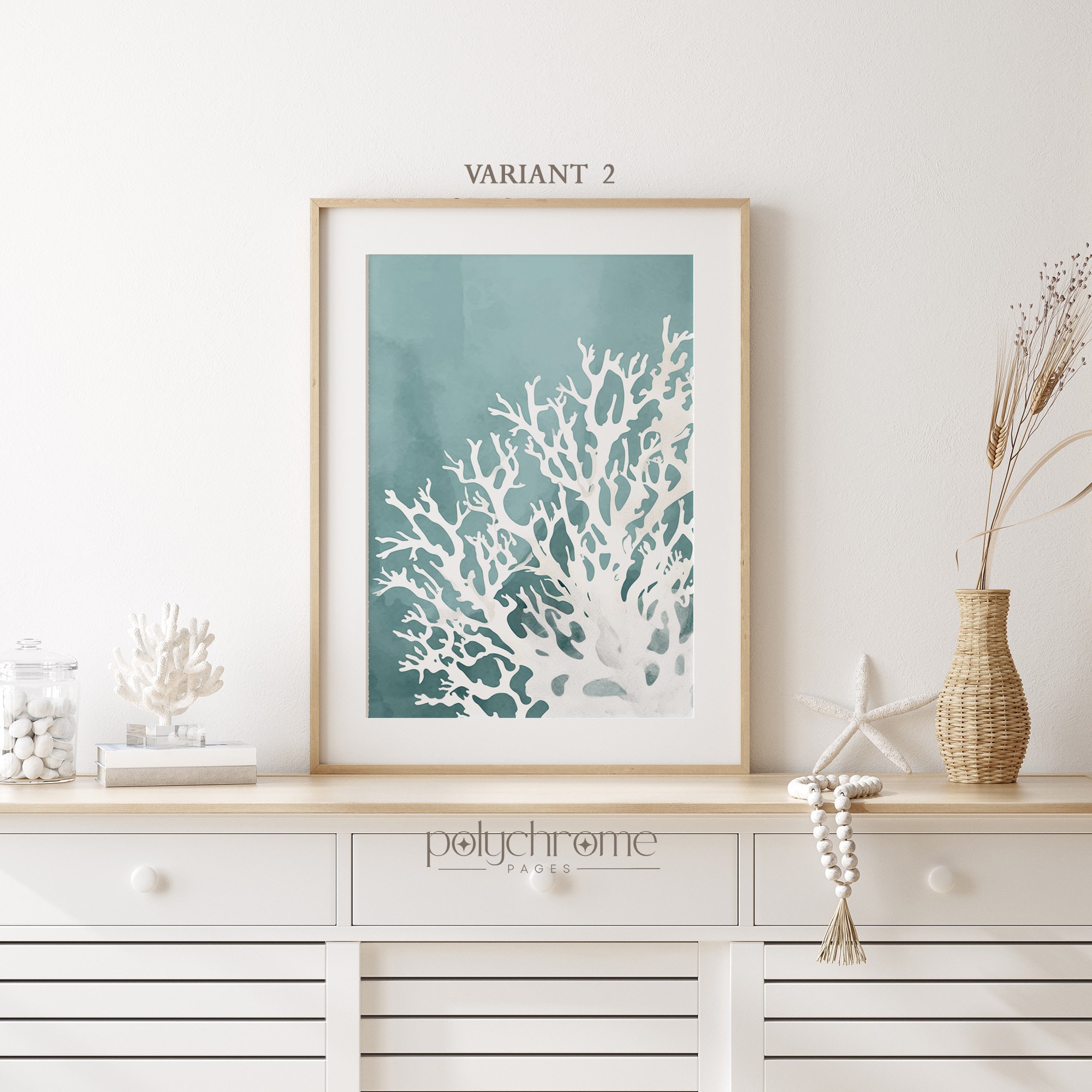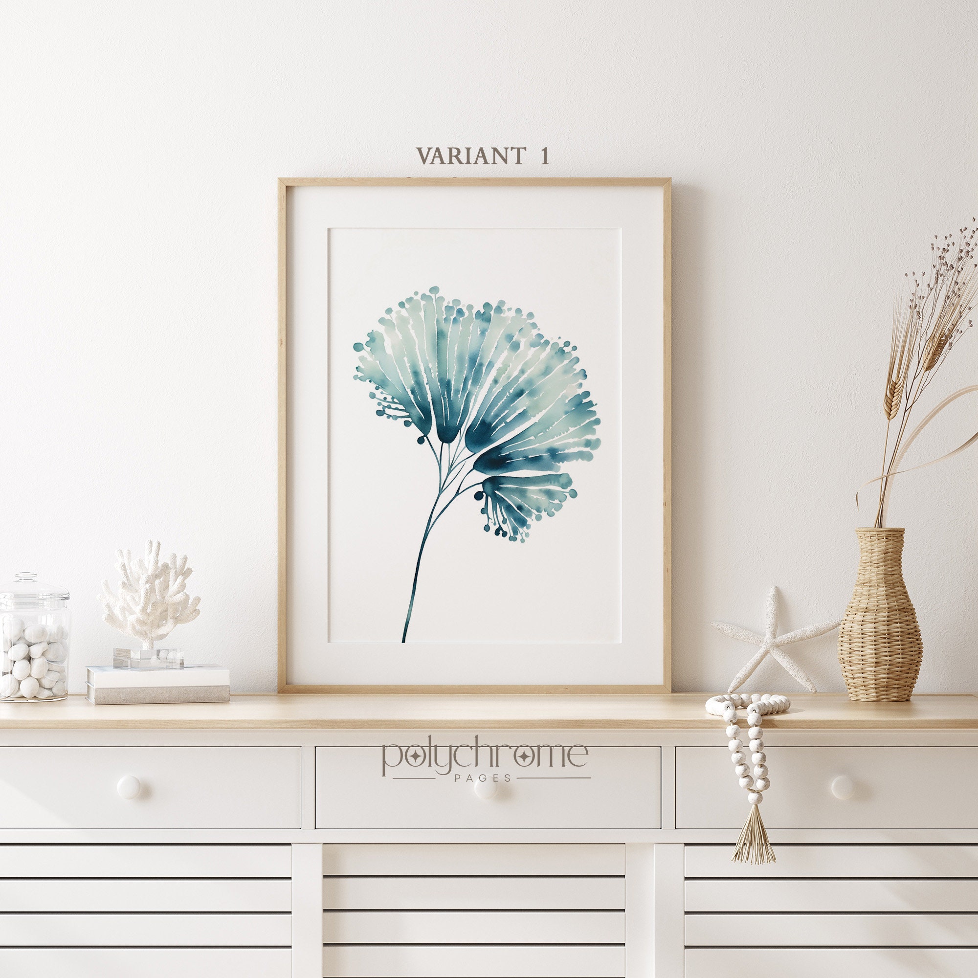 This ocean-inspired set of delicate sea fan coral and flowing seaweed in soft teal watercolor tones brings an elegant underwater feel to your walls. The muted coastal palette works beautifully in bathrooms, master bedrooms, or any space that could use a calming nautical touch. A lovely choice for anyone who appreciates subtle marine artwork with a serene, organic quality.