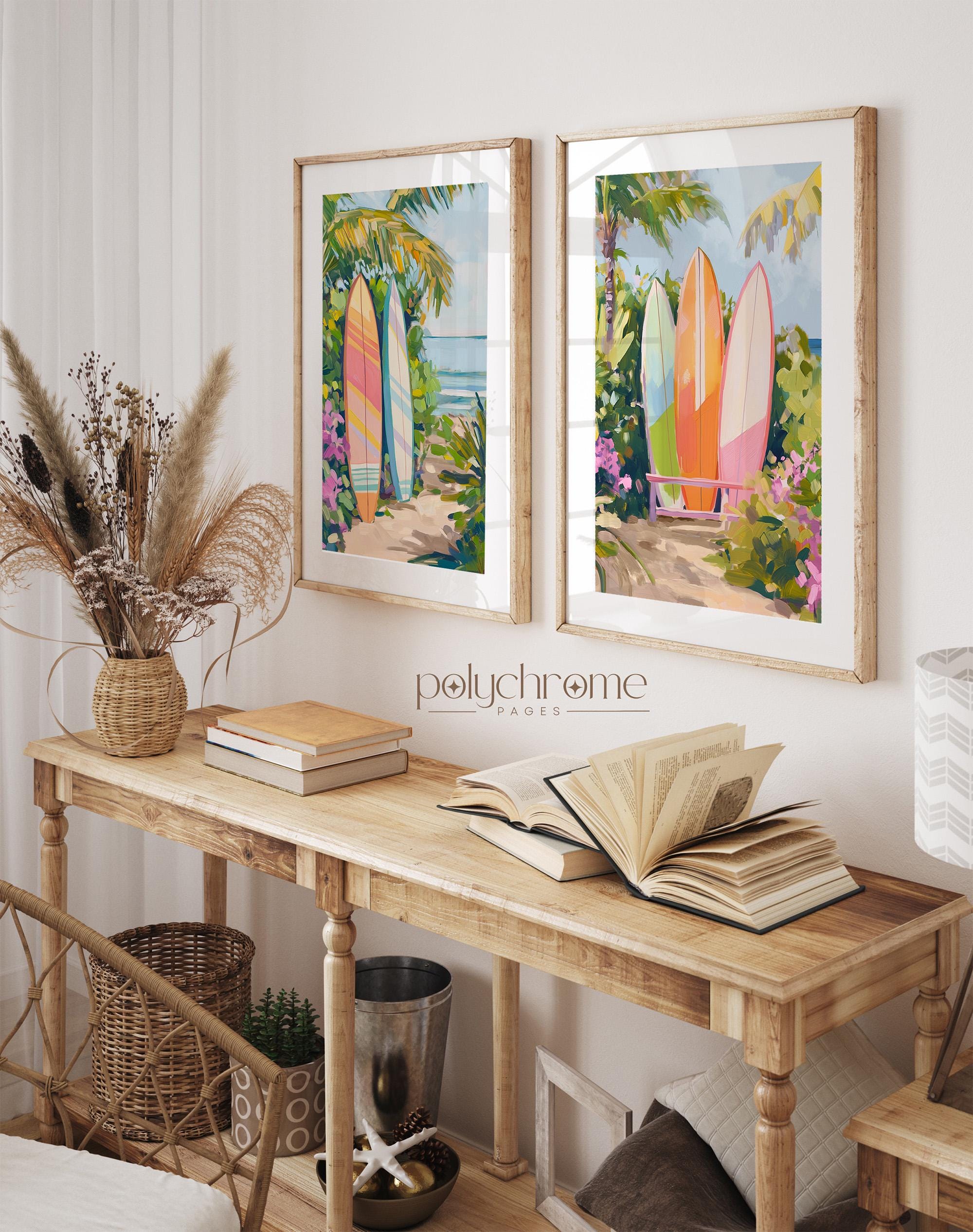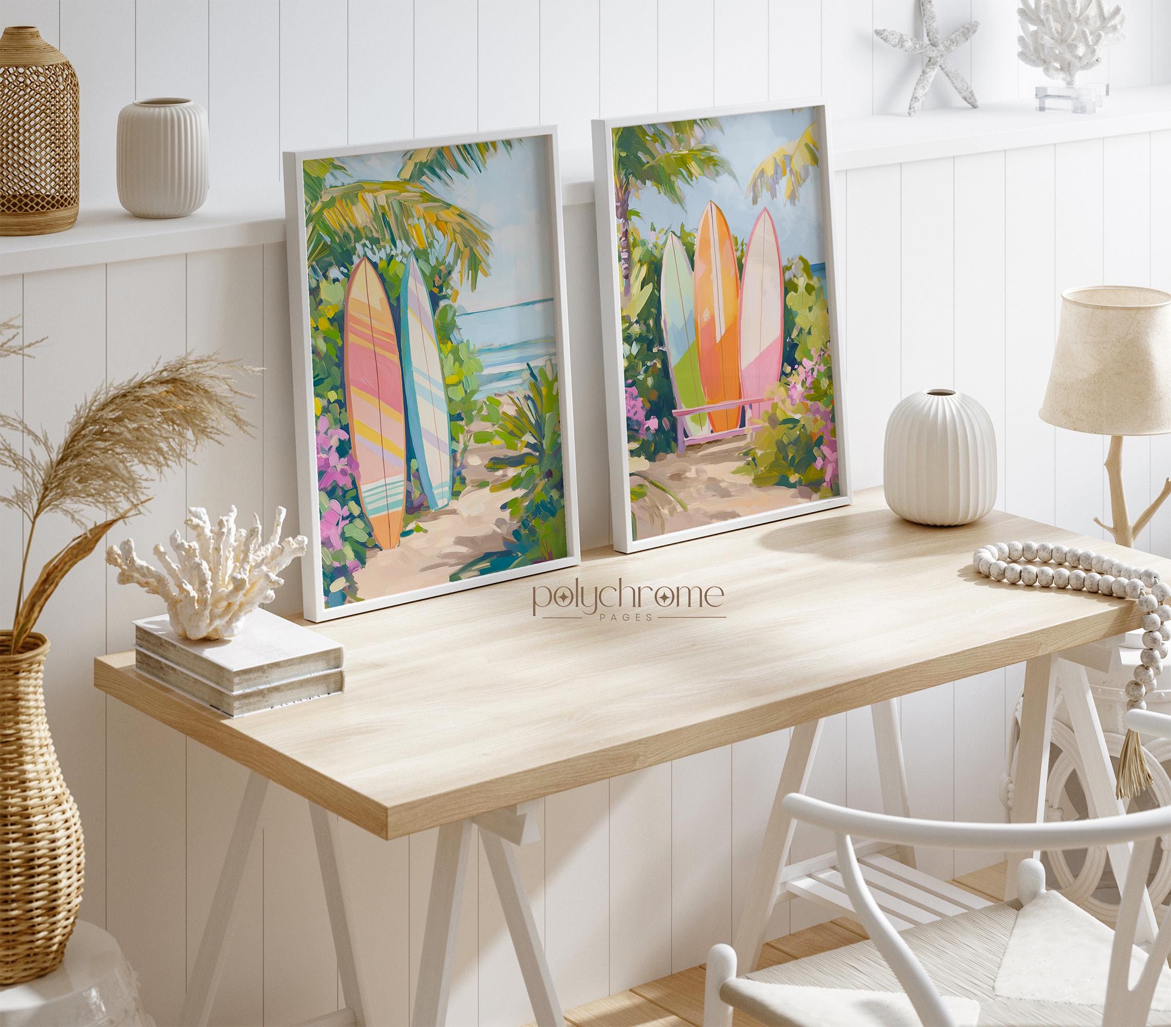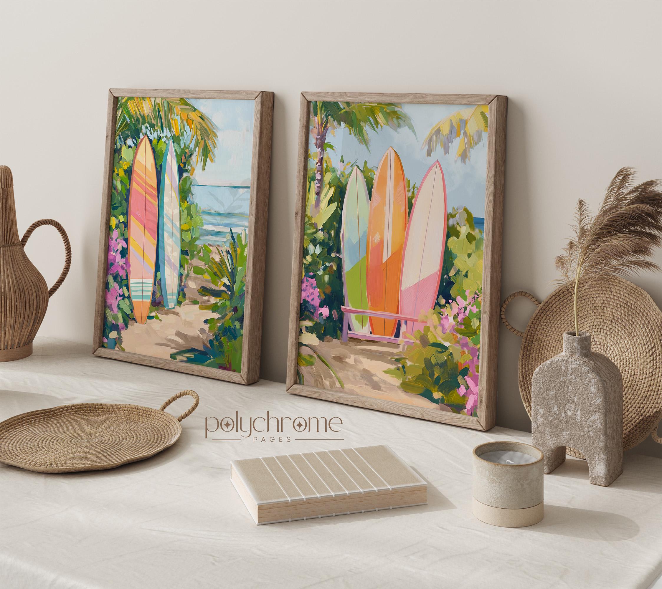 A vibrant beach scene featuring surfboards in warm orange and pink tones, set against a tropical backdrop that captures the laid-back spirit of Hawaiian surf culture. The bright, cheerful colour palette makes this piece a natural fit for pool bathrooms, coastal entryways, or any space that could use a dose of sunshine. Ideal for surf enthusiasts, lovers of tropical decor, or anyone looking to bring a bit of island warmth into their home.