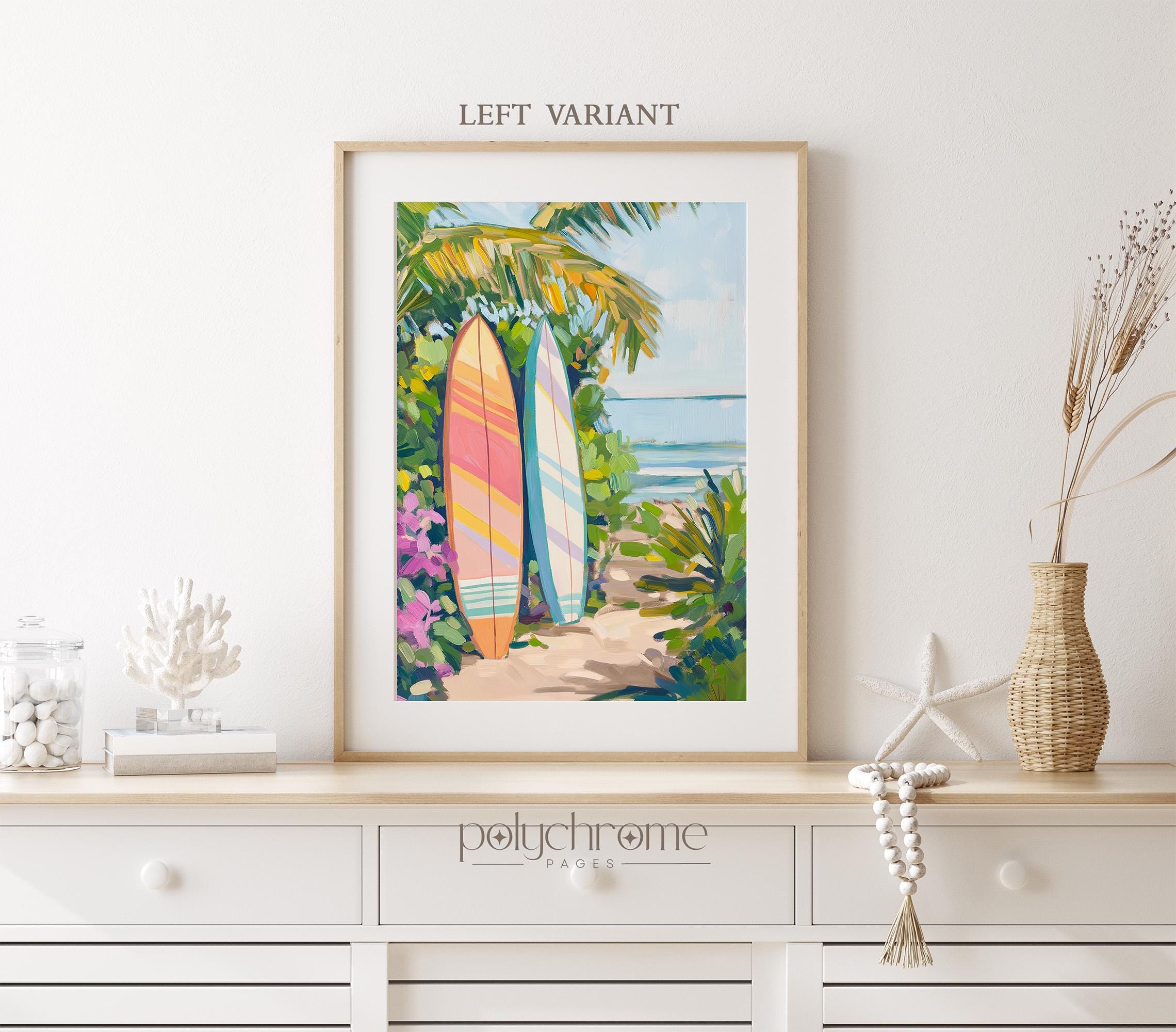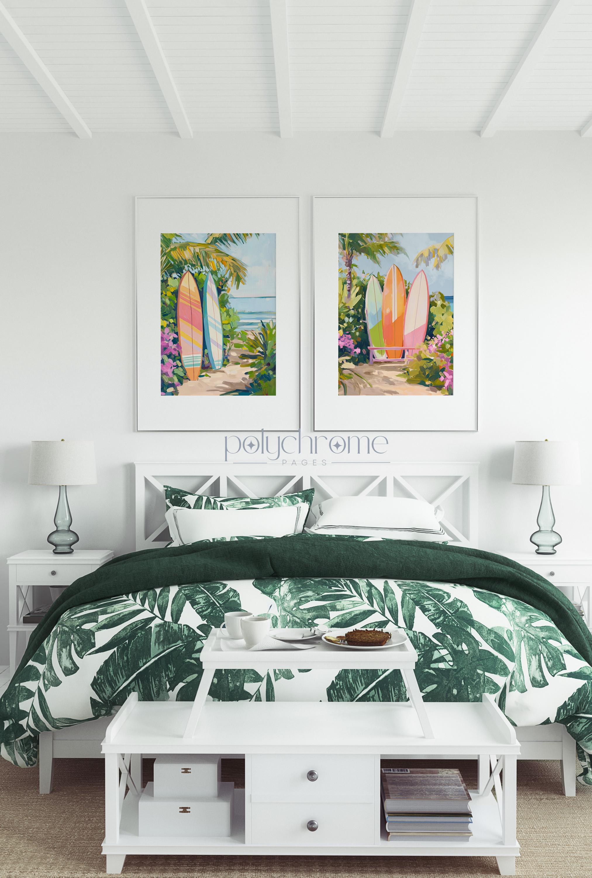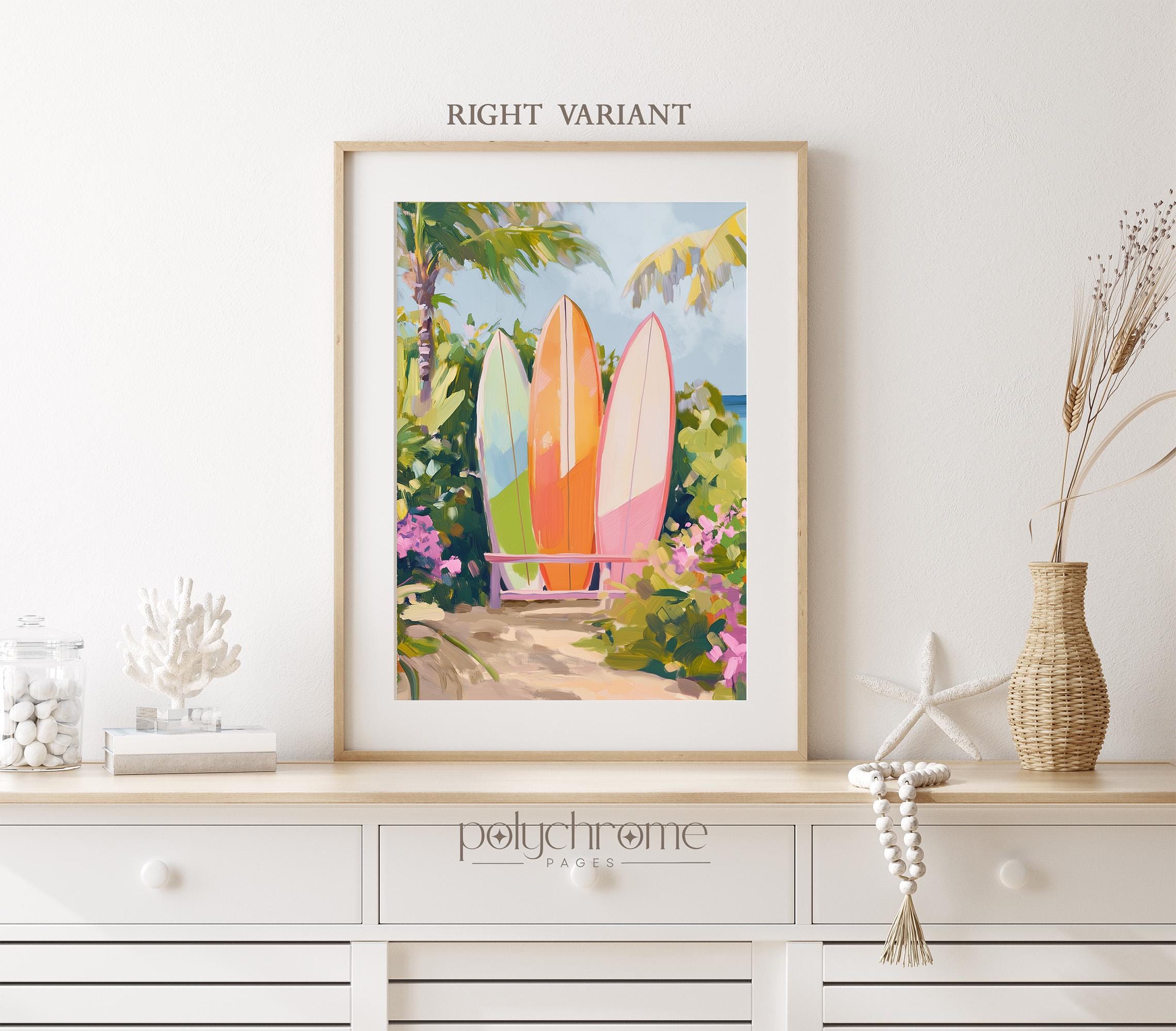 A vibrant beach scene featuring surfboards in warm orange and pink tones, set against a tropical backdrop that captures the laid-back spirit of Hawaiian surf culture. The bright, cheerful colour palette makes this piece a natural fit for pool bathrooms, coastal entryways, or any space that could use a dose of sunshine. Ideal for surf enthusiasts, lovers of tropical decor, or anyone looking to bring a bit of island warmth into their home.