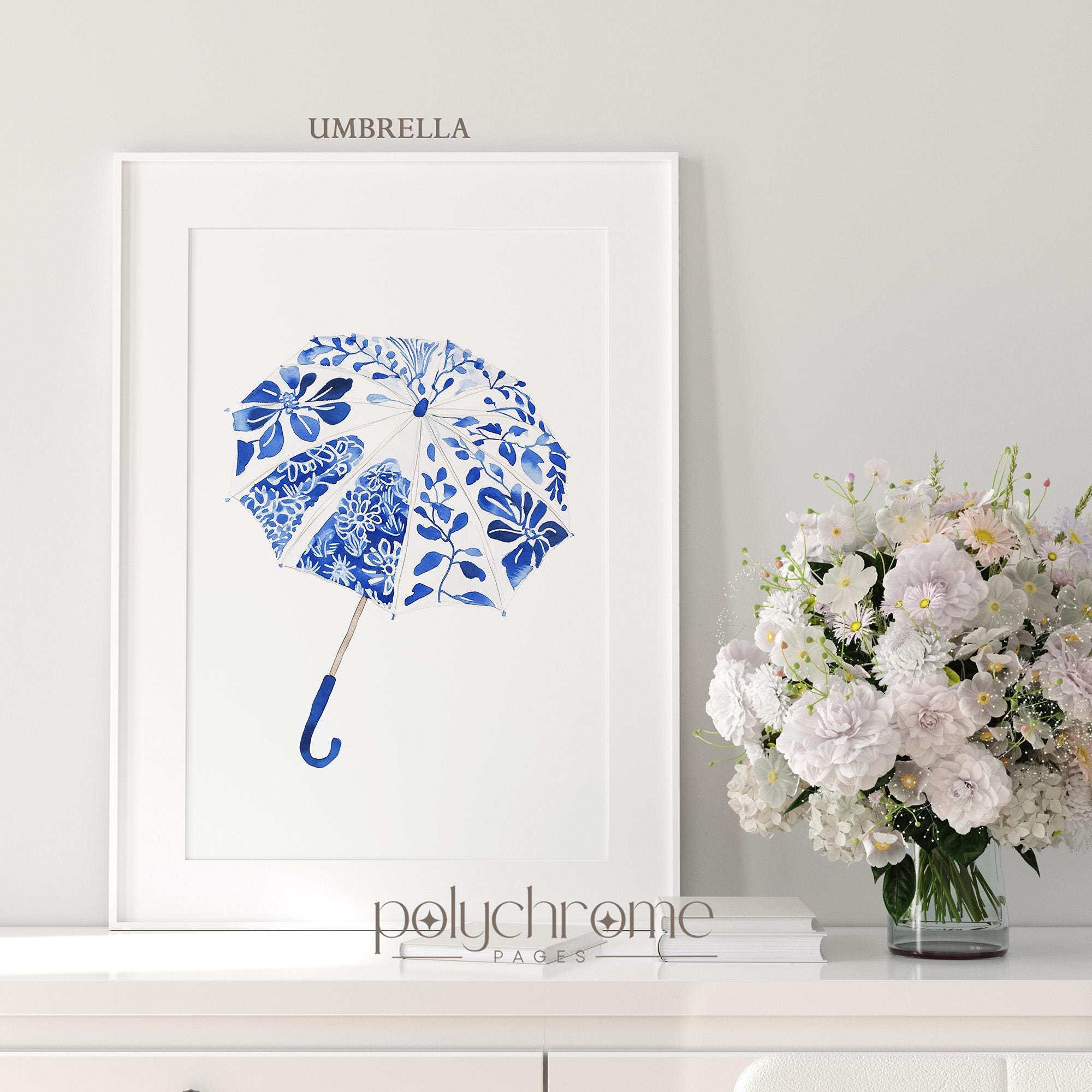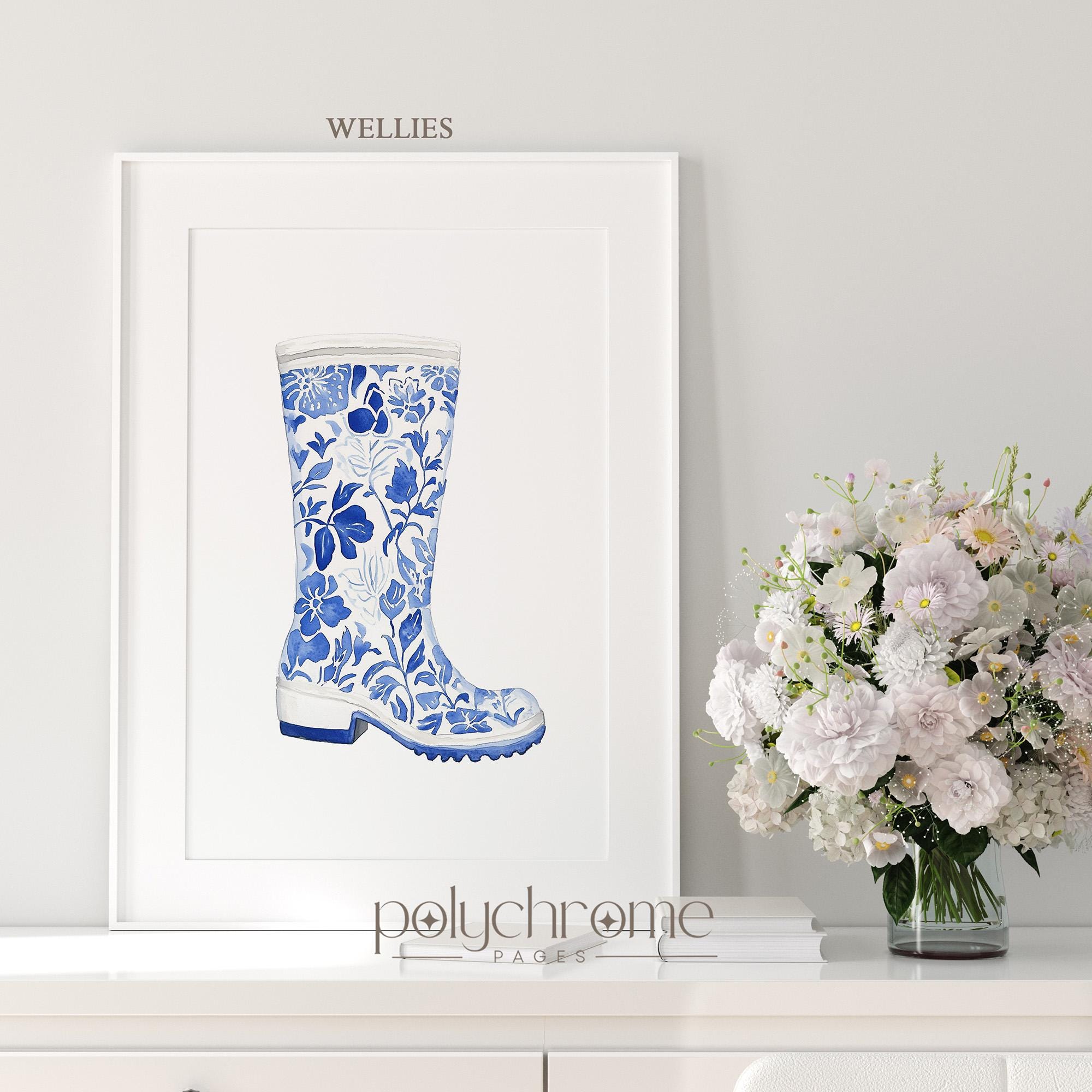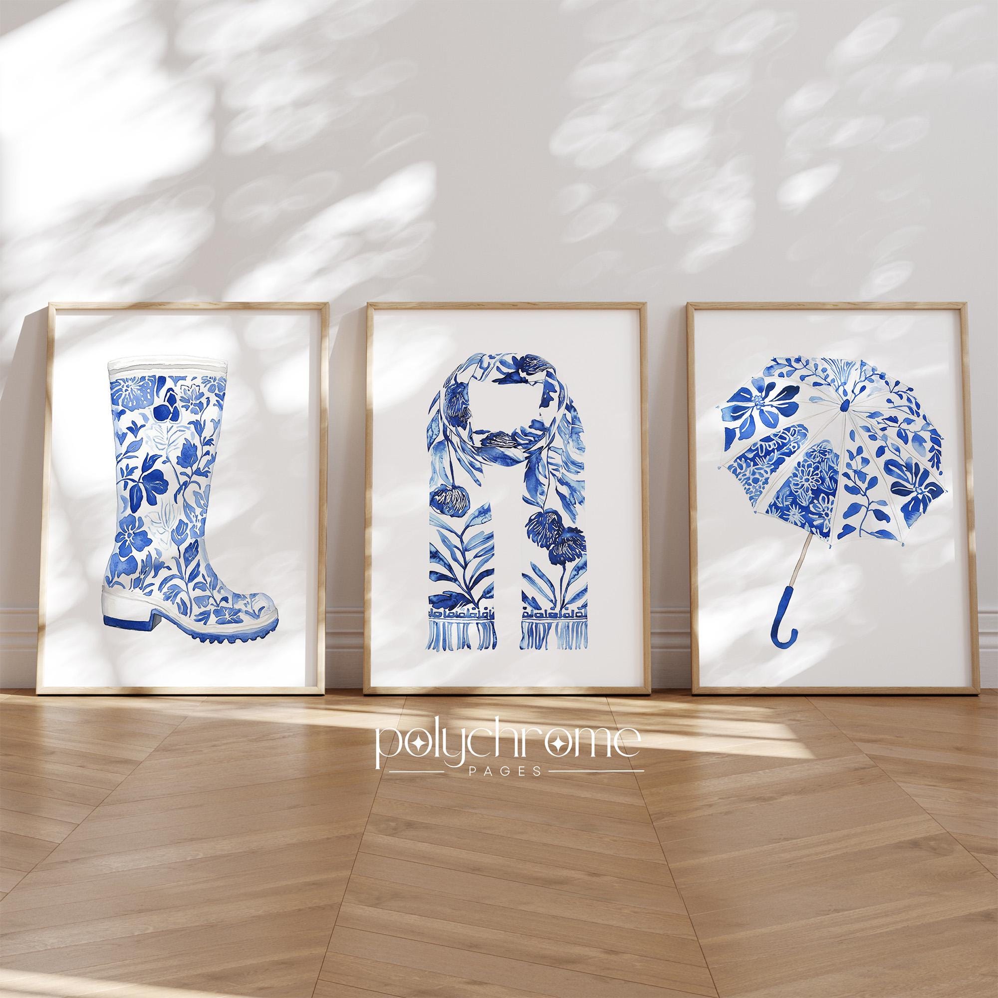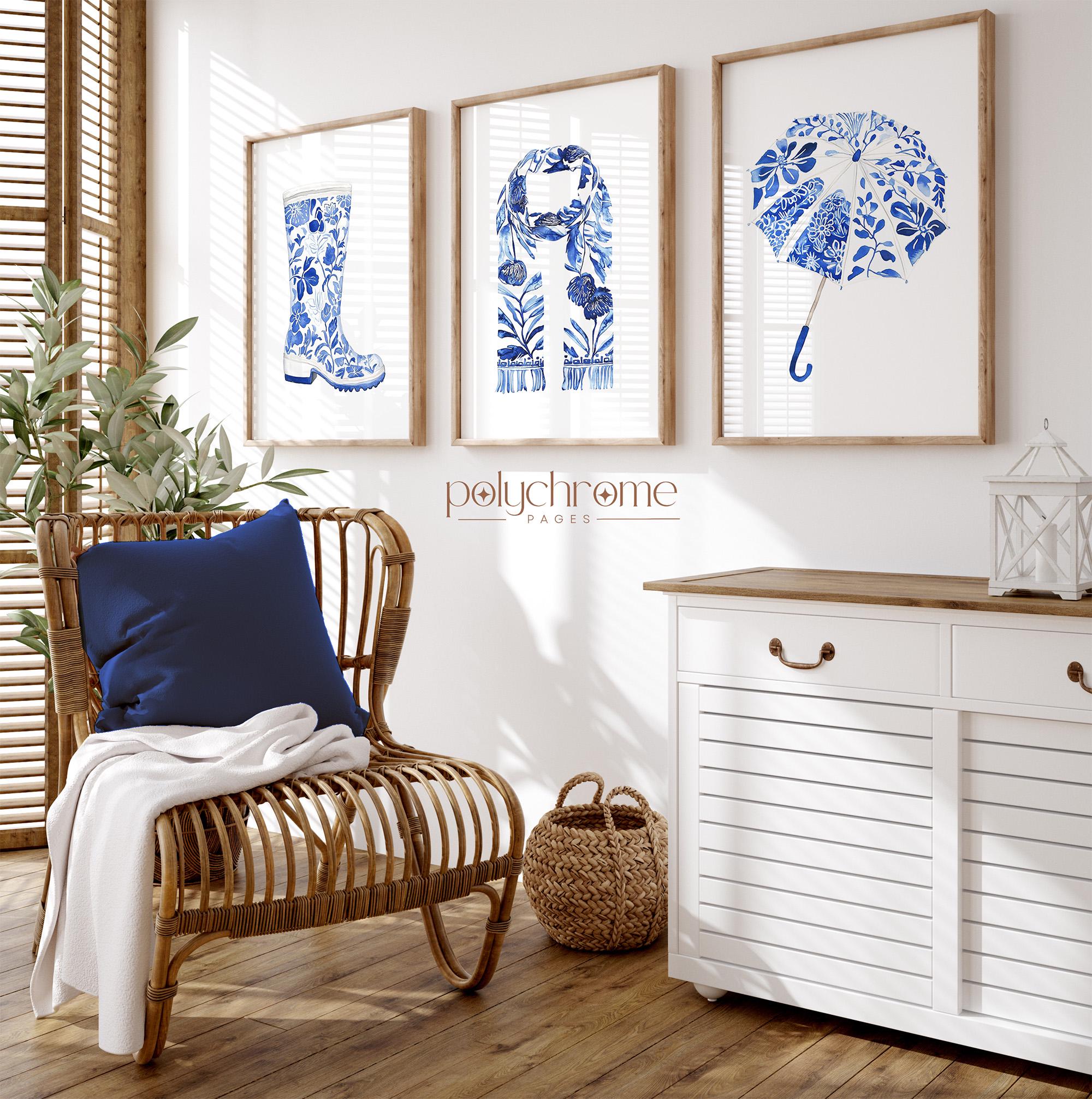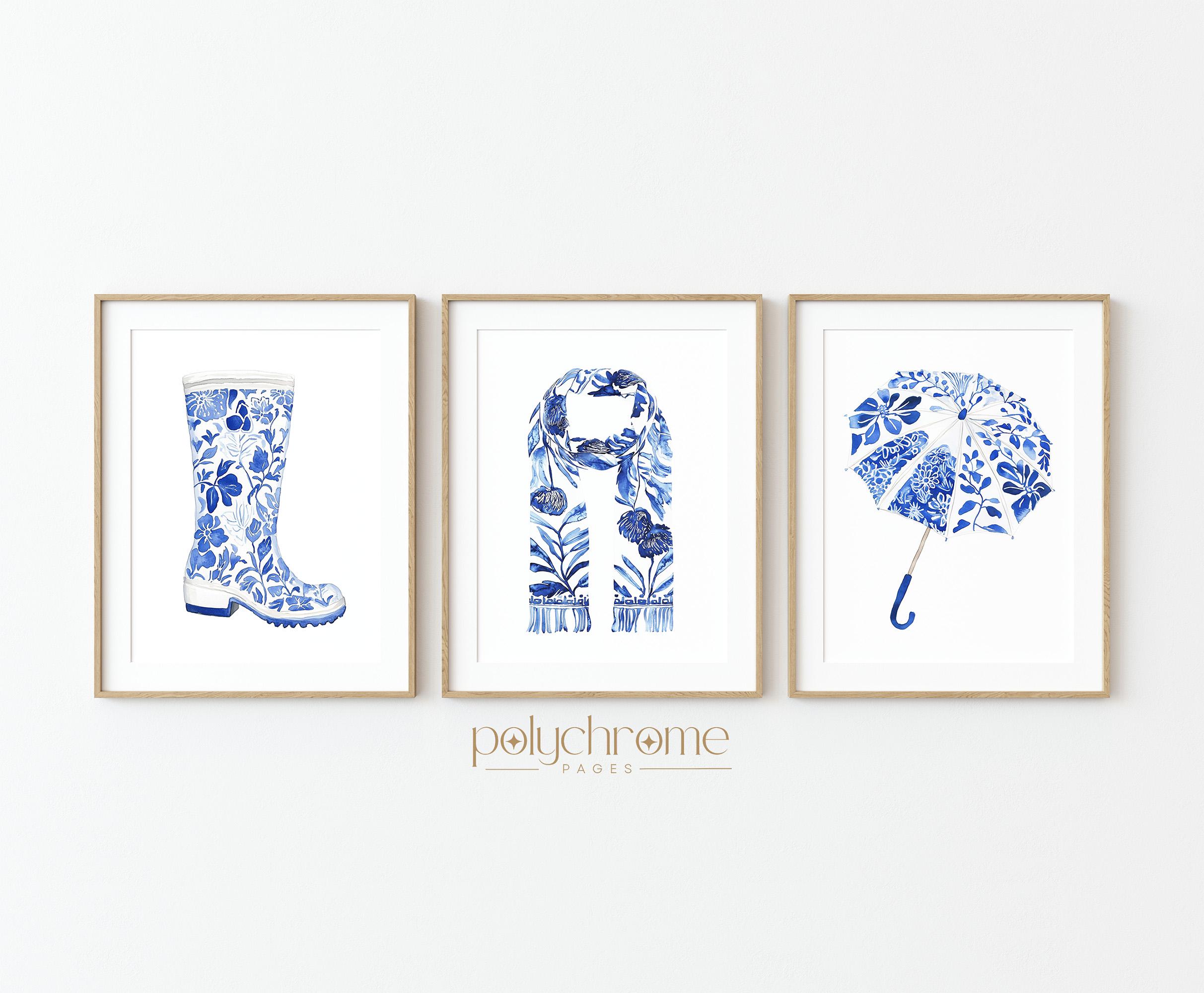 This charming set consists of classic autumn rainwear essentials—wellington boots, a cozy scarf, and an umbrella—painted in elegant blue and white chinoiserie style. The delicate patterns and soft tones bring a touch of Hamptons sophistication to mudrooms, entryways, or hallways. Perfect for anyone who loves cottagecore aesthetics or wants to celebrate the cozy side of fall with timeless, elegant artwork.