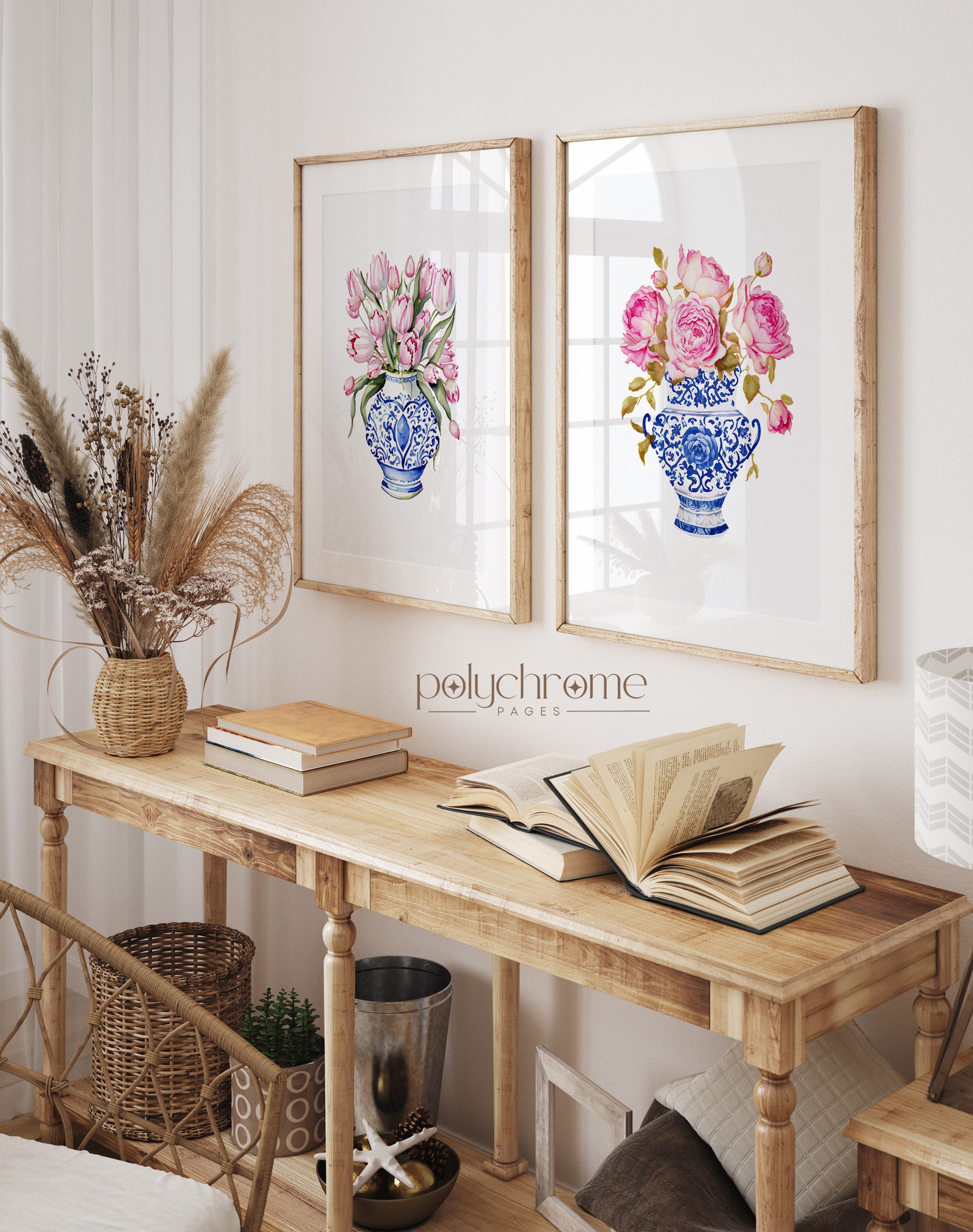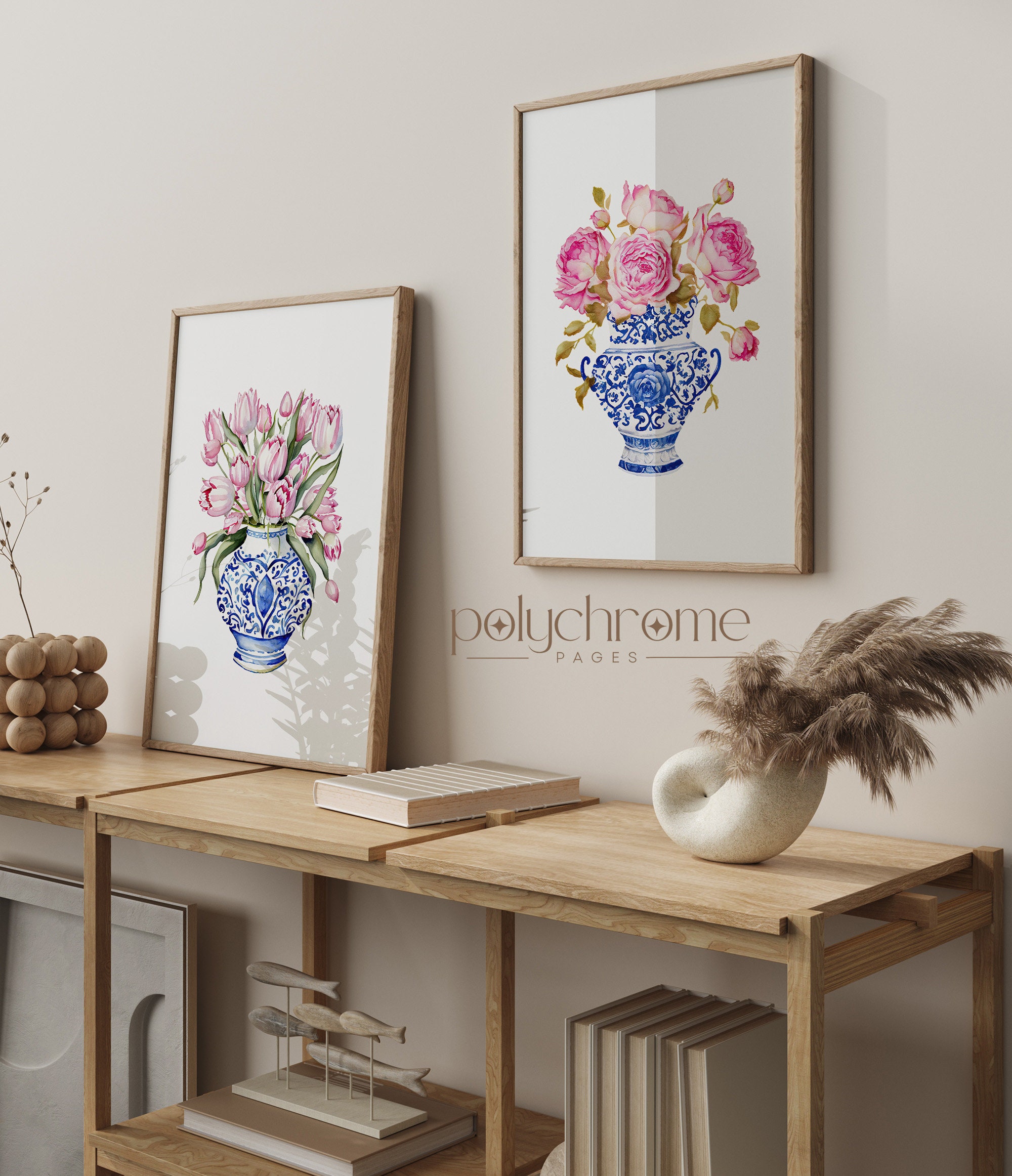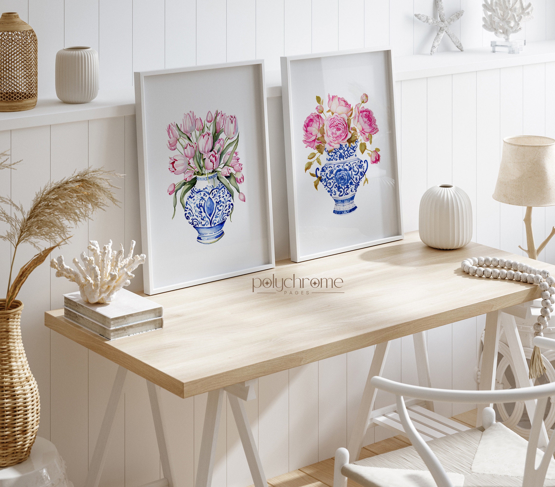 A lovely trio of pink roses and tulips arranged in classic blue and white chinoiserie vases, blending traditional elegance with a fresh, feminine feel. The soft pink blooms against the iconic blue china pattern create a timeless look that works beautifully in bedrooms, bathrooms, or living spaces. Perfect for anyone who loves Hamptons style, cottagecore aesthetics, or simply appreciates the charm of floral art with a traditional twist.