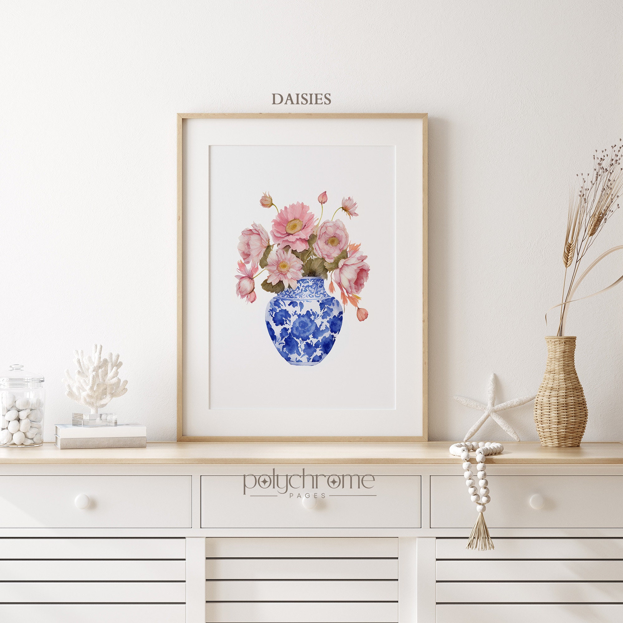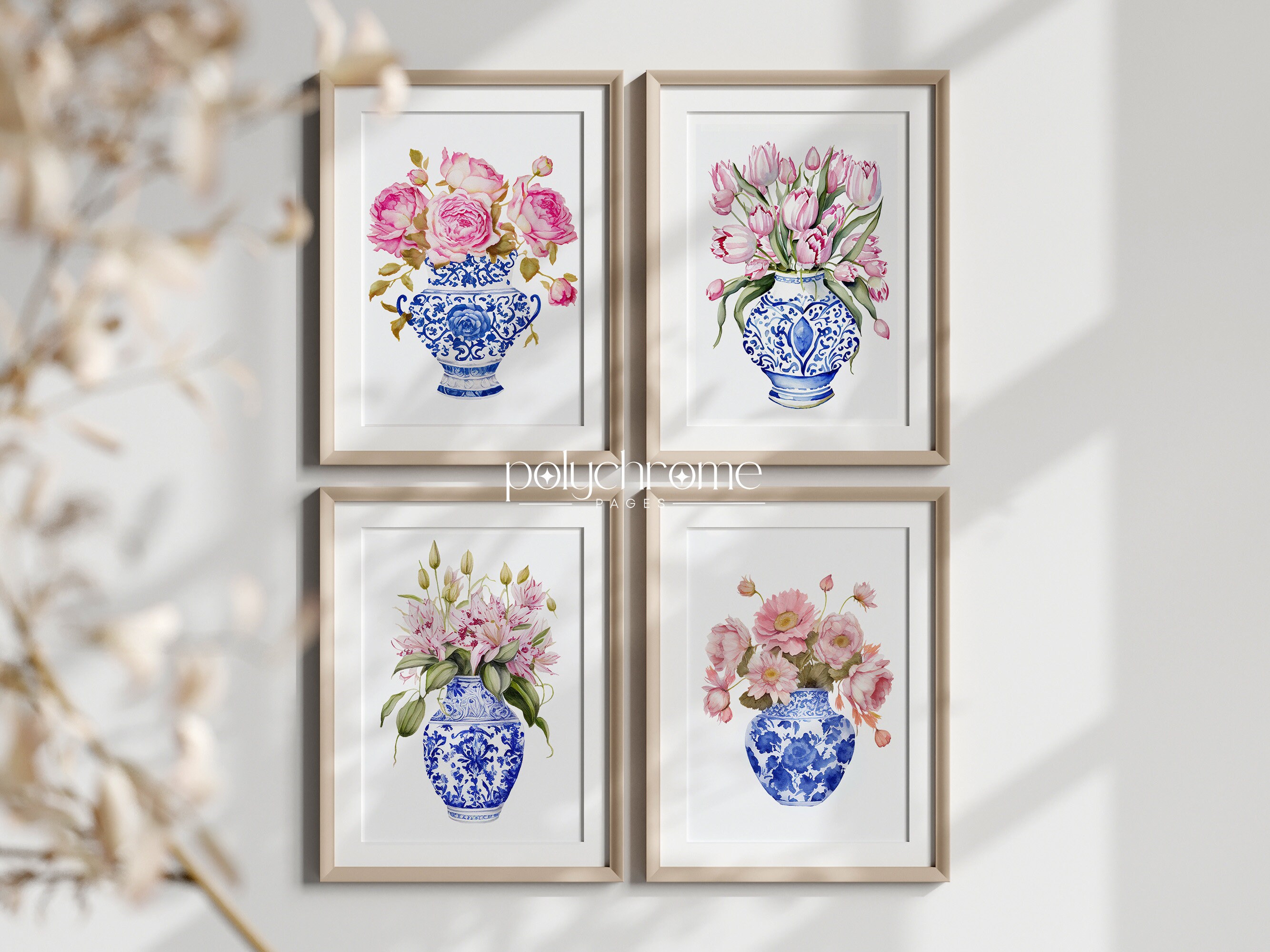This elegant set consists of lush pink bouquets of roses, tulips, canna lilies, and daisies arranged in classic blue and white chinoiserie vases. The soft pink blooms paired with traditional porcelain patterns create a timeless, feminine feel that works beautifully in master bedrooms, dining rooms, or living spaces. A lovely choice for anyone who appreciates Hamptons style, cottagecore aesthetics, or the charm of blue and white china.