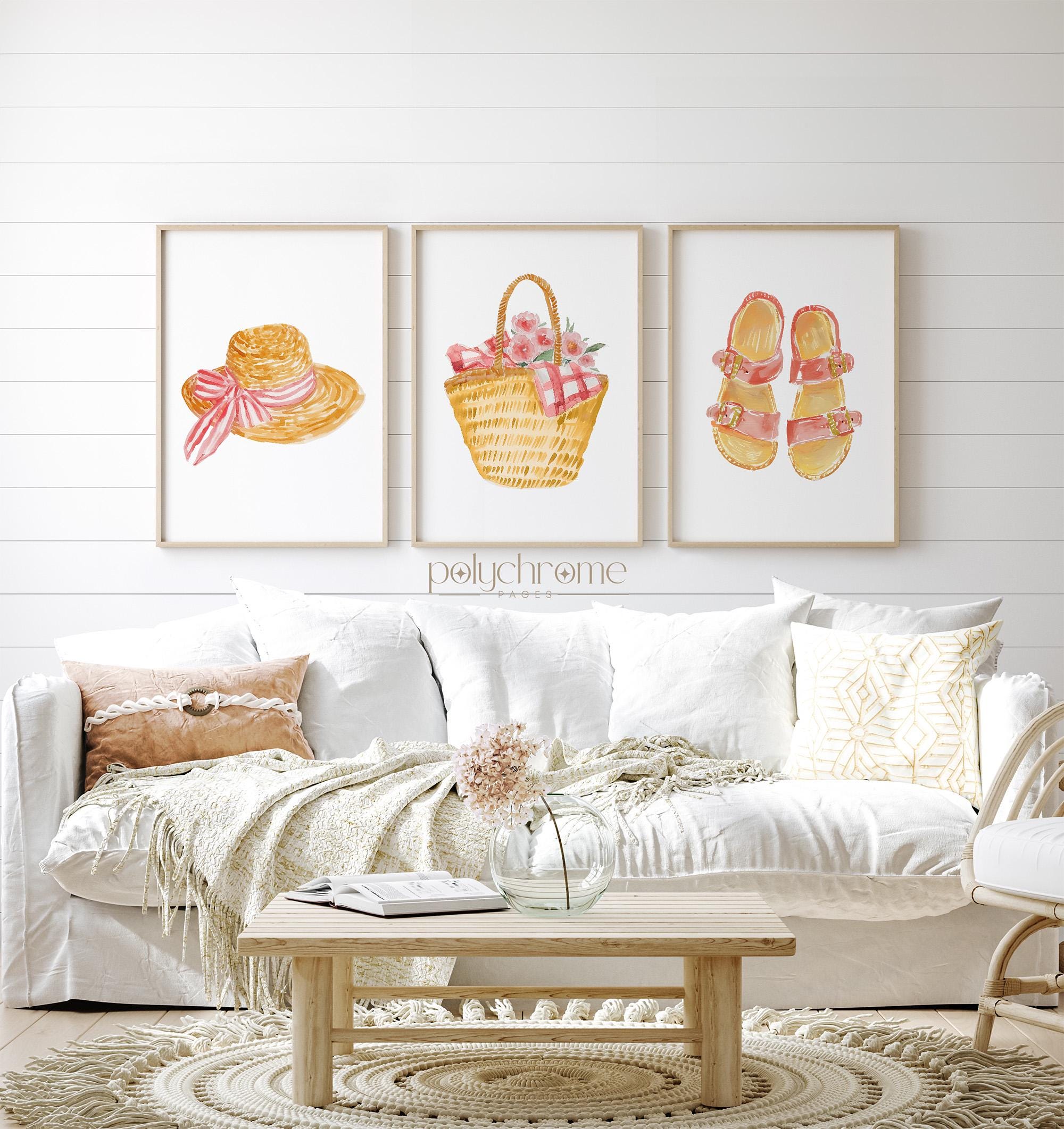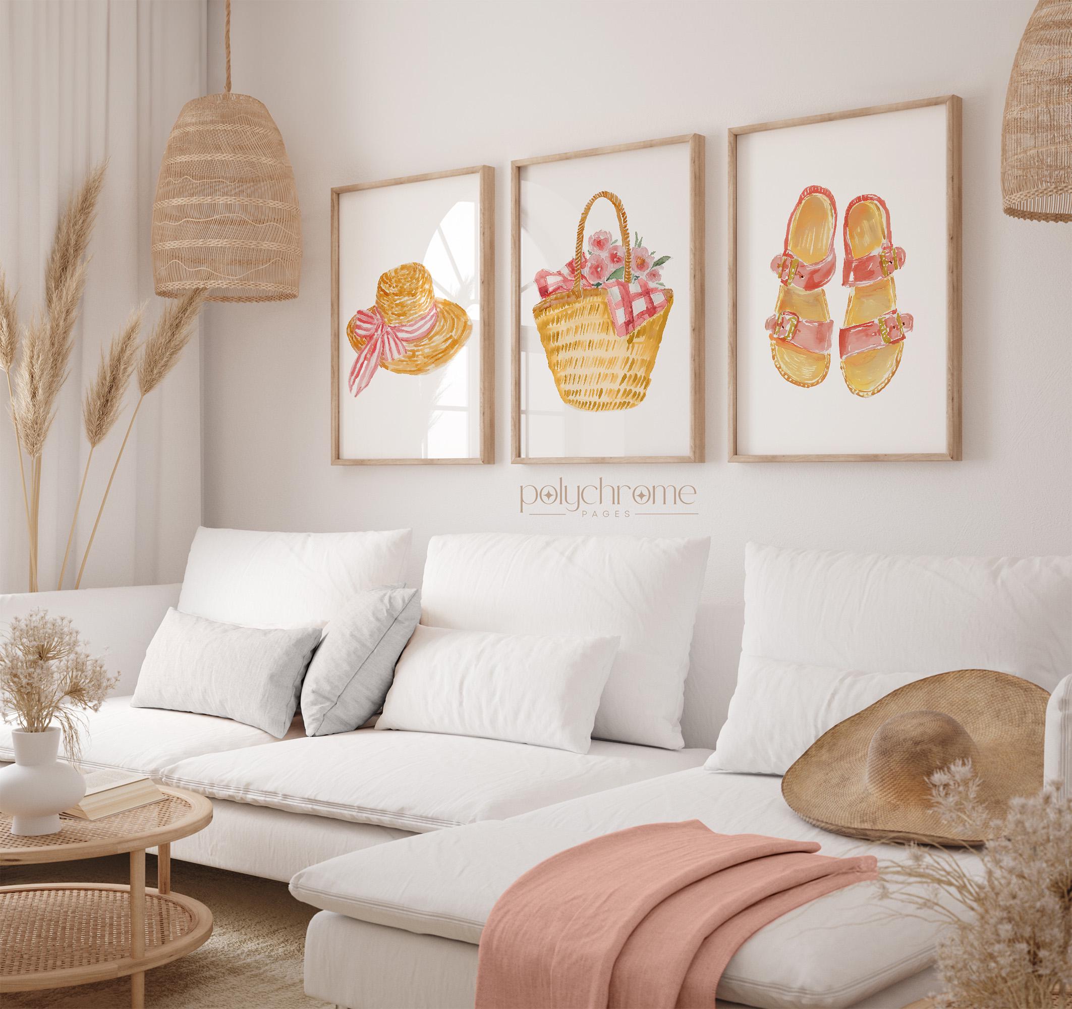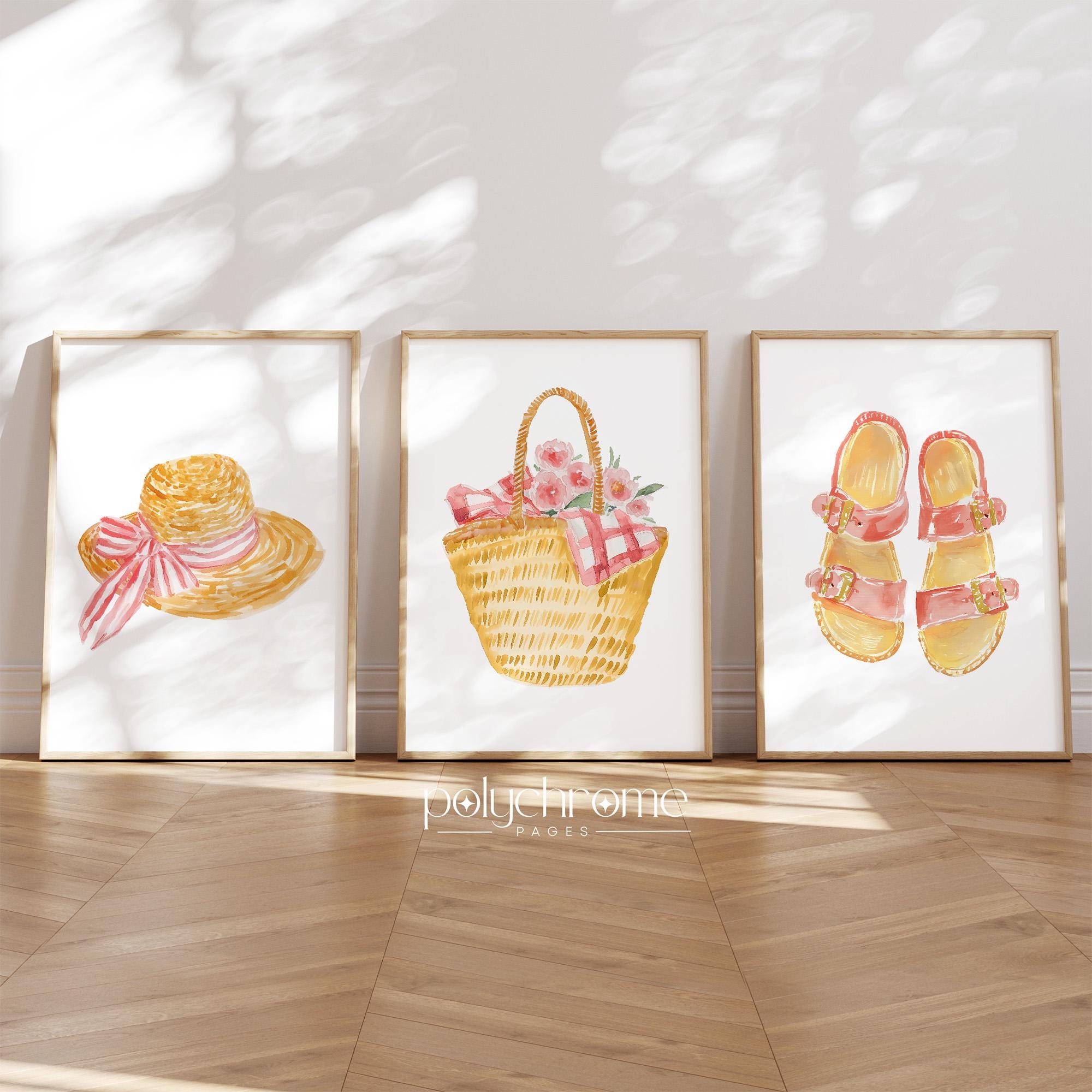 Bring summer to your walls with this set of three vacation-themed artworks featuring a straw hat with cute bow, picnic basket with flowers, and adorable sandals — perfect for your beach house, changing room, or vacation home. With their mix of pastel reds and coral pink tones, these playful yet stylish designs add a fresh touch to any space.