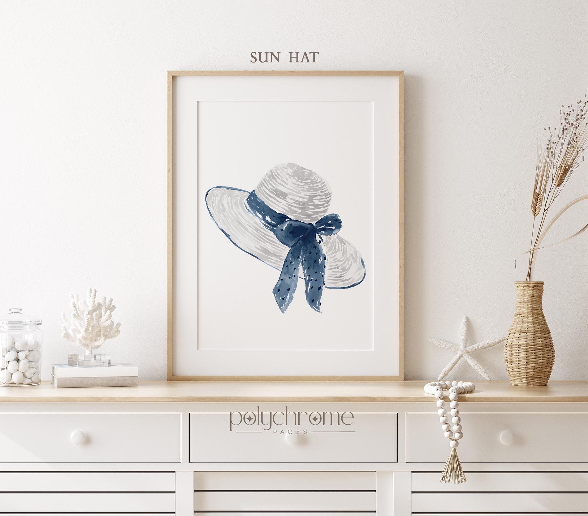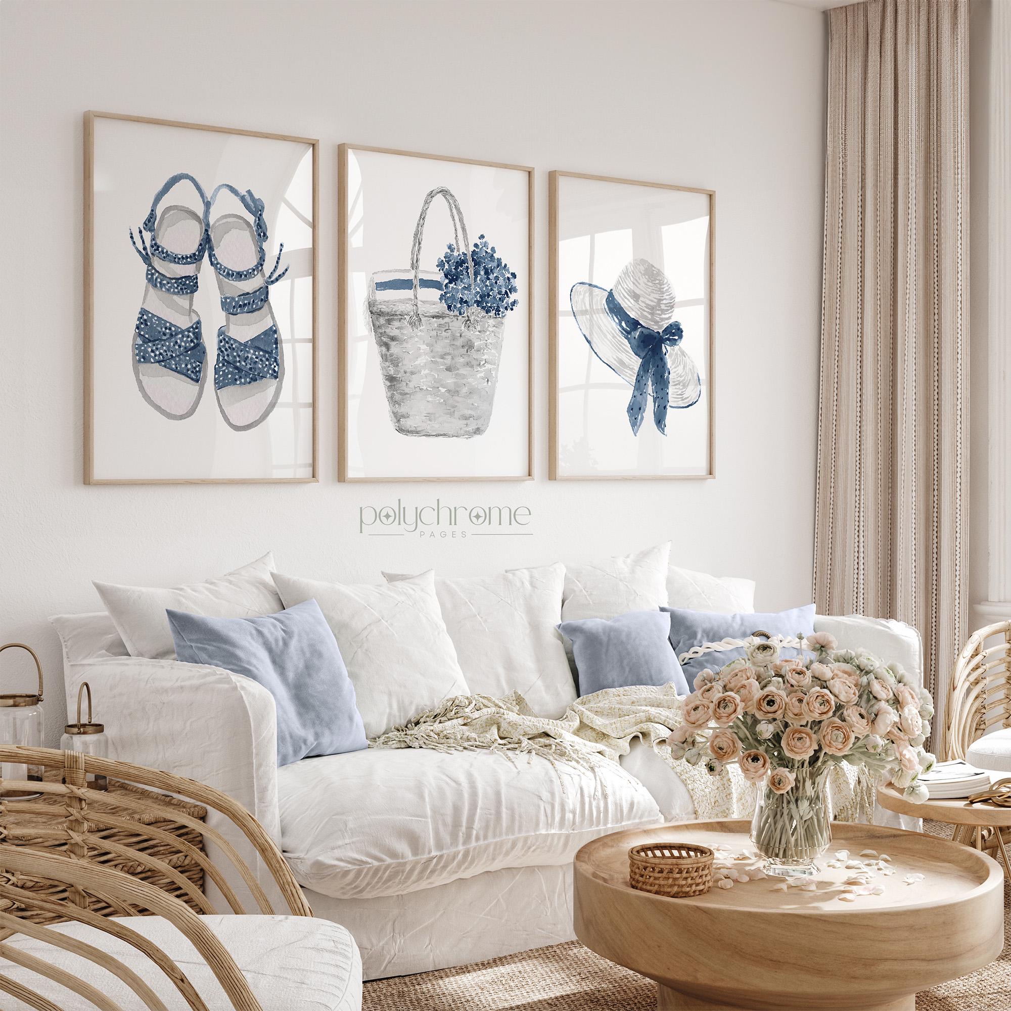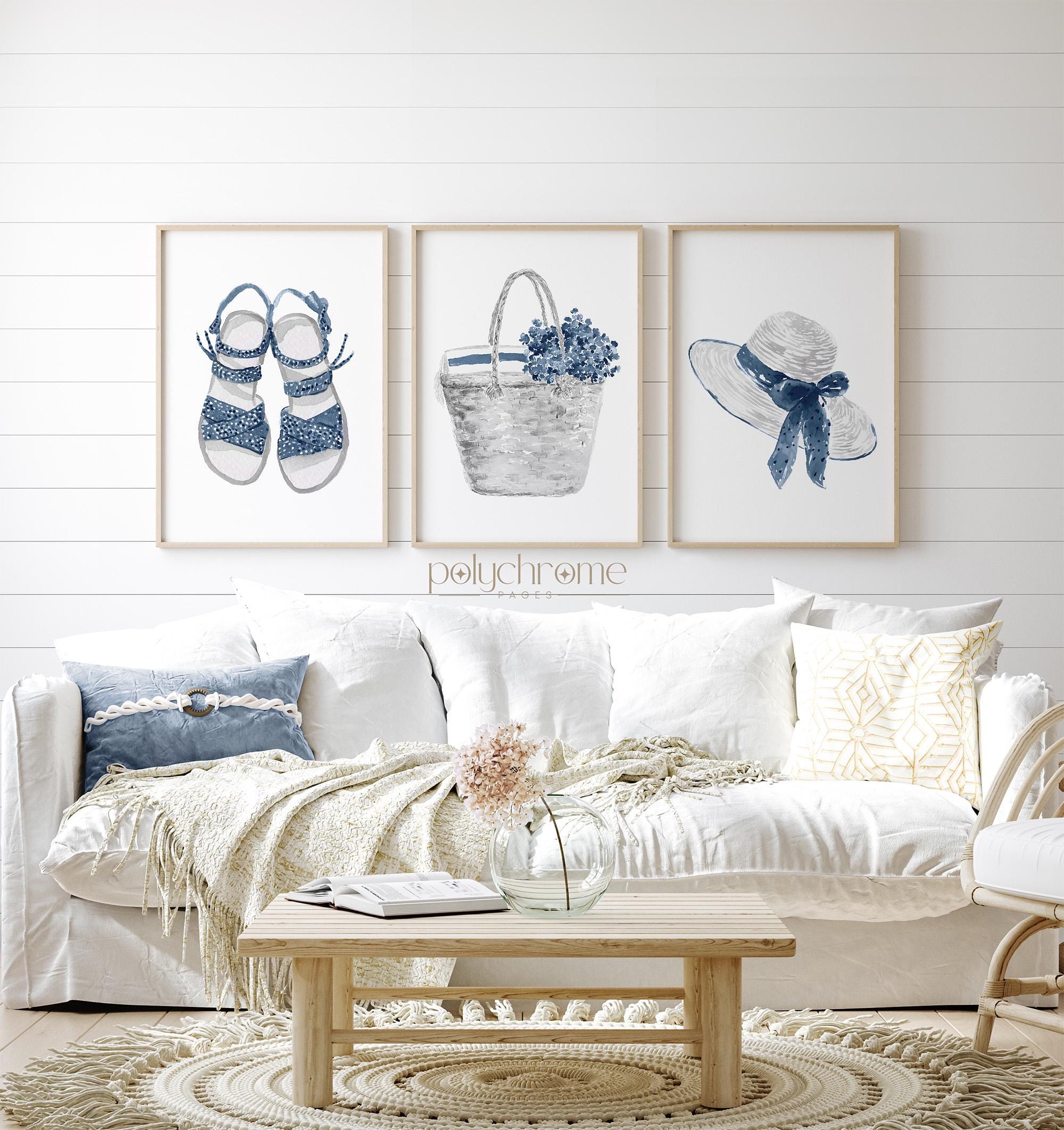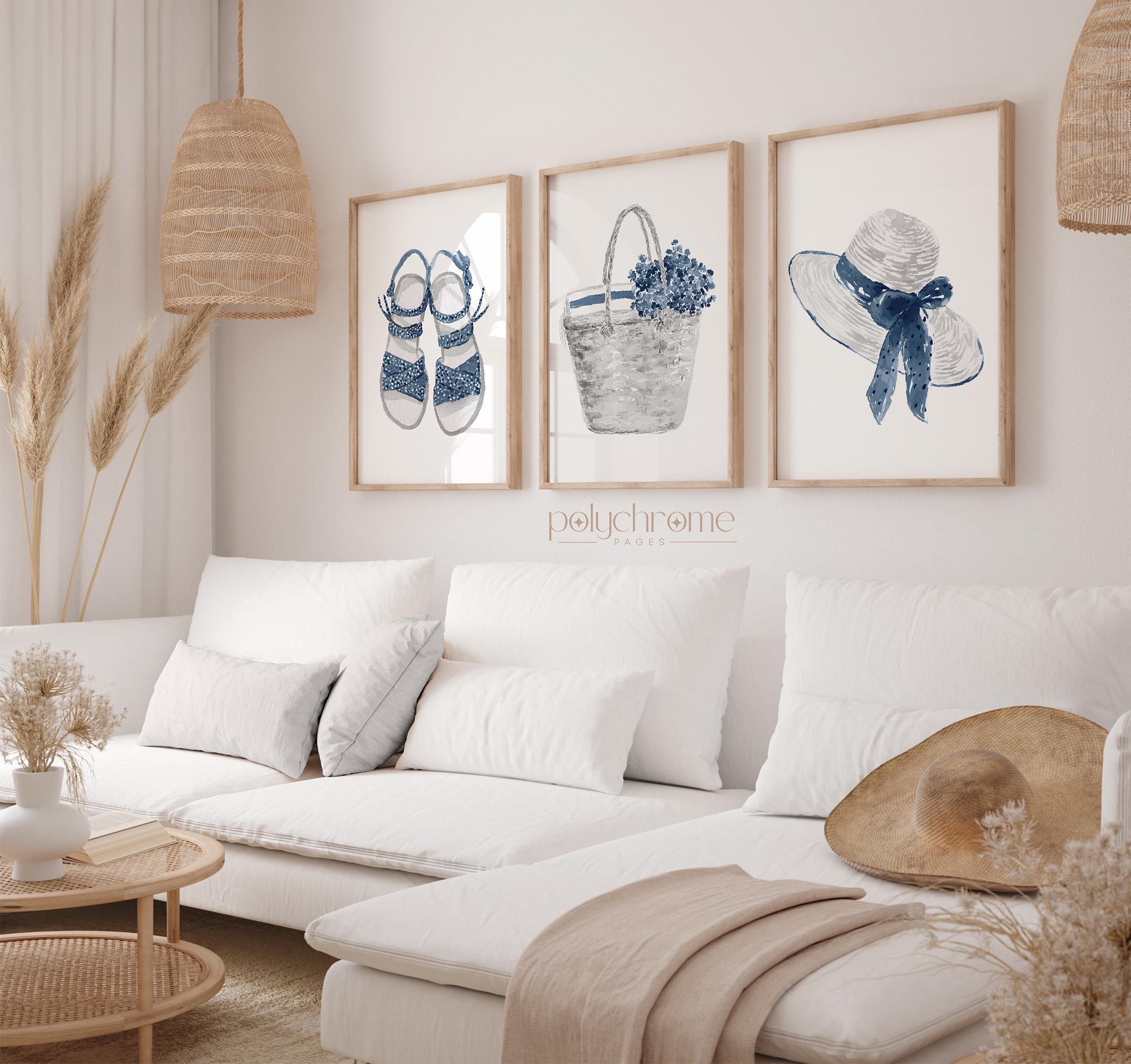 Bring summer to your walls with this set of three vacation-themed artworks featuring a sun hat with cute bow, picnic wicker basket with flowers, and adorable sandals — perfect for your beach house, changing room, or vacation home. With their mix of deep shades of navy blue these playful yet stylish designs add a fresh touch to any space.