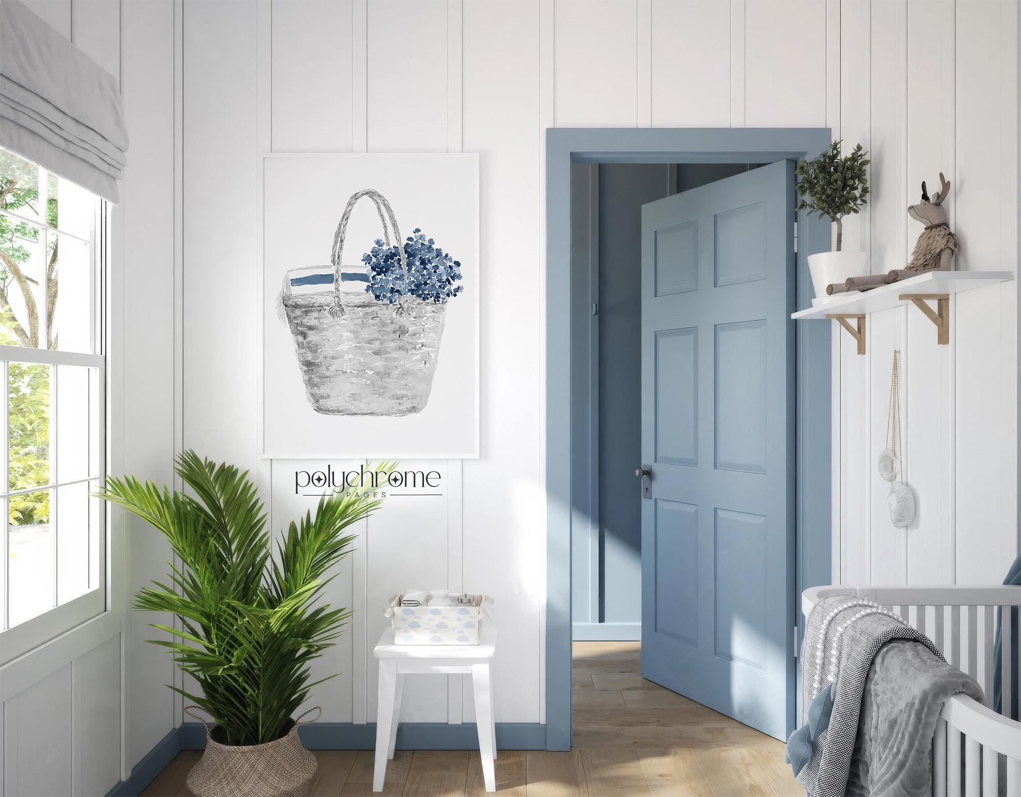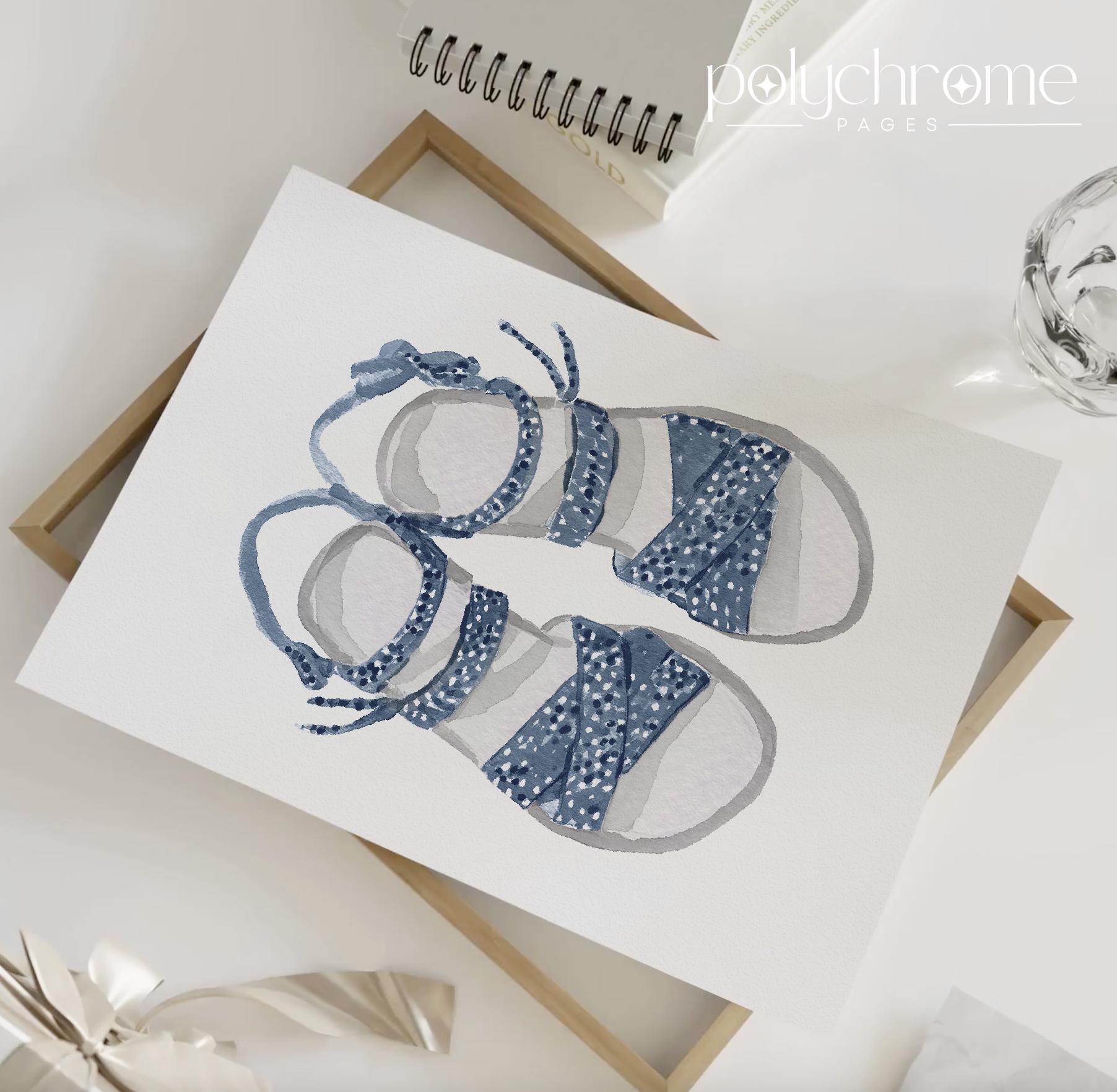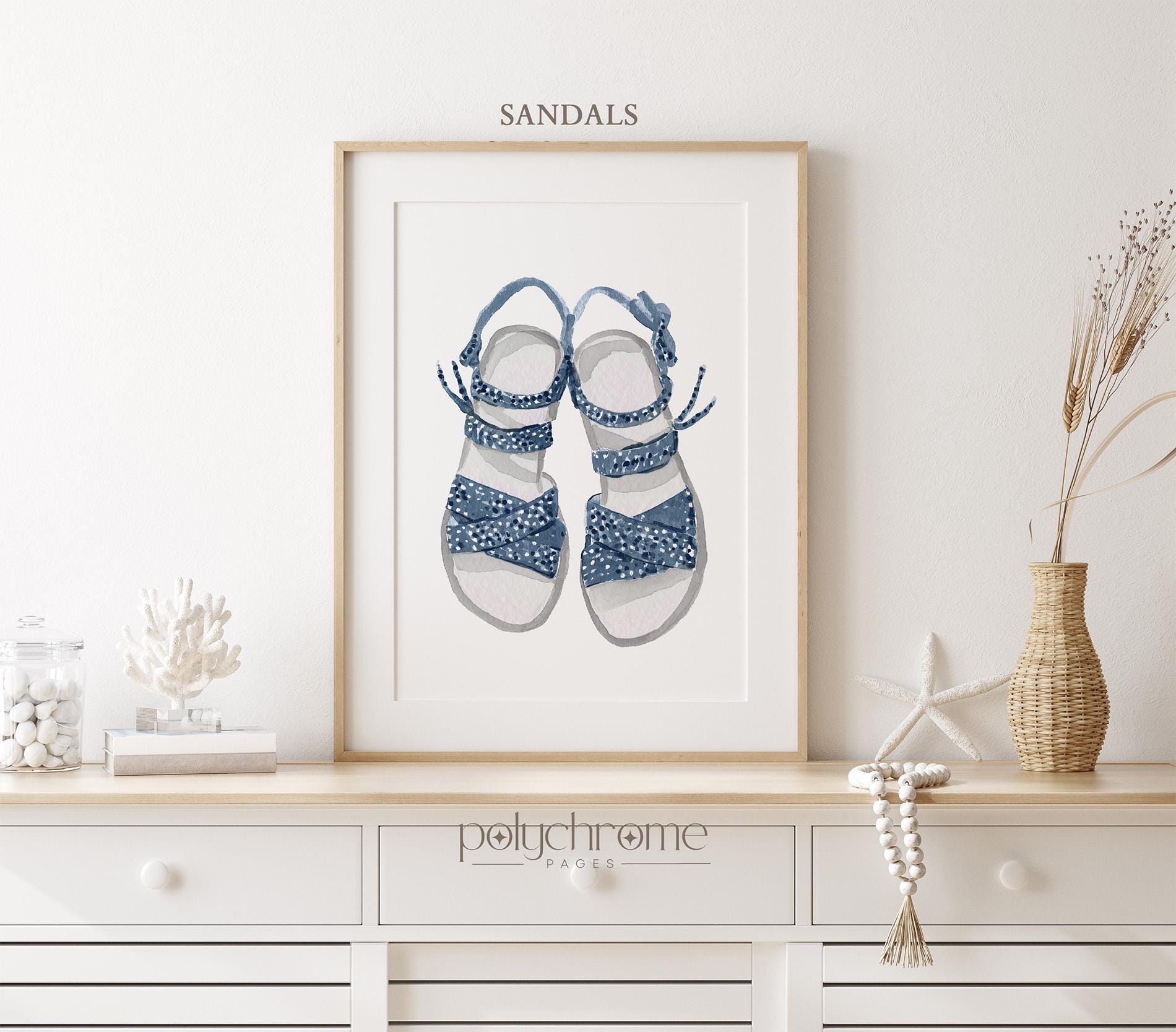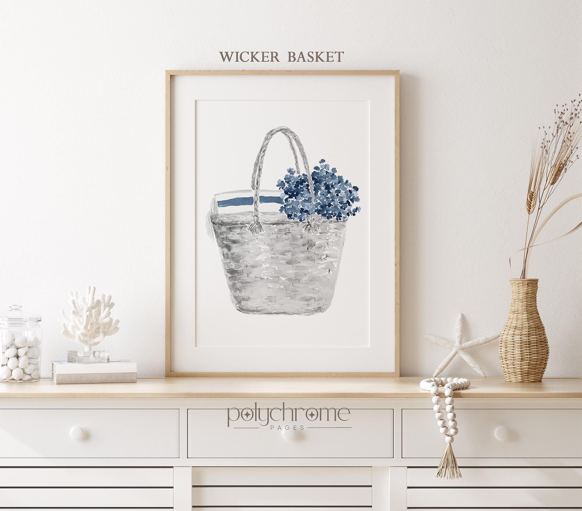 Bring summer to your walls with this set of three vacation-themed artworks featuring a sun hat with cute bow, picnic wicker basket with flowers, and adorable sandals — perfect for your beach house, changing room, or vacation home. With their mix of deep shades of navy blue these playful yet stylish designs add a fresh touch to any space.