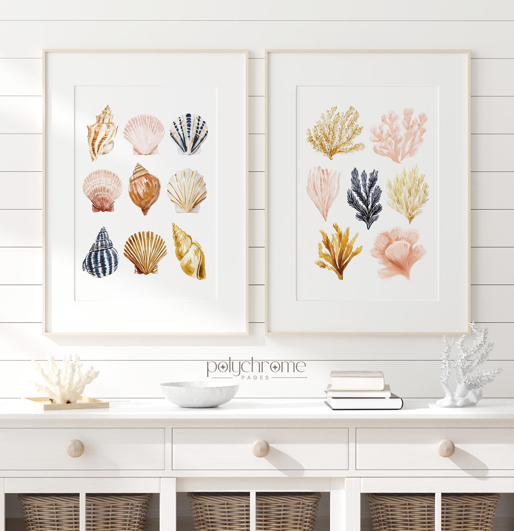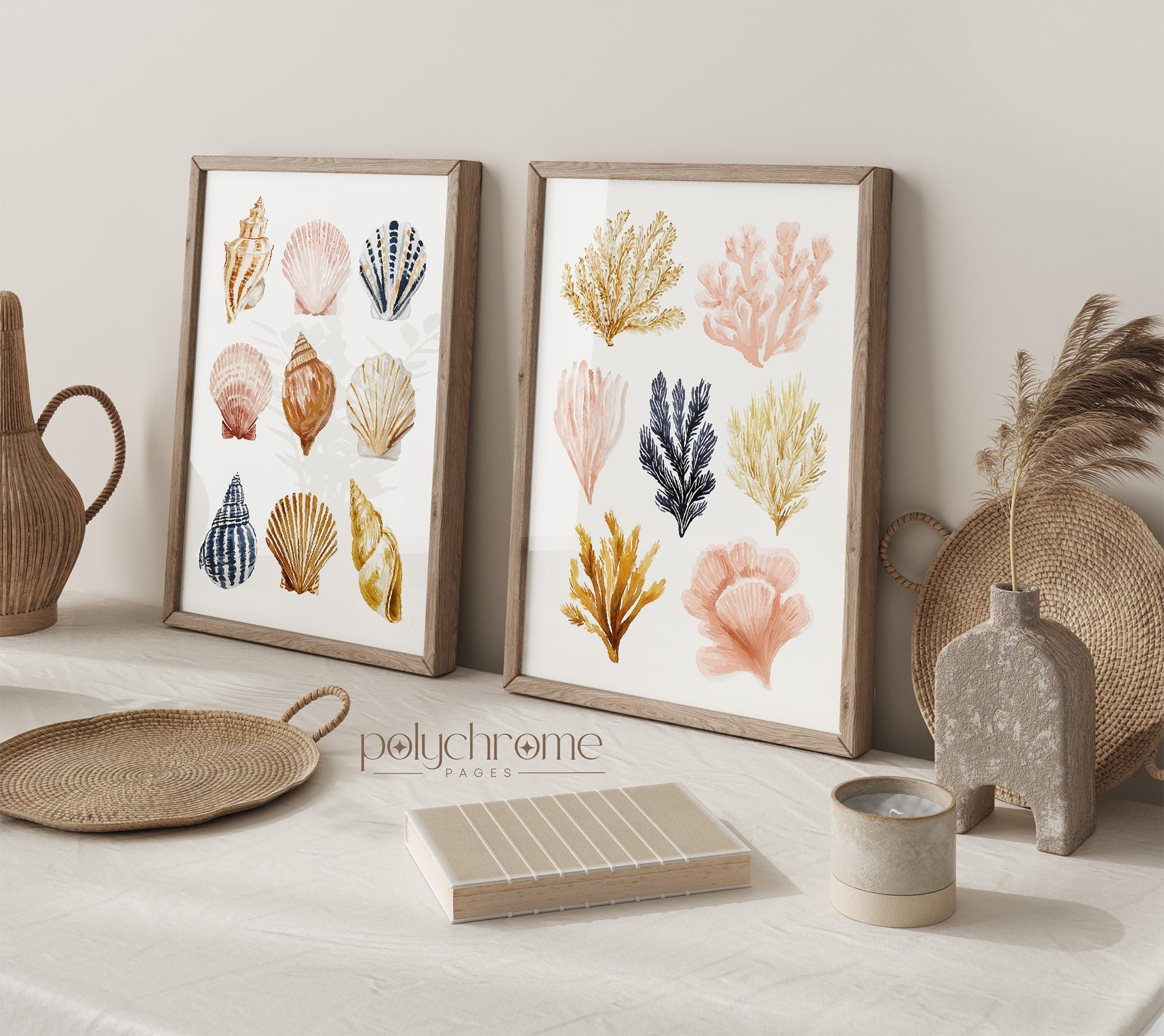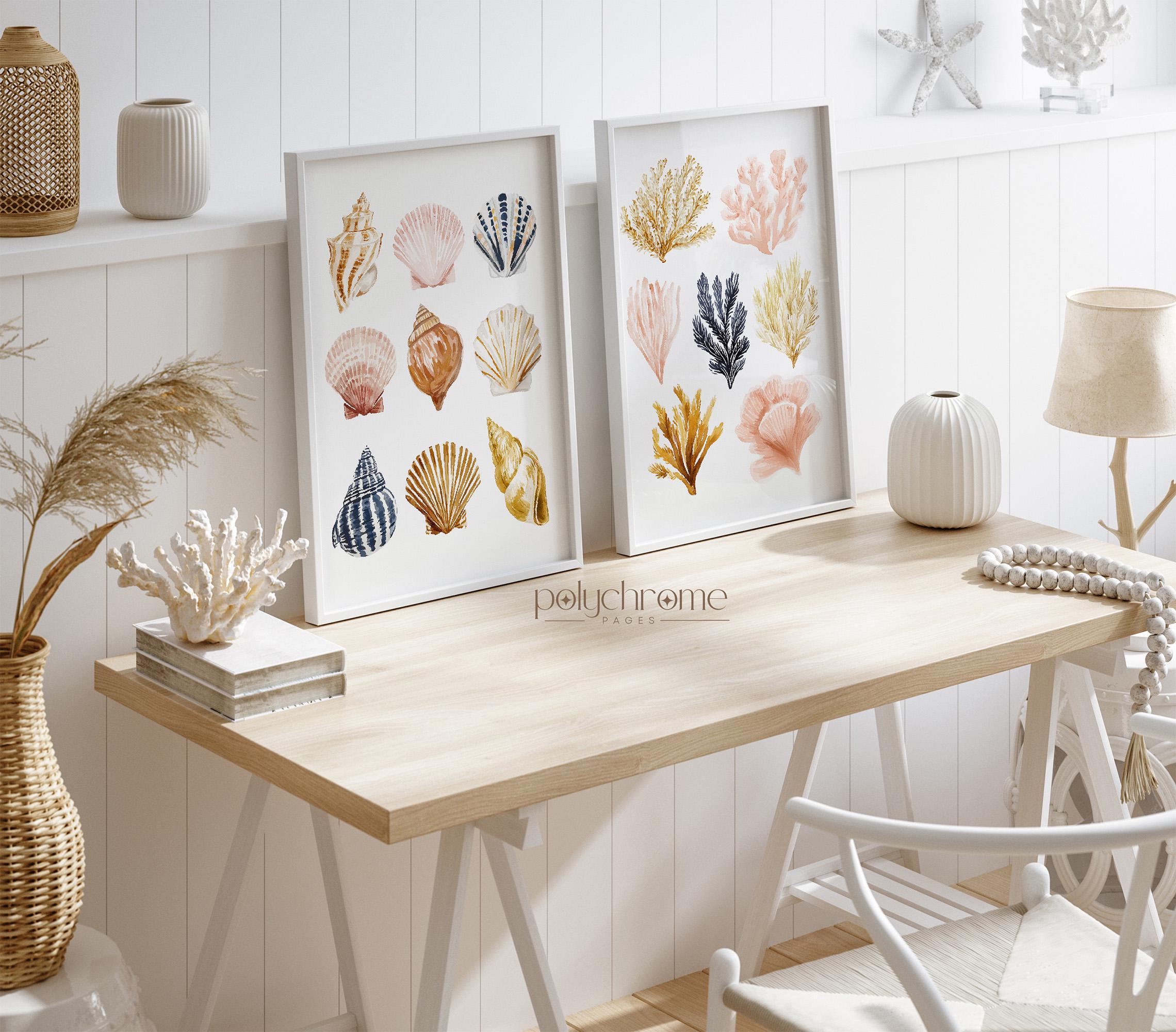 Cute collection of painted seashells and seaweeds in coastal shades of brown, beige pink and yellow, ideal for adding a chill summer vibe to your space. Great for beach houses, lake cabins, or vacation-inspired homes. This piece is a fun way to introduce coastal style to your interior.