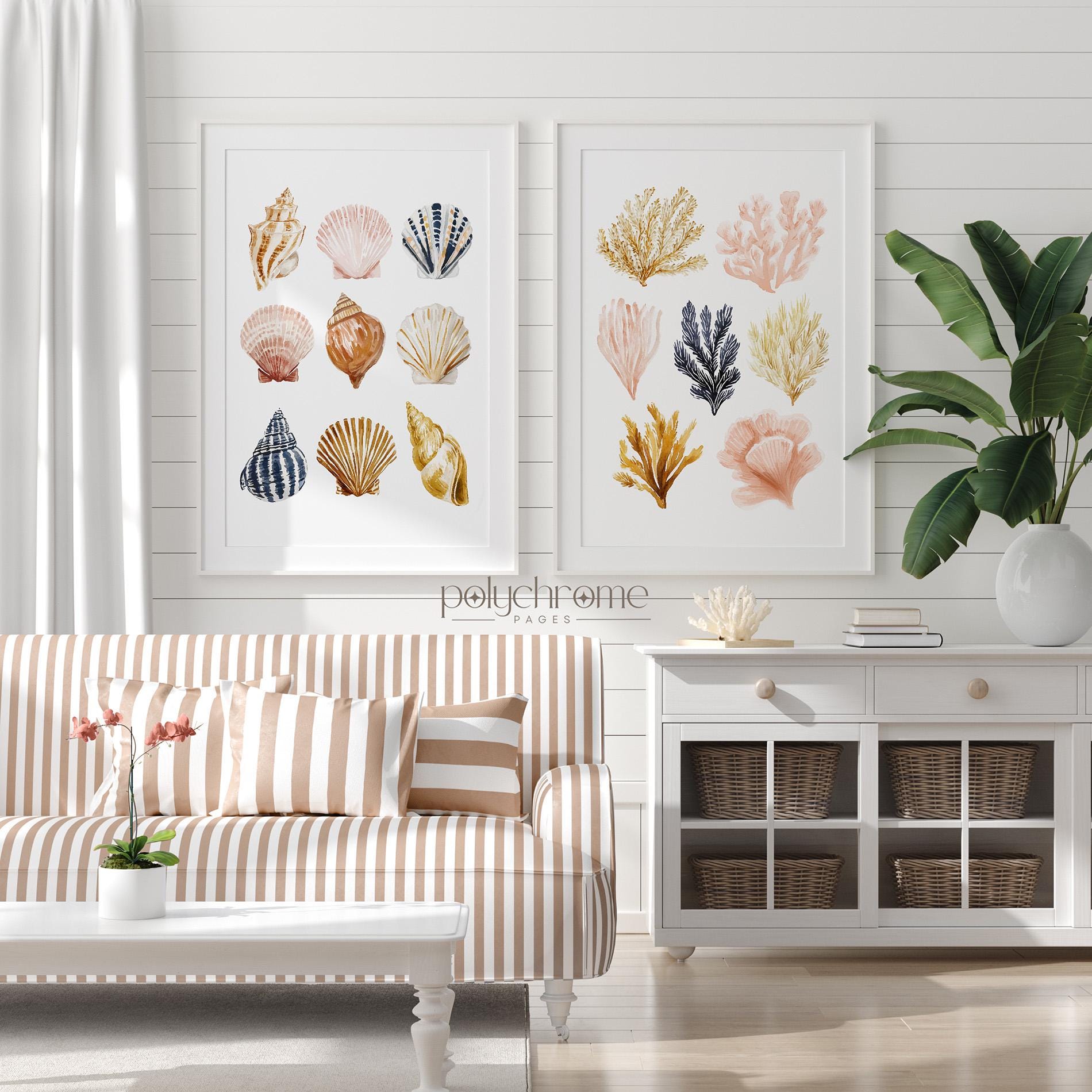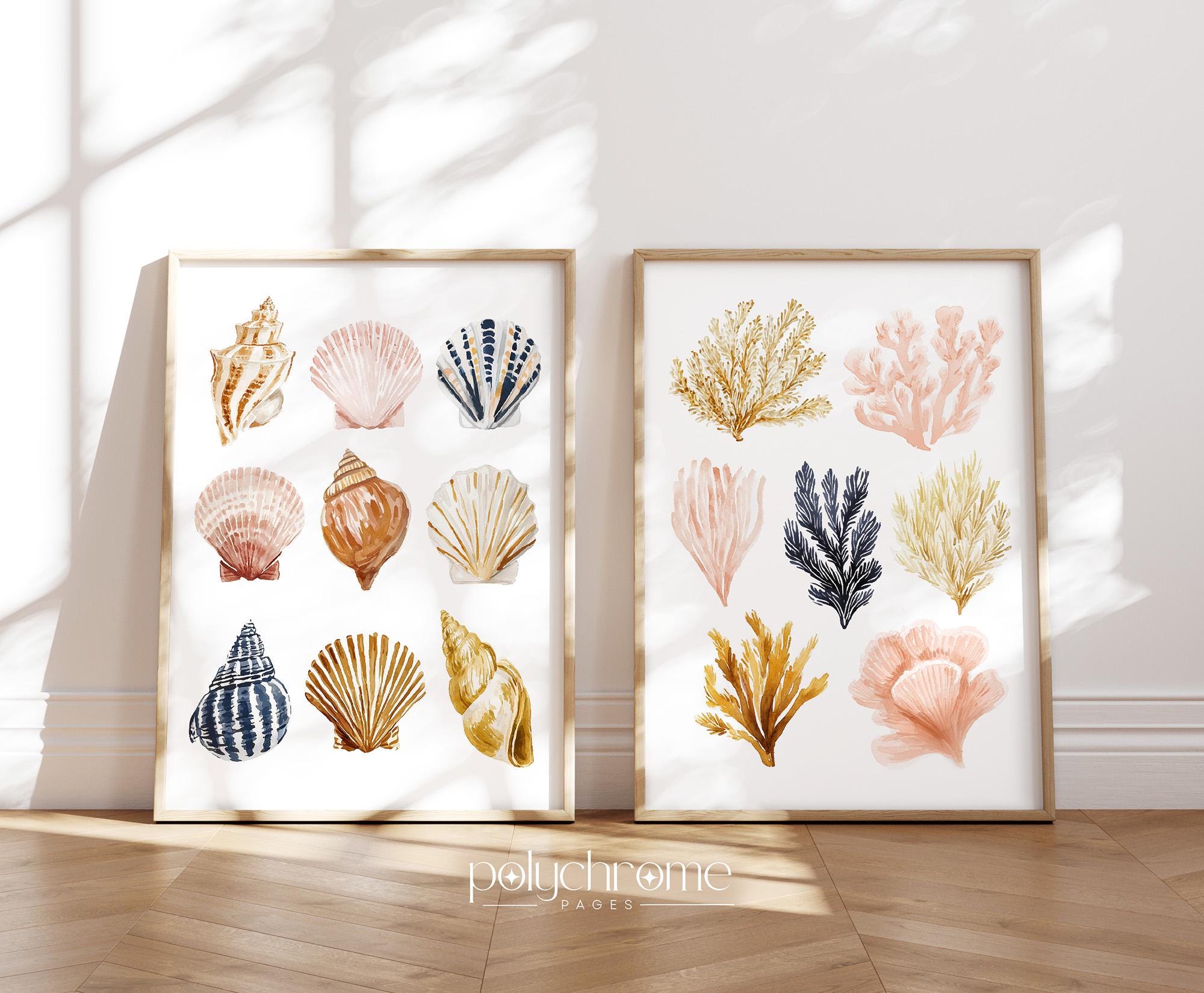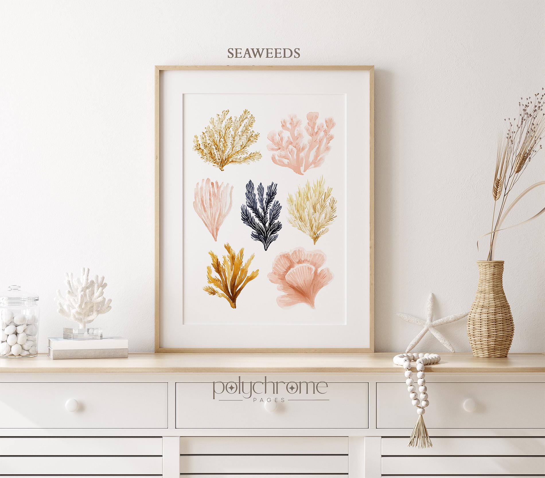 Cute collection of painted seashells and seaweeds in coastal shades of brown, beige pink and yellow, ideal for adding a chill summer vibe to your space. Great for beach houses, lake cabins, or vacation-inspired homes. This piece is a fun way to introduce coastal style to your interior.