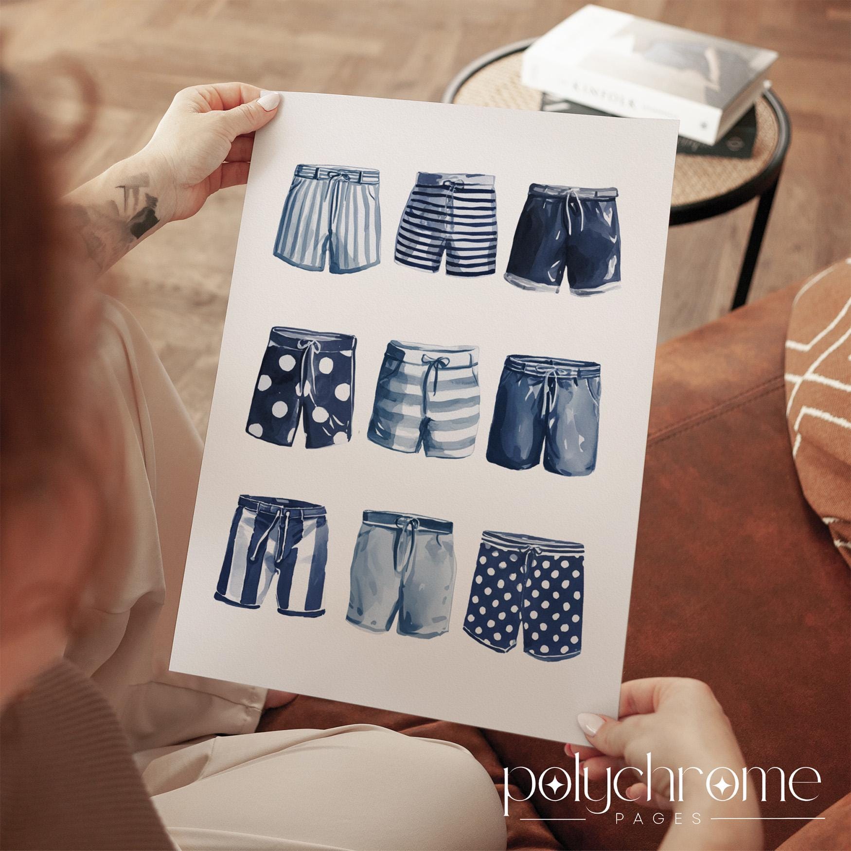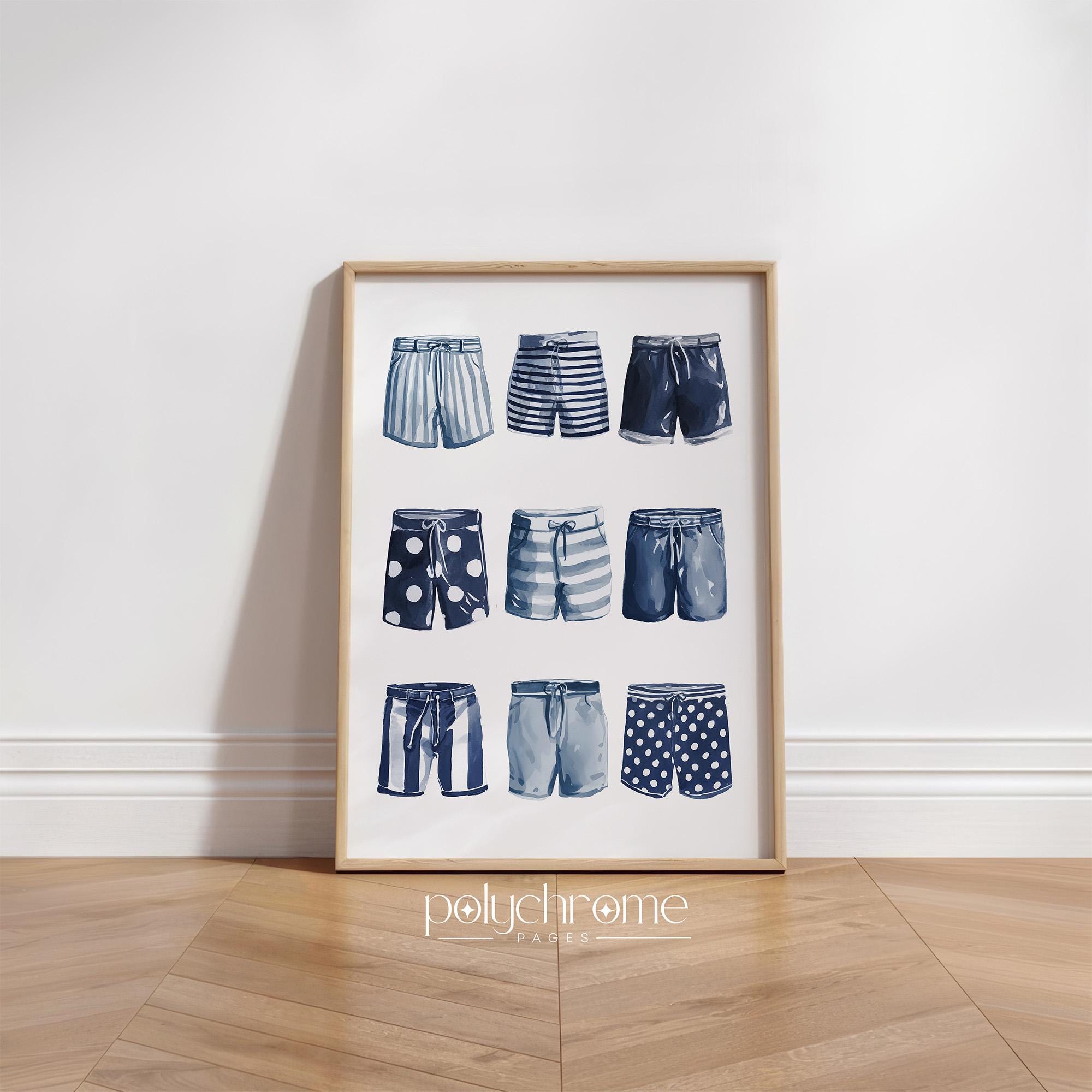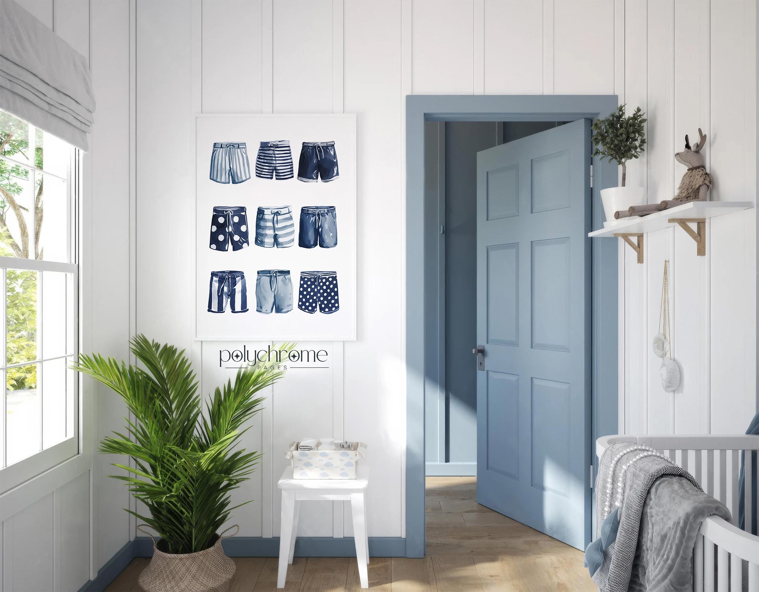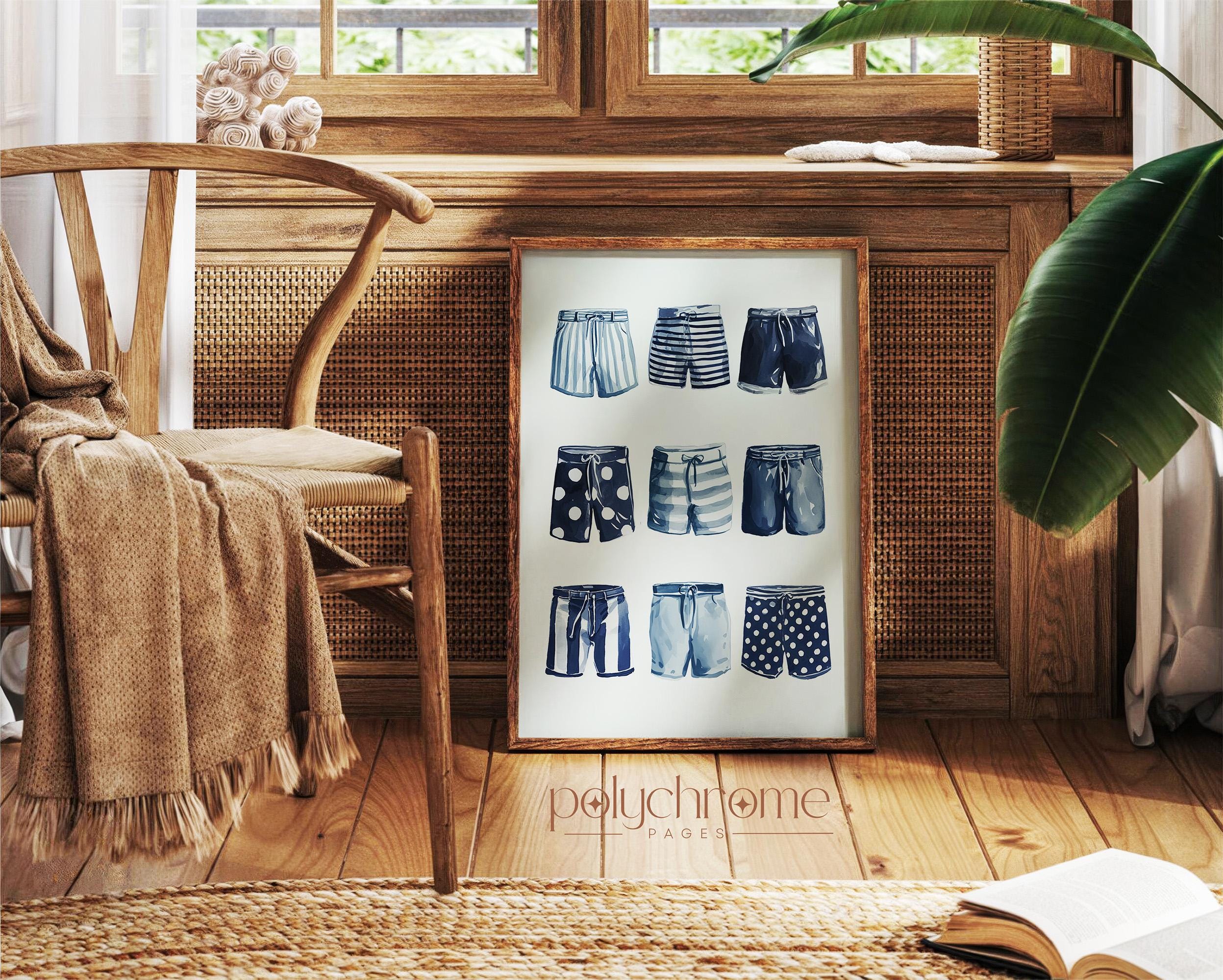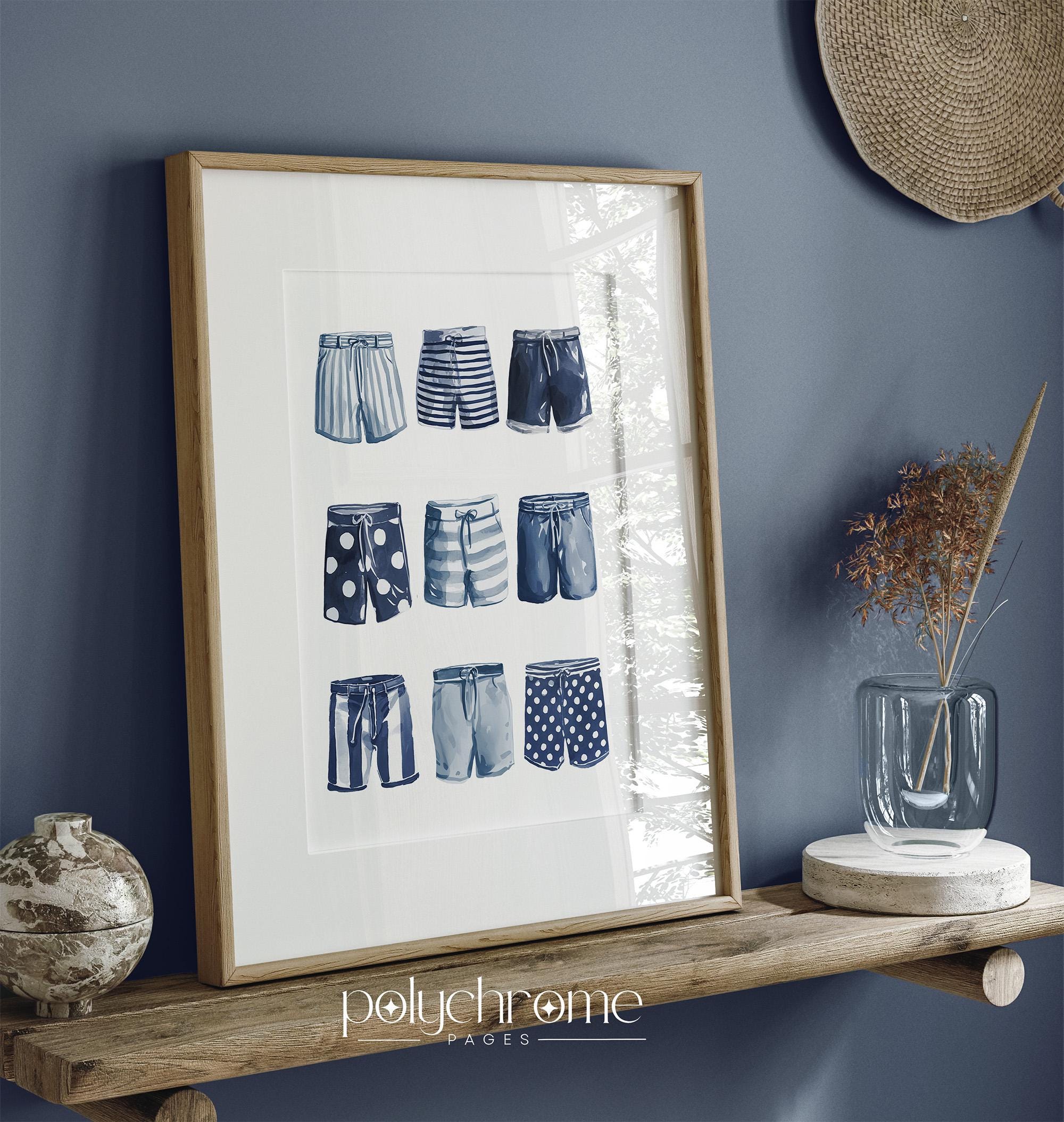 A playful lineup of painted swimwear in cool coastal blues, ideal for adding a chill summer vibe to your space. Great for beach houses, lake cabins, or vacation-inspired homes. This piece is a fun way to introduce coastal style with a modern twist to your interior.
