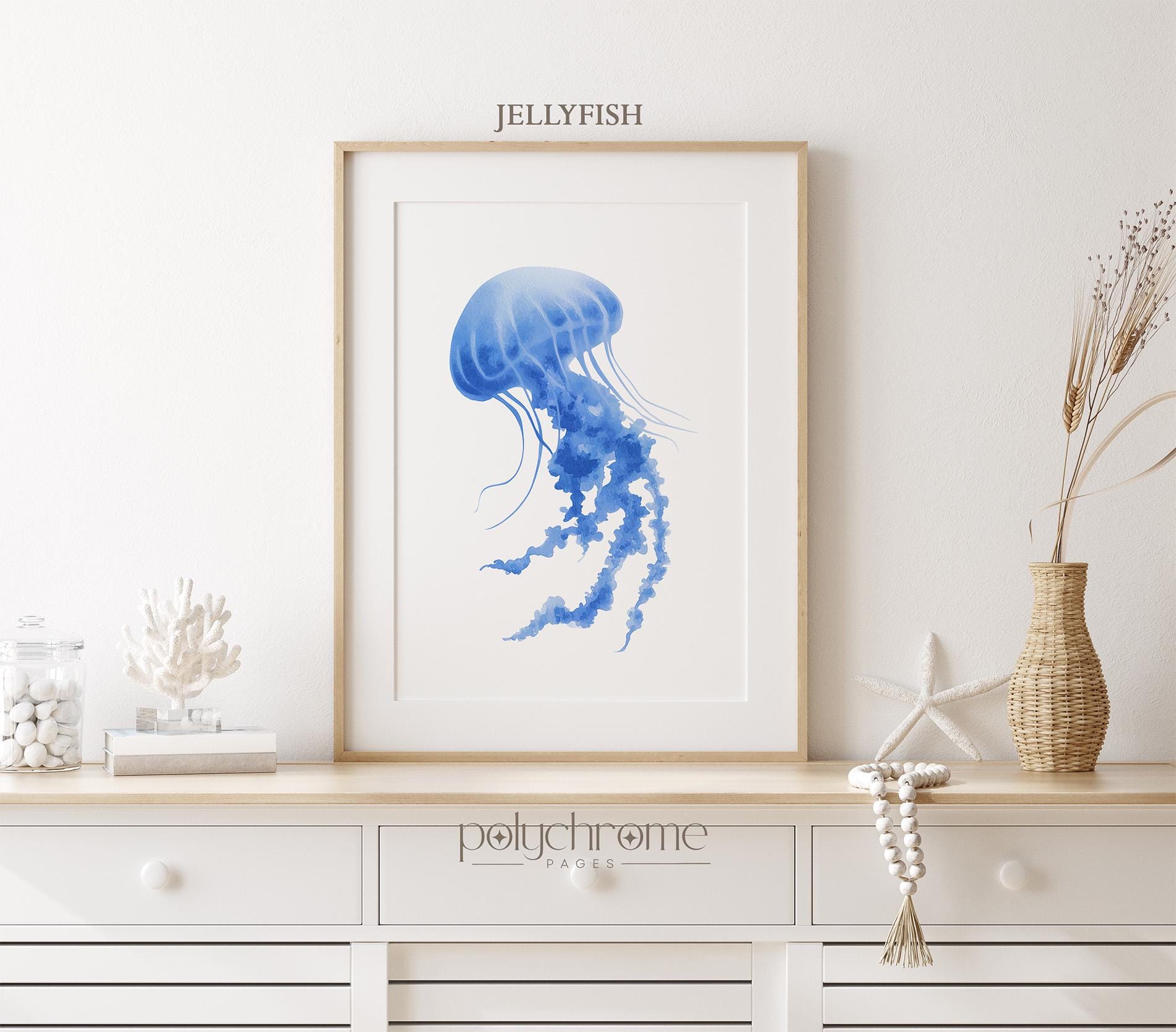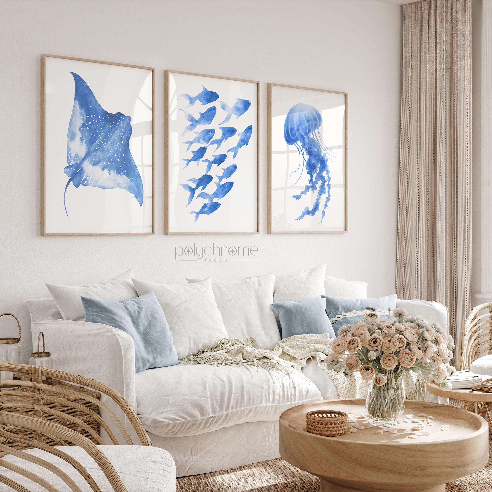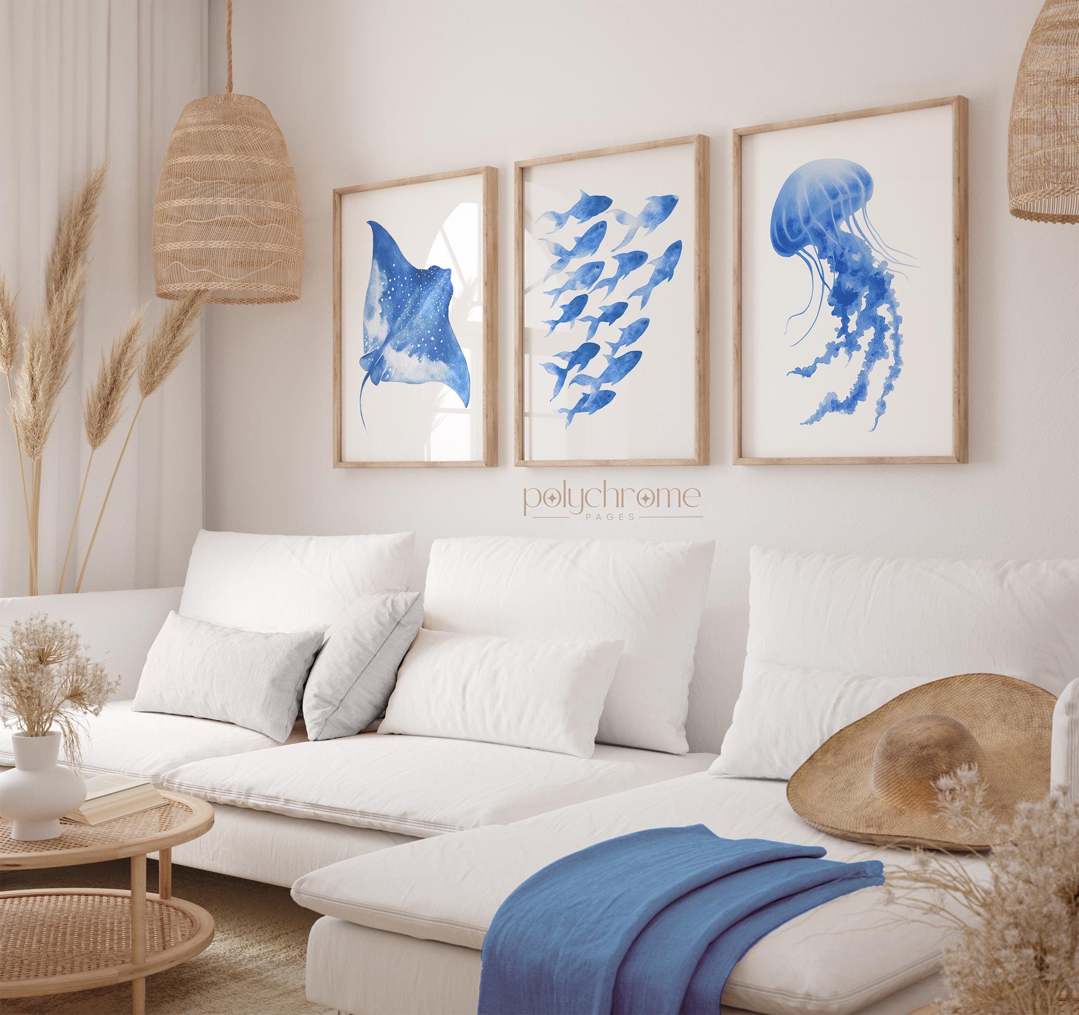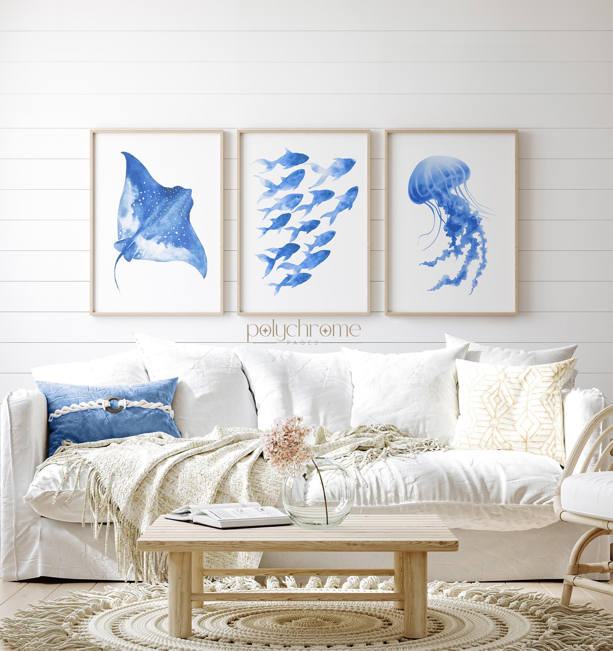 These matching designs showcase an ocean blue ray, fish and jellyfish, rendered in soft pastel tones for a fresh summer vibe. Perfect for poolside bathrooms or a beach house, they bring a coastal charm that feels relaxed and playful. A lovely idea for vacation rentals or a lake house.