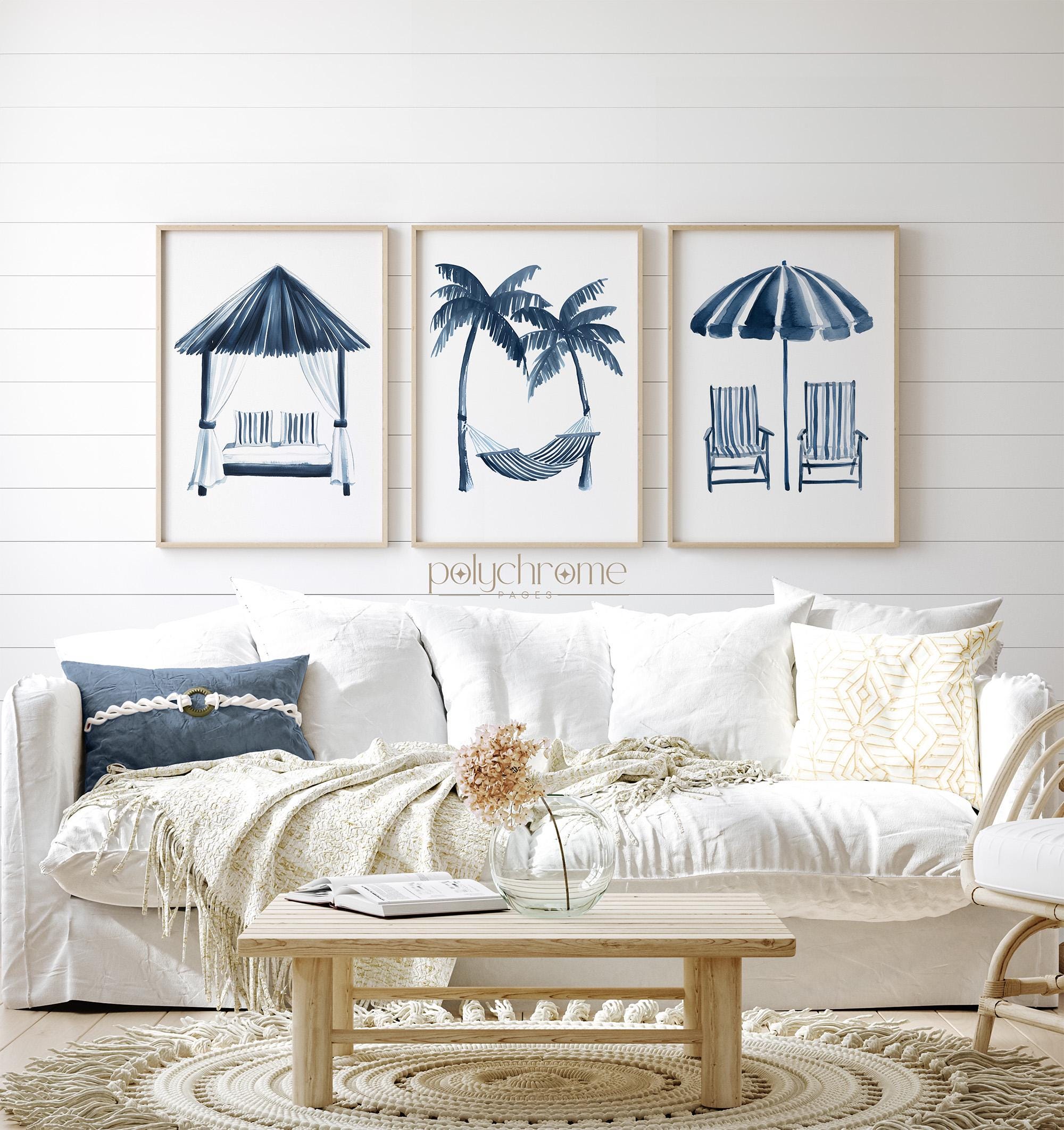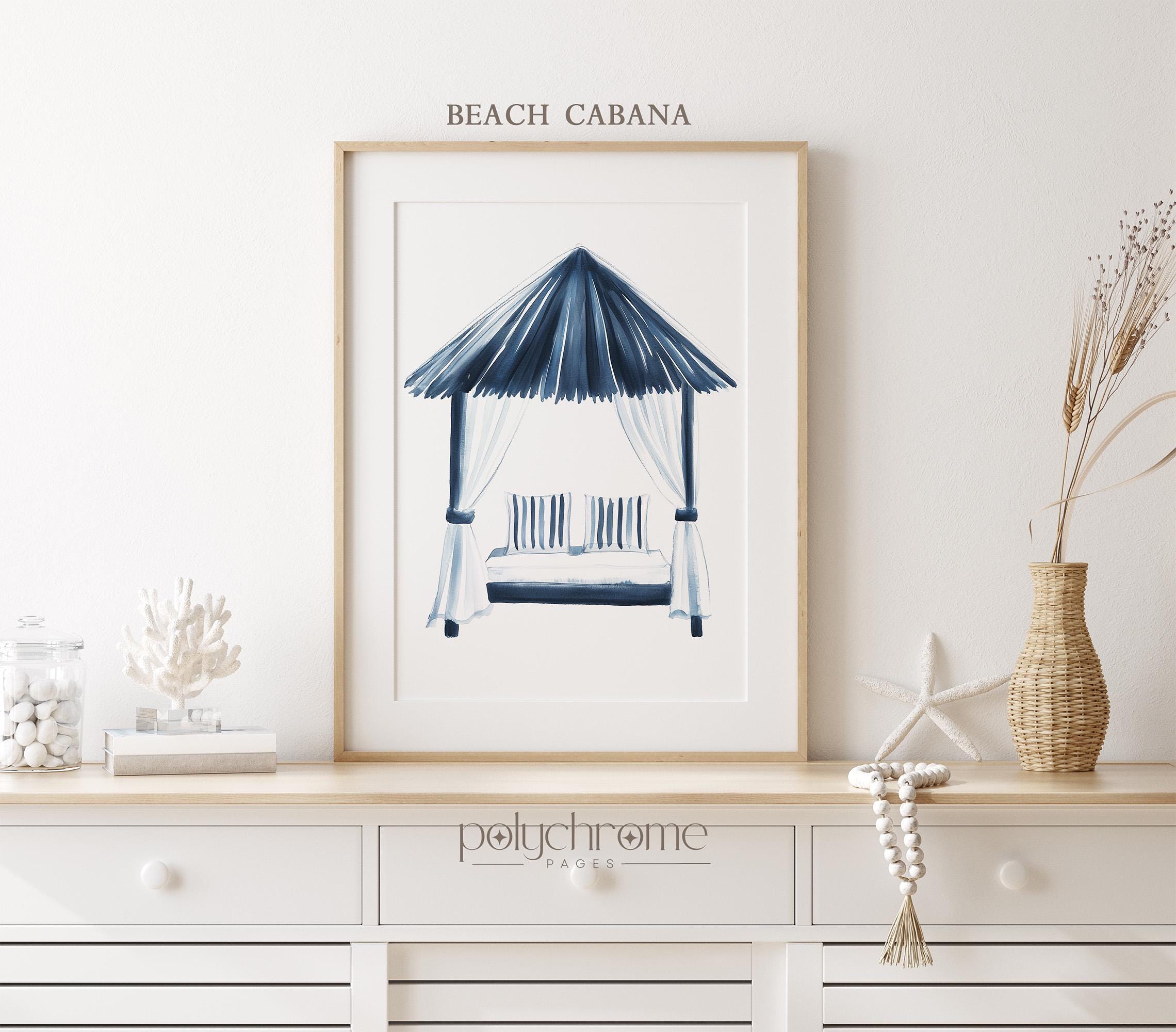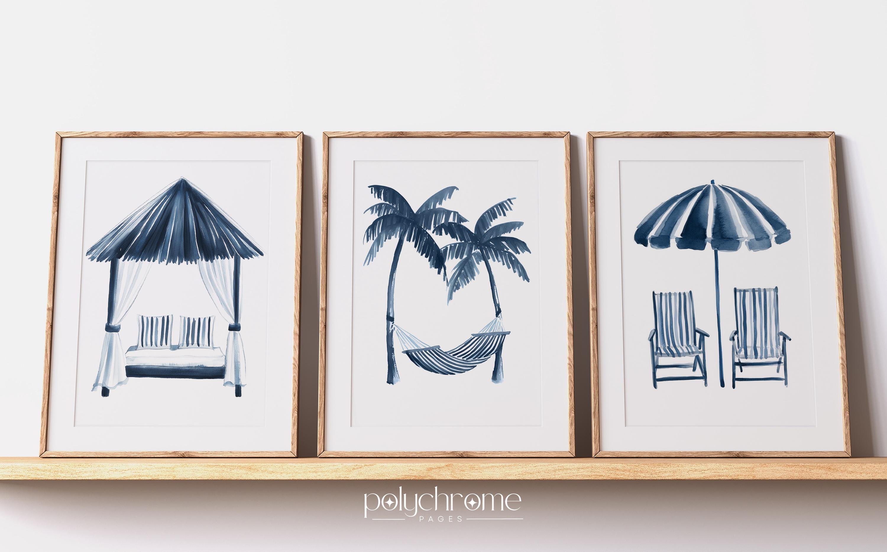 Add a coastal vibe to your space with these navy-toned artworks - striped hammock, beach umbrella, and cabana. They will be perfect fit for beach house, a poolside bathroom, or a relaxed bedroom. Bring the feeling of a summer right to your walls! Navy blue color palette makes them fit right into coastal or vacation home style!