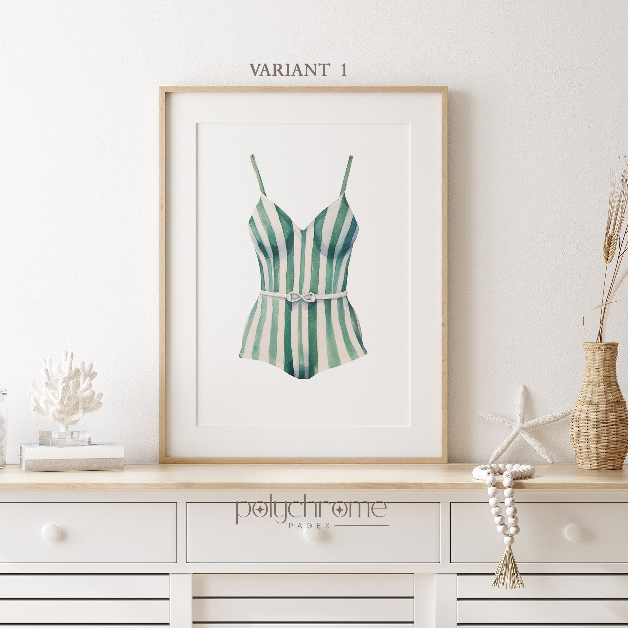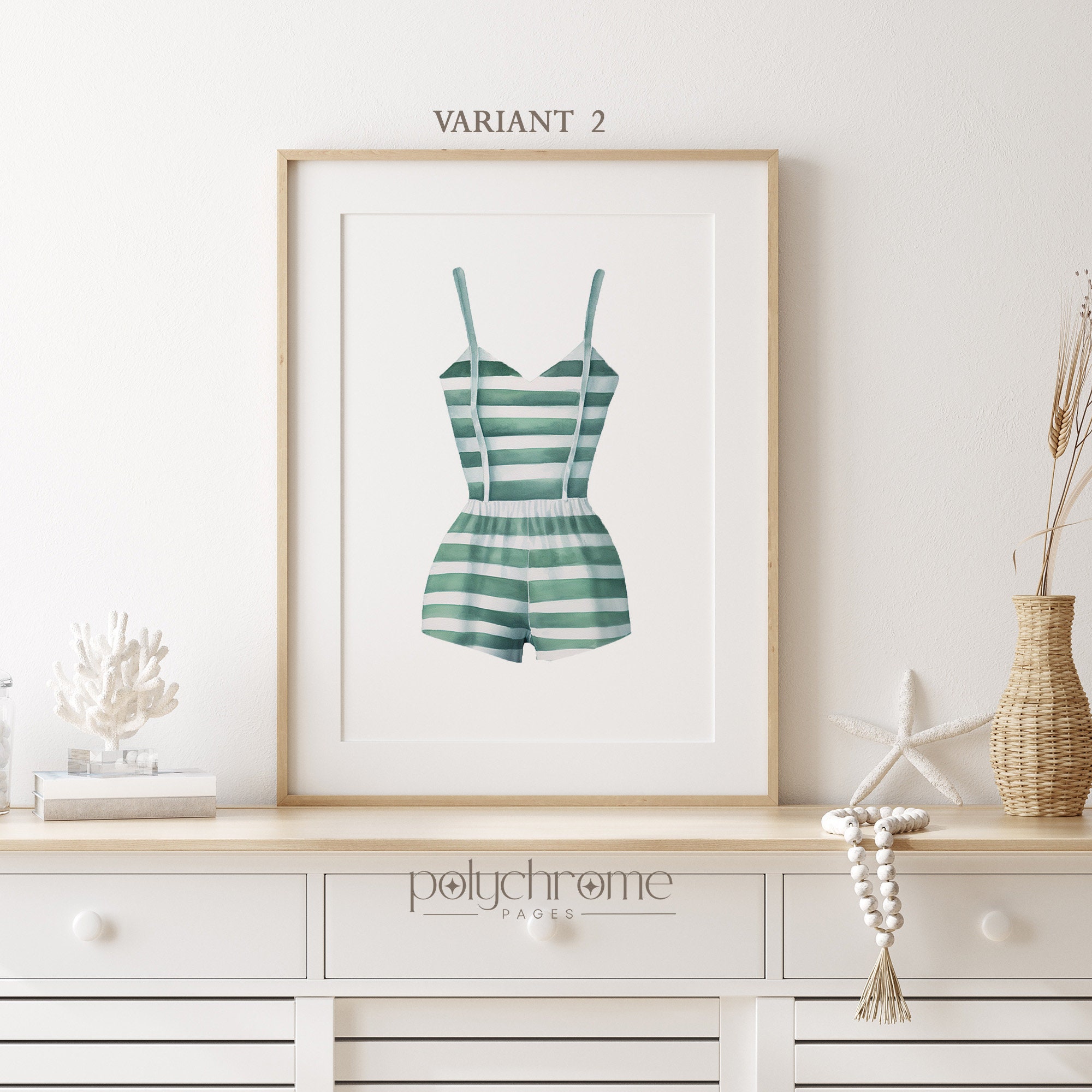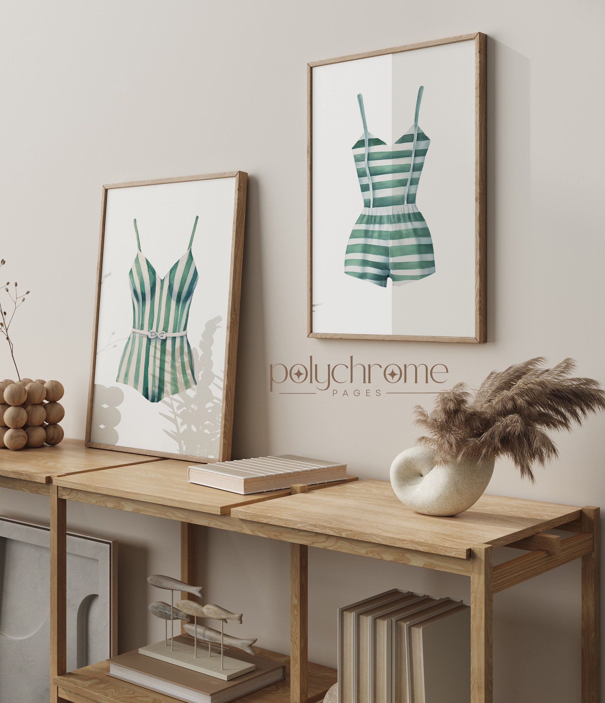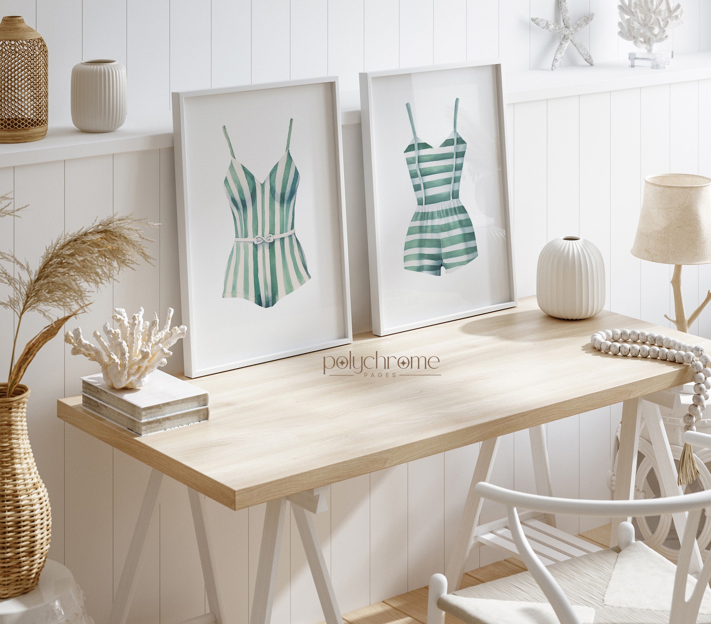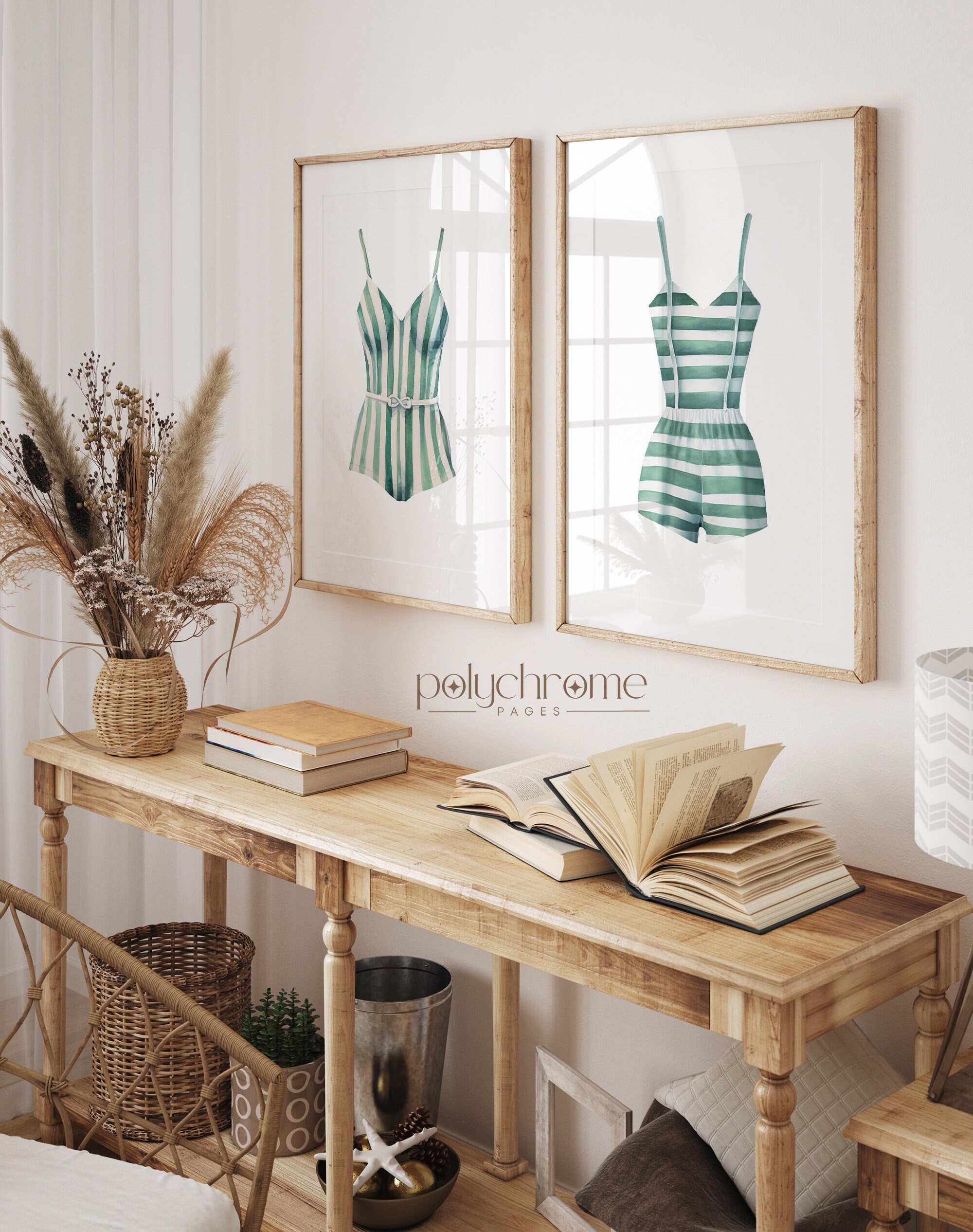 This charming summer painting of vintage-style striped swimsuits in soft sage and white tones brings to mind lazy days by the water. The muted green palette brings a fresh, calming feel that works beautifully in pool bathrooms, laundry rooms, or beach house spaces. A lovely choice for anyone who appreciates coastal decor with a subtle, understated colour scheme.