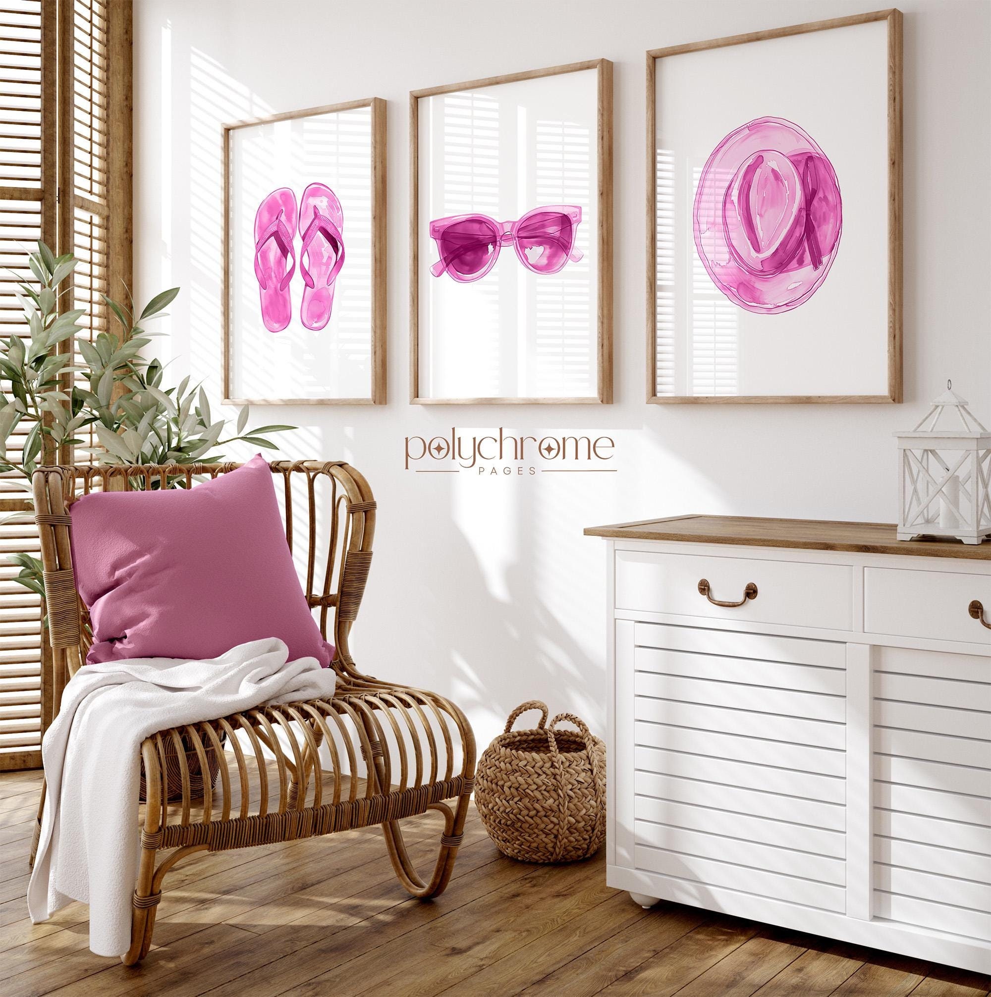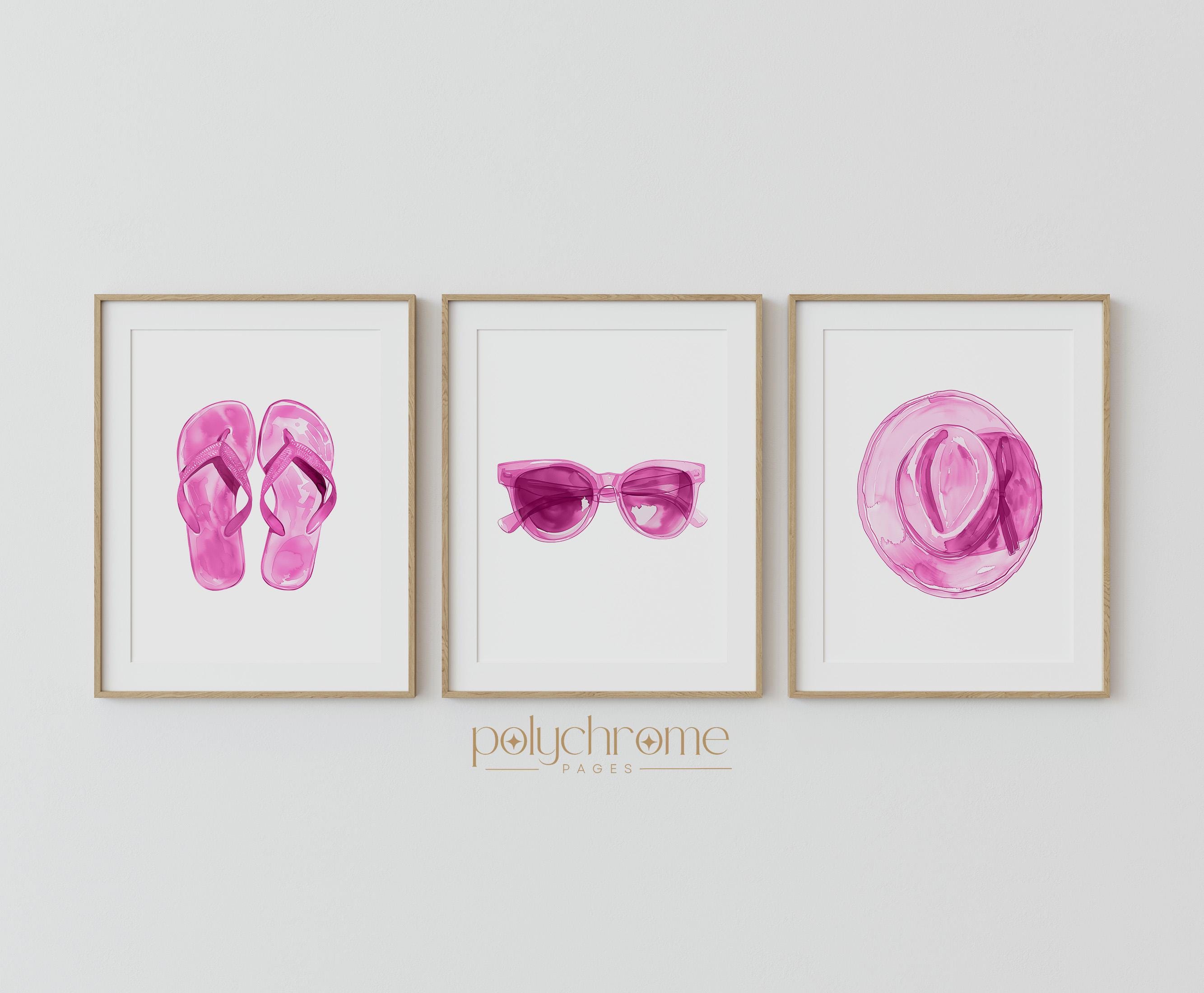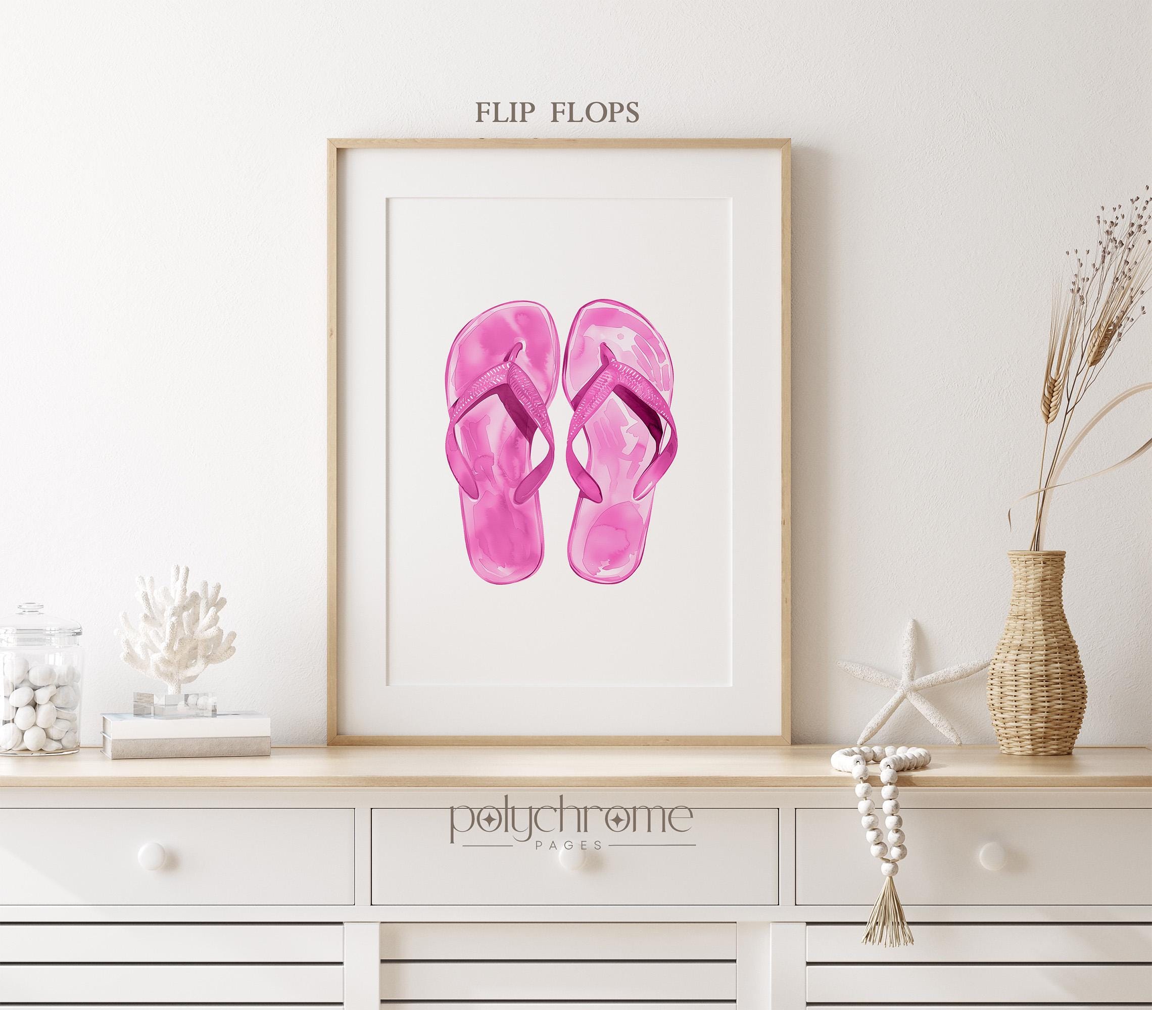 This cheerful watercolor trio consists of pink flip flops, oversized sunglasses, and a blush straw hat—classic summer accessories with a feminine twist. The soft pink palette brings warmth and a playful coastal feel, making it a lovely fit for beach house entryways, pool bathrooms, or vacation rentals. A sweet choice for anyone who loves relaxed seaside style with a touch of pink.