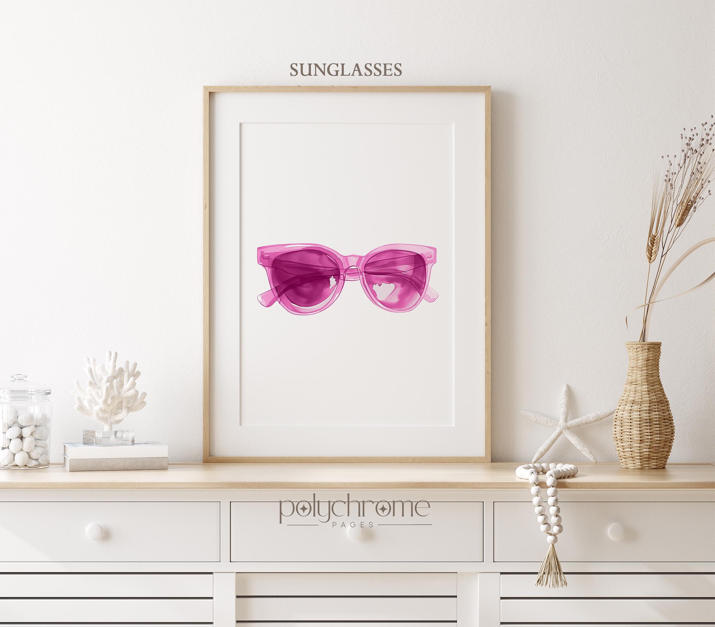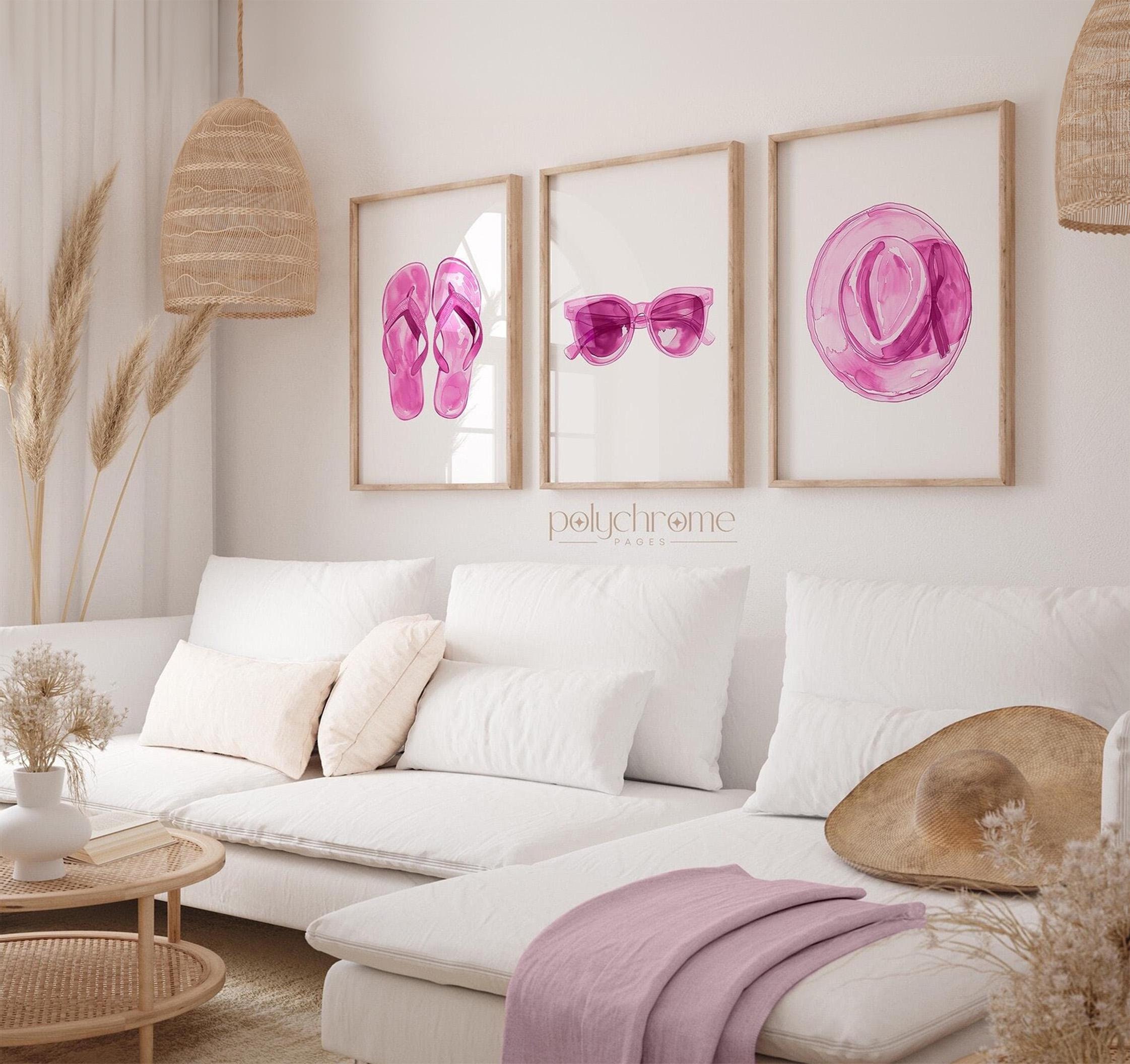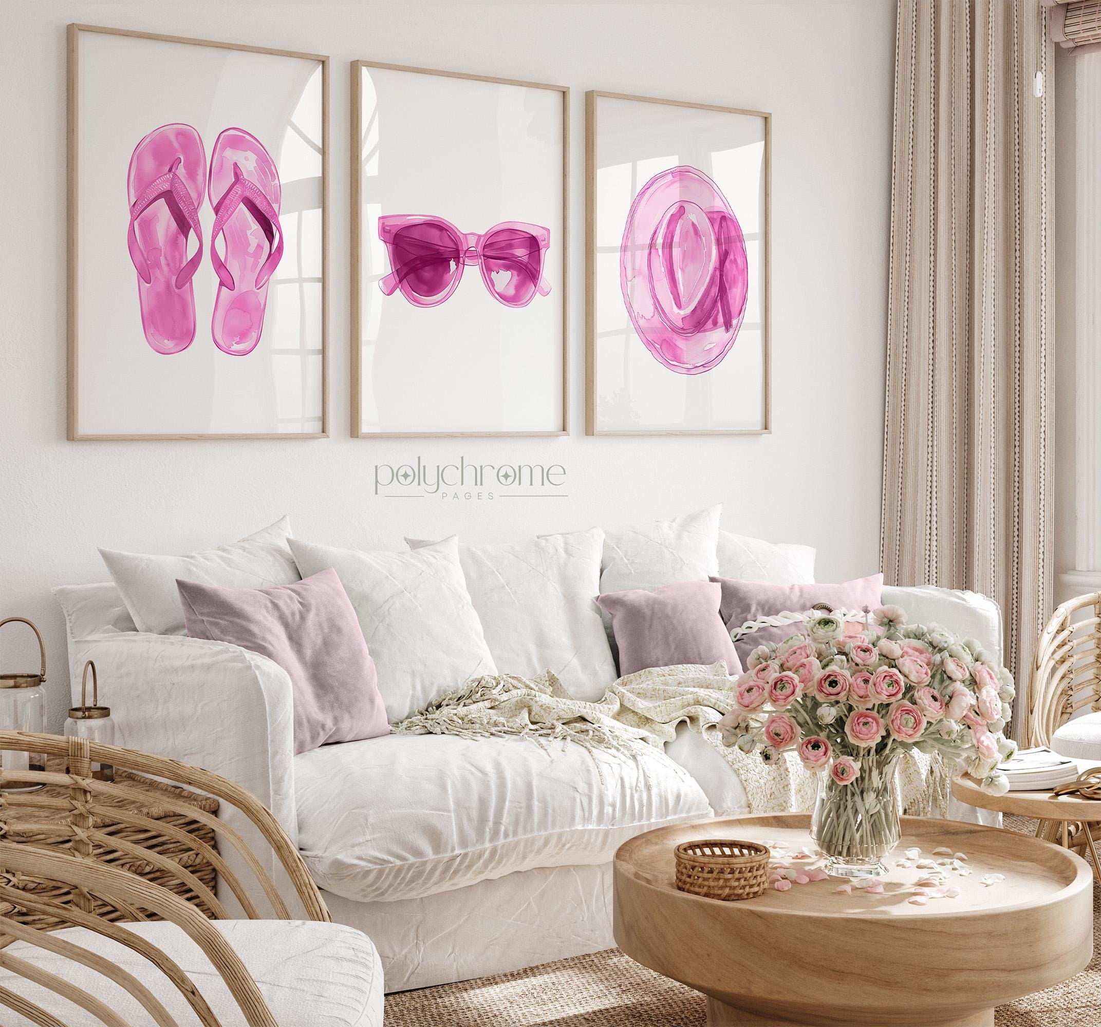 This cheerful watercolor trio consists of pink flip flops, oversized sunglasses, and a blush straw hat—classic summer accessories with a feminine twist. The soft pink palette brings warmth and a playful coastal feel, making it a lovely fit for beach house entryways, pool bathrooms, or vacation rentals. A sweet choice for anyone who loves relaxed seaside style with a touch of pink.
